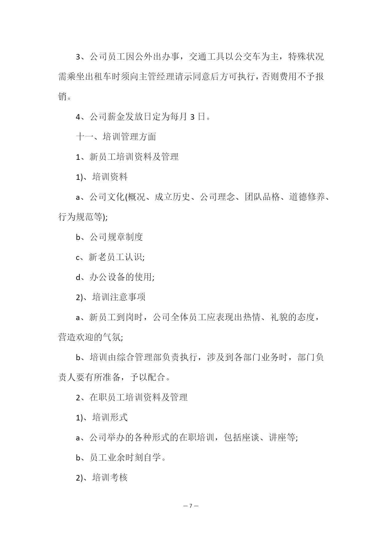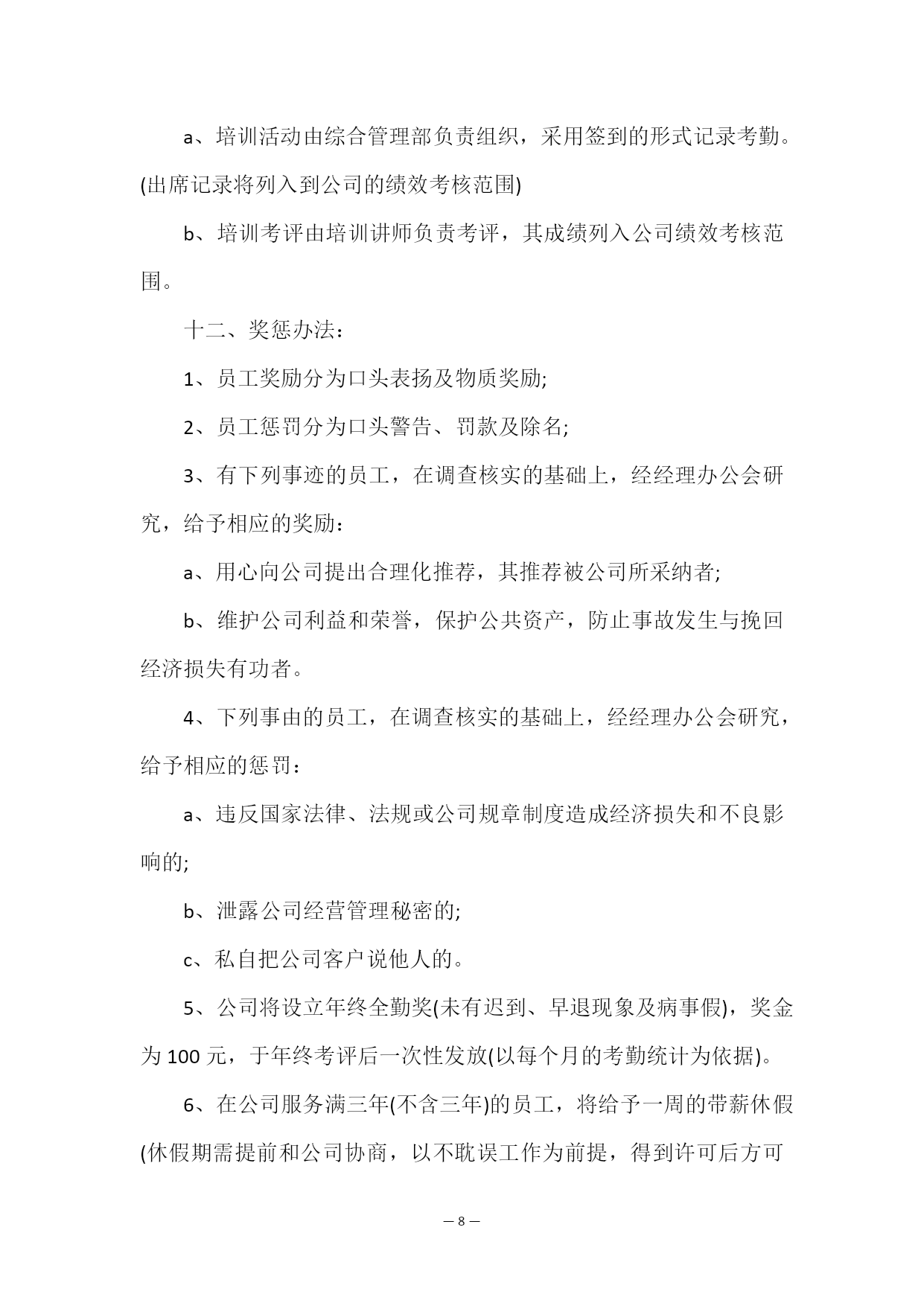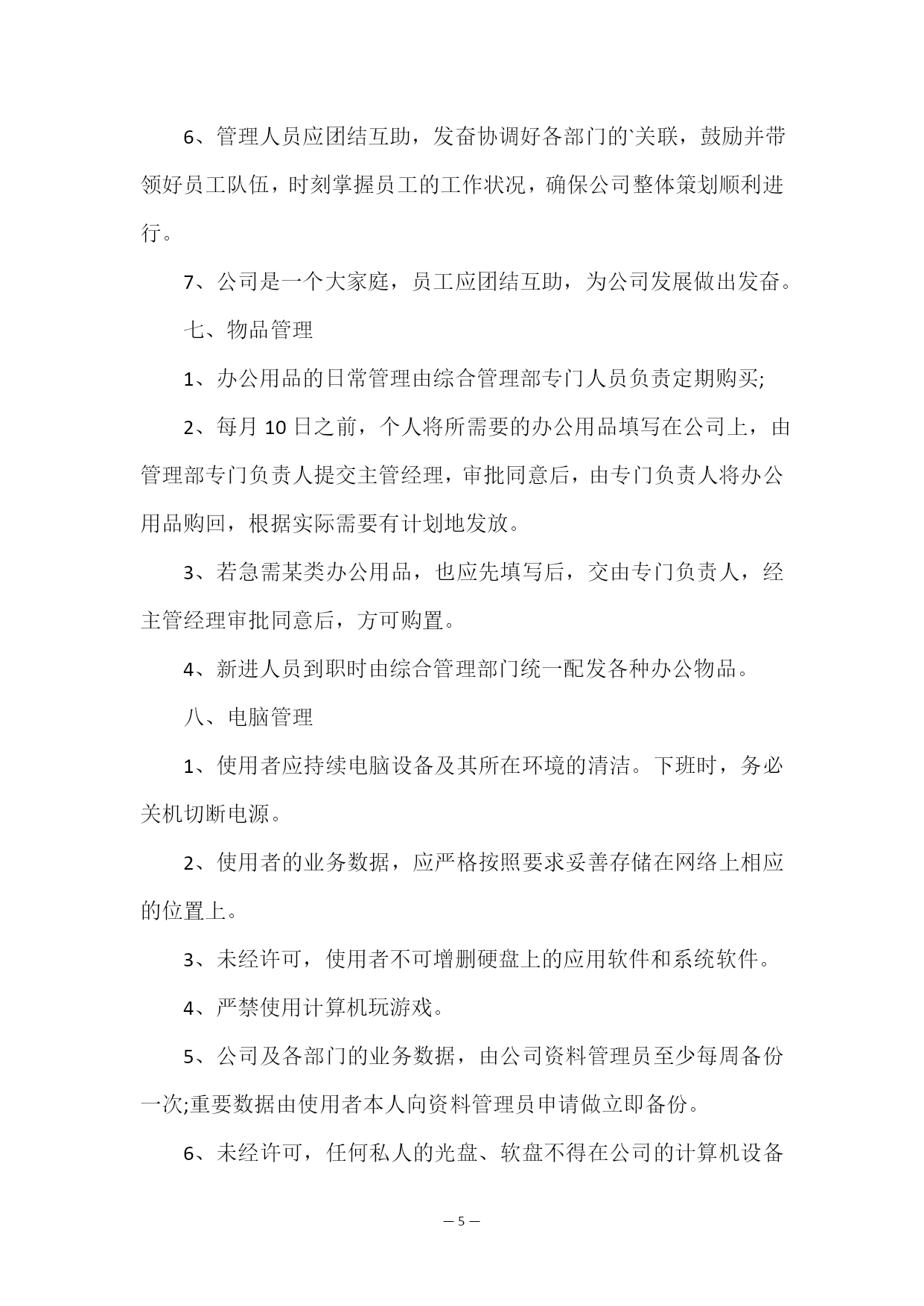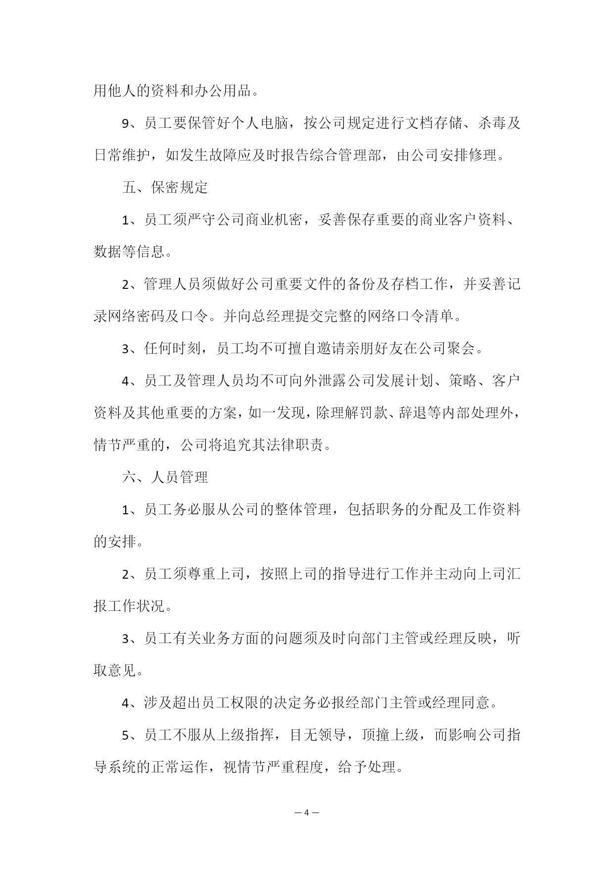 —PAGE\*MERGEFORMAT21—简单的员工规章制度在企业的运营过程中,组织的管理制度,必须包含所有的执行事项,不能有所遗漏,如果有需要重新添加。以下是我编写整理的有关简单的员工规章制度范文,欢迎大家前来阅读。简单的员工规章制度范文篇1一、公司形象制度1、员工务必清楚地了解公司的经营范围和管理结构,并能向客户及外界正确地说公司状况。2、在接待公司内外人员的垂询、要求等任何场合,应注视对方,微笑应答,切不可冒犯对方。3、在任何场合应用语规范,语气温和,音量适中,严禁大声喧哗。4、遇有客人进入工作场地应礼貌劝阻,上班时刻(包括午餐时刻)办公室内应保证有人接待。5、接听电话应及时,一般铃响不应超过三声,如受话人不能接听,离之最近的职员应主动接听,重要电话作好接听记录,严禁占用公司电话时刻太长。6、员工在接听电话、洽谈业务、发送电子邮件及招待来宾时,务必时刻注重公司形象,按照具体规定使公司统一的名片、公司标识及落款。7、员工在工作时刻内须持续良好的精神面貌。8、员工要注重个人仪态仪表,工作时刻的着装及修饰须大方得体。二、生活作息制度1、员工应严格按照公司统一的工作作息时刻规定上下班。2、作息时刻规定上班时刻上午08:00——12:00下午14:00——18:00午休时刻12:00——14:00下班时刻18:003、员工上下班施行签到制,上下班均须本人亲自签到,不得托他人签到。4、员工上下班考勤记录将作为公司绩效考核的重要组成部分。5、员工如因事需在工作时刻内外出,要向主管经理请示签退后方可离开公司。6、员工遇突发疾病须当天向主管经理请假,事后补交相关证明。7、事假需提前向主管经理提出申请,并填写,经批准后方可休息。三、卫生规范1、员工须每一天清洁个人工作区内的卫生,确保地面、桌面及设备的整洁。2、员工须自觉持续公共区域的卫生,发现不清洁的状况,应及时清理。3、员工在公司内接待来访客人,事后需立即清理会客区。4、办公区域内严禁吸烟。5、正确使用公司内的水、电、空调等设施,最后离开办公室的员工应关掉空调、电灯和一切公司内就应关掉的设施。四、工作要求1、工作时刻内不应无故离岗、串岗,不得闲聊、吃零食、大声喧哗,确保办公环境的安静有序。2、新入职员工的试用期为三个月,员工在试用期内要按月进行考评。详见《员工试用期考核表》。3、公司内所制定的《员工日程表》是衡量员工完成工作量的依据,要求员工每一天要认真、详尽的填写,作为公司考核员工工作量的标准。4、职员间的工作交流应在规定的区域内进行(大厅、会议室),如需在个人工作区域内进行谈话的,时刻一般不应超过三分钟(特殊状况除外)。5、加强学习与工作相关的专业知识及技能,用心参加公司组织的各项培训(培训将施行签到制,出席和培训考核也将作为公司绩效考核的部分)。6、员工在工作时刻务必全身心地投入,持续高效率地工作。7、员工在任何时刻均不可利用公司的场所、设备及其他资源从事私人活动。一经发现,给予警告,情节严重者,公司将予以辞退。8、员工须保管好个人的文件资料及办公用品,未经同意不可挪用他人的资料和办公用品。9、员工要保管好个人电脑,按公司规定进行文档存储、杀毒及日常维护,如发生故障应及时报告综合管理部,由公司安排修理。五、保密规定1、员工须严守公司商业机密,妥善保存重要的商业客户资料、数据等信息。2、管理人员须做好公司重要文件的备份及存档工作,并妥善记录网络密码及口令。并向总经理提交完整的网络口令清单。3、任何时刻,员工均不可擅自邀请亲朋好友在公司聚会。4、员工及管理人员均不可向外泄露公司发展计划、策略、客户资料及其他重要的方案,如一发现,除理解罚款、辞退等内部处理外,情节严重的,公司将追究其法律职责。六、人员管理1、员工务必服从公司的整体管理,包括职务的分配及工作资料的安排。2、员工须尊重上司,按照上司的指导进行工作并主动向上司汇报工作状况。3、员工有关业务方面的问题须及时向部门主管或经理反映,听取意见。4、涉及超出员工权限的决定务必报经部门主管或经理同意。5、员工不服从上级指挥,目无领导,顶撞上级,而影响公司指导系统的正常运作,视情节严重程度,给予处理。6、管理人员应团结互助,发奋协调好各部门的`关联,鼓励并带领好员工队伍,时刻掌握员工的工作状况,确保公司整体策划顺利进行。7、公司是一个大家庭,员工应团结互助,为公司发展做出发奋。七、物品管理1、办公用品的日常管理由综合管理部专门人员负责定期购买;2、每月10日之前,个人将所需要的办公用品填写在公司上,由管理部专门负责人提交主管经理,审批同意后,由专门负责人将办公用品购回,根据实际需要有计划地发放。3、若急需某类办公用品