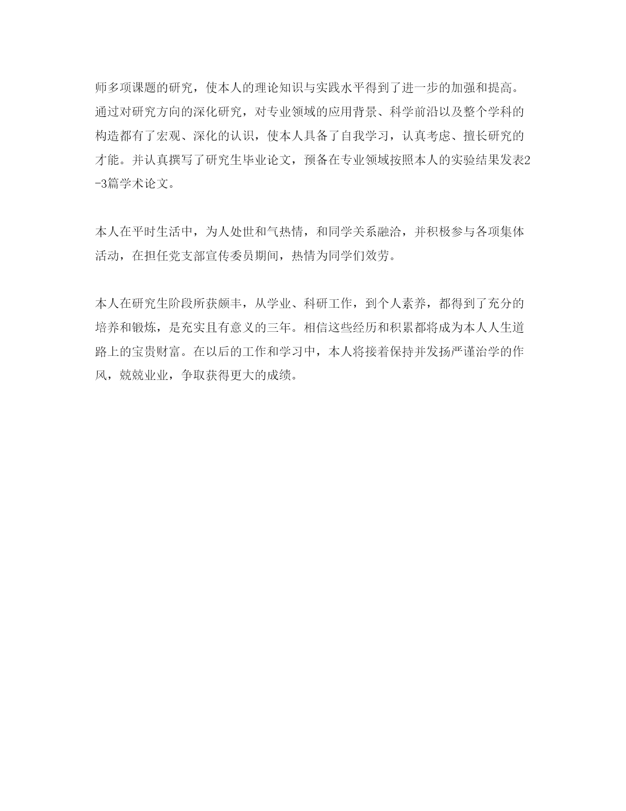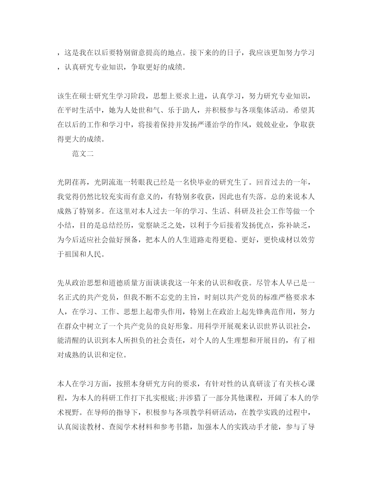2021研究生学年自我参考总结范文范文一光阴荏苒,白驹过隙。转眼之间我已经是一名研二的学生了。回首过去的一年,我觉得仍然比较充实而有意义的,在思想、学习、生活都有特别多收获。总的来说本人成熟了特别多。在这里对本人过去一年的学习、生活、科研及社会工作等做一个小结,目的是总结经历,觉察缺乏之处,以利于今后接着发扬优点,弥补缺乏,为今后适应社会做好预备,把本人的人生道路走得更稳、更好。政治思想方面,我不断对本人高标准、严要求。尽管我还没有参加党组织,但是我不断以共产党员的标准要求本人。我留意学习先进的政治理论,关心国内国际大事,积极拥护党和国家的各项道路、方针、政策,自觉遵守法律、法规和学校的各项规章制度。同时,我清醒地认识到本人所担负的社会责任。对个人的人生理想和开展目的,我也有了相对成熟的认识和定位。在学习方面,我在认真学习好专业课程,顺利获得研究生应完成的学分的同时,阅读了大量与实验室国内外相关的文献材料,既开阔了视野,也使我对本人研究方向的内容以及整个学科的构造有了进一步的认识。在英语学习方面,通过听说课程学习过程中与外教的交流,培养了了较强的英语听、说、读、写才能。在生活方面,我不断以“为人处世和气、乐于助人”的精神要求本人,积极参加学校和学院的各项集体活动。研一参加院研究生会外联部,通过一年的工作,锻炼了本人的工作才能。今年五四青年节前夕被评为班级“优秀团员”。上面我总结了本人过去一年的学习、工作和生活,主要是本人的收获和今后要接着发扬的优点。因此,我也存在一些缺乏之处,例如,有时工作还缺乏创新精神,这是我在以后要特别留意提高的地点。接下来的的日子,我应该更加努力学习,认真研究专业知识,争取更好的成绩。该生在硕士研究生学习阶段,思想上要求上进,认真学习,努力研究专业知识,在平时生活中,她为人处世和气、乐于助人,并积极参与各项集体活动。希望其在以后的工作和学习中,将接着保持并发扬严谨治学的作风,兢兢业业,争取获得更大的成绩。范文二光阴荏苒,光阴流逛一转眼我已经是一名快毕业的研究生了。回首过去的一年,我觉得仍然比较充实而有意义的,有特别多收获,因此也有失落。总的来说本人成熟了特别多。在这里对本人过去一年的学习、生活、科研及社会工作等做一个小结,目的是总结经历,觉察缺乏之处,以利于今后接着发扬优点,弥补缺乏,为今后适应社会做好预备,把本人的人生道路走得更稳、更好,更快成材以效劳于祖国和人民。先从政治思想和道德质量方面谈谈我这一年来的认识和收获。尽管本人早已是一名正式的共产党员,但我不断不忘党的主旨,时刻以共产党员的标准严格要求本人,在学习、工作、思想上起带头作用,特别上在政治上起先锋典范作用,努力在群众中树立了一个共产党员的良好形象。用科学开展观来认识世界认识社会,能清醒的认识到本人所担负的社会责任,对个人的人生理想和开展目的,有了相对成熟的认识和定位。本人在学习方面,按照本身研究方向的要求,有针对性的认真研读了有关核心课程,为本人的科研工作打下扎实根底;并涉猎了一部分其他课程,开阔了本人的学术视野。在导师的指导下,积极参与各项教学科研活动,在教学实践的过程中,认真阅读教材、查阅学术材料和参考书籍,加强本人的实践动手才能,参与了导师多项课题的研究,使本人的理论知识与实践水平得到了进一步的加强和提高。通过对研究方向的深化研究,对专业领域的应用背景、科学前沿以及整个学科的构造都有了宏观、深化的认识,使本人具备了自我学习,认真考虑、擅长研究的才能。并认真撰写了研究生毕业论文,预备在专业领域按照本人的实验结果发表2-3篇学术论文。本人在平时生活中,为人处世和气热情,和同学关系融洽,并积极参与各项集体活动,在担任党支部宣传委员期间,热情为同学们效劳。本人在研究生阶段所获颇丰,从学业、科研工作,到个人素养,都得到了充分的培养和锻炼,是充实且有意义的三年。相信这些经历和积累都将成为本人人生道路上的宝贵财富。在以后的工作和学习中,本人将接着保持并发扬严谨治学的作风,兢兢业业,争取获得更大的成绩。
