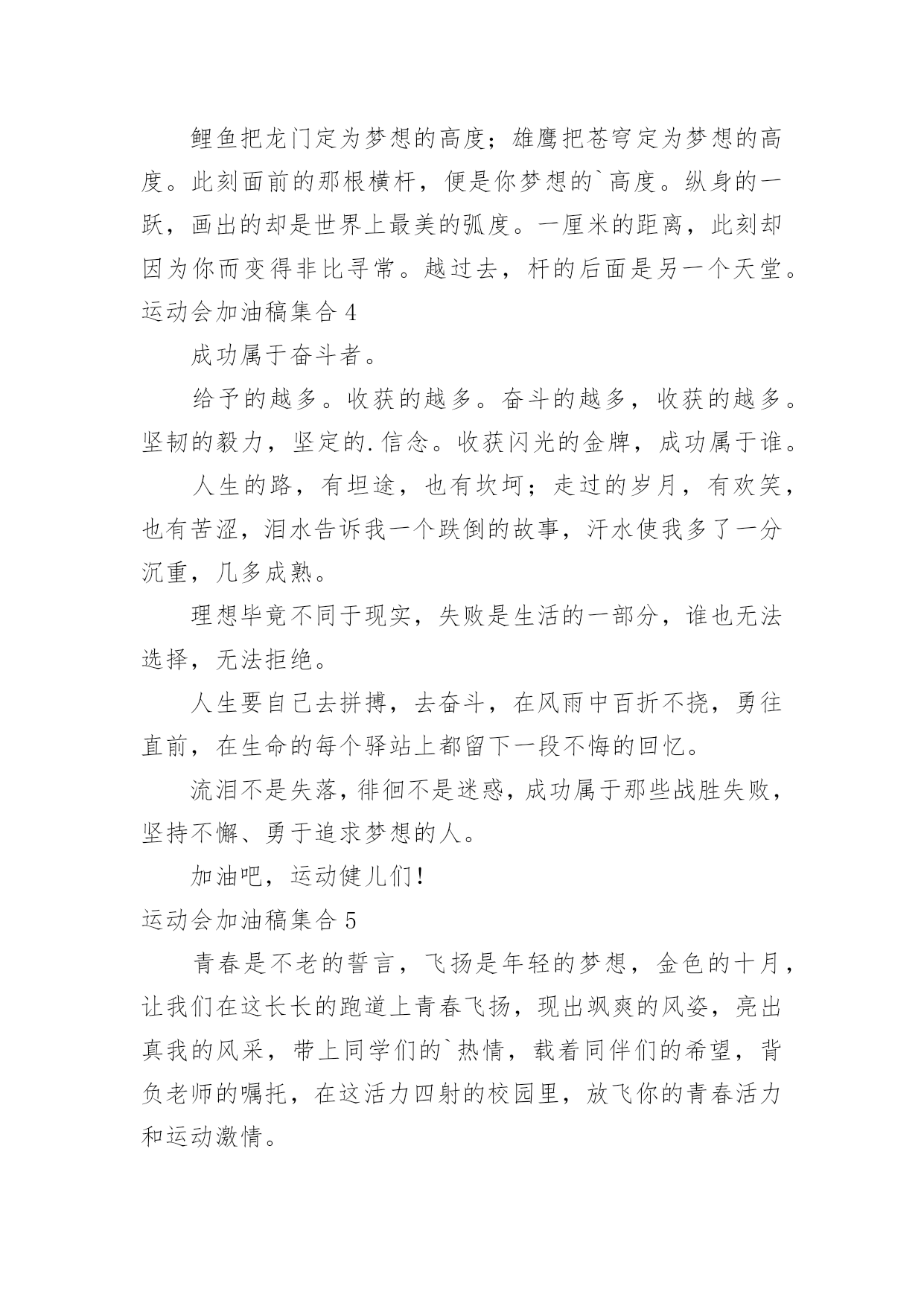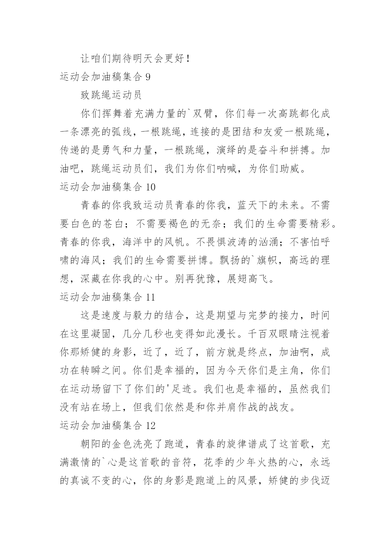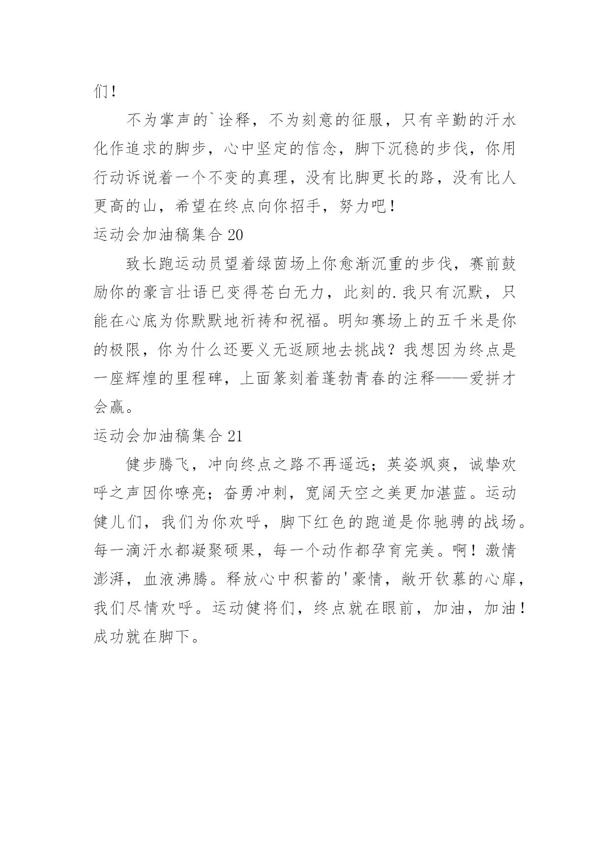 运动会加油稿运动会加油稿集合在当今社会生活中,接触并使用加油稿的人越来越多,加油稿可以强化人们的自我认知,给予人正向的激励作用。那要怎么写好加油稿呢?以下是小编帮大家整理的运动会加油稿集合,仅供参考,希望能够帮助到大家。运动会加油稿集合1白色的跑道是你运动的轨迹,台上的呐喊是对你拼搏的肯定。这是耐力与意志的检验,超越自我,挑战自我是你的目标,当你体验过从他人身边呼啸而过时,你将再次获得新的'感悟,那是自我人生价值的体现,更是为班级争夺荣誉的自豪!运动会加油稿集合2绚丽多彩的音符在赛道上灵动地跳跃着,天空万里无云,把你们拥抱,愿你们在比赛中取得优异成绩,我班的.运动健儿们,加油吧!风在呐喊,红旗在招手!Comeon!云水悠悠,风雨悠悠,艰难困境伴随左右。但我们并不要管,去做,就这么简单,不管它的后果会是什么。运动会加油稿集合3鲤鱼把龙门定为梦想的高度;雄鹰把苍穹定为梦想的高度。此刻面前的那根横杆,便是你梦想的`高度。纵身的一跃,画出的却是世界上最美的弧度。一厘米的距离,此刻却因为你而变得非比寻常。越过去,杆的后面是另一个天堂。运动会加油稿集合4成功属于奋斗者。给予的越多。收获的越多。奋斗的越多,收获的越多。坚韧的毅力,坚定的.信念。收获闪光的金牌,成功属于谁。人生的路,有坦途,也有坎坷;走过的岁月,有欢笑,也有苦涩,泪水告诉我一个跌倒的故事,汗水使我多了一分沉重,几多成熟。理想毕竟不同于现实,失败是生活的一部分,谁也无法选择,无法拒绝。人生要自己去拼搏,去奋斗,在风雨中百折不挠,勇往直前,在生命的每个驿站上都留下一段不悔的回忆。流泪不是失落,徘徊不是迷惑,成功属于那些战胜失败,坚持不懈、勇于追求梦想的人。加油吧,运动健儿们!运动会加油稿集合5青春是不老的誓言,飞扬是年轻的梦想,金色的十月,让我们在这长长的跑道上青春飞扬,现出飒爽的风姿,亮出真我的风采,带上同学们的`热情,载着同伴们的希望,背负老师的嘱托,在这活力四射的校园里,放飞你的青春活力和运动激情。运动会加油稿集合6让身体在球场上飞驰,让梦想在篮筐中奔放,让激情在篮球上释放,让成功在你心中荡漾。过关斩将,球场内谁与争锋;八仙过海,斗牛士各显神通!球在手中,飞身在空。对手害怕,无影无踪。逢投必进,精彩我秀,可艺篮球,魅力无限三分线外,手起足落,完美弧线,得分容易球球俱进,分分必得,无所畏惧,所向披靡。运动会加油稿集合7来吧现在才是关键,把脆弱放在一边。抓不住机会的你,上不了最前线。踏上雪白跑线,把头发甩到后边。能量化成流汗,让我疯狂呐喊。相信我的预感,一定第一个撞线,只要定睛向你看,心情便会HIGH到极度点。运动会加油稿集合8轻轻敲醒沉睡的心灵,慢慢张开你的眼睛,看看忙碌的运动会,依然激烈的进行不停,秋风也解风情,吹动咱们的心,让昔日运动的风采,今天全部展现出来。放出你的热情,伸出我的`双手,让我拥抱着你的成功,让咱们的运动充满着青春的骄傲。让咱们期待明天会更好!运动会加油稿集合9致跳绳运动员你们挥舞着充满力量的`双臂,你们每一次高跳都化成一条漂亮的弧线,一根跳绳,连接的是团结和友爱一根跳绳,传递的是勇气和力量,一根跳绳,演绎的是奋斗和拼搏。加油吧,跳绳运动员们,我们为你们呐喊,为你们助威。运动会加油稿集合10青春的你我致运动员青春的你我,蓝天下的未来。不需要白色的苍白;不需要褐色的无奈;我们的生命需要精彩。青春的你我,海洋中的风帆。不畏惧波涛的汹涌;不害怕呼啸的海风;我们的生命需要拼博。飘扬的`旗帜,高远的理想,深藏在你我的心中。别再犹豫,展翅高飞。运动会加油稿集合11这是速度与毅力的结合,这是期望与完梦的接力,时间在这里凝固,几分几秒也变得如此漫长。千百双眼睛注视着你那矫健的身影,近了,近了,前方就是终点,加油啊,成功在转瞬之间。你们是幸福的,因为今天你们是主角,你们在运动场留下了你们的'足迹。我们也是幸福的,虽然我们没有站在场上,但我们依然是和你并肩作战的战友。运动会加油稿集合12朝阳的金色洗亮了跑道,青春的旋律谱成了这首歌,充满激情的`心是这首歌的音符,花季的少年火热的心,永远的真诚不变的心,你的身影是跑道上的风景,矫健的步伐迈出你的自信,听,我们都在为你喝彩,加油,不能表达我们的激动。运动会加油稿集合13掌声响起来,这里需要激情,这里需要呐喊,这里同样需要掌声。当你乘胜而归,我们为你鼓掌,为你祝贺,当你失败而来,我们同样为你鼓掌,为你骄傲。当掌声再一次响起的时候,你已经站在了起跑线上,朋友,向前冲!我们在为你鼓掌。运动会加油稿集合14我们为你呐喊,期望给你力量给你信心,因为我们明白那看似简单的'脚步其实迈的艰难。我们为你呐喊,虽然喊的火热朝天,但却期望给你送去阴凉,因为我们看到那液体来不及蒸发,滚落下来,又被溅起。我们并不期盼什么,你已经是我们的英雄。运动会加油