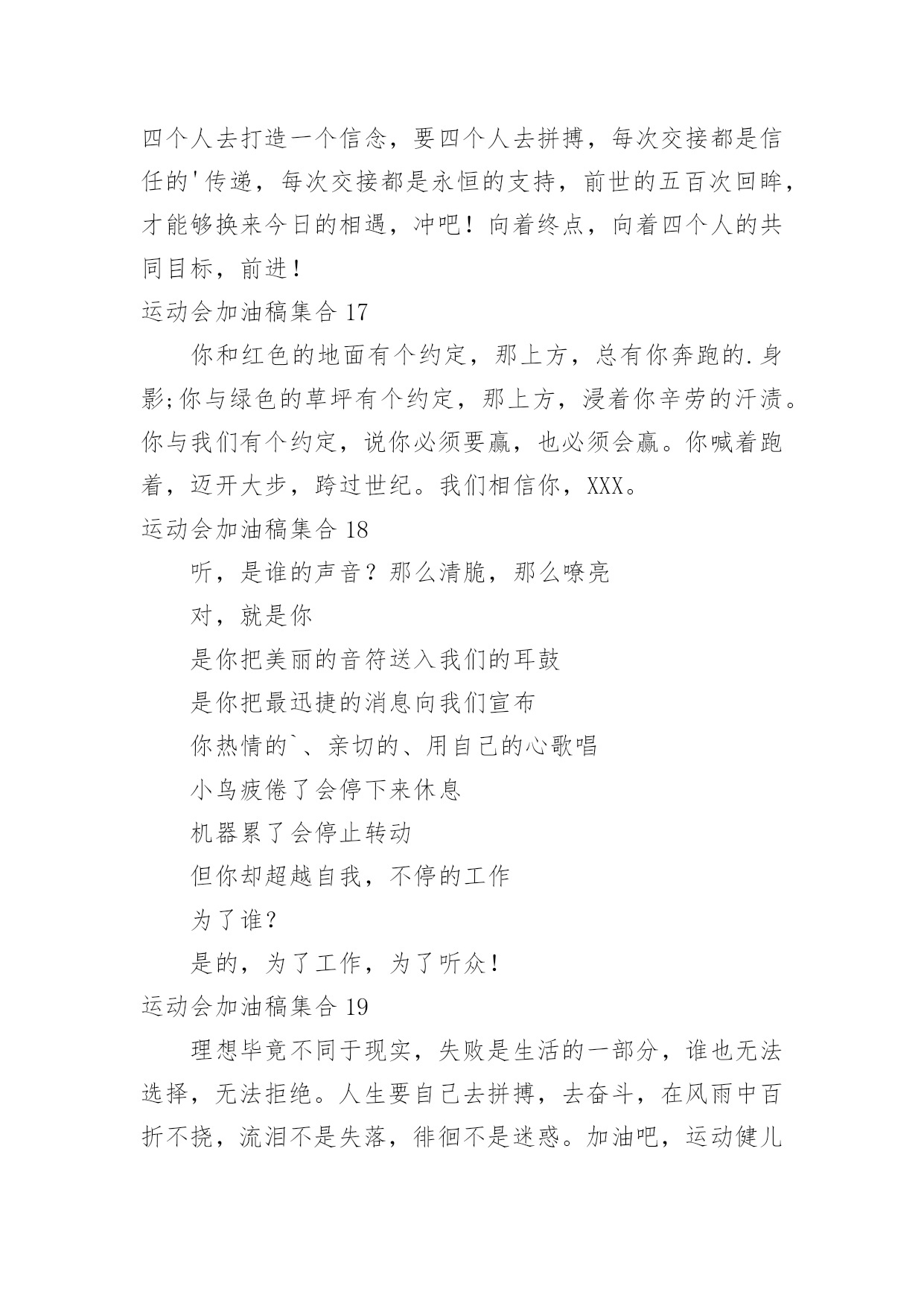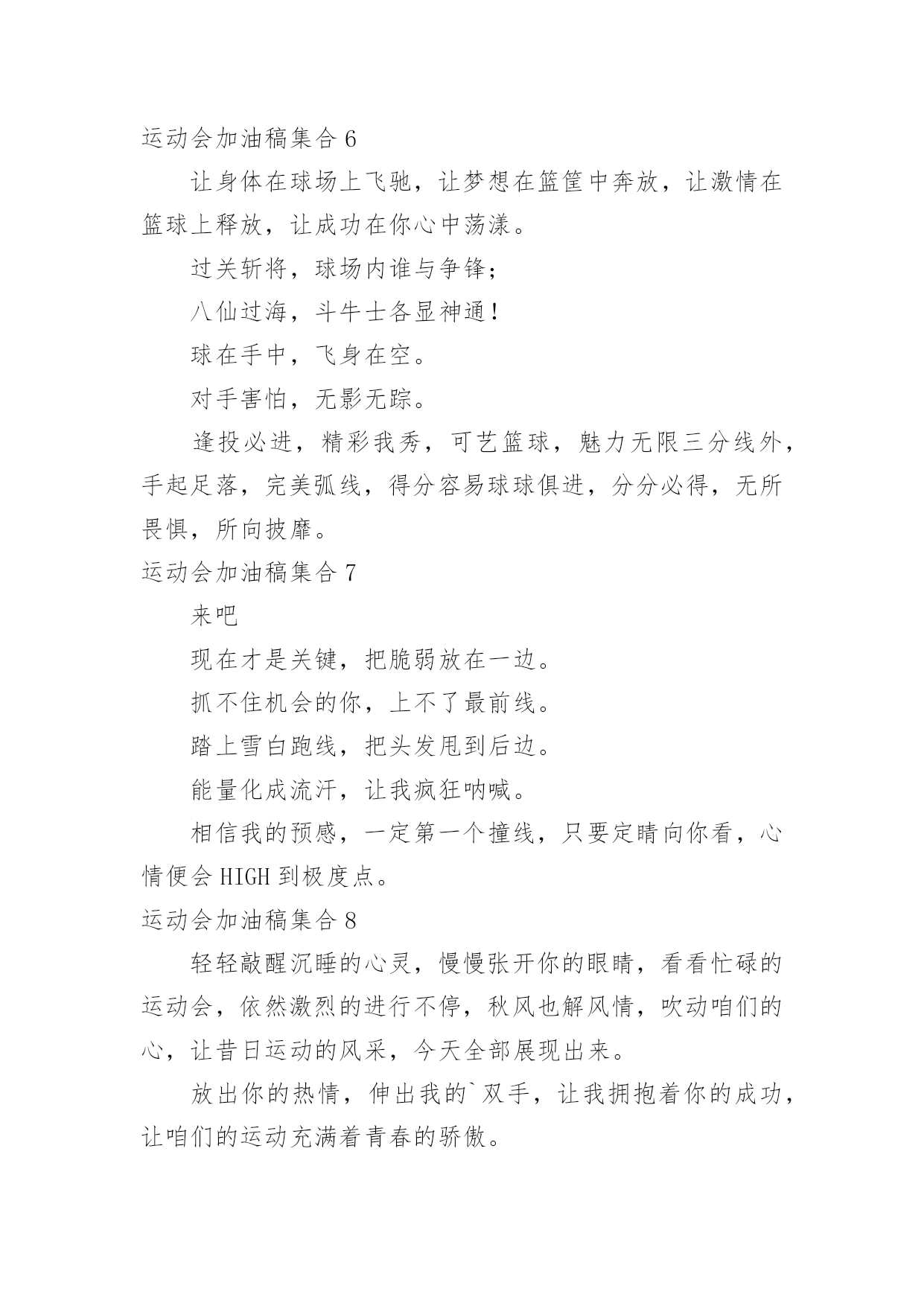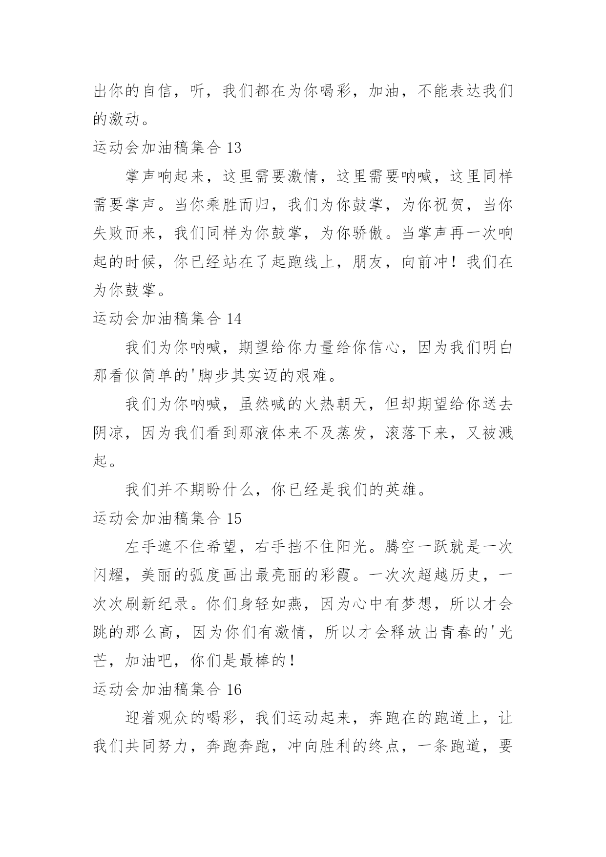 运动会加油稿运动会加油稿集合在当今社会生活中,接触并使用加油稿的人越来越多,加油稿可以强化人们的自我认知,给予人正向的激励作用。那要怎么写好加油稿呢?以下是小编帮大家整理的运动会加油稿集合,仅供参考,希望能够帮助到大家。运动会加油稿集合1白色的跑道是你运动的轨迹,台上的呐喊是对你拼搏的肯定。这是耐力与意志的检验,超越自我,挑战自我是你的目标,当你体验过从他人身边呼啸而过时,你将再次获得新的'感悟,那是自我人生价值的体现,更是为班级争夺荣誉的自豪!运动会加油稿集合2绚丽多彩的音符在赛道上灵动地跳跃着,天空万里无云,把你们拥抱,愿你们在比赛中取得优异成绩,我班的.运动健儿们,加油吧!风在呐喊,红旗在招手!Comeon!云水悠悠,风雨悠悠,艰难困境伴随左右。但我们并不要管,去做,就这么简单,不管它的后果会是什么。运动会加油稿集合3鲤鱼把龙门定为梦想的高度;雄鹰把苍穹定为梦想的高度。此刻面前的那根横杆,便是你梦想的`高度。纵身的一跃,画出的却是世界上最美的弧度。一厘米的距离,此刻却因为你而变得非比寻常。越过去,杆的后面是另一个天堂。运动会加油稿集合4成功属于奋斗者。给予的越多。收获的越多。奋斗的越多,收获的越多。坚韧的毅力,坚定的.信念。收获闪光的金牌,成功属于谁。人生的路,有坦途,也有坎坷;走过的岁月,有欢笑,也有苦涩,泪水告诉我一个跌倒的故事,汗水使我多了一分沉重,几多成熟。理想毕竟不同于现实,失败是生活的一部分,谁也无法选择,无法拒绝。人生要自己去拼搏,去奋斗,在风雨中百折不挠,勇往直前,在生命的每个驿站上都留下一段不悔的回忆。流泪不是失落,徘徊不是迷惑,成功属于那些战胜失败,坚持不懈、勇于追求梦想的人。加油吧,运动健儿们!运动会加油稿集合5青春是不老的誓言,飞扬是年轻的梦想,金色的十月,让我们在这长长的跑道上青春飞扬,现出飒爽的风姿,亮出真我的风采,带上同学们的`热情,载着同伴们的希望,背负老师的嘱托,在这活力四射的校园里,放飞你的青春活力和运动激情。运动会加油稿集合6让身体在球场上飞驰,让梦想在篮筐中奔放,让激情在篮球上释放,让成功在你心中荡漾。过关斩将,球场内谁与争锋;八仙过海,斗牛士各显神通!球在手中,飞身在空。对手害怕,无影无踪。逢投必进,精彩我秀,可艺篮球,魅力无限三分线外,手起足落,完美弧线,得分容易球球俱进,分分必得,无所畏惧,所向披靡。运动会加油稿集合7来吧现在才是关键,把脆弱放在一边。抓不住机会的你,上不了最前线。踏上雪白跑线,把头发甩到后边。能量化成流汗,让我疯狂呐喊。相信我的预感,一定第一个撞线,只要定睛向你看,心情便会HIGH到极度点。运动会加油稿集合8轻轻敲醒沉睡的心灵,慢慢张开你的眼睛,看看忙碌的运动会,依然激烈的进行不停,秋风也解风情,吹动咱们的心,让昔日运动的风采,今天全部展现出来。放出你的热情,伸出我的`双手,让我拥抱着你的成功,让咱们的运动充满着青春的骄傲。让咱们期待明天会更好!运动会加油稿集合9致跳绳运动员你们挥舞着充满力量的`双臂,你们每一次高跳都化成一条漂亮的弧线,一根跳绳,连接的是团结和友爱一根跳绳,传递的是勇气和力量,一根跳绳,演绎的是奋斗和拼搏。加油吧,跳绳运动员们,我们为你们呐喊,为你们助威。运动会加油稿集合10青春的你我致运动员青春的你我,蓝天下的未来。不需要白色的苍白;不需要褐色的无奈;我们的生命需要精彩。青春的你我,海洋中的风帆。不畏惧波涛的汹涌;不害怕呼啸的海风;我们的生命需要拼博。飘扬的`旗帜,高远的理想,深藏在你我的心中。别再犹豫,展翅高飞。运动会加油稿集合11这是速度与毅力的结合,这是期望与完梦的接力,时间在这里凝固,几分几秒也变得如此漫长。千百双眼睛注视着你那矫健的身影,近了,近了,前方就是终点,加油啊,成功在转瞬之间。你们是幸福的,因为今天你们是主角,你们在运动场留下了你们的'足迹。我们也是幸福的,虽然我们没有站在场上,但我们依然是和你并肩作战的战友。运动会加油稿集合12朝阳的金色洗亮了跑道,青春的旋律谱成了这首歌,充满激情的`心是这首歌的音符,花季的少年火热的心,永远的真诚不变的心,你的身影是跑道上的风景,矫健的步伐迈出你的自信,听,我们都在为你喝彩,加油,不能表达我们的激动。运动会加油稿集合13掌声响起来,这里需要激情,这里需要呐喊,这里同样需要掌声。当你乘胜而归,我们为你鼓掌,为你祝贺,当你失败而来,我们同样为你鼓掌,为你骄傲。当掌声再一次响起的时候,你已经站在了起跑线上,朋友,向前冲!我们在为你鼓掌。运动会加油稿集合14我们为你呐喊,期望给你力量给你信心,因为我们明白那看似简单的'脚步其实迈的艰难。我们为你呐喊,虽然喊的火热朝天,但却期望给你送去阴凉,因为我们看到那液体来不及蒸发,滚落下来,又被溅起。我们并不期盼什么,你已经是我们的英雄。运动会加油