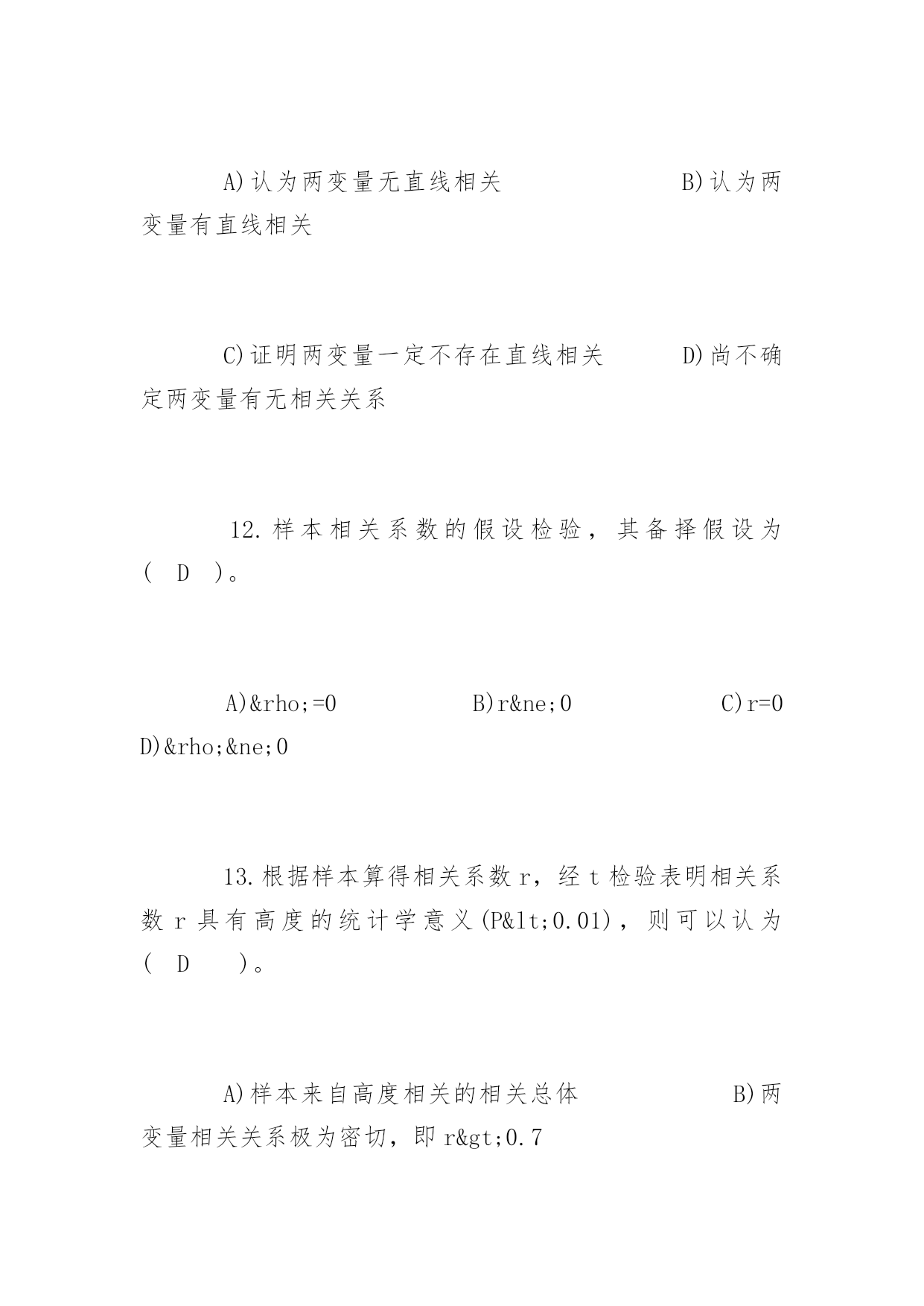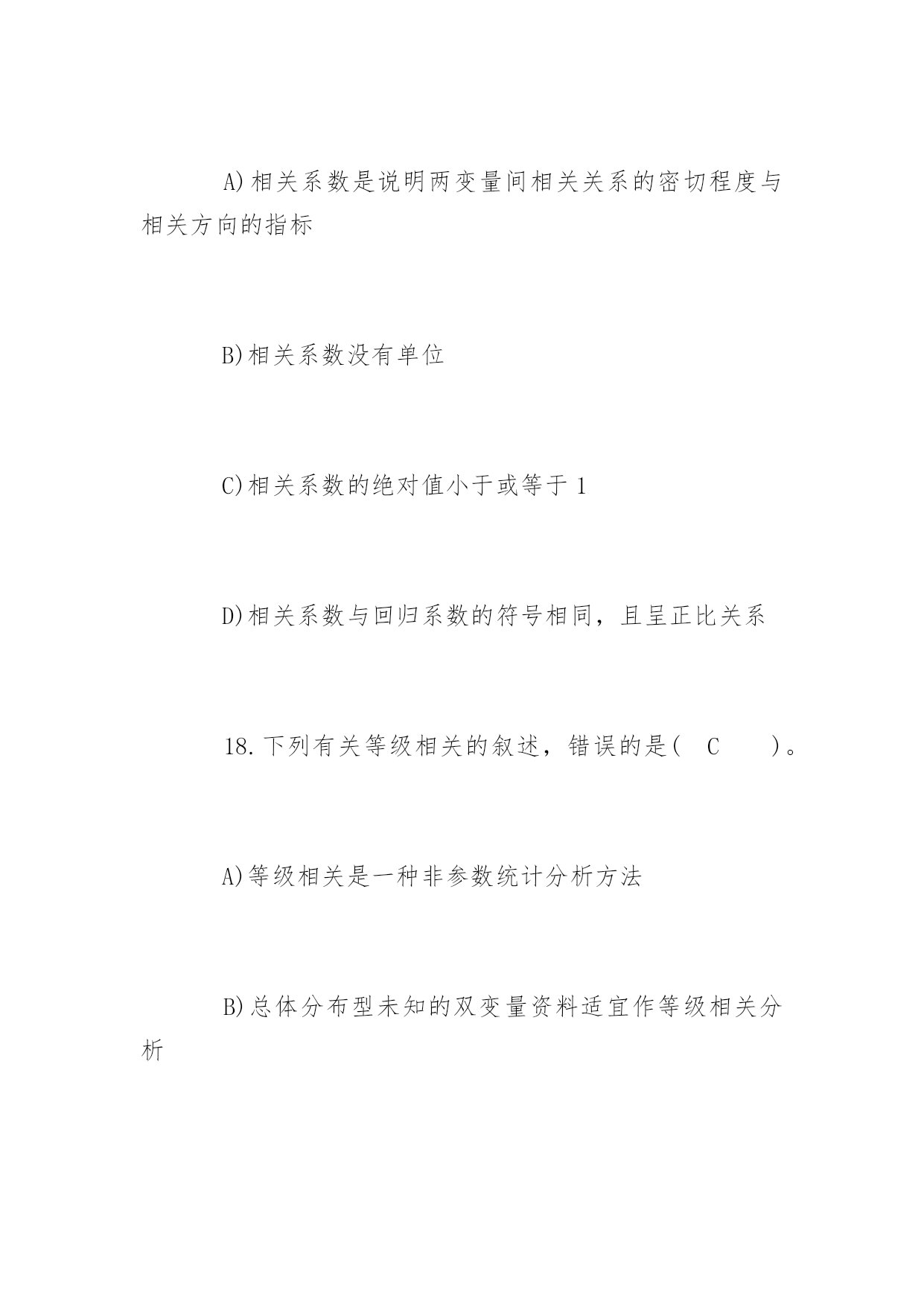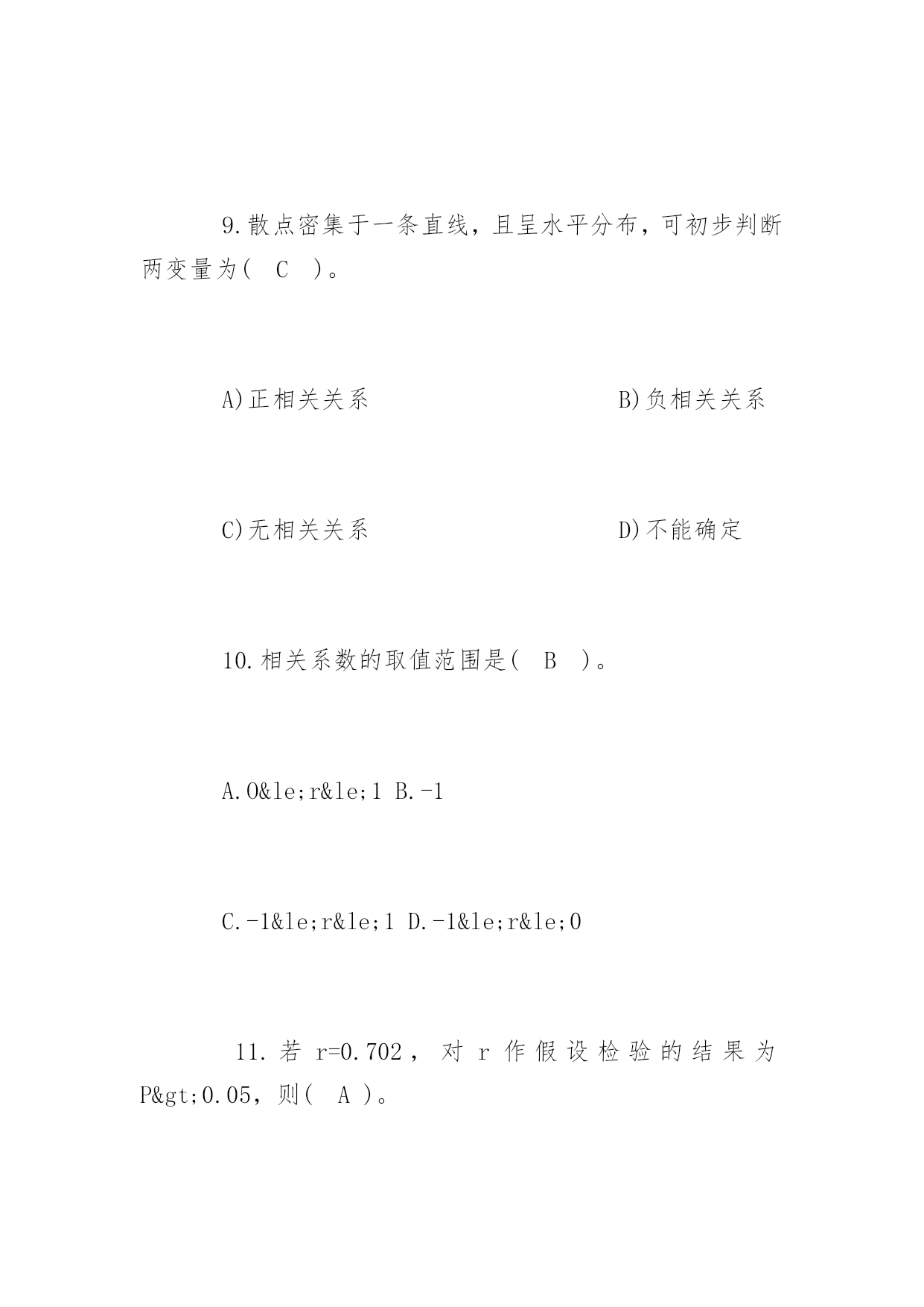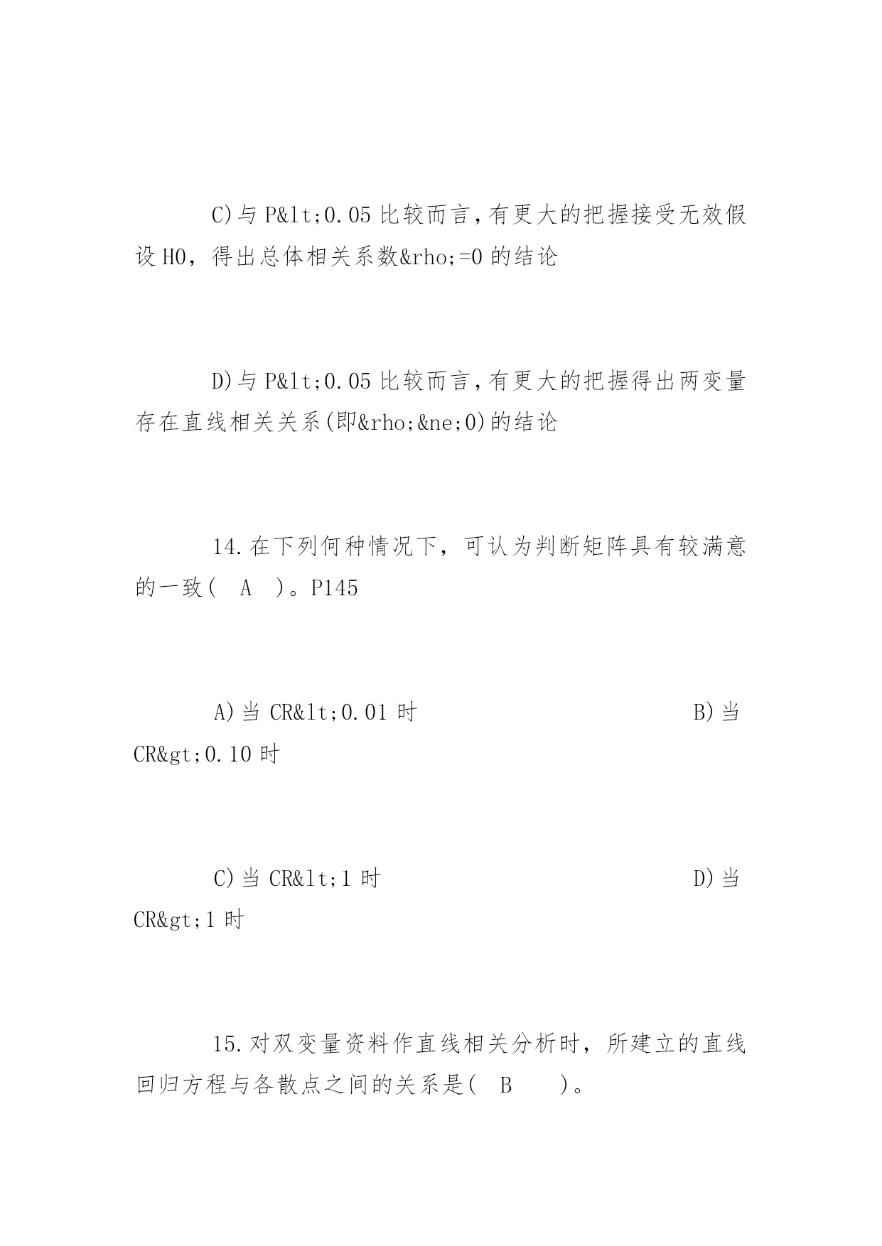 公共卫生执业医师考试冲刺题及答案2017公共卫生执业医师考试冲刺题及答案冲刺题一:1.下列统计方法中属于非(参检验的)是(D)。A)u检验B)t检验C)方差检验D)秩和检验2.配对计量资料,差值分布不接近正态分布,应选用(C)。A)配对t检验B)X2检验C)配对比较的符号秩和检验D)两样本比较的秩和检验3.作配对比较的符号秩和检验,其统计量是(B)。P105A)F值B)T值C)H值D)M值4.两样本比较的秩和检验中,备择假设是(B)。A)两个样本的总体分布相同B)两个样本的总体分布不同C)两个样本的总体均数不同D)差值总体的中位数不等于05.两个小样本计量资料的比较,首先应考虑(D)。A)用t检验B)用秩和检验C)t检验或秩和检验均可D)资料符合t检验还是符合秩和检验6.秩和检验与t检验比较,其优点是(D)。A)检验效率较高B)计算方法简便C)公式更为合理D)不受分布限制7.如果能用t检验处理的资料而用秩和检验,其缺点是(A)。A)检验效率降低B)求秩和不对C)计算方法复杂D)结果判断全错8.散点呈直线趋势分布,当x值增大,y值则相应减少,可初步判断两变量为(C)。A)散点完全在一条直线上B)散点完全在一条直线上,且随x值增大,y值有增大趋势C)散点分布大致呈直线,且随x值增大,y值减小D)散点分布大致呈直线,且随x值增大,y值增大9.散点密集于一条直线,且呈水平分布,可初步判断两变量为(C)。A)正相关关系B)负相关关系C)无相关关系D)不能确定10.相关系数的取值范围是(B)。A.O≤r≤1B.-1C.-1≤r≤1D.-1≤r≤011.若r=0.702,对r作假设检验的结果为P>0.05,则(A)。A)认为两变量无直线相关B)认为两变量有直线相关C)证明两变量一定不存在直线相关D)尚不确定两变量有无相关关系12.样本相关系数的假设检验,其备择假设为(D)。A)ρ=0B)r≠0C)r=0D)ρ≠013.根据样本算得相关系数r,经t检验表明相关系数r具有高度的统计学意义(P<0.01),则可以认为(D)。A)样本来自高度相关的相关总体B)两变量相关关系极为密切,即r>0.7C)与P<0.05比较而言,有更大的把握接受无效假设H0,得出总体相关系数ρ=0的结论D)与P<0.05比较而言,有更大的把握得出两变量存在直线相关关系(即ρ≠0)的结论14.在下列何种情况下,可认为判断矩阵具有较满意的一致(A)。P145A)当CR<0.01时B)当CR>0.10时C)当CR<1时D)当CR>1时15.对双变量资料作直线相关分析时,所建立的直线回归方程与各散点之间的关系是(B)。A)各散点都将散落在由直线回归方程所确定的回归直线上B)各散点与该回归直线的纵向距离平方和是最小的C)要求各散点应尽量靠近该回归直线D)以上都不对16.直线回归系数假设检验,其自由度为(C)。A)nB)n-1C)n-2D)2n-117.关于相关系数,下列说法错误的是(D)。A)相关系数是说明两变量间相关关系的密切程度与相关方向的指标B)相关系数没有单位C)相关系数的绝对值小于或等于1D)相关系数与回归系数的符号相同,且呈正比关系18.下列有关等级相关的叙述,错误的是(C)。A)等级相关是一种非参数统计分析方法B)总体分布型未知的双变量资料适宜作等级相关分析C)等级相关分析是用相关系数r来说明两变量相关关系的密切程度与相关方向.(rs)D)等级相关分析计算简便,适用面广19.在缺乏有关历史资料,或指标难以数量化时,常用的筛选评价指标的方法是(C)。A)文献资料分析优选法B)多元回归法C)系统分析法D)指标聚类法20.在掌握有关历史资料的条件下,对于可数量化的指标,常用的筛选评价指标的方法是(B)。A)文献资料分析优选法B)多元回归法C)系统分析法D)指标聚类法冲刺题二:1.抽样研究中的样本是(C)。A)研究对象的全体B)总体中特定的一部分C)总体中随机抽取的一部分D)随意收集的一些观察对象2.对某样品进行测量时,由于测量仪器事先未校正,造成测量结果普遍偏高,这种误差属于(A)。A)系统误差B)随机测量误差C)抽样误差D)随机误差3.欲了解某市某年所有三级甲医院的病床数,该市每个三级甲医院就是一个(B)。A)有限总体B)观察单位C)无限总体D)观察值4.下面的变量中哪个是数值变量(B)。A)每个病人就诊的科室B)每个病人就诊的次数C)每个病人就诊的疾病D)每个病人就诊的医