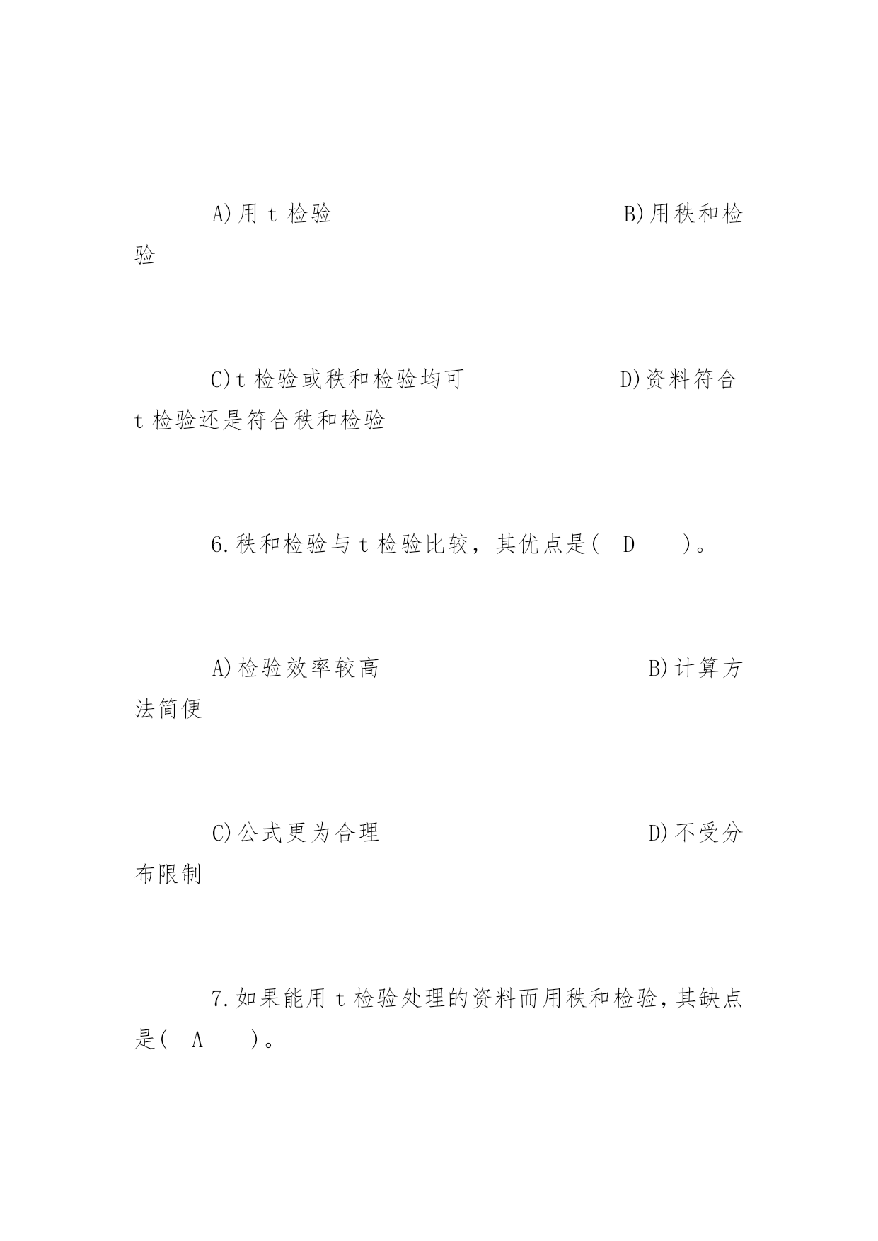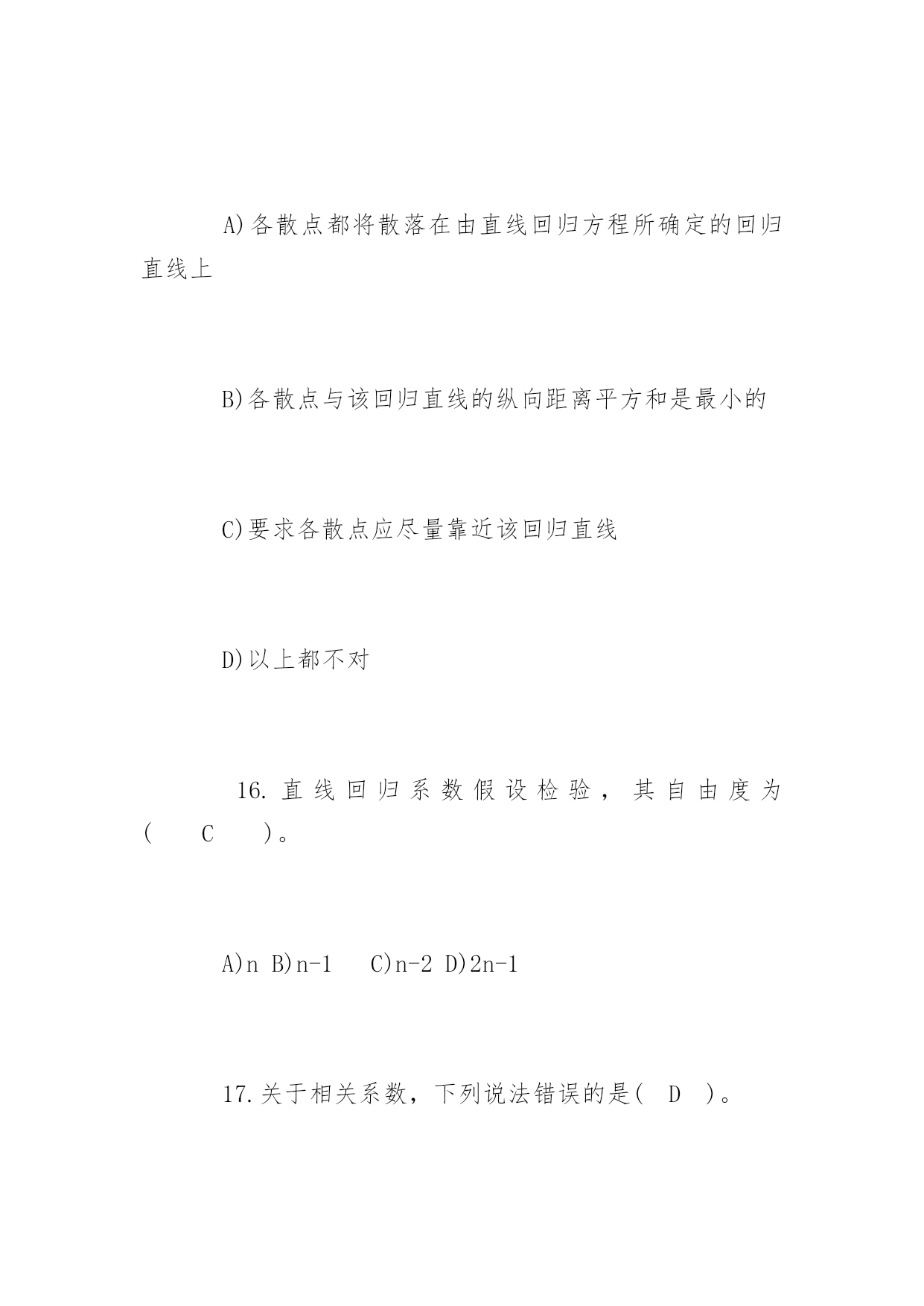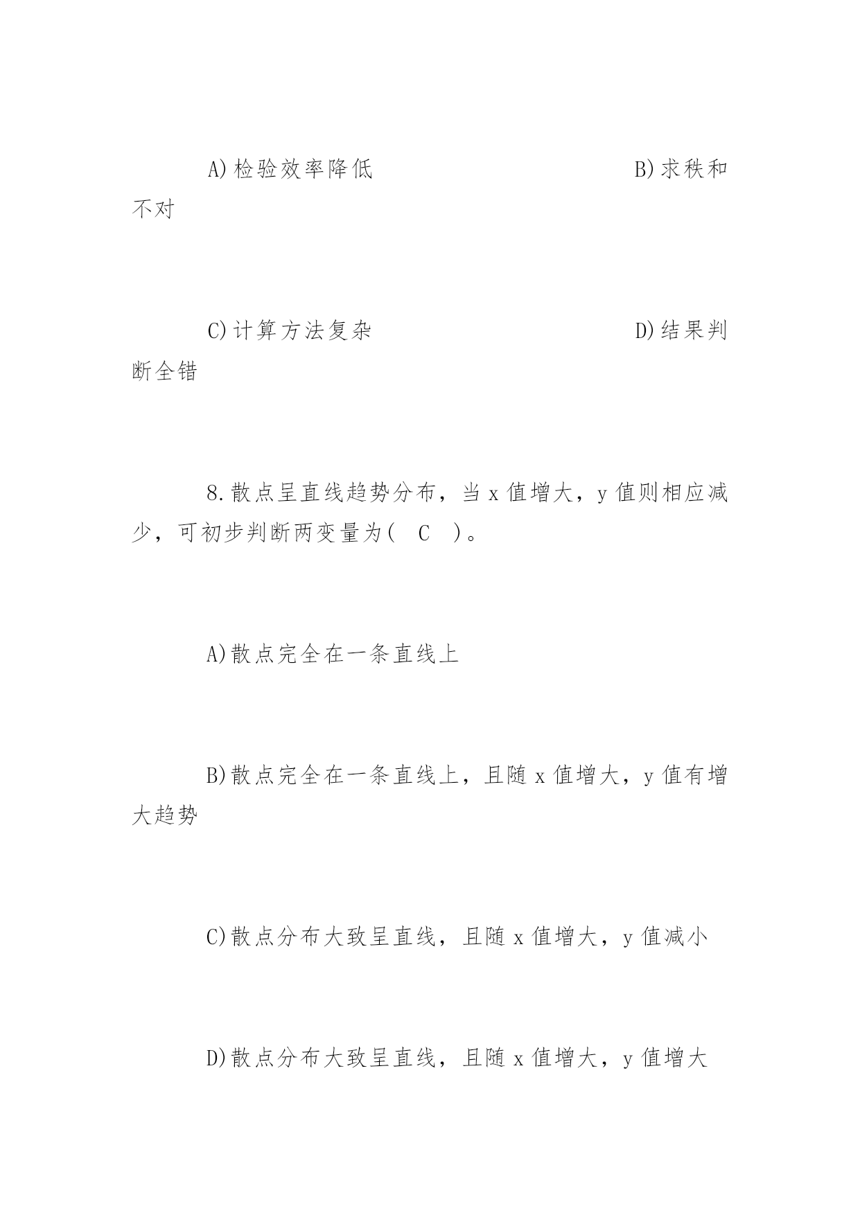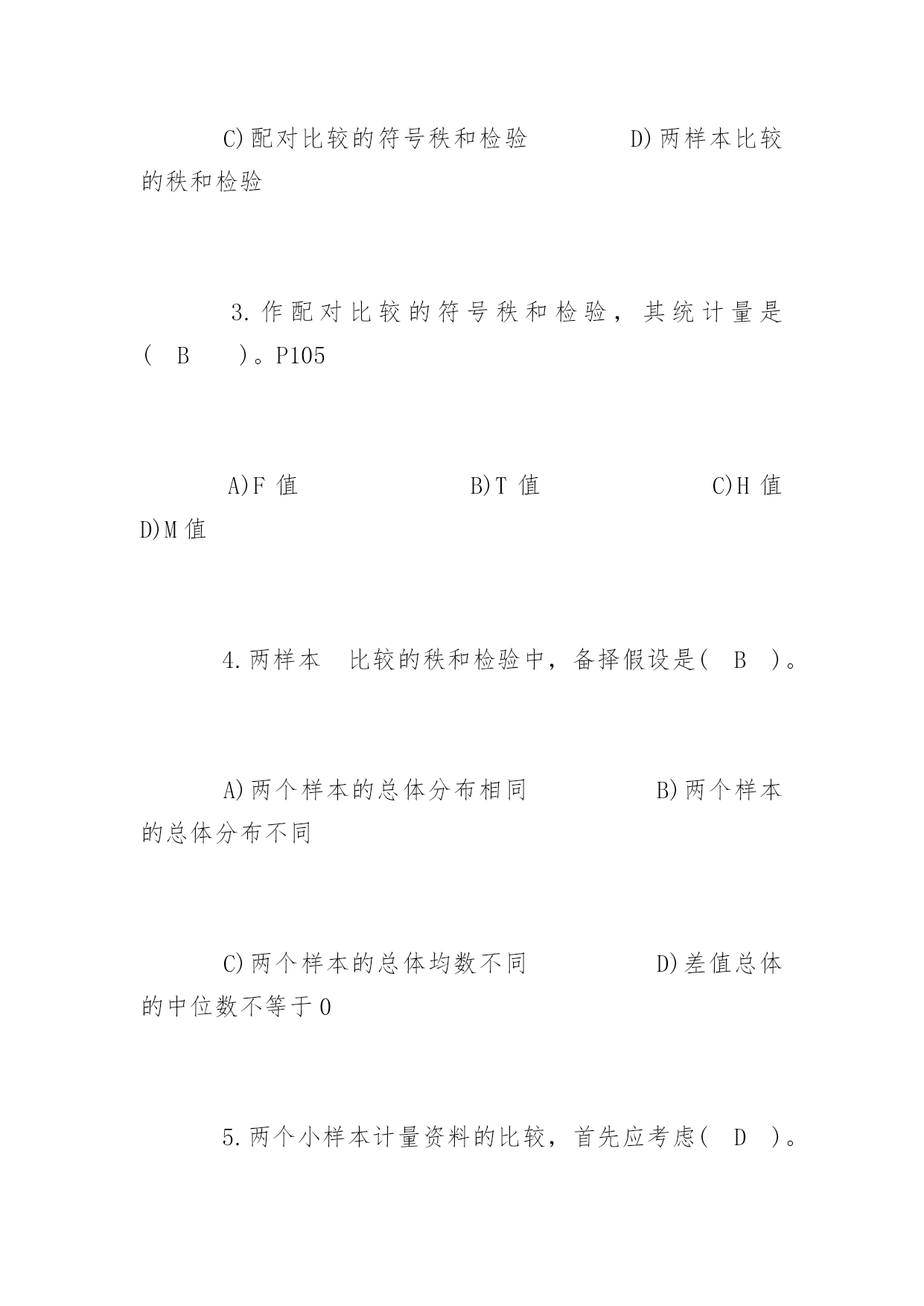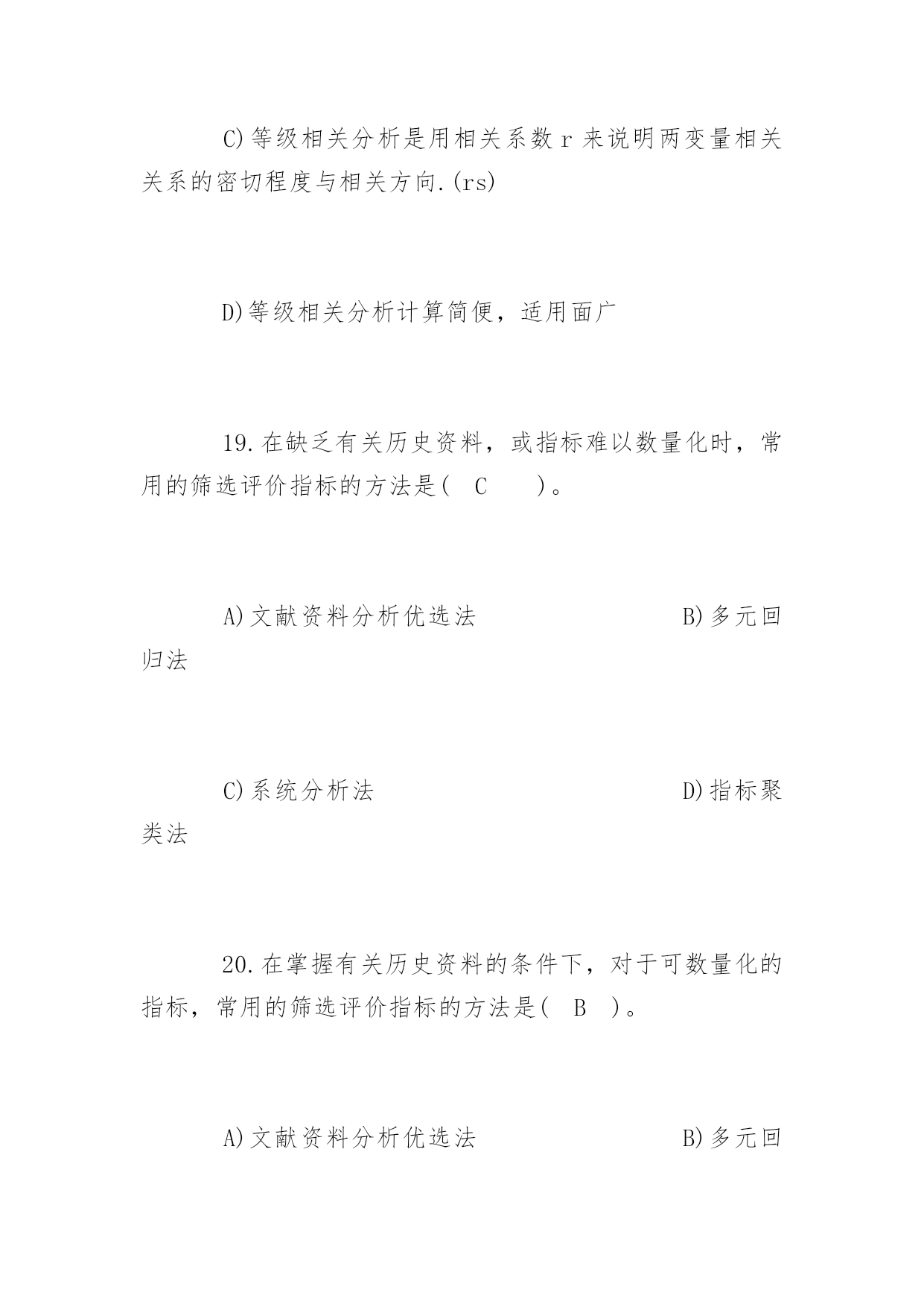 公共卫生执业医师考试冲刺题及答案2017公共卫生执业医师考试冲刺题及答案冲刺题一:1.下列统计方法中属于非(参检验的)是(D)。A)u检验B)t检验C)方差检验D)秩和检验2.配对计量资料,差值分布不接近正态分布,应选用(C)。A)配对t检验B)X2检验C)配对比较的符号秩和检验D)两样本比较的秩和检验3.作配对比较的符号秩和检验,其统计量是(B)。P105A)F值B)T值C)H值D)M值4.两样本比较的秩和检验中,备择假设是(B)。A)两个样本的总体分布相同B)两个样本的总体分布不同C)两个样本的总体均数不同D)差值总体的中位数不等于05.两个小样本计量资料的比较,首先应考虑(D)。A)用t检验B)用秩和检验C)t检验或秩和检验均可D)资料符合t检验还是符合秩和检验6.秩和检验与t检验比较,其优点是(D)。A)检验效率较高B)计算方法简便C)公式更为合理D)不受分布限制7.如果能用t检验处理的资料而用秩和检验,其缺点是(A)。A)检验效率降低B)求秩和不对C)计算方法复杂D)结果判断全错8.散点呈直线趋势分布,当x值增大,y值则相应减少,可初步判断两变量为(C)。A)散点完全在一条直线上B)散点完全在一条直线上,且随x值增大,y值有增大趋势C)散点分布大致呈直线,且随x值增大,y值减小D)散点分布大致呈直线,且随x值增大,y值增大9.散点密集于一条直线,且呈水平分布,可初步判断两变量为(C)。A)正相关关系B)负相关关系C)无相关关系D)不能确定10.相关系数的取值范围是(B)。A.O≤r≤1B.-1C.-1≤r≤1D.-1≤r≤011.若r=0.702,对r作假设检验的结果为P>0.05,则(A)。A)认为两变量无直线相关B)认为两变量有直线相关C)证明两变量一定不存在直线相关D)尚不确定两变量有无相关关系12.样本相关系数的假设检验,其备择假设为(D)。A)ρ=0B)r≠0C)r=0D)ρ≠013.根据样本算得相关系数r,经t检验表明相关系数r具有高度的统计学意义(P<0.01),则可以认为(D)。A)样本来自高度相关的相关总体B)两变量相关关系极为密切,即r>0.7C)与P<0.05比较而言,有更大的把握接受无效假设H0,得出总体相关系数ρ=0的结论D)与P<0.05比较而言,有更大的把握得出两变量存在直线相关关系(即ρ≠0)的结论14.在下列何种情况下,可认为判断矩阵具有较满意的一致(A)。P145A)当CR<0.01时B)当CR>0.10时C)当CR<1时D)当CR>1时15.对双变量资料作直线相关分析时,所建立的直线回归方程与各散点之间的关系是(B)。A)各散点都将散落在由直线回归方程所确定的回归直线上B)各散点与该回归直线的纵向距离平方和是最小的C)要求各散点应尽量靠近该回归直线D)以上都不对16.直线回归系数假设检验,其自由度为(C)。A)nB)n-1C)n-2D)2n-117.关于相关系数,下列说法错误的是(D)。A)相关系数是说明两变量间相关关系的密切程度与相关方向的指标B)相关系数没有单位C)相关系数的绝对值小于或等于1D)相关系数与回归系数的符号相同,且呈正比关系18.下列有关等级相关的叙述,错误的是(C)。A)等级相关是一种非参数统计分析方法B)总体分布型未知的双变量资料适宜作等级相关分析C)等级相关分析是用相关系数r来说明两变量相关关系的密切程度与相关方向.(rs)D)等级相关分析计算简便,适用面广19.在缺乏有关历史资料,或指标难以数量化时,常用的筛选评价指标的方法是(C)。A)文献资料分析优选法B)多元回归法C)系统分析法D)指标聚类法20.在掌握有关历史资料的条件下,对于可数量化的指标,常用的筛选评价指标的方法是(B)。A)文献资料分析优选法B)多元回归法C)系统分析法D)指标聚类法冲刺题二:1.抽样研究中的样本是(C)。A)研究对象的全体B)总体中特定的一部分C)总体中随机抽取的一部分D)随意收集的一些观察对象2.对某样品进行测量时,由于测量仪器事先未校正,造成测量结果普遍偏高,这种误差属于(A)。A)系统误差B)随机测量误差C)抽样误差D)随机误差3.欲了解某市某年所有三级甲医院的病床数,该市每个三级甲医院就是一个(B)。A)有限总体B)观察单位C)无限总体D)观察值4.下面的变量中哪个是数值变量(B)。A)每个病人就诊的科室B)每个病人就诊的次数C)每个病人就诊的疾病D)每个病人就诊的医
