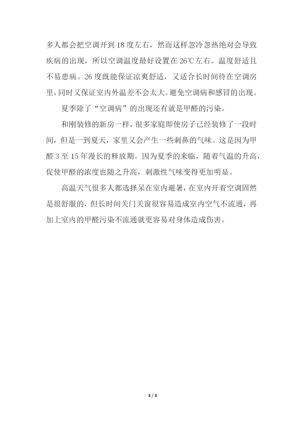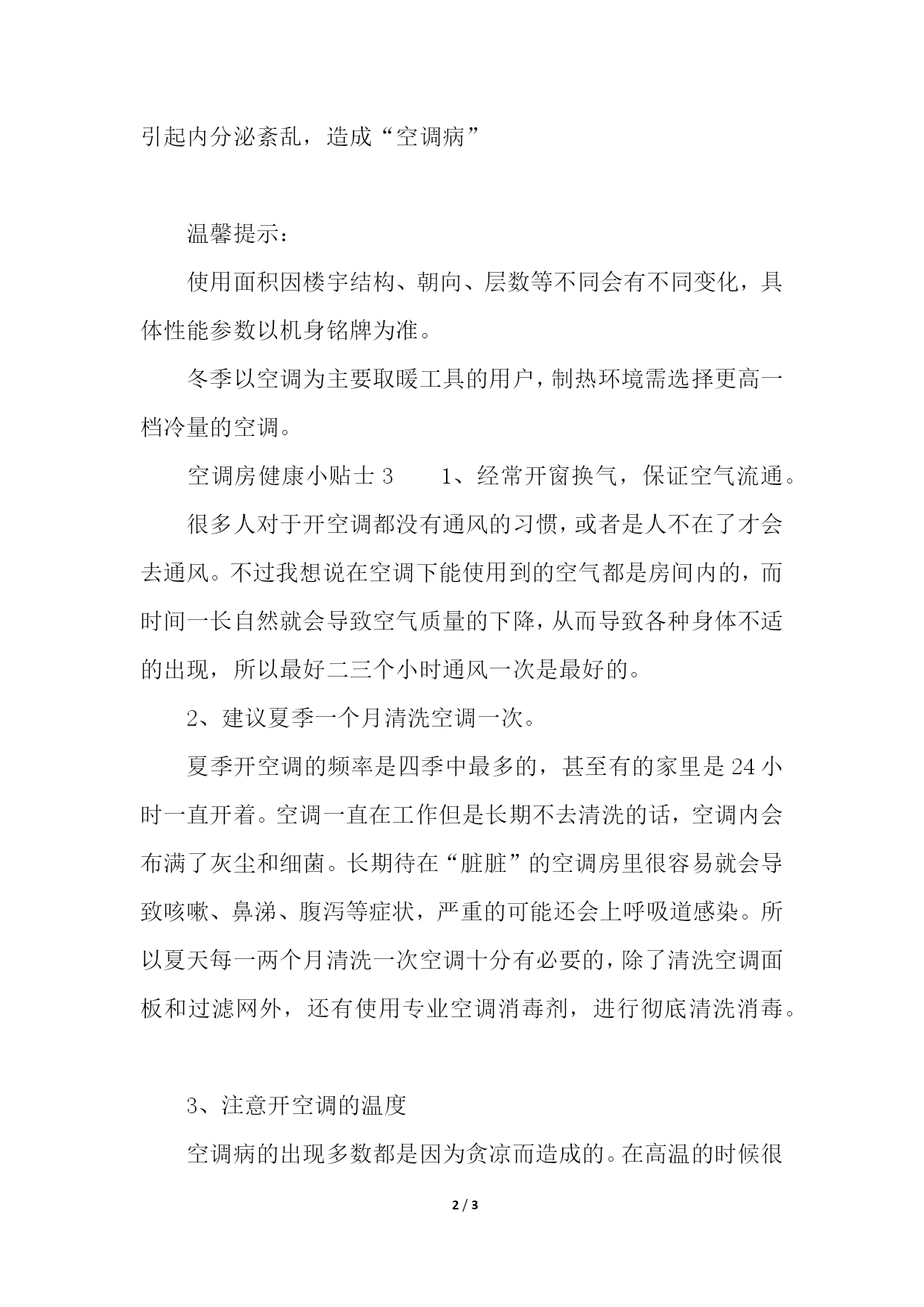 PAGE3/NUMPAGES3空调房健康小贴士孩童家有小孩的用户也要和老人的使用注意一样,不能温度过低,并且使用时注意室内健康通风,并且加强孩子的室外活动。孕妇对于孕妇来说,在使用空调时一定要防止正对着人体吹风,并且过冷的温度也不适合孕妇,因为这时如果孕妇感冒的'话将会是一件很棘手的问题,所以自孕妇使用空调的过程中一定要遵循健康、温度适宜,多户外、健康的原则。空调房健康小贴士21、在家里尽量不要24小时连续开启空调,不要全天候关闭窗户,地毯、床单、沙发、也需要经常清洗,以防细菌滋生。2、如果你是长时间在有空调的写字楼办公,应适当添加衣物,偶尔也要站起来活动一下筋骨,以增进血液循环。3、室内温度设置在25、5度最为适宜,室内外温差最好不要超过7度,减少人体功能调节负担。4、经常开窗换气,以确保室内外空气的对流,有条件也可使用空气净化设备,有效的去除室内的细菌等。5、办公桌位置尽量不要靠近空气冷气的直吹处,因为该处空气流动快且温度或高或低,容易使人体表面的毛孔强烈收缩,引起内分泌紊乱,造成“空调病”温馨提示:使用面积因楼宇结构、朝向、层数等不同会有不同变化,具体性能参数以机身铭牌为准。冬季以空调为主要取暖工具的用户,制热环境需选择更高一档冷量的空调。空调房健康小贴士31、经常开窗换气,保证空气流通。很多人对于开空调都没有通风的习惯,或者是人不在了才会去通风。不过我想说在空调下能使用到的空气都是房间内的,而时间一长自然就会导致空气质量的下降,从而导致各种身体不适的出现,所以最好二三个小时通风一次是最好的。2、建议夏季一个月清洗空调一次。夏季开空调的频率是四季中最多的,甚至有的家里是24小时一直开着。空调一直在工作但是长期不去清洗的话,空调内会布满了灰尘和细菌。长期待在“脏脏”的空调房里很容易就会导致咳嗽、鼻涕、腹泻等症状,严重的可能还会上呼吸道感染。所以夏天每一两个月清洗一次空调十分有必要的,除了清洗空调面板和过滤网外,还有使用专业空调消毒剂,进行彻底清洗消毒。3、注意开空调的温度空调病的出现多数都是因为贪凉而造成的。在高温的时候很多人都会把空调开到18度左右,然而这样忽冷忽热绝对会导致疾病的出现,所以空调温度最好设置在26℃左右。温度舒适且不易患病。26度既能保证凉爽舒适,又适合长时间待在空调房里,同时又保证室内外温差不会太大。避免空调病和感冒的出现。夏季除了“空调病”的出现还有就是甲醛的污染。和刚装修的新房一样,很多家庭即使房子已经装修了一段时间,但是一到夏天,家里又会产生一些刺鼻的气味。这是因为甲醛3至15年漫长的释放期。因为夏季的来临,随着气温的升高,促使甲醛的浓度也随之升高,刺激性气味变得更加明显。高温天气很多人都选择呆在室内避暑,在室内开着空调固然是很舒服的,但长时间关门关窗很容易造成室内空气不流通,再加上室内的甲醛污染不流通就更容易对身体造成伤害。