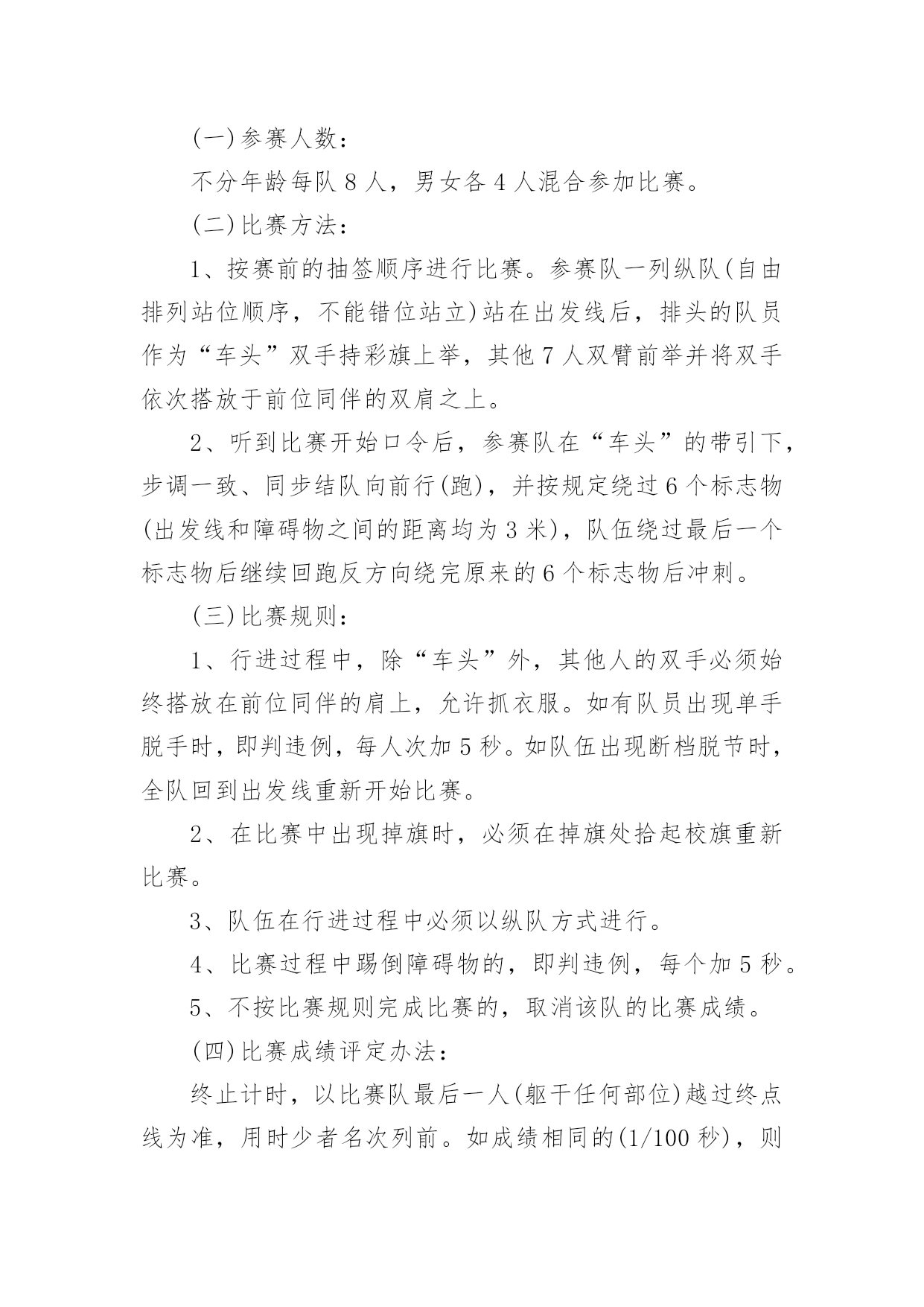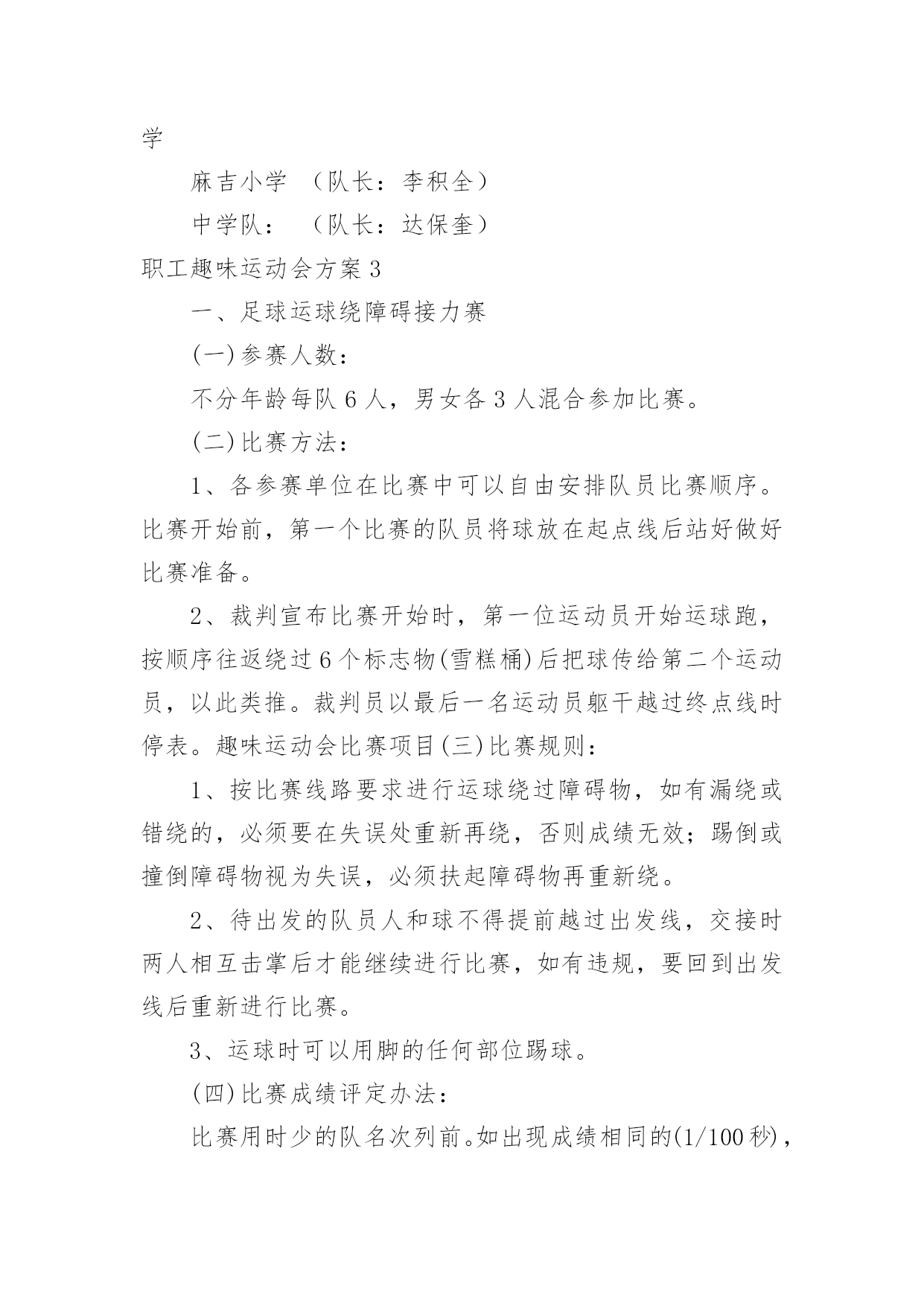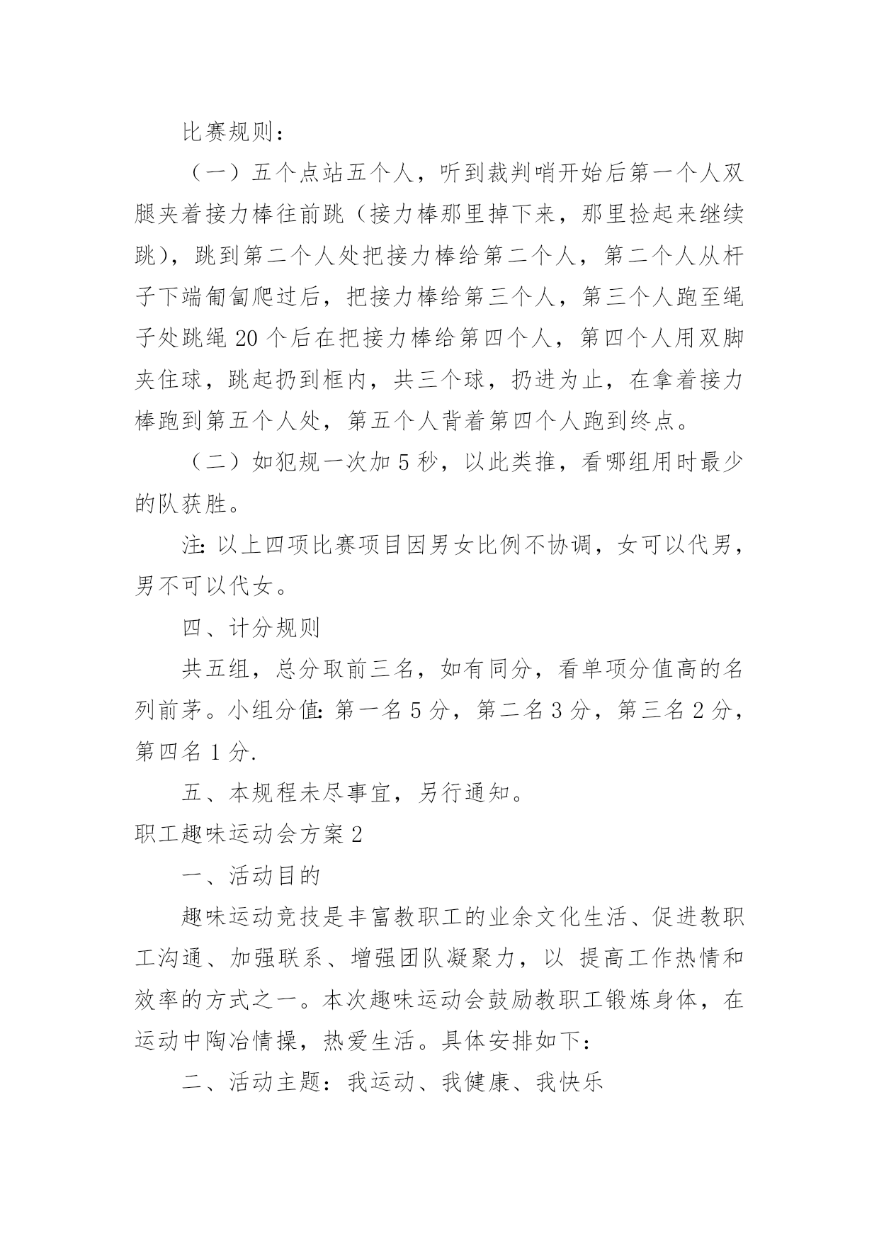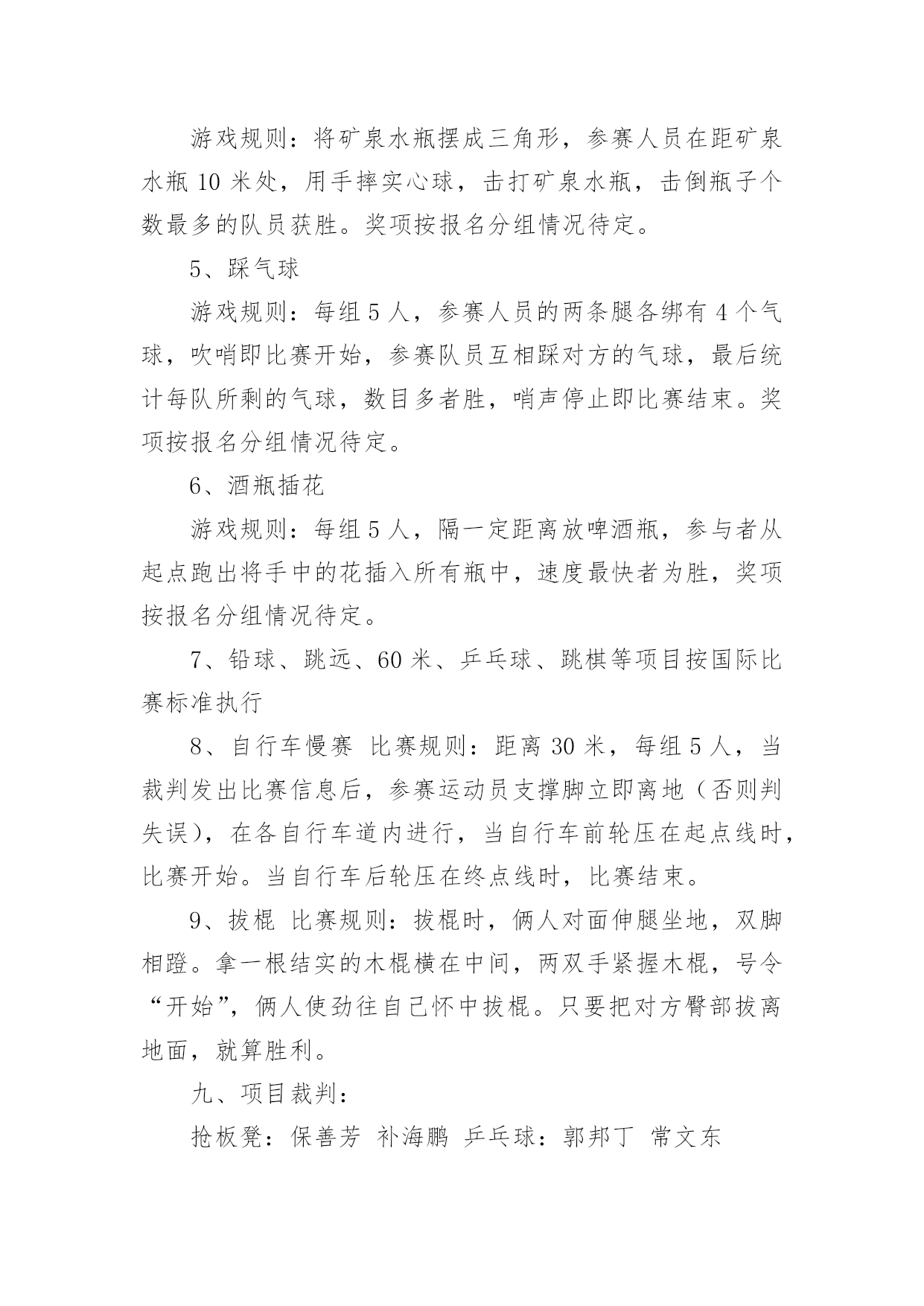 职工趣味运动会方案职工趣味运动会方案为了确保工作或事情能有条不紊地开展,常常需要提前进行细致的方案准备工作,方案是解决一个问题或者一项工程,一个课题的详细过程。那么问题来了,方案应该怎么写?下面是小编为大家整理的职工趣味运动会方案,仅供参考,希望能够帮助到大家。职工趣味运动会方案1一、活动目的为了丰富广大教师的校园生活,营造健康文明、积极向上的校园氛围,增强教师间的凝聚力和合作意识,愉悦心情,特举办本次趣味运动会。二、活动时间和地点时间:10月15日--16日地点:篮球场三、项目1.项目名称:《定点投篮》参赛人数:男2女3比赛规则:(一)投篮者在篮球场三秒区线上的0度角、45度角、90度角(罚球线)处投篮;(二)投篮的顺序依次为零度角、45度角、90度角、45度角、零度角,左右顺序自选;(三)每人连续投5个球,以参赛运动员投中球的总数计算成绩,投中数多的队名次列前,若总数相同,则以个人成绩决定名次。2.项目名称:《跳大绳》参赛人数:10人,至少一名男运动员比赛规则:(一)比赛时间,限时2分钟,绳子长短不限;(二)比赛中,2人摇绳,其他人同时跳,要求参赛队员们配合默契,一鼓作气完成比赛;(三)比赛当中绳子受挡中断时,在限定时间内可以继续重跳,跳动个数连续计算;(四)在限定时间内所跳总次数多者为胜,若出现成绩相同,则抽签决定名次。3.项目名称:《踢准》参赛人数:5人,男女不限比赛规则:(一)球门分为六大格,第一排3分2分3分,第二排2分1分2分;(二)每人连续踢3个球,以参赛运动员踢中格子的分数相加计算成绩,踢中数多的队名次列前,若总数相同,则以个人成绩决定名次。4.项目名称:《串烧接力》参赛人员:男女不限,5人比赛规则:(一)五个点站五个人,听到裁判哨开始后第一个人双腿夹着接力棒往前跳(接力棒那里掉下来,那里捡起来继续跳),跳到第二个人处把接力棒给第二个人,第二个人从杆子下端匍匐爬过后,把接力棒给第三个人,第三个人跑至绳子处跳绳20个后在把接力棒给第四个人,第四个人用双脚夹住球,跳起扔到框内,共三个球,扔进为止,在拿着接力棒跑到第五个人处,第五个人背着第四个人跑到终点。(二)如犯规一次加5秒,以此类推,看哪组用时最少的队获胜。注:以上四项比赛项目因男女比例不协调,女可以代男,男不可以代女。四、计分规则共五组,总分取前三名,如有同分,看单项分值高的名列前茅。小组分值:第一名5分,第二名3分,第三名2分,第四名1分.五、本规程未尽事宜,另行通知。职工趣味运动会方案2一、活动目的趣味运动竞技是丰富教职工的业余文化生活、促进教职工沟通、加强联系、增强团队凝聚力,以提高工作热情和效率的方式之一。本次趣味运动会鼓励教职工锻炼身体,在运动中陶冶情操,热爱生活。具体安排如下:二、活动主题:我运动、我健康、我快乐三、活动时间:20xx年XX月28日四、活动地点:中学操场五、参加活动人员:全体教职工六、组织机构(一)、运动会组委会主任:那朝庆副主任:段宝荣达保奎鲁国山任国福成员:达彪王有范宋明清韩占成刘永仓(二)、裁判组总裁判长:李洪鹏裁判员:刘永仓刘成玉邢世海(三)、会务组组长:任国福成员:李建邦补海鹏张成武摄像:张成武(四)、秘书组组长:段宝荣成员:王有范保善芳播音:周玉萍俞丽君(五)、后勤组组长:韩占成成员:全体食堂工作人员学生:10名(六)、安全保卫组组长:刘永仓组员:门卫七、比赛项目:集体赛:1、篮球(每队出5人5男参加)2、大队接力(每队出10人5男5女参加)3、拔河比赛(每队出10人5男5女参加)4、穿针引线(每队出10人5男5女参加)个人赛:抢板凳、保龄球、袋鼠跳、铅球、跳远、60米、自行车慢赛乒乓球、酒瓶插花踩气球、夹乒乓球、跳棋、拔棍(每人限报4项)八、项目比赛规则及奖项:1、抢板凳游戏规则:每组6人围着4个椅子站一圈,裁判员敲鼓。鼓响人转,鼓停看谁抢到座位。每次淘汰2人,之后再减少2个椅子。如此循环,直到最后2人胜出。游戏规则:裁判唱歌或打鼓等,游戏者围绕凳子转圈,可拍掌助兴。裁判声停,既可抢凳子。奖项按报名分组情况待定。2、夹乒乓球游戏规则:距离:5米,参赛人员从A点夹乒乓球5个到B点。奖项按报名分组情况待定。3、袋鼠跳游戏规则:参赛队员站在跑道一端,并将自己站在麻袋内,手提袋口向跑道另一端的跳去,记录员记好时间,并登记,统计出名次。奖项按报名分组情况待定。4、趣味保龄球游戏规则:将矿泉水瓶摆成三角形,参赛人员在距矿泉水瓶10米处,用手摔实心球,击打矿泉水瓶,击倒瓶子个数最多的队员获胜。奖项按报名分组情况待定。5、踩气球游戏规则:每组5人,参赛人员的两条腿各绑有4个气球,吹哨即比赛开始,参赛队员互相踩对方的气球,最后统计每队所剩的气球,数目多者胜,哨声停止即比赛结束。奖项按报名分组情况待定。6、酒瓶插花游戏规则:每组5人