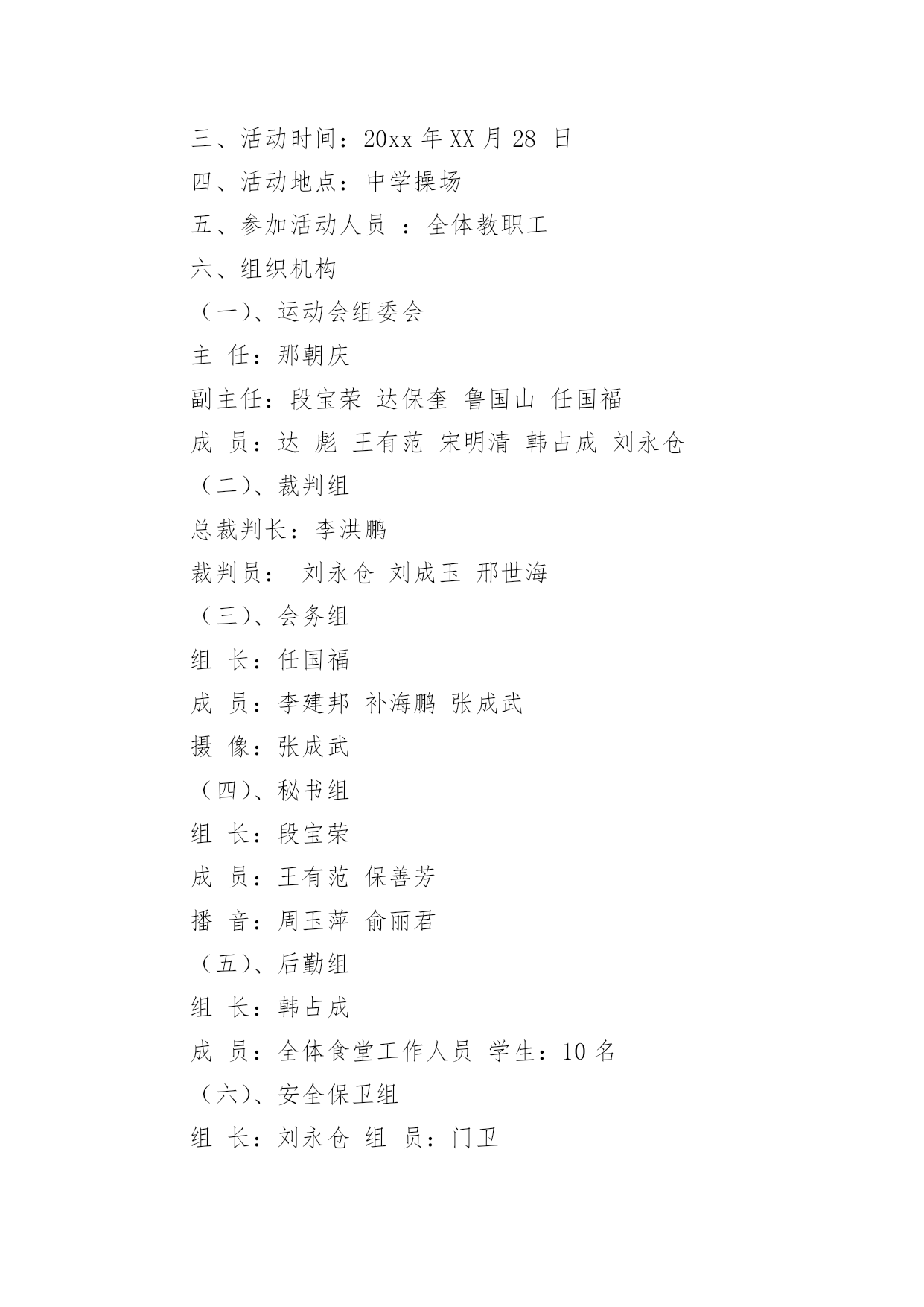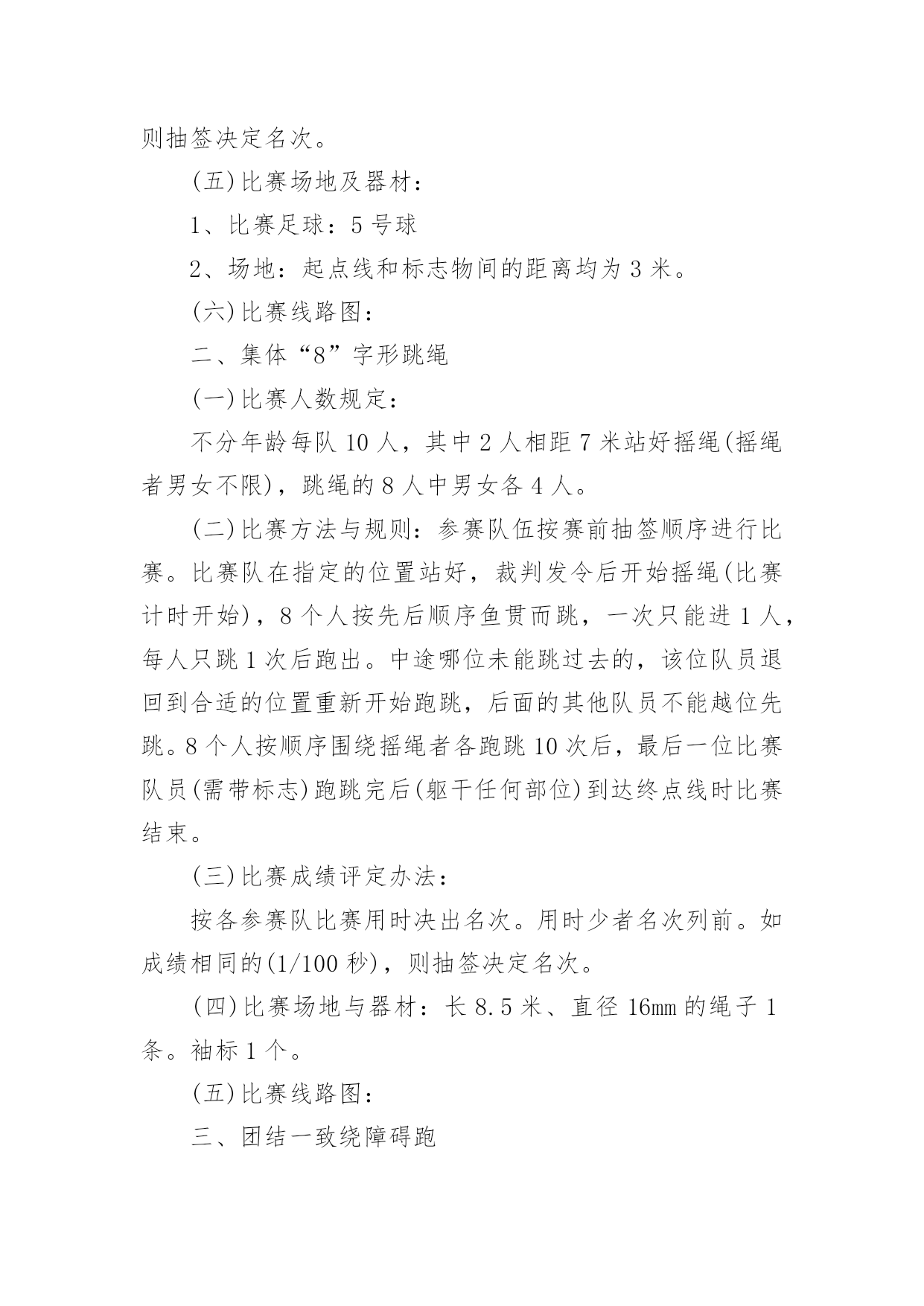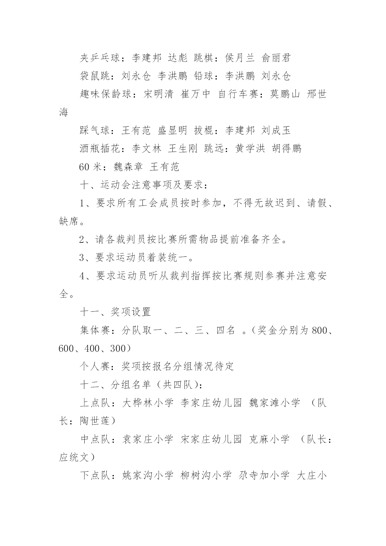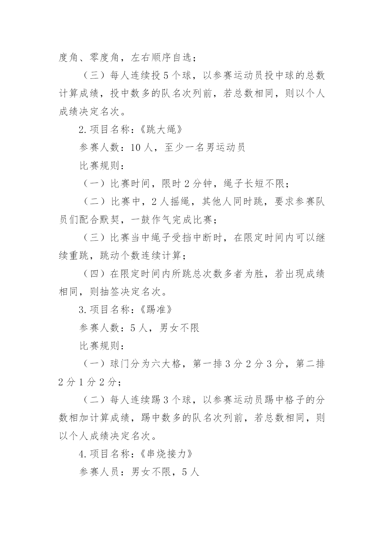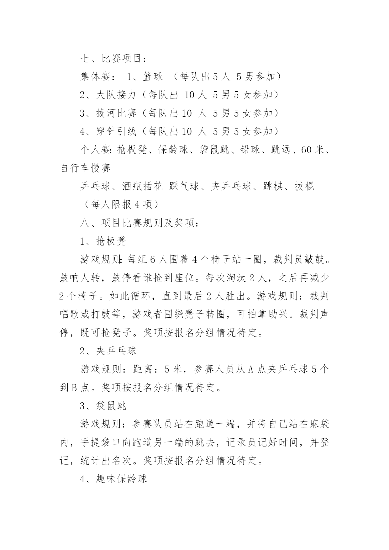 职工趣味运动会方案职工趣味运动会方案为了确保工作或事情能有条不紊地开展,常常需要提前进行细致的方案准备工作,方案是解决一个问题或者一项工程,一个课题的详细过程。那么问题来了,方案应该怎么写?下面是小编为大家整理的职工趣味运动会方案,仅供参考,希望能够帮助到大家。职工趣味运动会方案1一、活动目的为了丰富广大教师的校园生活,营造健康文明、积极向上的校园氛围,增强教师间的凝聚力和合作意识,愉悦心情,特举办本次趣味运动会。二、活动时间和地点时间:10月15日--16日地点:篮球场三、项目1.项目名称:《定点投篮》参赛人数:男2女3比赛规则:(一)投篮者在篮球场三秒区线上的0度角、45度角、90度角(罚球线)处投篮;(二)投篮的顺序依次为零度角、45度角、90度角、45度角、零度角,左右顺序自选;(三)每人连续投5个球,以参赛运动员投中球的总数计算成绩,投中数多的队名次列前,若总数相同,则以个人成绩决定名次。2.项目名称:《跳大绳》参赛人数:10人,至少一名男运动员比赛规则:(一)比赛时间,限时2分钟,绳子长短不限;(二)比赛中,2人摇绳,其他人同时跳,要求参赛队员们配合默契,一鼓作气完成比赛;(三)比赛当中绳子受挡中断时,在限定时间内可以继续重跳,跳动个数连续计算;(四)在限定时间内所跳总次数多者为胜,若出现成绩相同,则抽签决定名次。3.项目名称:《踢准》参赛人数:5人,男女不限比赛规则:(一)球门分为六大格,第一排3分2分3分,第二排2分1分2分;(二)每人连续踢3个球,以参赛运动员踢中格子的分数相加计算成绩,踢中数多的队名次列前,若总数相同,则以个人成绩决定名次。4.项目名称:《串烧接力》参赛人员:男女不限,5人比赛规则:(一)五个点站五个人,听到裁判哨开始后第一个人双腿夹着接力棒往前跳(接力棒那里掉下来,那里捡起来继续跳),跳到第二个人处把接力棒给第二个人,第二个人从杆子下端匍匐爬过后,把接力棒给第三个人,第三个人跑至绳子处跳绳20个后在把接力棒给第四个人,第四个人用双脚夹住球,跳起扔到框内,共三个球,扔进为止,在拿着接力棒跑到第五个人处,第五个人背着第四个人跑到终点。(二)如犯规一次加5秒,以此类推,看哪组用时最少的队获胜。注:以上四项比赛项目因男女比例不协调,女可以代男,男不可以代女。四、计分规则共五组,总分取前三名,如有同分,看单项分值高的名列前茅。小组分值:第一名5分,第二名3分,第三名2分,第四名1分.五、本规程未尽事宜,另行通知。职工趣味运动会方案2一、活动目的趣味运动竞技是丰富教职工的业余文化生活、促进教职工沟通、加强联系、增强团队凝聚力,以提高工作热情和效率的方式之一。本次趣味运动会鼓励教职工锻炼身体,在运动中陶冶情操,热爱生活。具体安排如下:二、活动主题:我运动、我健康、我快乐三、活动时间:20xx年XX月28日四、活动地点:中学操场五、参加活动人员:全体教职工六、组织机构(一)、运动会组委会主任:那朝庆副主任:段宝荣达保奎鲁国山任国福成员:达彪王有范宋明清韩占成刘永仓(二)、裁判组总裁判长:李洪鹏裁判员:刘永仓刘成玉邢世海(三)、会务组组长:任国福成员:李建邦补海鹏张成武摄像:张成武(四)、秘书组组长:段宝荣成员:王有范保善芳播音:周玉萍俞丽君(五)、后勤组组长:韩占成成员:全体食堂工作人员学生:10名(六)、安全保卫组组长:刘永仓组员:门卫七、比赛项目:集体赛:1、篮球(每队出5人5男参加)2、大队接力(每队出10人5男5女参加)3、拔河比赛(每队出10人5男5女参加)4、穿针引线(每队出10人5男5女参加)个人赛:抢板凳、保龄球、袋鼠跳、铅球、跳远、60米、自行车慢赛乒乓球、酒瓶插花踩气球、夹乒乓球、跳棋、拔棍(每人限报4项)八、项目比赛规则及奖项:1、抢板凳游戏规则:每组6人围着4个椅子站一圈,裁判员敲鼓。鼓响人转,鼓停看谁抢到座位。每次淘汰2人,之后再减少2个椅子。如此循环,直到最后2人胜出。游戏规则:裁判唱歌或打鼓等,游戏者围绕凳子转圈,可拍掌助兴。裁判声停,既可抢凳子。奖项按报名分组情况待定。2、夹乒乓球游戏规则:距离:5米,参赛人员从A点夹乒乓球5个到B点。奖项按报名分组情况待定。3、袋鼠跳游戏规则:参赛队员站在跑道一端,并将自己站在麻袋内,手提袋口向跑道另一端的跳去,记录员记好时间,并登记,统计出名次。奖项按报名分组情况待定。4、趣味保龄球游戏规则:将矿泉水瓶摆成三角形,参赛人员在距矿泉水瓶10米处,用手摔实心球,击打矿泉水瓶,击倒瓶子个数最多的队员获胜。奖项按报名分组情况待定。5、踩气球游戏规则:每组5人,参赛人员的两条腿各绑有4个气球,吹哨即比赛开始,参赛队员互相踩对方的气球,最后统计每队所剩的气球,数目多者胜,哨声停止即比赛结束。奖项按报名分组情况待定。6、酒瓶插花游戏规则:每组5人