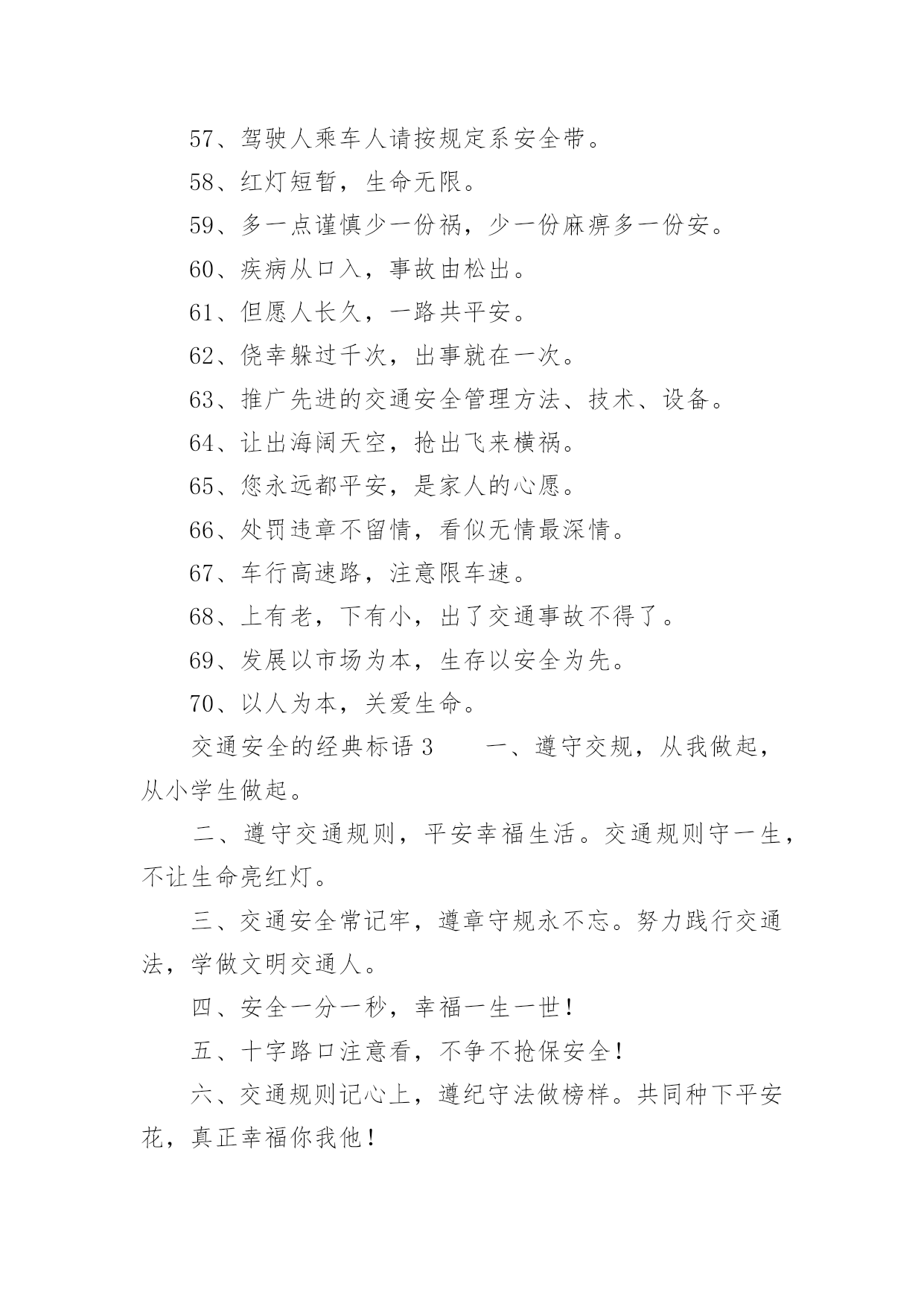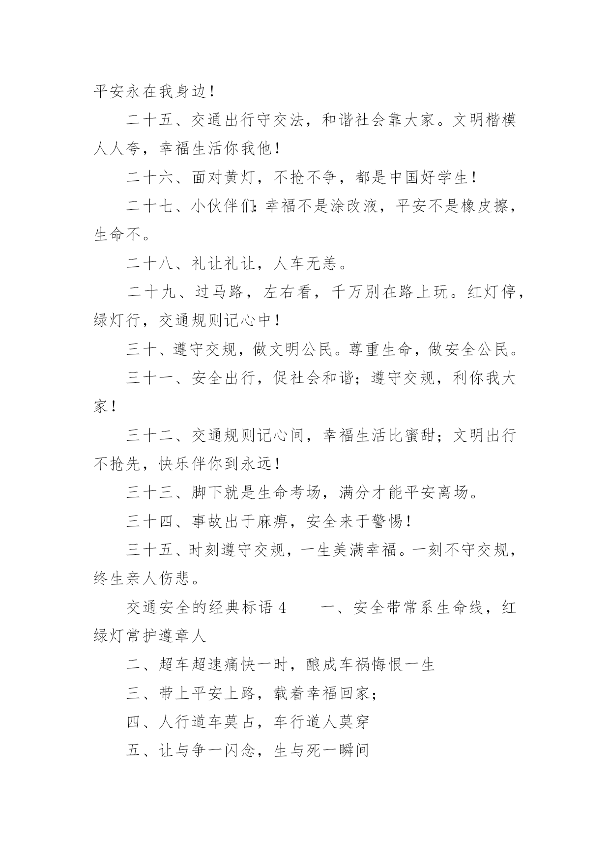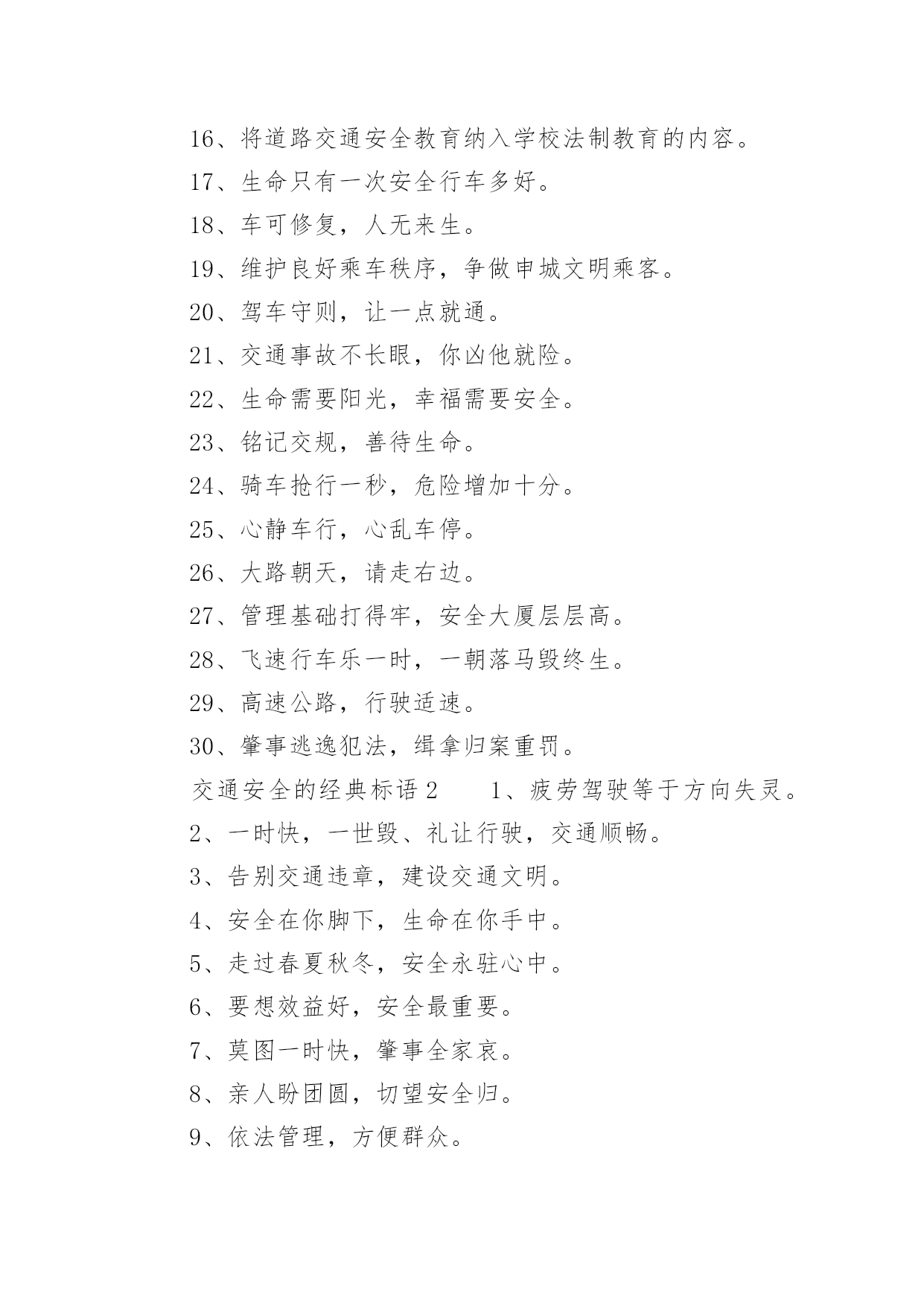 交通安全的经典标语交通安全的经典标语(精选165句)在平凡的学习、工作、生活中,大家最不陌生的就是标语了吧,标语既有公文语体准确、简洁的特点,又有政论语体严谨性、鼓动性的特点。那么什么样的标语才是好的标语呢?下面是小编为大家收集的交通安全的经典标语,仅供参考,欢迎大家阅读。交通安全的经典标语11、违法超载的重罚,酒后驾车害人害己。2、上班早出十分钟,路上安全有保证。3、握好方向盘,心中装安全。4、纠正您的违章是为了您和他人的安全。5、行人过马路要先看左,后看右,左右看清再通过。6、车好路好,安全。7、管理靠制度,制度在落实。8、司机遵章千家乐,安全畅通百业兴。9、人行横道车让人,各种车道人让车。10、拒酒千里外,安全万里行。11、经济以市场为本,交通以安全为先。12、守交规迎春夏秋冬福,保安全纳东西南北财。13、骑车上路别着急,争超抢道不安全。14、加强管理为人民群众,严格执法保交通安全。15、为了您和他人的幸福,请自觉遵守交通法规。16、将道路交通安全教育纳入学校法制教育的内容。17、生命只有一次安全行车多好。18、车可修复,人无来生。19、维护良好乘车秩序,争做申城文明乘客。20、驾车守则,让一点就通。21、交通事故不长眼,你凶他就险。22、生命需要阳光,幸福需要安全。23、铭记交规,善待生命。24、骑车抢行一秒,危险增加十分。25、心静车行,心乱车停。26、大路朝天,请走右边。27、管理基础打得牢,安全大厦层层高。28、飞速行车乐一时,一朝落马毁终生。29、高速公路,行驶适速。30、肇事逃逸犯法,缉拿归案重罚。交通安全的经典标语21、疲劳驾驶等于方向失灵。2、一时快,一世毁、礼让行驶,交通顺畅。3、告别交通违章,建设交通文明。4、安全在你脚下,生命在你手中。5、走过春夏秋冬,安全永驻心中。6、要想效益好,安全最重要。7、莫图一时快,肇事全家哀。8、亲人盼团圆,切望安全归。9、依法管理,方便群众。10、严守交通法规,呵护自己和他人的生命。11、智者以教训制止流血,愚者以流血换取教训。12、文明驾驶保安全,幸福祥和人欢乐。13、骑车上路别着急,争、超、抢道不安全。14、铭记法规,善待生命。15、路好车好安全,慢行快行平安就行。16、雨天雪天雾天,限制车速行驶。17、国家对机动车实行登记制度。18、严禁酒后开车非司机开车疲劳开车!19、骑车守秩序,行路讲公德。20、行路慎为本,开车礼当先。21、彼此让一让,安全有保障。22、享有交通权利时莫忘履行交通义务。23、一停二看三通过,不停不看出车祸。24、安全为了生产,生产必须安全。25、要做英雄人,不开“英雄”车。26、路无事故,就是财富。27、安全效应,平安共同心声。28、让道于人,安全于己。29、麻痹是事故的祸根!30、遵守交通法规是美德!31、驾车打瞌睡,一觉起不来。32、红灯停绿灯行,交通安全我能行。33、违章超载,得不偿失。34、讲究职业道德,保障交通安全。35、迟到总比永远不到好。36、人民城市人民建,人民交通人民管。37、好猎手离不开钢枪,好队伍离不开规章。38、违法驾驶危害大,交通安全系万家。39、夜间会车要谨慎,远光近光有分寸。40、行人过马路不能斜穿、也勿猛跑。41、车辆行驶,右侧通行。42、虽为坦途,超速者戒;纵有捷径,乱穿者止。43、穿马路,跨护栏,少公德,多危险。44、开车拨接电话,行车,行人危险大。45、道路交通要树立安全第一的`思想,落实预防为主的方针。46、机动车号牌应当按照规定悬挂并保持清晰、完整。47、开车多一份小心,家人多十分安心。48、安全行车千万里,文明礼让誉申城。49、谨慎驾驶一帆风顺,遵纪守法十分安全。50、高高兴兴上班来,平平安安回家去。51、母念妻等娇儿盼,愿君平安把家还。52、刹车不灵,不得外行。53、不讲卫生要生病,不讲安全要送命。54、开车莫喝酒,酒后莫开车。55、宁停三分为安全,礼让三先保平安。56、开文明礼貌车,愿一生无事故。57、驾驶人乘车人请按规定系安全带。58、红灯短暂,生命无限。59、多一点谨慎少一份祸,少一份麻痹多一份安。60、疾病从口入,事故由松出。61、但愿人长久,一路共平安。62、侥幸躲过千次,出事就在一次。63、推广先进的交通安全管理方法、技术、设备。64、让出海阔天空,抢出飞来横祸。65、您永远都平安,是家人的心愿。66、处罚违章不留情,看似无情最深情。67、车行高速路,注意限车速。68、上有老,下有小,出了交通事故不得了。69、发展以市场为本,生存以安全为先。70、以人为本,关爱生命。交通安全的经典标语3一、遵守交规,从我做起,从小学生做起。二、遵守交通规则,平安幸福生活。交通规则守一生,不让生命亮红灯。三、交通安全常记牢,遵章守规永不忘。努力践行交通法,学做文明交通人。四、安全一分一秒,幸福一生