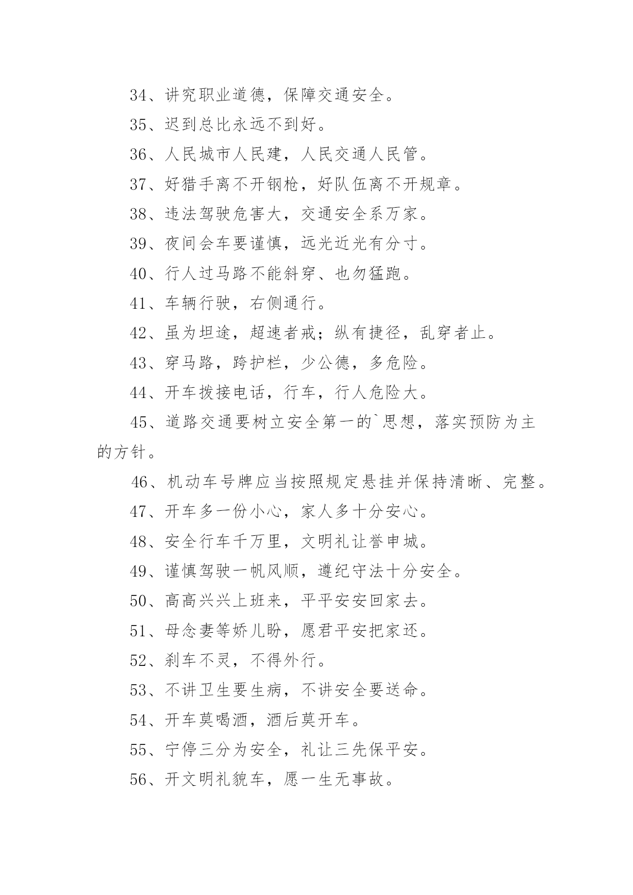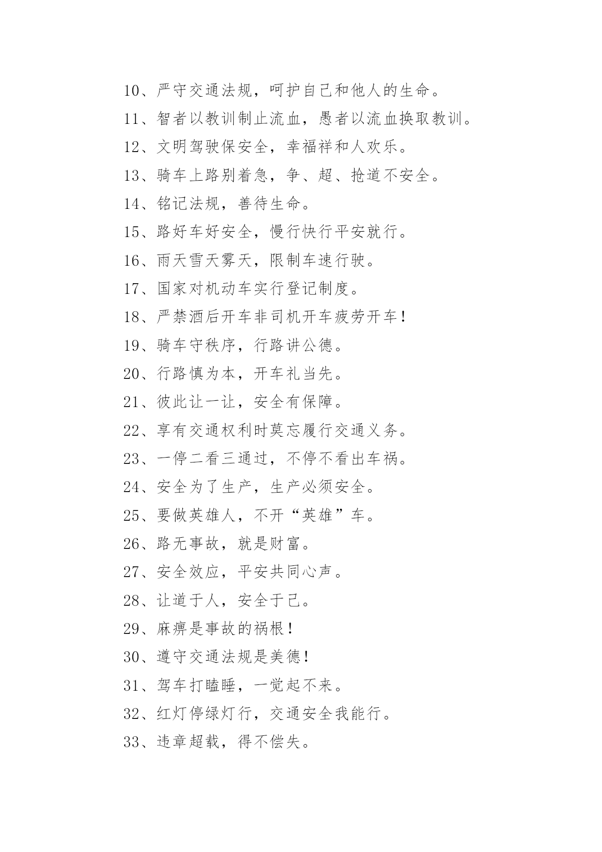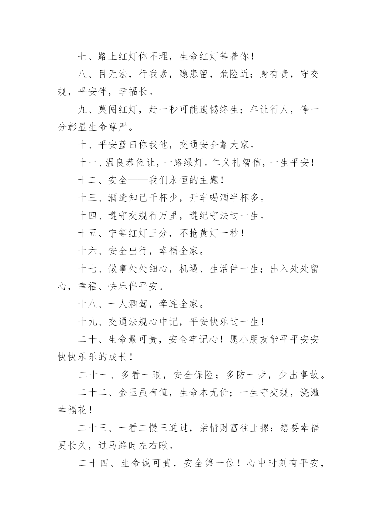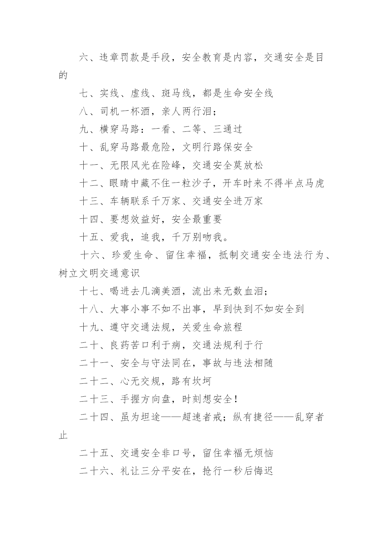 交通安全的经典标语交通安全的经典标语(精选165句)在平凡的学习、工作、生活中,大家最不陌生的就是标语了吧,标语既有公文语体准确、简洁的特点,又有政论语体严谨性、鼓动性的特点。那么什么样的标语才是好的标语呢?下面是小编为大家收集的交通安全的经典标语,仅供参考,欢迎大家阅读。交通安全的经典标语11、违法超载的重罚,酒后驾车害人害己。2、上班早出十分钟,路上安全有保证。3、握好方向盘,心中装安全。4、纠正您的违章是为了您和他人的安全。5、行人过马路要先看左,后看右,左右看清再通过。6、车好路好,安全。7、管理靠制度,制度在落实。8、司机遵章千家乐,安全畅通百业兴。9、人行横道车让人,各种车道人让车。10、拒酒千里外,安全万里行。11、经济以市场为本,交通以安全为先。12、守交规迎春夏秋冬福,保安全纳东西南北财。13、骑车上路别着急,争超抢道不安全。14、加强管理为人民群众,严格执法保交通安全。15、为了您和他人的幸福,请自觉遵守交通法规。16、将道路交通安全教育纳入学校法制教育的内容。17、生命只有一次安全行车多好。18、车可修复,人无来生。19、维护良好乘车秩序,争做申城文明乘客。20、驾车守则,让一点就通。21、交通事故不长眼,你凶他就险。22、生命需要阳光,幸福需要安全。23、铭记交规,善待生命。24、骑车抢行一秒,危险增加十分。25、心静车行,心乱车停。26、大路朝天,请走右边。27、管理基础打得牢,安全大厦层层高。28、飞速行车乐一时,一朝落马毁终生。29、高速公路,行驶适速。30、肇事逃逸犯法,缉拿归案重罚。交通安全的经典标语21、疲劳驾驶等于方向失灵。2、一时快,一世毁、礼让行驶,交通顺畅。3、告别交通违章,建设交通文明。4、安全在你脚下,生命在你手中。5、走过春夏秋冬,安全永驻心中。6、要想效益好,安全最重要。7、莫图一时快,肇事全家哀。8、亲人盼团圆,切望安全归。9、依法管理,方便群众。10、严守交通法规,呵护自己和他人的生命。11、智者以教训制止流血,愚者以流血换取教训。12、文明驾驶保安全,幸福祥和人欢乐。13、骑车上路别着急,争、超、抢道不安全。14、铭记法规,善待生命。15、路好车好安全,慢行快行平安就行。16、雨天雪天雾天,限制车速行驶。17、国家对机动车实行登记制度。18、严禁酒后开车非司机开车疲劳开车!19、骑车守秩序,行路讲公德。20、行路慎为本,开车礼当先。21、彼此让一让,安全有保障。22、享有交通权利时莫忘履行交通义务。23、一停二看三通过,不停不看出车祸。24、安全为了生产,生产必须安全。25、要做英雄人,不开“英雄”车。26、路无事故,就是财富。27、安全效应,平安共同心声。28、让道于人,安全于己。29、麻痹是事故的祸根!30、遵守交通法规是美德!31、驾车打瞌睡,一觉起不来。32、红灯停绿灯行,交通安全我能行。33、违章超载,得不偿失。34、讲究职业道德,保障交通安全。35、迟到总比永远不到好。36、人民城市人民建,人民交通人民管。37、好猎手离不开钢枪,好队伍离不开规章。38、违法驾驶危害大,交通安全系万家。39、夜间会车要谨慎,远光近光有分寸。40、行人过马路不能斜穿、也勿猛跑。41、车辆行驶,右侧通行。42、虽为坦途,超速者戒;纵有捷径,乱穿者止。43、穿马路,跨护栏,少公德,多危险。44、开车拨接电话,行车,行人危险大。45、道路交通要树立安全第一的`思想,落实预防为主的方针。46、机动车号牌应当按照规定悬挂并保持清晰、完整。47、开车多一份小心,家人多十分安心。48、安全行车千万里,文明礼让誉申城。49、谨慎驾驶一帆风顺,遵纪守法十分安全。50、高高兴兴上班来,平平安安回家去。51、母念妻等娇儿盼,愿君平安把家还。52、刹车不灵,不得外行。53、不讲卫生要生病,不讲安全要送命。54、开车莫喝酒,酒后莫开车。55、宁停三分为安全,礼让三先保平安。56、开文明礼貌车,愿一生无事故。57、驾驶人乘车人请按规定系安全带。58、红灯短暂,生命无限。59、多一点谨慎少一份祸,少一份麻痹多一份安。60、疾病从口入,事故由松出。61、但愿人长久,一路共平安。62、侥幸躲过千次,出事就在一次。63、推广先进的交通安全管理方法、技术、设备。64、让出海阔天空,抢出飞来横祸。65、您永远都平安,是家人的心愿。66、处罚违章不留情,看似无情最深情。67、车行高速路,注意限车速。68、上有老,下有小,出了交通事故不得了。69、发展以市场为本,生存以安全为先。70、以人为本,关爱生命。交通安全的经典标语3一、遵守交规,从我做起,从小学生做起。二、遵守交通规则,平安幸福生活。交通规则守一生,不让生命亮红灯。三、交通安全常记牢,遵章守规永不忘。努力践行交通法,学做文明交通人。四、安全一分一秒,幸福一生