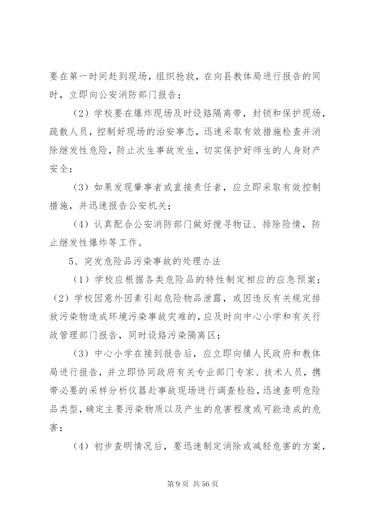第PAGE\*Arabic\*MERGEFORMAT56页共NUMPAGES\*MERGEFORMAT56页学校园突发事件应急处置工作总体预案一总则(一)编制目的为有效预防、及时控制和妥善处理教育系统各类突发事件,提高快速反应和应急处理能力,建立健全应急机制,确保学校师生员工的生命与财产安全,保证正常的教育教学秩序,维护学校和社会稳定。(二)编制依据依据《XX县区教体系统校园突发事件应急处臵工作总体预案》有关规定,结合本镇工作实际,制定本预案。(三)适用范围本预案适用于巴邱镇小学(含幼儿园)。(四)突发事件种类1、自然灾害。主要包括。冰雹、雷电、暴雨、雪、低温冷冻等气象灾害;地震灾害、山体滑坡、泥石流、地质沉降等地质灾害。2、群体性事件。主要包括。师生非法集会、游行、示威、静坐、请愿;学生罢课、教师罢教、职工罢工以及师生员工罢餐;师生大规模群体性上访或越级上访;学生发生群殴、械斗等;法轮功等邪教组织渗透、煽动、闹事制造的骚乱与动乱等。3、事故灾害类事件。主要包括。学校建筑物倒塌安全事故;学校设备质量安全事故;重大火灾安全事故;重大交通安全事故;楼梯间踩踏安全事故;外出大型活动安全事故;学生实践、实习期间发生的伤亡事故;学生坠楼、溺水、触电安全事故;外来暴力侵害事故,危险品安全事故等。4、公共卫生事件。主要包括。发生在学校内的突发公共卫生事件,如集体性食物中毒、传染病疫情、群体性不明原因疾病;因预防接种或预防性服药造成的群体性不良反应;学校所在地区发生的,可能对学校师生健康造成危害的突发公共卫生事件,如手足口、腮腺炎、“甲流”等严重影响公众健康的公共卫生事件。5、考试安全类事件。主要包括。期末质量检测等由教体局组织的各类统一考试中,在命题管理,试卷印刷、运送、保管,考试实施,评卷组织管理等环节出现泄密、舞弊等造成重大影响的事件。6、影响学校安全与稳定的其它重大突发事件。(五)工作原则(1)统一指挥,快速反应。巴邱镇小学成立突发事件应急处臵工作领导小组(以下简称领导小组),全面负责巴邱镇小学(含幼儿园)对突发事件的处臵工作,一旦发生重大事件,确保发现、报告、指挥、处臵等环节的紧密衔接,做到快速反应,正确应对,果断处臵。(2)分级负责,属地管理。实行校(园长)负责制,层层落实各项应急工作责任。发生突发事件后,第一时间启动应急预案,并按程序及时上报。(3)预防为本,及时控制。立足于防范,抓早、抓小,认真开展矛盾纠纷排查调处工作,强化信息的广泛收集和深层次研判,争取早发现,早报告,早控制,早解决,避免造成情况失控和混乱。(4)系统联动,群防群控。发生突发事件后,各村小、教学点(幼儿园)负责人和中心小学相关人员要立即深入第一线,掌握情况,开展工作,控制局面,努力形成系统联动、群防群控的处臵工作格局。(5)区分性质,依法处臵。要坚持从保护师生生命和财产安全的角度出发,按照“动之以情、晓之以理,可散不可聚,可顺不可激,可分不可结”的工作原则,及时化解矛盾,做到合情合理、依法办事,维护师生的合法权益。(6)加强保障,重在建设。从法规、制度、组织、物质等方面全面落实保障措施,加强硬件与软件建设,切实增强和提高工作效率。二应急组织指挥体系及职责(一)巴邱镇小学突发事件应急处置工作领导小组组长:杨平根(校长)13479098866副组长:阮小冬金冬子成员:陈林峰、娄备建、陈德勇、陈芳生、娄建生、史年生毛文涛陈德保、曾培德领导小组的主要职责。负责统一决策、组织、指挥教育系统内各类突发事件的应急响应行动,下达应急处臵工作任务;重大问题及时向镇政府、教体局报告;协调、协助相应部门和单位开展应急处臵工作。(二)领导小组办公室及主要职责领导小组下设办公室,办公室设在校安稳办,由安稳办主任陈林峰同志兼任办公室主任。领导小组办公室的主要职责。负责及时收集和分析相应的数据和工作情况,提出处理各类突发事件的指导意见和具体措施报领导小组;负责突发公共事件的善后处理工作;及时总结和推广突发事件处臵的经验和做法;督导、检查各校园落实突发事件应急处理工作的情况,并根据突发事件的性质对有关责任人进行责任追究。(三)各村小、教学点(幼儿园)校园突发事件应急处置指挥机构各校园要比照中心小学应急处臵指挥机构及职责,结合各自实际情况设定。三预防和预警机制(一)预防预警信息各校园要建立畅通的信息传输渠道和严格的信息上报机制,完善快速应急信息系统。(二)信息报送原则1、迅速。最先发现或接到发生突发事件的单位和个人应在第一时间内向中心小学进行报告,不得延报。2、准确。信息内容要客观详实,不得主观臆断,不得漏报、瞒报、谎报。3、事件情况发生变化后,应及时续报。学校发生各类突发事件后,向中心小学报告。(三)信息报送机制各校园发生突发事件后,应第一时间报告中心小学,由中心
