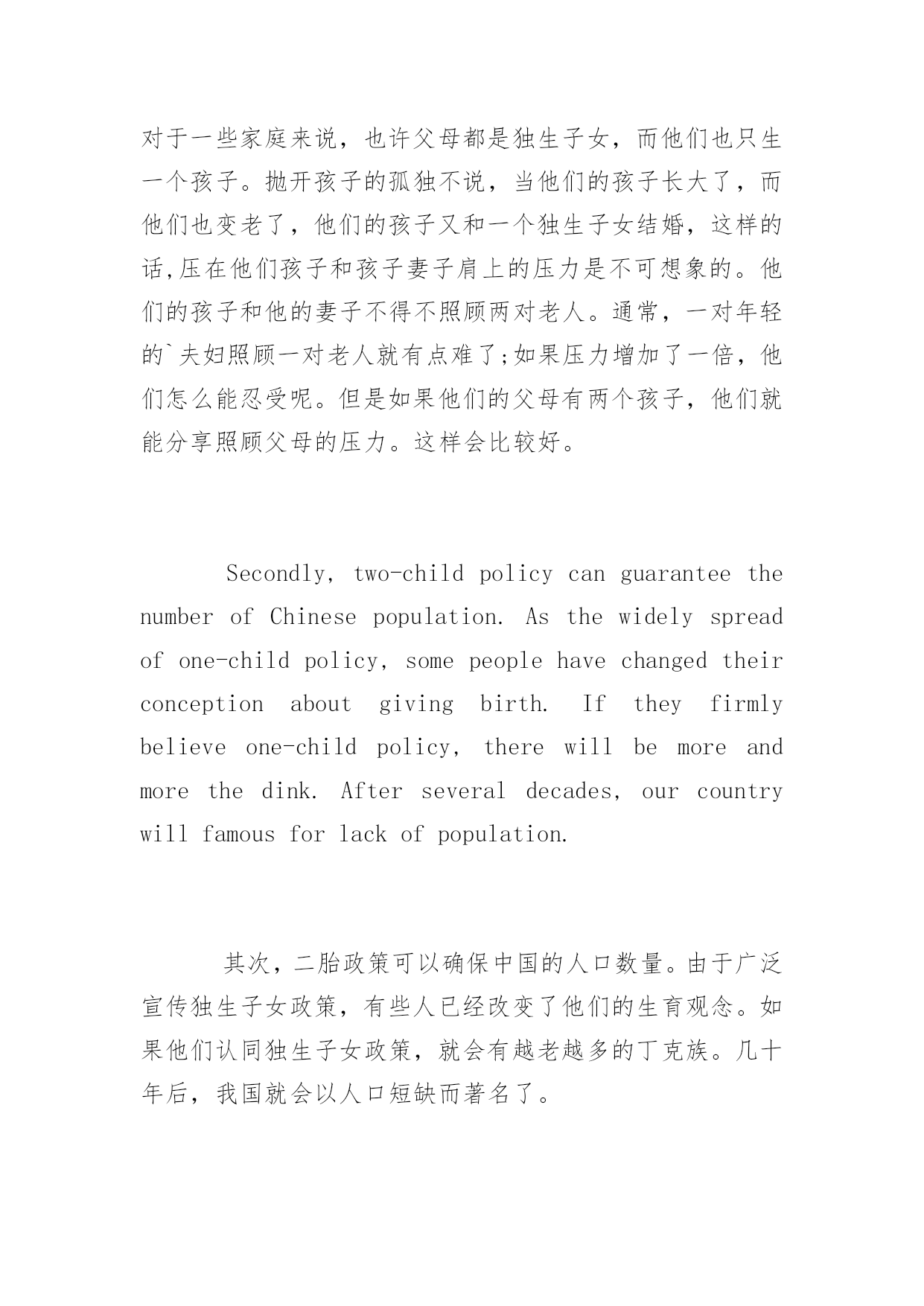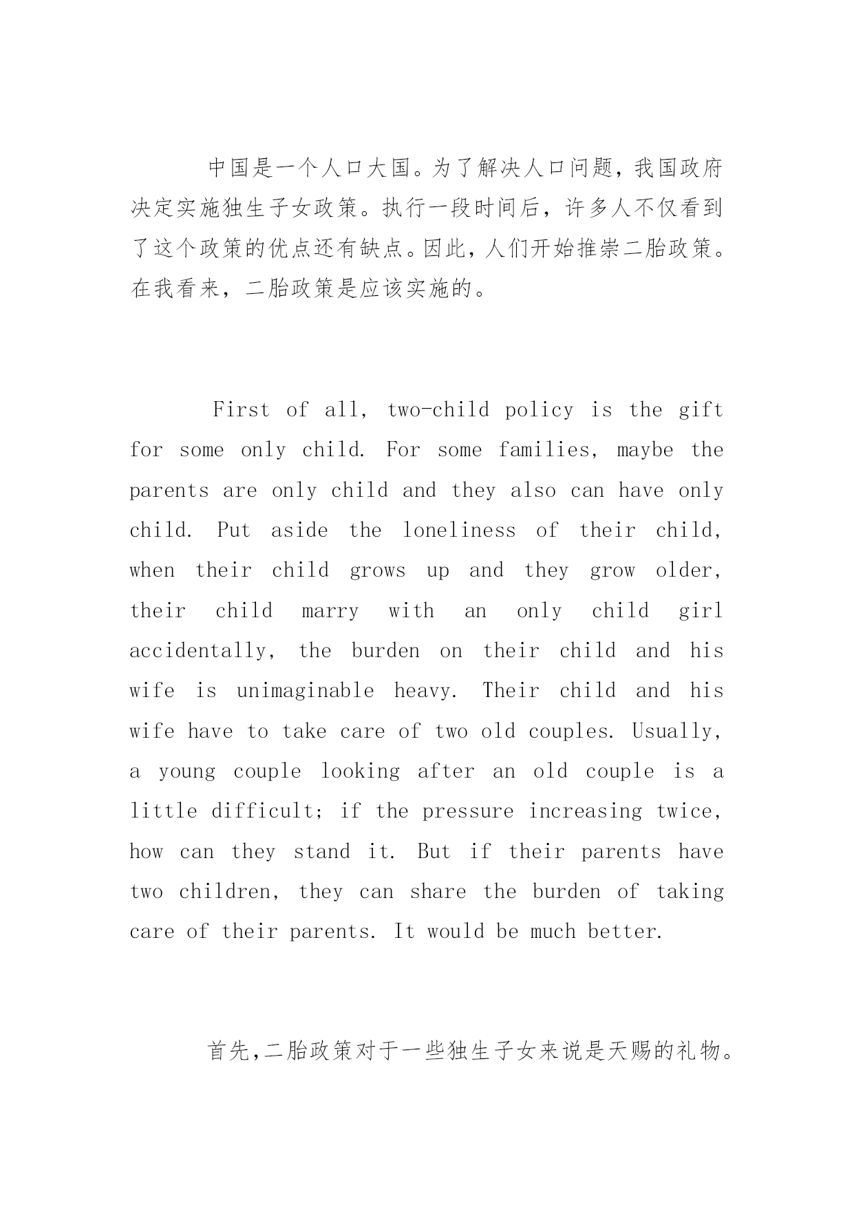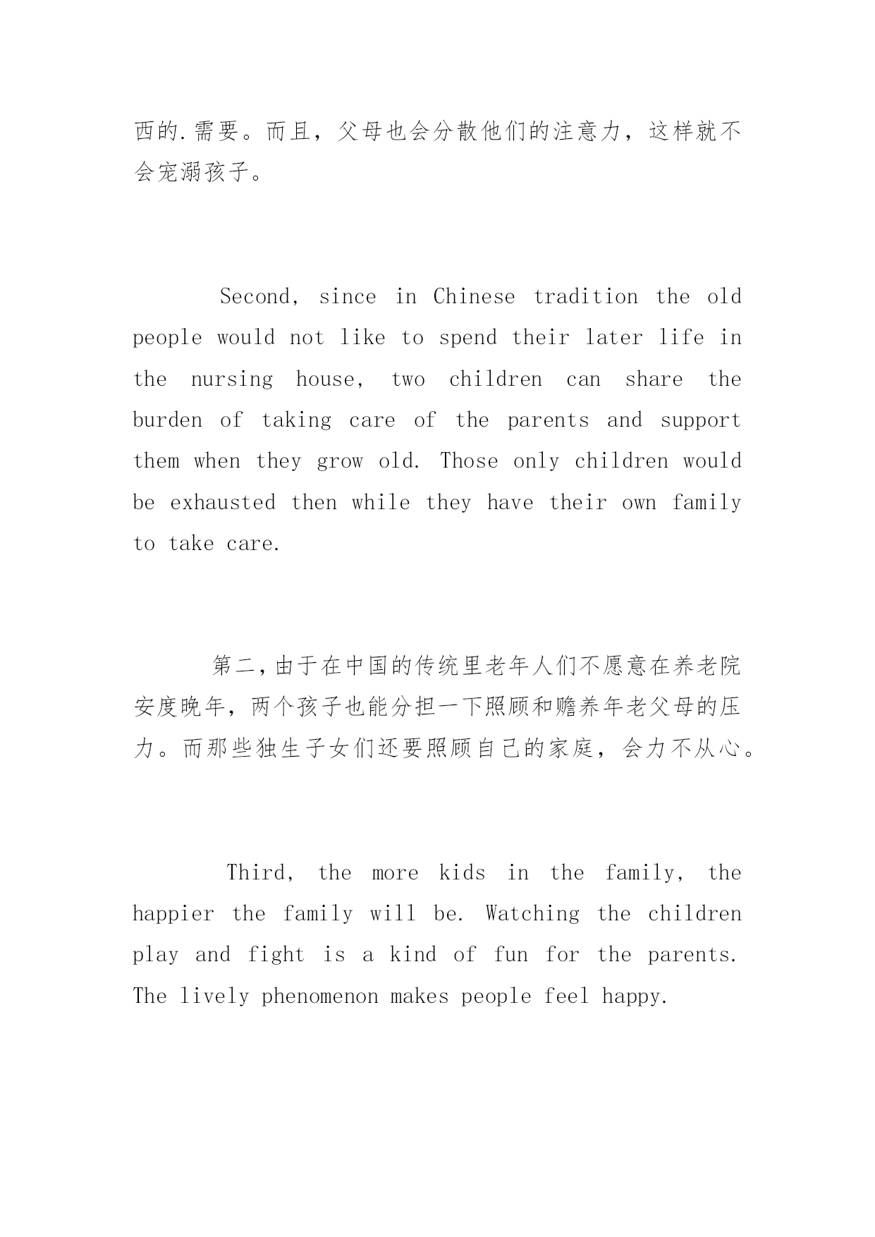 二胎的高考英语作文关于二胎的高考英语作文导语:二胎政策是时下热议的社会话题,家长关心,孩子更为上心,关于二胎的利与弊还需权衡利弊做出正确决断,下面是小编为大家整理的英语作文,希望对大家有所帮助。更多相关的知识,请关注CNFLA学习网!关于二胎的英语作文:二胎政策Chinaisagreatcountrywiththelargestpopulationintheworld.Inordertosolvethepopulationproblem,ourgovernmentdecidestoimplementedone-childpolicy.Whenitiscarriedoutforsometime,manypeoplenotonlyseeitsadvantagesbutalsodisadvantages.Thus,peoplearguethattwo-childpolicyshouldbeputintoeffect.Inmyopinion,two-childpolicyshouldbecarriedout.中国是一个人口大国。为了解决人口问题,我国政府决定实施独生子女政策。执行一段时间后,许多人不仅看到了这个政策的优点还有缺点。因此,人们开始推崇二胎政策。在我看来,二胎政策是应该实施的。Firstofall,two-childpolicyisthegiftforsomeonlychild.Forsomefamilies,maybetheparentsareonlychildandtheyalsocanhaveonlychild.Putasidethelonelinessoftheirchild,whentheirchildgrowsupandtheygrowolder,theirchildmarrywithanonlychildgirlaccidentally,theburdenontheirchildandhiswifeisunimaginableheavy.Theirchildandhiswifehavetotakecareoftwooldcouples.Usually,ayoungcouplelookingafteranoldcoupleisalittledifficult;ifthepressureincreasingtwice,howcantheystandit.Butiftheirparentshavetwochildren,theycansharetheburdenoftakingcareoftheirparents.Itwouldbemuchbetter.首先,二胎政策对于一些独生子女来说是天赐的礼物。对于一些家庭来说,也许父母都是独生子女,而他们也只生一个孩子。抛开孩子的孤独不说,当他们的孩子长大了,而他们也变老了,他们的孩子又和一个独生子女结婚,这样的话,压在他们孩子和孩子妻子肩上的压力是不可想象的。他们的孩子和他的妻子不得不照顾两对老人。通常,一对年轻的`夫妇照顾一对老人就有点难了;如果压力增加了一倍,他们怎么能忍受呢。但是如果他们的父母有两个孩子,他们就能分享照顾父母的压力。这样会比较好。Secondly,two-childpolicycanguaranteethenumberofChinesepopulation.Asthewidelyspreadofone-childpolicy,somepeoplehavechangedtheirconceptionaboutgivingbirth.Iftheyfirmlybelieveone-childpolicy,therewillbemoreandmorethedink.Afterseveraldecades,ourcountrywillfamousforlackofpopulation.其次,二胎政策可以确保中国的人口数量。由于广泛宣传独生子女政策,有些人已经改变了他们的生育观念。如果他们认同独生子女政策,就会有越老越多的丁克族。几十年后,我国就会以人口短缺而著名了。Inconclusion,one-childpolicyhasoutofdate.Andtow-childpolicyisneededandnecessary.Itcansolvetheproblemofnowadaysandthefuture.总之,独生子女政策已经过时了。二胎政策是必要和必须的。这可以解决当前和未来的问题。关于二胎的英语作文:二胎的好处TheAdvantagesofSecondChildIthasbeensuchalongtimeforChinesepeopletocarryoutthefamilyplan,somostfamiliesonlyhav