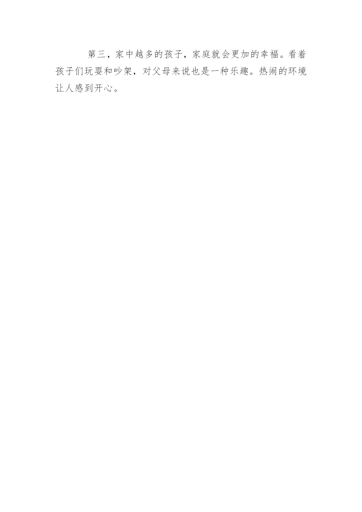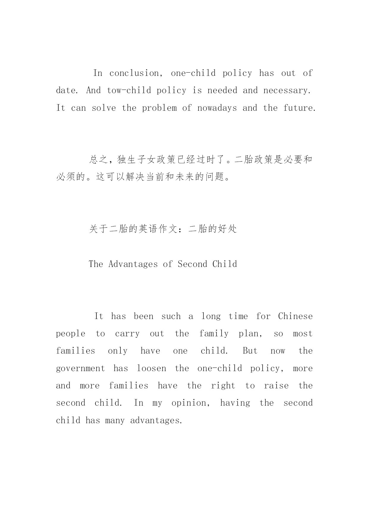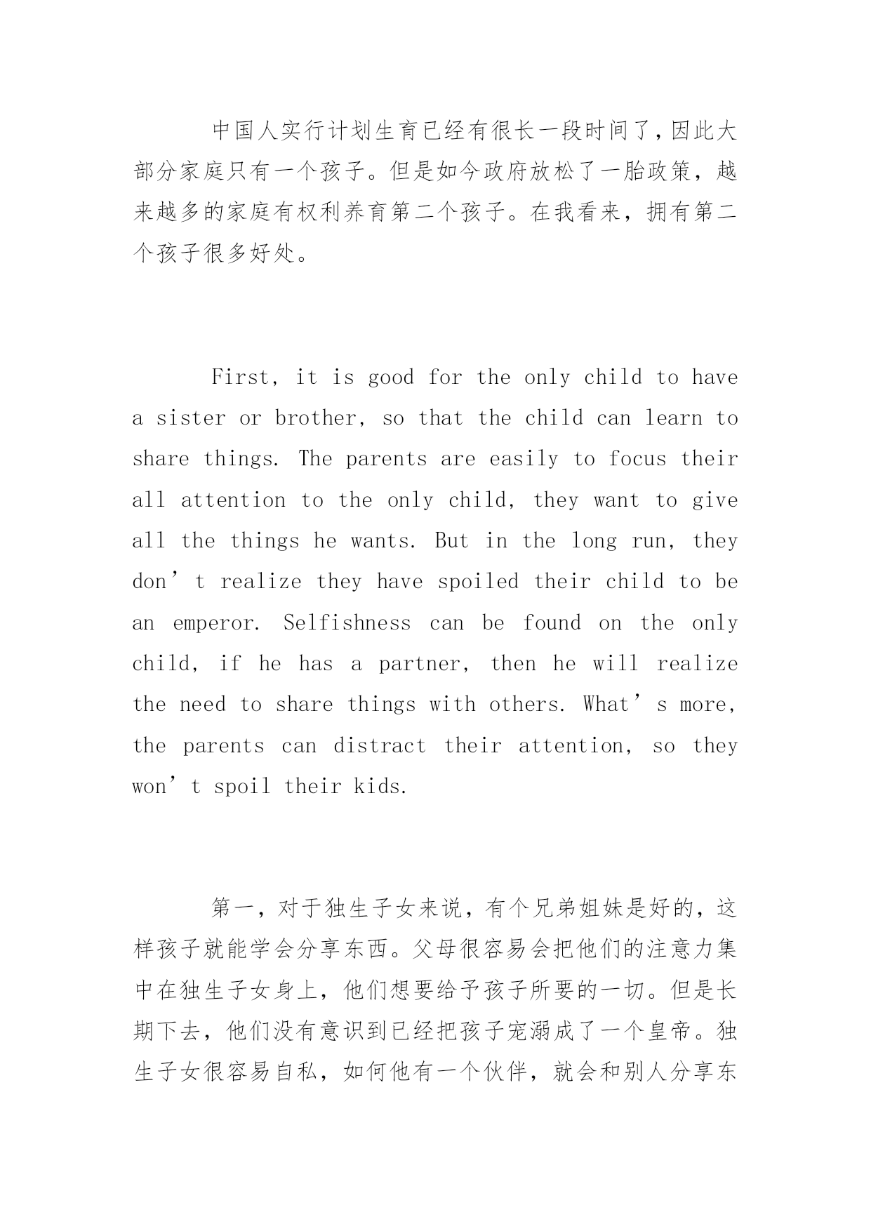 二胎的高考英语作文关于二胎的高考英语作文导语:二胎政策是时下热议的社会话题,家长关心,孩子更为上心,关于二胎的利与弊还需权衡利弊做出正确决断,下面是小编为大家整理的英语作文,希望对大家有所帮助。更多相关的知识,请关注CNFLA学习网!关于二胎的英语作文:二胎政策Chinaisagreatcountrywiththelargestpopulationintheworld.Inordertosolvethepopulationproblem,ourgovernmentdecidestoimplementedone-childpolicy.Whenitiscarriedoutforsometime,manypeoplenotonlyseeitsadvantagesbutalsodisadvantages.Thus,peoplearguethattwo-childpolicyshouldbeputintoeffect.Inmyopinion,two-childpolicyshouldbecarriedout.中国是一个人口大国。为了解决人口问题,我国政府决定实施独生子女政策。执行一段时间后,许多人不仅看到了这个政策的优点还有缺点。因此,人们开始推崇二胎政策。在我看来,二胎政策是应该实施的。Firstofall,two-childpolicyisthegiftforsomeonlychild.Forsomefamilies,maybetheparentsareonlychildandtheyalsocanhaveonlychild.Putasidethelonelinessoftheirchild,whentheirchildgrowsupandtheygrowolder,theirchildmarrywithanonlychildgirlaccidentally,theburdenontheirchildandhiswifeisunimaginableheavy.Theirchildandhiswifehavetotakecareoftwooldcouples.Usually,ayoungcouplelookingafteranoldcoupleisalittledifficult;ifthepressureincreasingtwice,howcantheystandit.Butiftheirparentshavetwochildren,theycansharetheburdenoftakingcareoftheirparents.Itwouldbemuchbetter.首先,二胎政策对于一些独生子女来说是天赐的礼物。对于一些家庭来说,也许父母都是独生子女,而他们也只生一个孩子。抛开孩子的孤独不说,当他们的孩子长大了,而他们也变老了,他们的孩子又和一个独生子女结婚,这样的话,压在他们孩子和孩子妻子肩上的压力是不可想象的。他们的孩子和他的妻子不得不照顾两对老人。通常,一对年轻的`夫妇照顾一对老人就有点难了;如果压力增加了一倍,他们怎么能忍受呢。但是如果他们的父母有两个孩子,他们就能分享照顾父母的压力。这样会比较好。Secondly,two-childpolicycanguaranteethenumberofChinesepopulation.Asthewidelyspreadofone-childpolicy,somepeoplehavechangedtheirconceptionaboutgivingbirth.Iftheyfirmlybelieveone-childpolicy,therewillbemoreandmorethedink.Afterseveraldecades,ourcountrywillfamousforlackofpopulation.其次,二胎政策可以确保中国的人口数量。由于广泛宣传独生子女政策,有些人已经改变了他们的生育观念。如果他们认同独生子女政策,就会有越老越多的丁克族。几十年后,我国就会以人口短缺而著名了。Inconclusion,one-childpolicyhasoutofdate.Andtow-childpolicyisneededandnecessary.Itcansolvetheproblemofnowadaysandthefuture.总之,独生子女政策已经过时了。二胎政策是必要和必须的。这可以解决当前和未来的问题。关于二胎的英语作文:二胎的好处TheAdvantagesofSecondChildIthasbeensuchalongtimeforChinesepeopletocarryoutthefamilyplan,somostfamiliesonlyhav