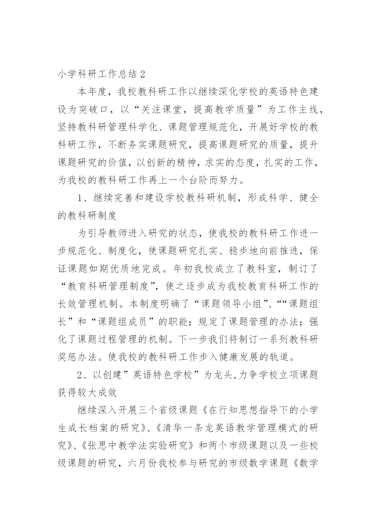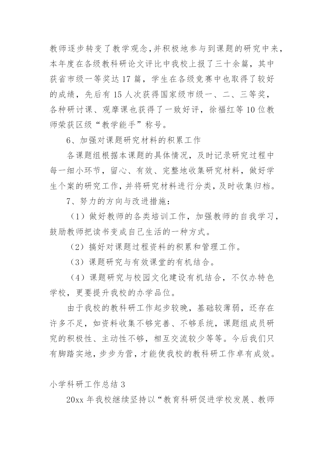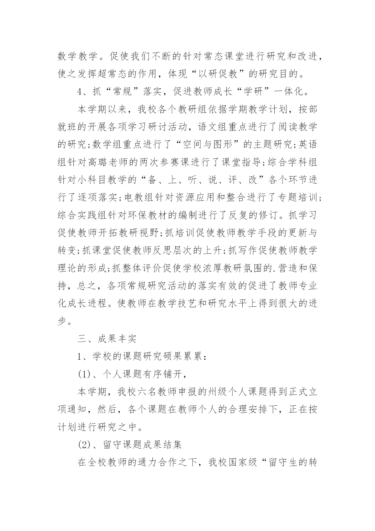 小学科研工作总结总结是对某一阶段的工作、学习或思想中的经验或情况进行分析研究的书面材料,通过它可以全面地、系统地了解以往的学习和工作情况,快快来写一份总结吧。你所见过的总结应该是什么样的?下面是小编整理的小学科研工作总结,仅供参考,大家一起来看看吧。小学科研工作总结1一、管理规范。一所学校的教育科研工作开展得如何,关键还得看是否有一支务实创新的科研队伍,而在长江小学,教研组长的中坚作用在教科研工作中发挥得淋漓尽致。学期伊始,教科室分别召开教研组长会议和“课堂教学”研究小组会议,以“宁静致远,勤学善思厚底蕴;淡泊名利,甘做绿叶扶红花;求真务实,中流砥柱显身手;充当心桥,上传下达巧当家”的总要求规范管理这一中层组织,使他们明确各自的职责,针对各组的实际情况开展丰富多次的教研活动。学期中,每月配合教务处组织的常规教学检查,召开教研组长碰头会,交流各组的教研状况,倾听各组教师的建议和心声,查漏补缺,力求管理上的严密与规范。二、活动有序教育科研工作从来就不是纸上谈兵的事情,而是与教学实践紧密结合的,因此,为了促进教师的专业成长,使教师们在活动中锻炼;在活动中交流;在活动中反思;在活动中提高,本学期的教学研讨和教学实践活动精彩纷呈:1、以“调研”抛砖引玉,促进教研与教学的和谐发展。XX年9月,全州四年级数学调研考试分析会在恩施召开,我校教师代表巴东农村中心小学数学教学问题做了专题分析,并糅合全州的数学教学现状进行实例分析,在本校数学组加以说明,使之明白数学教学改革的方向和需要注意的问题,更加有效的辅助学生的想“学”。2、以“课例”研究课堂,促进有效英语课堂的生成。10月2日,官渡镇英语课例选拔赛在我校举行,教科室积极配合中心学校,妥善的安排了本次比赛活动,并按照要求将相关资料收集和发放,体现教学研讨“讲、听、说、评、比、改”的特色。10月10日,全县江北片区英语课例比赛在我校举行,教科室积极配合县教研室,从“食宿、时间、分班、会场布置、资料收集整理成册等”各方面使得竞赛活动顺利进行。显现了本校各个处室协同一致的工作作风和精益求精的工作态度。受到与会老师和各级领导的高度评价。3、以“主题”突出目标,促进常态课堂显现超常的作用。XX年11月3日,全县小学数学主题研究交流会在茶店小学召开,我校数学组长谭玉波就本组进行的“有效建构空间观念”的主题进行了交流,效果良好,本次活动中所展示的五节数学课使我们受到启发,也更好的指导了我们今后的数学教学。促使我们不断的针对常态课堂进行研究和改进,使之发挥超常态的作用,体现“以研促教”的研究目的。4、抓“常规”落实,促进教师成长“学研”一体化。本学期以来,我校各个教研组依据学期教学计划,按部就班的开展各项学习研讨活动,语文组重点进行了阅读教学的研究;数学组重点进行了“空间与图形”的主题研究;英语组针对高璐老师的两次参赛课进行了课堂指导;综合学科组针对小科目教学的“备、上、听、说、评、改”各个环节进行了逐项落实;电教组针对资源应用和整合进行了专题培训;综合实践组针对环保教材的编制进行了反复的修订。抓学习促使教师开拓教研视野;抓培训促使教师教学手段的更新与转变;抓课堂促使教师反思层次的上升;抓写作促使教师教学理论的形成;抓整体评价促使学校浓厚教研氛围的.营造和保持,总之,各项常规研究活动的落实有效的促进了教师专业化成长进程。使教师在教学技艺和研究水平上得到很大的进步。三、成果丰实1、学校的课题研究硕果累累:(1)、个人课题有序铺开,本学期,我校六名教师申报的州级个人课题得到正式立项通知,然后,各个课题在教师个人的合理安排下,正在按计划进行研究之中。(2)、留守课题成果结集在全校教师的通力合作之下,我校国家级“留守生的转差与培优”课题得到顺利结题,其结题资料汇集了各个研究阶段的成果,内容丰富,资料详实,已被印刷成册。(3)、环保课题资料完备,等待结题。自xx年年开题以来,我校环保课题组从环保活动的开展和环保校本教材的开发两方面进行了有效的研究,经过多次课题组成员会商定和布置,环保课题的各项过程性资料已经整理装订成册,环保教材经县教研室各位领导的审核通过,结题所需的主件和附件材料已经装订完毕,将在下学期初正式申请结题。2、成果展示综合实力增强。在这一学期中,各教研组共展示优质课20多节;高璐老师的英语课获得镇级一等奖和县级二等奖;税典松老师参加州级实验教学技能大赛,获得二等奖;由环保课题组承担并实施的科技创新实践活动在第五届科技创新大赛中获得县级一等奖,并送州参评,荣获州级一等奖;教师在省校本研究网上上传文章1000余篇,使得本校在网上排名跃居全省第七位,极大的鼓舞了教师们的写作兴趣,促进了本校的教育科研良性发展。四、亟待解决的问题回顾一学期以来的教育科研历程,尽管其中蕴含许多精彩之处,但问题与遗憾同时并存:1、