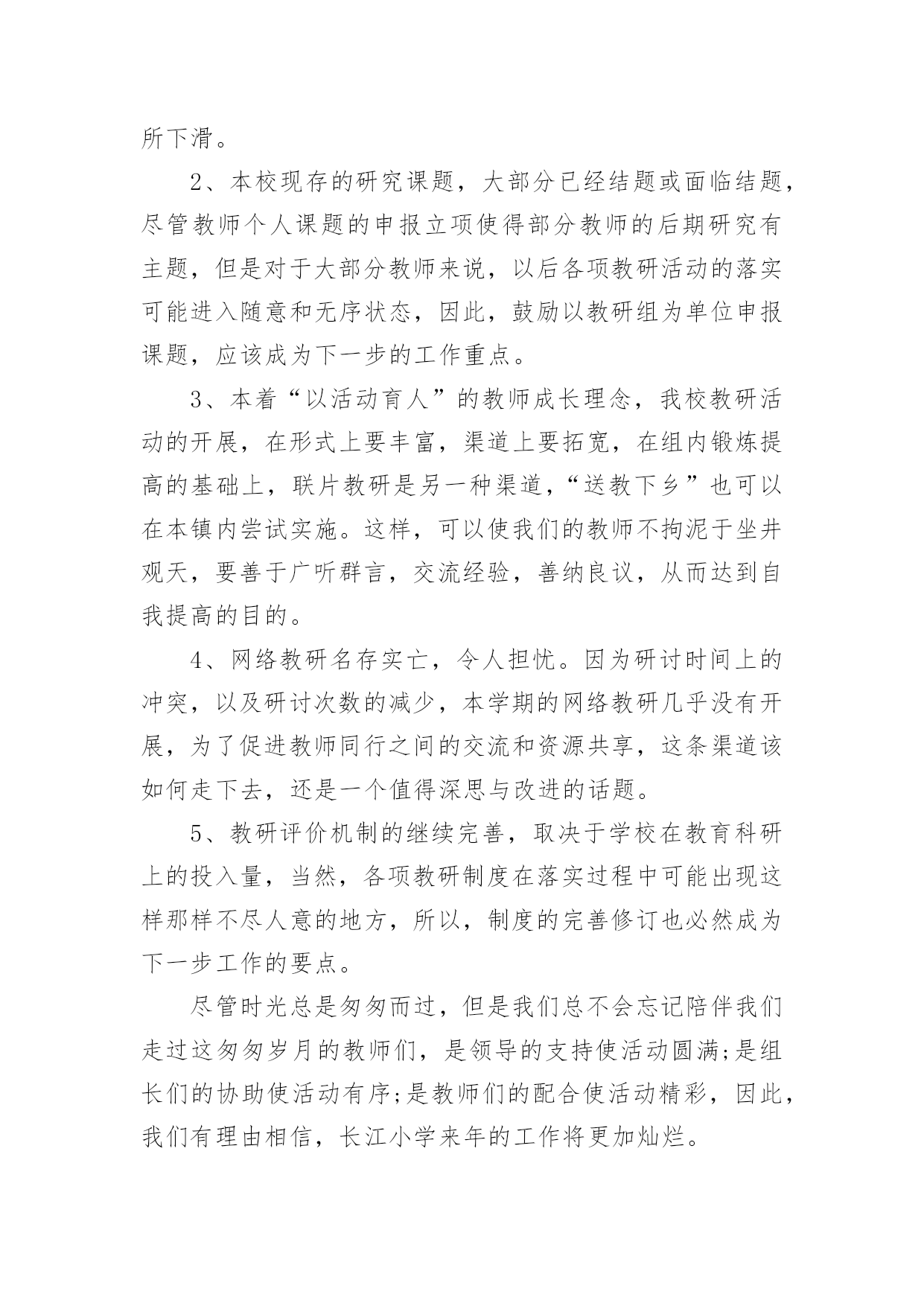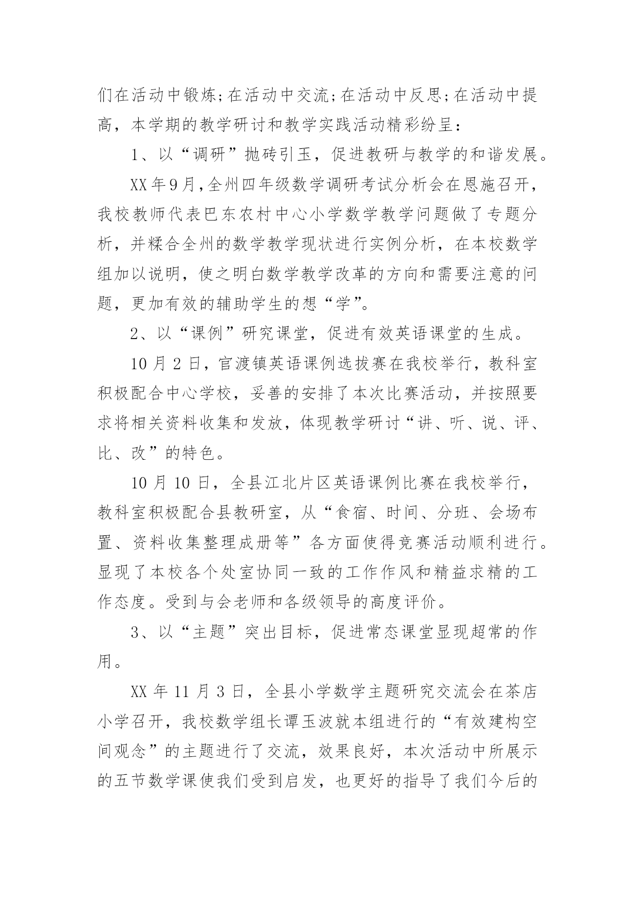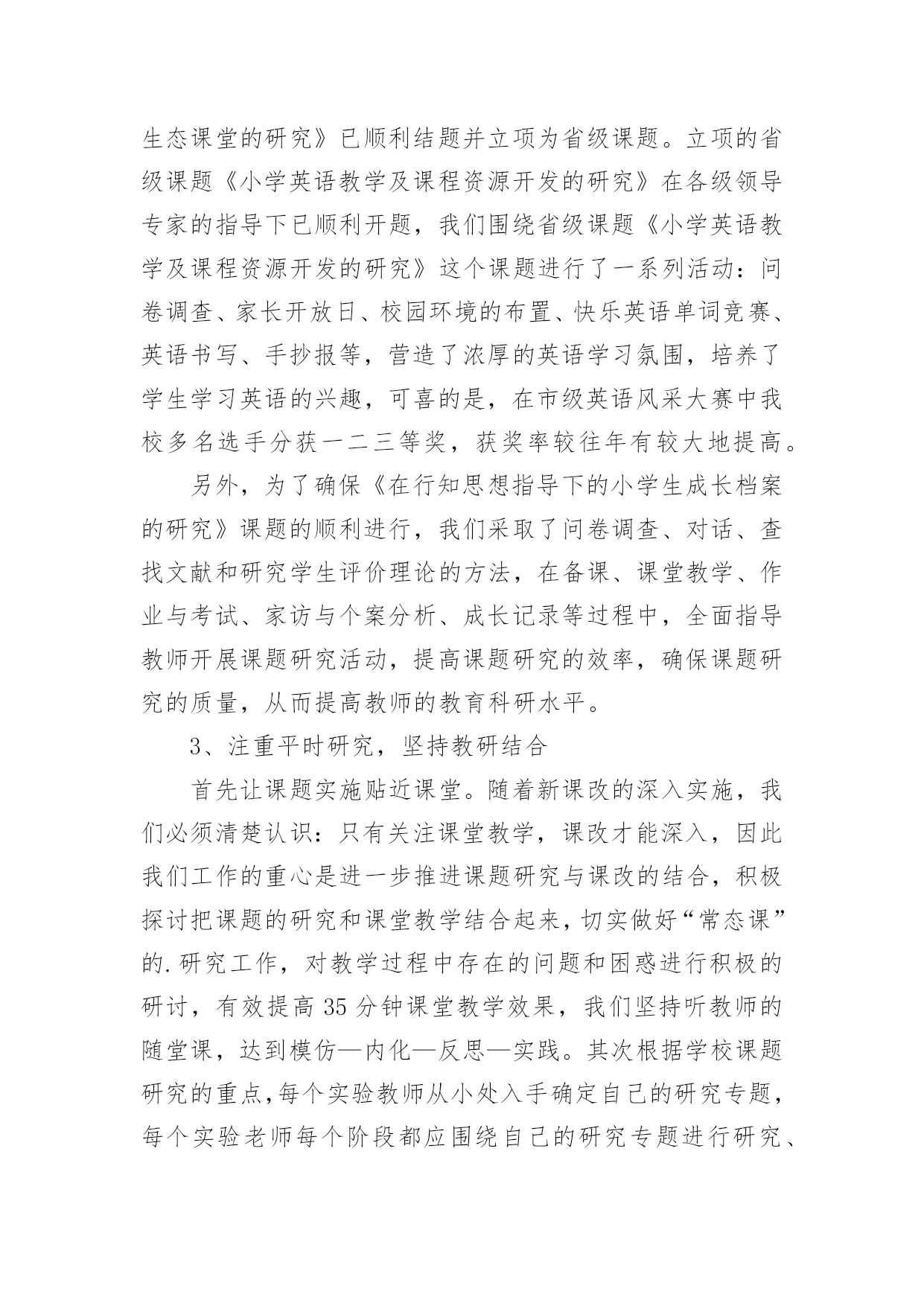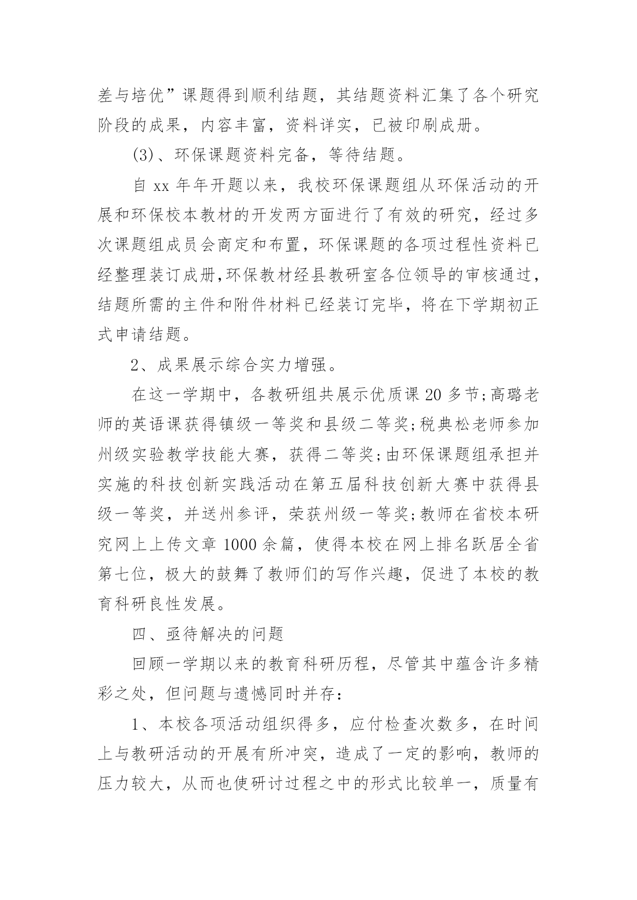 小学科研工作总结总结是对某一阶段的工作、学习或思想中的经验或情况进行分析研究的书面材料,通过它可以全面地、系统地了解以往的学习和工作情况,快快来写一份总结吧。你所见过的总结应该是什么样的?下面是小编整理的小学科研工作总结,仅供参考,大家一起来看看吧。小学科研工作总结1一、管理规范。一所学校的教育科研工作开展得如何,关键还得看是否有一支务实创新的科研队伍,而在长江小学,教研组长的中坚作用在教科研工作中发挥得淋漓尽致。学期伊始,教科室分别召开教研组长会议和“课堂教学”研究小组会议,以“宁静致远,勤学善思厚底蕴;淡泊名利,甘做绿叶扶红花;求真务实,中流砥柱显身手;充当心桥,上传下达巧当家”的总要求规范管理这一中层组织,使他们明确各自的职责,针对各组的实际情况开展丰富多次的教研活动。学期中,每月配合教务处组织的常规教学检查,召开教研组长碰头会,交流各组的教研状况,倾听各组教师的建议和心声,查漏补缺,力求管理上的严密与规范。二、活动有序教育科研工作从来就不是纸上谈兵的事情,而是与教学实践紧密结合的,因此,为了促进教师的专业成长,使教师们在活动中锻炼;在活动中交流;在活动中反思;在活动中提高,本学期的教学研讨和教学实践活动精彩纷呈:1、以“调研”抛砖引玉,促进教研与教学的和谐发展。XX年9月,全州四年级数学调研考试分析会在恩施召开,我校教师代表巴东农村中心小学数学教学问题做了专题分析,并糅合全州的数学教学现状进行实例分析,在本校数学组加以说明,使之明白数学教学改革的方向和需要注意的问题,更加有效的辅助学生的想“学”。2、以“课例”研究课堂,促进有效英语课堂的生成。10月2日,官渡镇英语课例选拔赛在我校举行,教科室积极配合中心学校,妥善的安排了本次比赛活动,并按照要求将相关资料收集和发放,体现教学研讨“讲、听、说、评、比、改”的特色。10月10日,全县江北片区英语课例比赛在我校举行,教科室积极配合县教研室,从“食宿、时间、分班、会场布置、资料收集整理成册等”各方面使得竞赛活动顺利进行。显现了本校各个处室协同一致的工作作风和精益求精的工作态度。受到与会老师和各级领导的高度评价。3、以“主题”突出目标,促进常态课堂显现超常的作用。XX年11月3日,全县小学数学主题研究交流会在茶店小学召开,我校数学组长谭玉波就本组进行的“有效建构空间观念”的主题进行了交流,效果良好,本次活动中所展示的五节数学课使我们受到启发,也更好的指导了我们今后的数学教学。促使我们不断的针对常态课堂进行研究和改进,使之发挥超常态的作用,体现“以研促教”的研究目的。4、抓“常规”落实,促进教师成长“学研”一体化。本学期以来,我校各个教研组依据学期教学计划,按部就班的开展各项学习研讨活动,语文组重点进行了阅读教学的研究;数学组重点进行了“空间与图形”的主题研究;英语组针对高璐老师的两次参赛课进行了课堂指导;综合学科组针对小科目教学的“备、上、听、说、评、改”各个环节进行了逐项落实;电教组针对资源应用和整合进行了专题培训;综合实践组针对环保教材的编制进行了反复的修订。抓学习促使教师开拓教研视野;抓培训促使教师教学手段的更新与转变;抓课堂促使教师反思层次的上升;抓写作促使教师教学理论的形成;抓整体评价促使学校浓厚教研氛围的.营造和保持,总之,各项常规研究活动的落实有效的促进了教师专业化成长进程。使教师在教学技艺和研究水平上得到很大的进步。三、成果丰实1、学校的课题研究硕果累累:(1)、个人课题有序铺开,本学期,我校六名教师申报的州级个人课题得到正式立项通知,然后,各个课题在教师个人的合理安排下,正在按计划进行研究之中。(2)、留守课题成果结集在全校教师的通力合作之下,我校国家级“留守生的转差与培优”课题得到顺利结题,其结题资料汇集了各个研究阶段的成果,内容丰富,资料详实,已被印刷成册。(3)、环保课题资料完备,等待结题。自xx年年开题以来,我校环保课题组从环保活动的开展和环保校本教材的开发两方面进行了有效的研究,经过多次课题组成员会商定和布置,环保课题的各项过程性资料已经整理装订成册,环保教材经县教研室各位领导的审核通过,结题所需的主件和附件材料已经装订完毕,将在下学期初正式申请结题。2、成果展示综合实力增强。在这一学期中,各教研组共展示优质课20多节;高璐老师的英语课获得镇级一等奖和县级二等奖;税典松老师参加州级实验教学技能大赛,获得二等奖;由环保课题组承担并实施的科技创新实践活动在第五届科技创新大赛中获得县级一等奖,并送州参评,荣获州级一等奖;教师在省校本研究网上上传文章1000余篇,使得本校在网上排名跃居全省第七位,极大的鼓舞了教师们的写作兴趣,促进了本校的教育科研良性发展。四、亟待解决的问题回顾一学期以来的教育科研历程,尽管其中蕴含许多精彩之处,但问题与遗憾同时并存:1、
