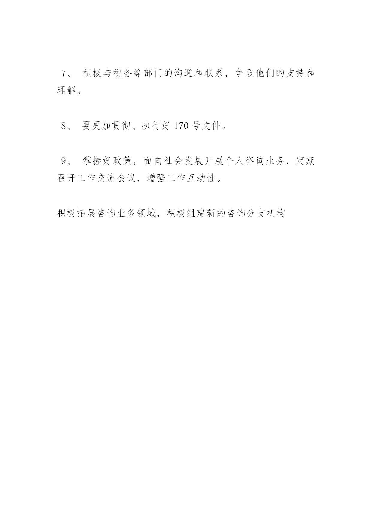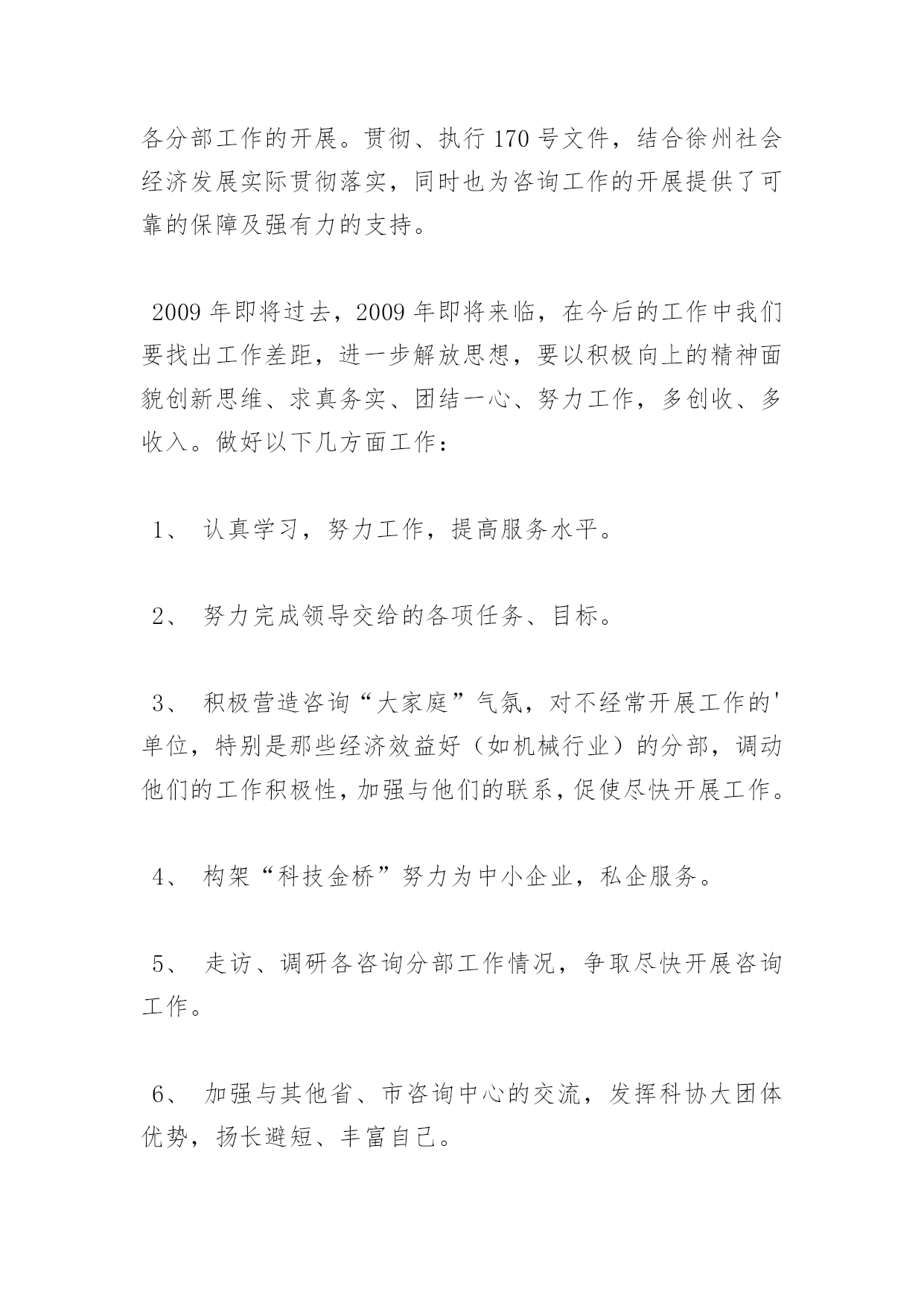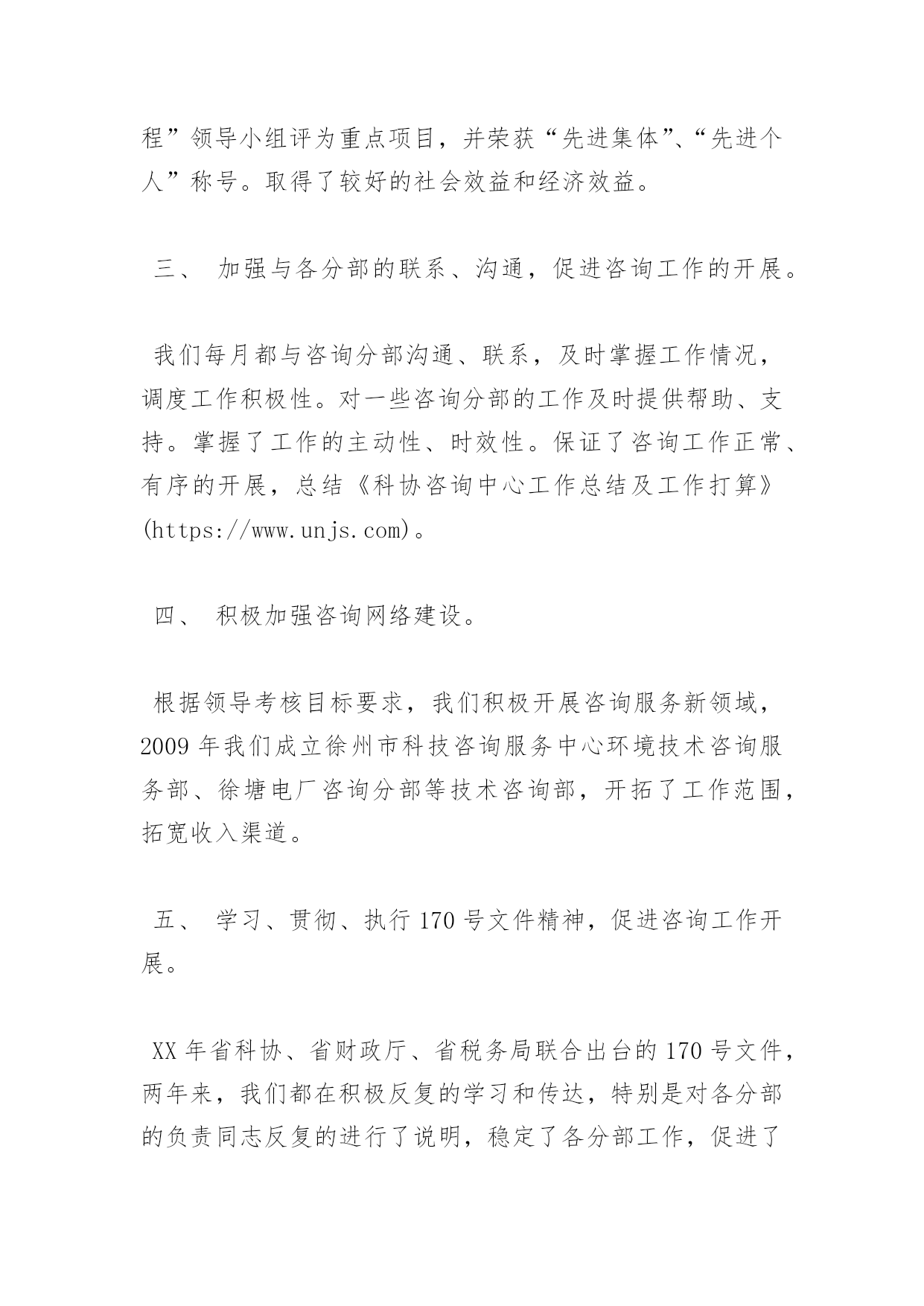科协咨询中心工作总结及工作打算-总结科协咨询中心工作总结及工作打算-总结2009年咨询中心在科协党组的正确领导下,中心和各分部人员认真学习党的十六届五中全会精神及十七大会议精神;认真学习、贯彻、执行省科协170号文件精神及市科协相关文件精神;在“团结、创新、敬业、奉献”的精神指导下,结合我市经济发展形势,创新思维、开拓进取、努力工作,完成合同项目25份、合同额400万元,现将工作汇报如下:一、领导重视,为咨询工作开展奠定了坚实基础,科协咨询中心工作总结及工作打算。市科协领导十分重视科技咨询工作,每次的办公会上,孙主席对当前咨询工作都提出了具体要求。领导的重视与支持为咨询工作的开展奠定了坚实的基础,更好的促进咨询工作平稳、健康、持续发展。二、积极组织各分部开展工作,努力构架“科技金桥”。2009年,积极组织各县(区)科协、各咨询分部开展“金桥工程”工作,开展了“烟气在线监测系统调试、系统开发技术指导及应用部署”等一大批技术论证、技术咨询服务项目,其中沛县科协搭桥的《水污染防治节能项目》被省“金桥工程”领导小组评为重点项目,并荣获“先进集体”、“先进个人”称号。取得了较好的社会效益和经济效益。三、加强与各分部的联系、沟通,促进咨询工作的开展。我们每月都与咨询分部沟通、联系,及时掌握工作情况,调度工作积极性。对一些咨询分部的工作及时提供帮助、支持。掌握了工作的主动性、时效性。保证了咨询工作正常、有序的开展,总结《科协咨询中心工作总结及工作打算》(https://www.unjs.com)。四、积极加强咨询网络建设。根据领导考核目标要求,我们积极开展咨询服务新领域,2009年我们成立徐州市科技咨询服务中心环境技术咨询服务部、徐塘电厂咨询分部等技术咨询部,开拓了工作范围,拓宽收入渠道。五、学习、贯彻、执行170号文件精神,促进咨询工作开展。XX年省科协、省财政厅、省税务局联合出台的170号文件,两年来,我们都在积极反复的学习和传达,特别是对各分部的负责同志反复的进行了说明,稳定了各分部工作,促进了各分部工作的开展。贯彻、执行170号文件,结合徐州社会经济发展实际贯彻落实,同时也为咨询工作的开展提供了可靠的保障及强有力的支持。2009年即将过去,2009年即将来临,在今后的工作中我们要找出工作差距,进一步解放思想,要以积极向上的精神面貌创新思维、求真务实、团结一心、努力工作,多创收、多收入。做好以下几方面工作:1、认真学习,努力工作,提高服务水平。2、努力完成领导交给的各项任务、目标。3、积极营造咨询“大家庭”气氛,对不经常开展工作的'单位,特别是那些经济效益好(如机械行业)的分部,调动他们的工作积极性,加强与他们的联系,促使尽快开展工作。4、构架“科技金桥”努力为中小企业,私企服务。5、走访、调研各咨询分部工作情况,争取尽快开展咨询工作。6、加强与其他省、市咨询中心的交流,发挥科协大团体优势,扬长避短、丰富自己。7、积极与税务等部门的沟通和联系,争取他们的支持和理解。8、要更加贯彻、执行好170号文件。9、掌握好政策,面向社会发展开展个人咨询业务,定期召开工作交流会议,增强工作互动性。积极拓展咨询业务领域,积极组建新的咨询分支机构