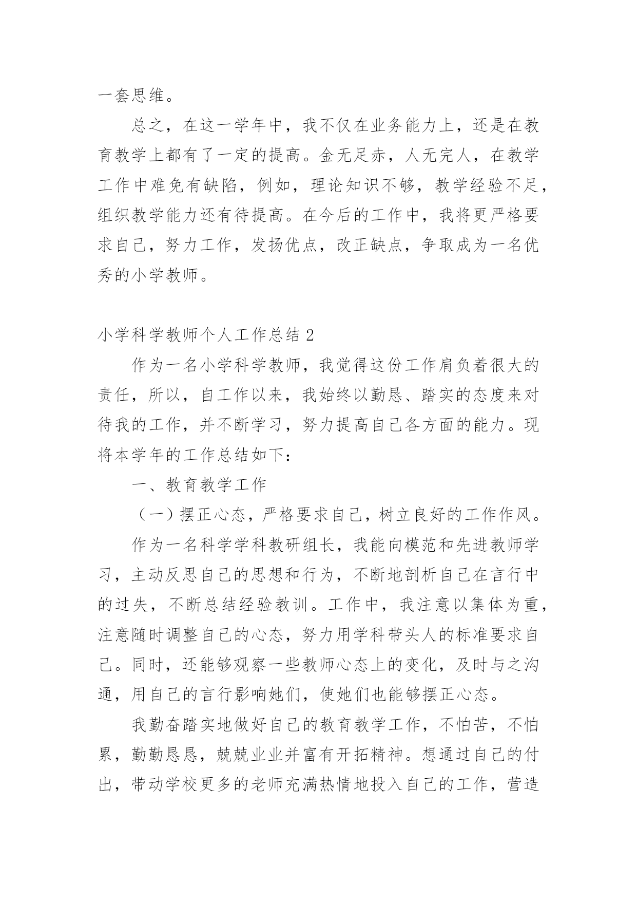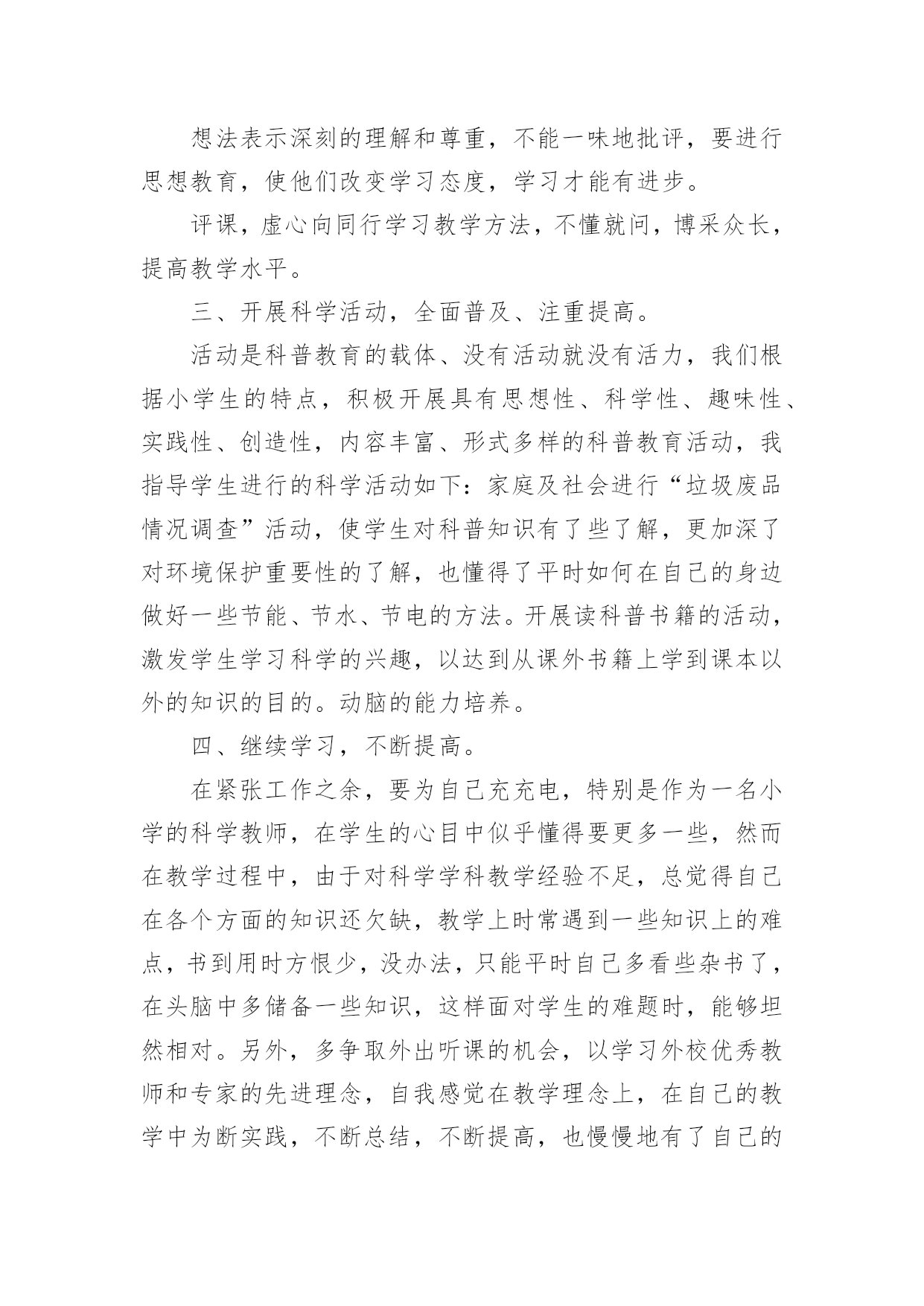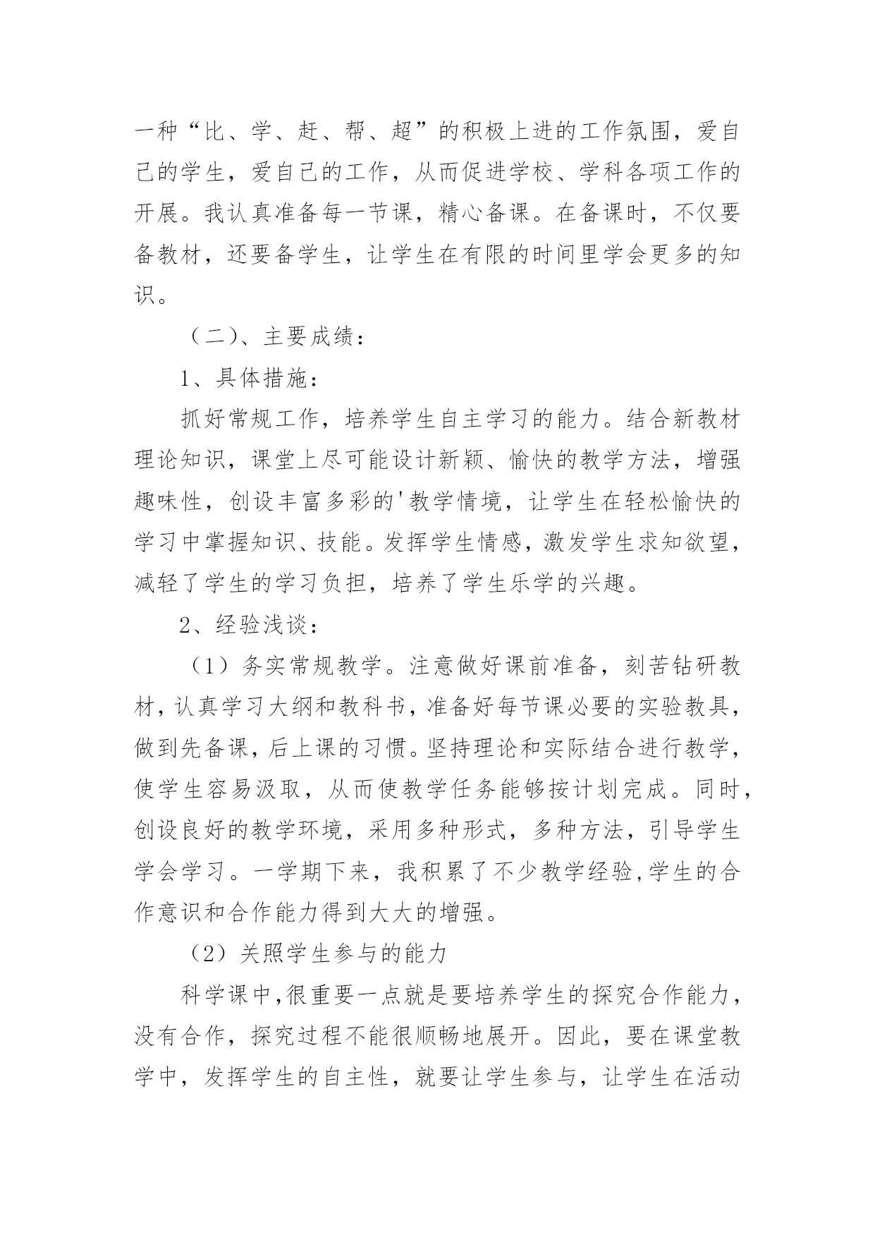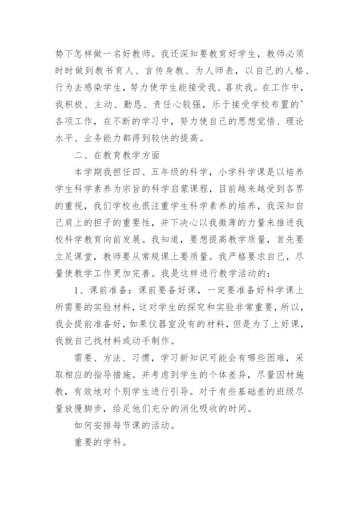 小学科学教师个人工作总结小学科学教师个人工作总结精选[15篇]总结是事后对某一时期、某一项目或某些工作进行回顾和分析,从而做出带有规律性的结论,它有助于我们寻找工作和事物发展的规律,从而掌握并运用这些规律,为此要我们写一份总结。那么总结有什么格式呢?以下是小编精心整理的小学科学教师个人工作总结,仅供参考,大家一起来看看吧。小学科学教师个人工作总结1时间如白驹过隙,回顾一学期的工作,想说的真是太多太多。辛酸终将过去,留下的是美好的回忆和汗水结下的果实。每天,我以无比艰辛的努力和劳动,用爱心去打动每位学生,让他们在我的呵护下茁壮成长。作为一名小学教师,我觉得这份工作肩负着很大的责任,所以,自工作以来,我始终以勤恳、踏实的态度来对待我的工作,并不断学习,努力提高自己各方面的能力。现将本学年的工作总结如下:一、在政治思想方面我积极参加各种学习培训,认真参加政治学习,并做好学习笔记,提高自己的思想觉悟。认真学习新的教育理论,及时更新教育理念。我不但注重集体的政治理论学习,还认真学习了《小学科学课程标准》和《小学科学课程标准解读》《课堂观察》,从书本中汲取营养,认真学习仔细体会新形势下怎样做一名好教师。我还深知要教育好学生,教师必须时时做到教书育人、言传身教、为人师表,以自己的人格、行为去感染学生,努力使学生能接受我、喜欢我。在工作中,我积极、主动、勤恳、责任心较强,乐于接受学校布置的'各项工作,在不断的学习中,努力使自己的思想觉悟、理论水平、业务能力都得到较快的提高。二、在教育教学方面本学期我担任四、五年级的科学,小学科学课是以培养学生科学素养为宗旨的科学启蒙课程,目前越来越受到各界的重视,我们学校也很注重学生科学素养的培养,我深知自己肩上的担子的重要性,并下决心以我微薄的力量来推进我校科学教育向前发展。我知道,要想提高教学质量,首先要立足课堂,教师要从常规课上要质量。我严格要求自己,尽量使教学工作更加完善。我是这样进行教学活动的:1、课前准备:课前要备好课,一定要准备好科学课上所需要的实验材料,这对学生的探究和实验非常重要,所以,我会提前准备好,如果仪器室没有的材料,但是为了上好课,我就自己找材料或动手制作。需要、方法、习惯,学习新知识可能会有哪些困难,采取相应的指导措施。并考虑到学生的个体差异,尽量因材施教,有效地对个别学生进行引导。对于有些基础差的班级尽量放慢脚步,给足他们充分的消化吸收的时间。如何安排每节课的活动。重要的学科。想法表示深刻的理解和尊重,不能一味地批评,要进行思想教育,使他们改变学习态度,学习才能有进步。评课,虚心向同行学习教学方法,不懂就问,博采众长,提高教学水平。三、开展科学活动,全面普及、注重提高。活动是科普教育的载体、没有活动就没有活力,我们根据小学生的特点,积极开展具有思想性、科学性、趣味性、实践性、创造性,内容丰富、形式多样的科普教育活动,我指导学生进行的科学活动如下:家庭及社会进行“垃圾废品情况调查”活动,使学生对科普知识有了些了解,更加深了对环境保护重要性的了解,也懂得了平时如何在自己的身边做好一些节能、节水、节电的方法。开展读科普书籍的活动,激发学生学习科学的兴趣,以达到从课外书籍上学到课本以外的知识的目的。动脑的能力培养。四、继续学习,不断提高。在紧张工作之余,要为自己充充电,特别是作为一名小学的科学教师,在学生的心目中似乎懂得要更多一些,然而在教学过程中,由于对科学学科教学经验不足,总觉得自己在各个方面的知识还欠缺,教学上时常遇到一些知识上的难点,书到用时方恨少,没办法,只能平时自己多看些杂书了,在头脑中多储备一些知识,这样面对学生的难题时,能够坦然相对。另外,多争取外出听课的机会,以学习外校优秀教师和专家的先进理念,自我感觉在教学理念上,在自己的教学中为断实践,不断总结,不断提高,也慢慢地有了自己的一套思维。总之,在这一学年中,我不仅在业务能力上,还是在教育教学上都有了一定的提高。金无足赤,人无完人,在教学工作中难免有缺陷,例如,理论知识不够,教学经验不足,组织教学能力还有待提高。在今后的工作中,我将更严格要求自己,努力工作,发扬优点,改正缺点,争取成为一名优秀的小学教师。小学科学教师个人工作总结2作为一名小学科学教师,我觉得这份工作肩负着很大的责任,所以,自工作以来,我始终以勤恳、踏实的态度来对待我的工作,并不断学习,努力提高自己各方面的能力。现将本学年的工作总结如下:一、教育教学工作(一)摆正心态,严格要求自己,树立良好的工作作风。作为一名科学学科教研组长,我能向模范和先进教师学习,主动反思自己的思想和行为,不断地剖析自己在言行中的过失,不断总结经验教训。工作中,我注意以集体为重,注意随时调整自己的心态,努力用学科带头人的标准要求自己。同时,还能够观察一些教师心态上的变化,及时与之沟