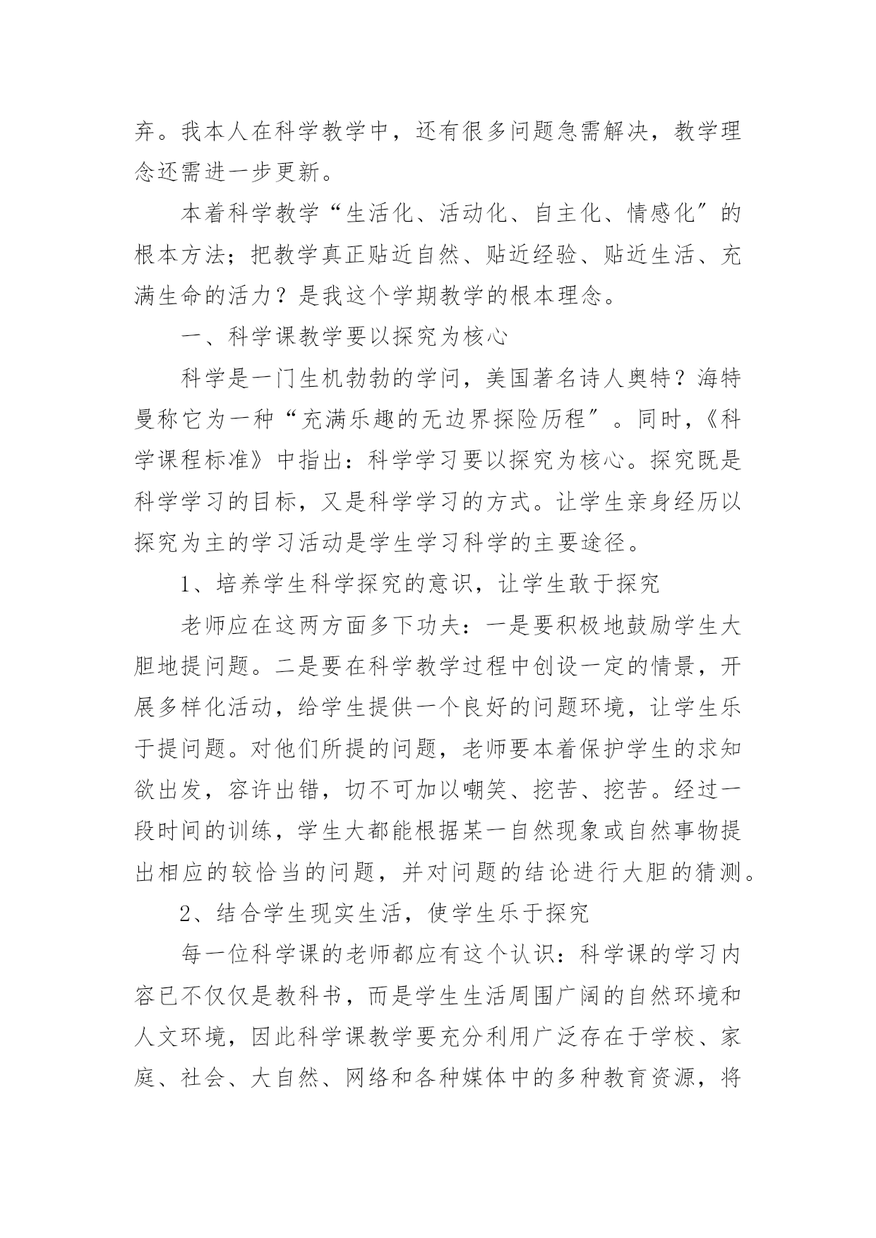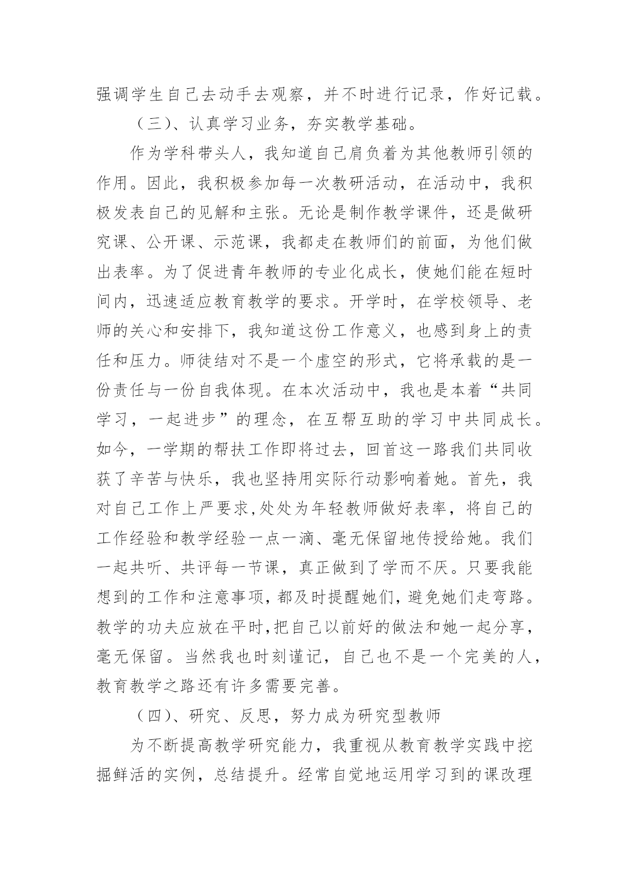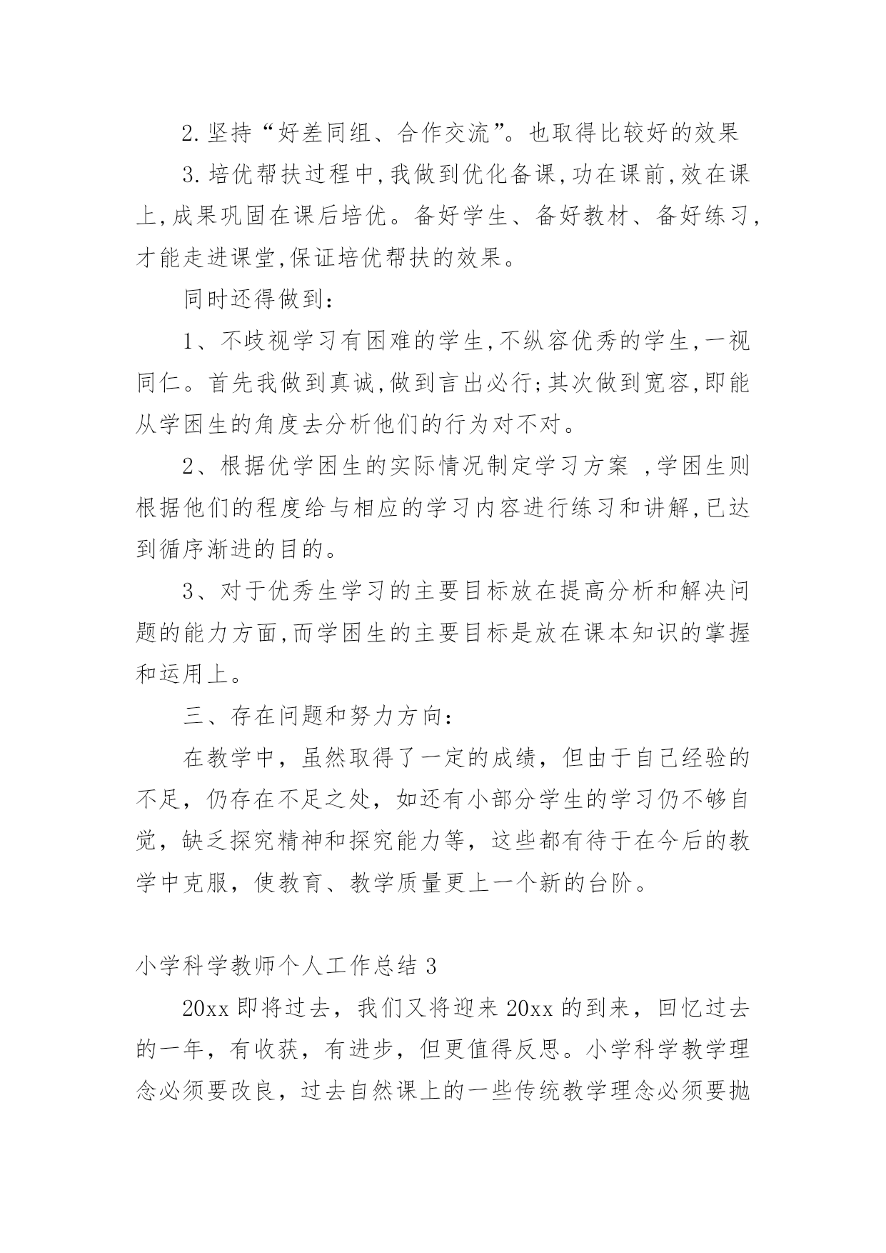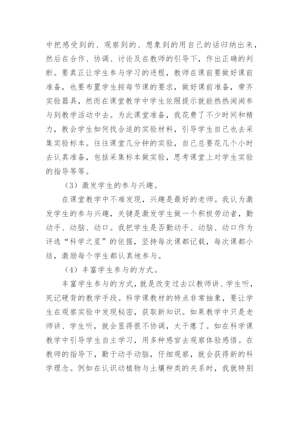 小学科学教师个人工作总结小学科学教师个人工作总结精选[15篇]总结是事后对某一时期、某一项目或某些工作进行回顾和分析,从而做出带有规律性的结论,它有助于我们寻找工作和事物发展的规律,从而掌握并运用这些规律,为此要我们写一份总结。那么总结有什么格式呢?以下是小编精心整理的小学科学教师个人工作总结,仅供参考,大家一起来看看吧。小学科学教师个人工作总结1时间如白驹过隙,回顾一学期的工作,想说的真是太多太多。辛酸终将过去,留下的是美好的回忆和汗水结下的果实。每天,我以无比艰辛的努力和劳动,用爱心去打动每位学生,让他们在我的呵护下茁壮成长。作为一名小学教师,我觉得这份工作肩负着很大的责任,所以,自工作以来,我始终以勤恳、踏实的态度来对待我的工作,并不断学习,努力提高自己各方面的能力。现将本学年的工作总结如下:一、在政治思想方面我积极参加各种学习培训,认真参加政治学习,并做好学习笔记,提高自己的思想觉悟。认真学习新的教育理论,及时更新教育理念。我不但注重集体的政治理论学习,还认真学习了《小学科学课程标准》和《小学科学课程标准解读》《课堂观察》,从书本中汲取营养,认真学习仔细体会新形势下怎样做一名好教师。我还深知要教育好学生,教师必须时时做到教书育人、言传身教、为人师表,以自己的人格、行为去感染学生,努力使学生能接受我、喜欢我。在工作中,我积极、主动、勤恳、责任心较强,乐于接受学校布置的'各项工作,在不断的学习中,努力使自己的思想觉悟、理论水平、业务能力都得到较快的提高。二、在教育教学方面本学期我担任四、五年级的科学,小学科学课是以培养学生科学素养为宗旨的科学启蒙课程,目前越来越受到各界的重视,我们学校也很注重学生科学素养的培养,我深知自己肩上的担子的重要性,并下决心以我微薄的力量来推进我校科学教育向前发展。我知道,要想提高教学质量,首先要立足课堂,教师要从常规课上要质量。我严格要求自己,尽量使教学工作更加完善。我是这样进行教学活动的:1、课前准备:课前要备好课,一定要准备好科学课上所需要的实验材料,这对学生的探究和实验非常重要,所以,我会提前准备好,如果仪器室没有的材料,但是为了上好课,我就自己找材料或动手制作。需要、方法、习惯,学习新知识可能会有哪些困难,采取相应的指导措施。并考虑到学生的个体差异,尽量因材施教,有效地对个别学生进行引导。对于有些基础差的班级尽量放慢脚步,给足他们充分的消化吸收的时间。如何安排每节课的活动。重要的学科。想法表示深刻的理解和尊重,不能一味地批评,要进行思想教育,使他们改变学习态度,学习才能有进步。评课,虚心向同行学习教学方法,不懂就问,博采众长,提高教学水平。三、开展科学活动,全面普及、注重提高。活动是科普教育的载体、没有活动就没有活力,我们根据小学生的特点,积极开展具有思想性、科学性、趣味性、实践性、创造性,内容丰富、形式多样的科普教育活动,我指导学生进行的科学活动如下:家庭及社会进行“垃圾废品情况调查”活动,使学生对科普知识有了些了解,更加深了对环境保护重要性的了解,也懂得了平时如何在自己的身边做好一些节能、节水、节电的方法。开展读科普书籍的活动,激发学生学习科学的兴趣,以达到从课外书籍上学到课本以外的知识的目的。动脑的能力培养。四、继续学习,不断提高。在紧张工作之余,要为自己充充电,特别是作为一名小学的科学教师,在学生的心目中似乎懂得要更多一些,然而在教学过程中,由于对科学学科教学经验不足,总觉得自己在各个方面的知识还欠缺,教学上时常遇到一些知识上的难点,书到用时方恨少,没办法,只能平时自己多看些杂书了,在头脑中多储备一些知识,这样面对学生的难题时,能够坦然相对。另外,多争取外出听课的机会,以学习外校优秀教师和专家的先进理念,自我感觉在教学理念上,在自己的教学中为断实践,不断总结,不断提高,也慢慢地有了自己的一套思维。总之,在这一学年中,我不仅在业务能力上,还是在教育教学上都有了一定的提高。金无足赤,人无完人,在教学工作中难免有缺陷,例如,理论知识不够,教学经验不足,组织教学能力还有待提高。在今后的工作中,我将更严格要求自己,努力工作,发扬优点,改正缺点,争取成为一名优秀的小学教师。小学科学教师个人工作总结2作为一名小学科学教师,我觉得这份工作肩负着很大的责任,所以,自工作以来,我始终以勤恳、踏实的态度来对待我的工作,并不断学习,努力提高自己各方面的能力。现将本学年的工作总结如下:一、教育教学工作(一)摆正心态,严格要求自己,树立良好的工作作风。作为一名科学学科教研组长,我能向模范和先进教师学习,主动反思自己的思想和行为,不断地剖析自己在言行中的过失,不断总结经验教训。工作中,我注意以集体为重,注意随时调整自己的心态,努力用学科带头人的标准要求自己。同时,还能够观察一些教师心态上的变化,及时与之沟