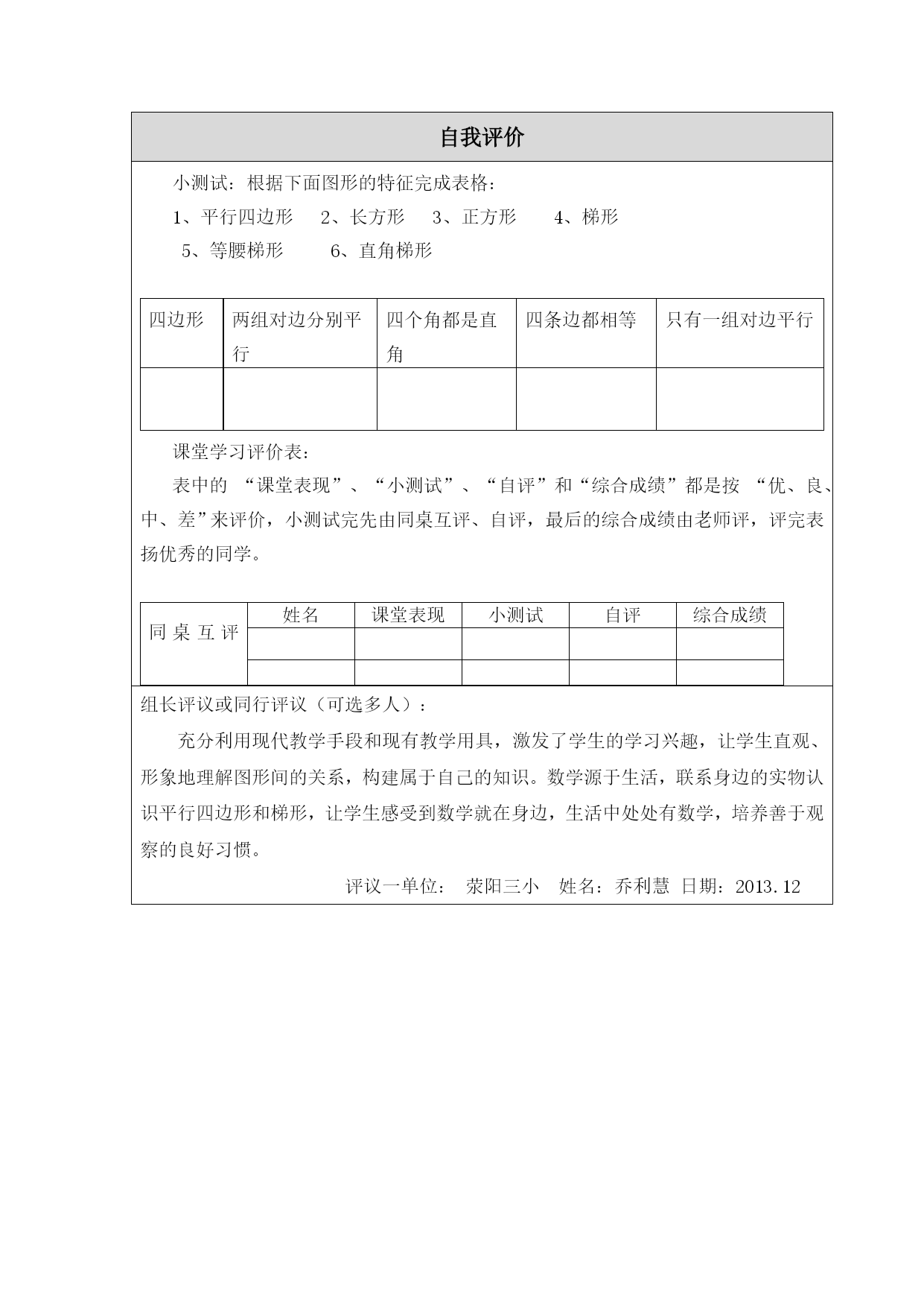 教学设计(教案)模板基本信息学科小学数学年级四年级教学形式教师宋桂萍单位荥阳市第三小学课题名称《平行四边形和梯形的认识》学情分析本单元是认识平行四边形和梯形,这是在学生学习了角的度量的基础上教学的,学生在前面已经学习了有关四边形的知识,对平行四边形也有了初步的认识,这里着重给出的是平行四边形的特征以及与正方形、长方形的关系。梯形在这里是第一次正式出现,教材除教学梯形的特征外,还注意说明与平行四边形的联系和区别。这是在学生认识一些平面图形,包括直观认识过平行四边形之后,主要以平行线的认识为基础学习的。掌握这部分内容,是进一步学习这些图形面积计算的基础,发展学生的空间观念。学生在前面已经初步认识四边形的知识,在头脑中已初步建立了四边形的表象,这些都为本节课的学习奠定了坚实的知识基础。但是小学生的空间想象能力不够丰富,对平行四边形与长方形和正方形的关系认识有一定的困难。因此本节课的学习就要让学生充分利用好已有知识,让学生通过观察、操作、画图、推理等手段来掌握平行四边形和梯形的特征,了解平行四边形与长方形和正方形的关系。教学目标1、通过操作和讨论掌握平行四边形和梯形的特征。2、通过活动,了解平行四边形与长方形和正方形的关系。3、注意培养学生的空间观念和想像力。教学重点:通过操作和讨论掌握平行四边形和梯形的特征。教学难点:了解平行四边形与长方形和正方形的关系。教学过程一、复习旧知,创设情境课件出示校园情景图,哪儿用到了四边形呢?仔细观察情景图,找出不同的四边形。创设学生熟悉并感兴趣的现实情境,复习旧知识,为扩展新知作好铺垫。激发学生兴趣,让学生想学、乐学。二、认识平行四边形和梯形特征。1、每桌发放两张图片(平行四边形和梯形)。同桌一起观察图形,用上手中的直尺、三角板、量角器等学具比一比,量一量,讨论它们有什么特征2、验证小结,课件出示平行四边形和梯形,认识各部分名称。归纳概括定义。交流小结。(1)、学生代表说自己的发现。(2)、概括定义。3、课件展示生活中常见的平行四边形和梯形。仔细观察,认真思考,给四边形分类。4、引导学生探讨四边形间的关系量一量,画一画,同桌讨论,解决问题三、引导看书,巩固练习。1、要求学生把平行四边形和梯形的定义画出来,读一读。2、出示P73第3题四、总结,评价一、课件出示小测试:根据下面图形的特征完成表格:1、平行四边形2、长方形3、正方形4、梯形5、等腰梯形6、直角梯形(表格略)二、教师评价。板书设计正方形平行四边形四边形作业或预习布置作业,拓展应用。展示练习题:1、你能把一个平行四边形剪成两个完全相等的图形吗?2、火眼金睛——试一试你的好眼力P76第12题3、同桌讨论,剪一剪。4、认真观察,找出所有的平行四边形和梯形。自我评价小测试:根据下面图形的特征完成表格:1、平行四边形2、长方形3、正方形4、梯形5、等腰梯形6、直角梯形四边形两组对边分别平行四个角都是直角四条边都相等只有一组对边平行课堂学习评价表:表中的“课堂表现”、“小测试”、“自评”和“综合成绩”都是按“优、良、中、差”来评价,小测试完先由同桌互评、自评,最后的综合成绩由老师评,评完表扬优秀的同学。同桌互评姓名课堂表现小测试自评综合成绩组长评议或同行评议(可选多人):充分利用现代教学手段和现有教学用具,激发了学生的学习兴趣,让学生直观、形象地理解图形间的关系,构建属于自己的知识。数学源于生活,联系身边的实物认识平行四边形和梯形,让学生感受到数学就在身边,生活中处处有数学,培养善于观察的良好习惯。评议一单位:荥阳三小姓名:乔利慧日期:2013.12