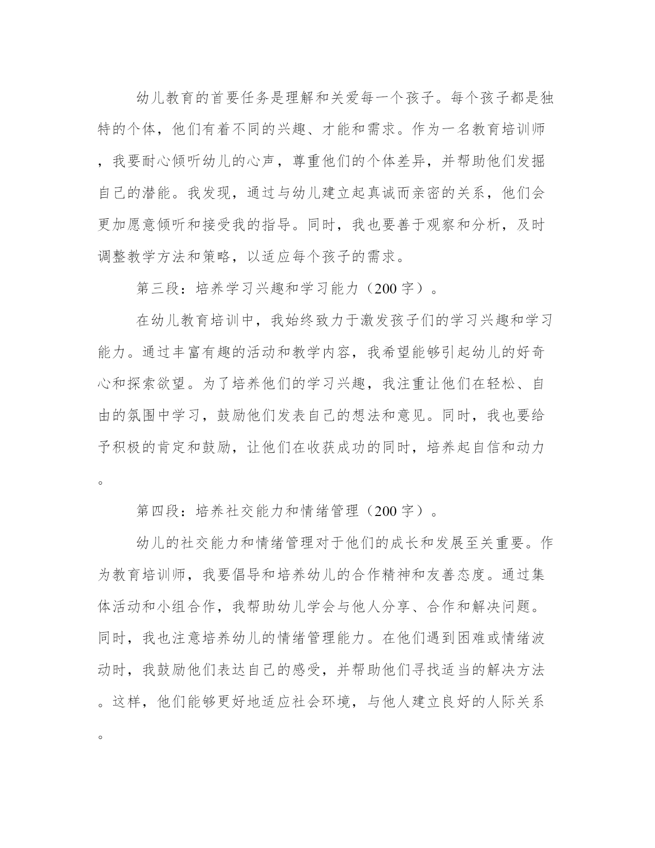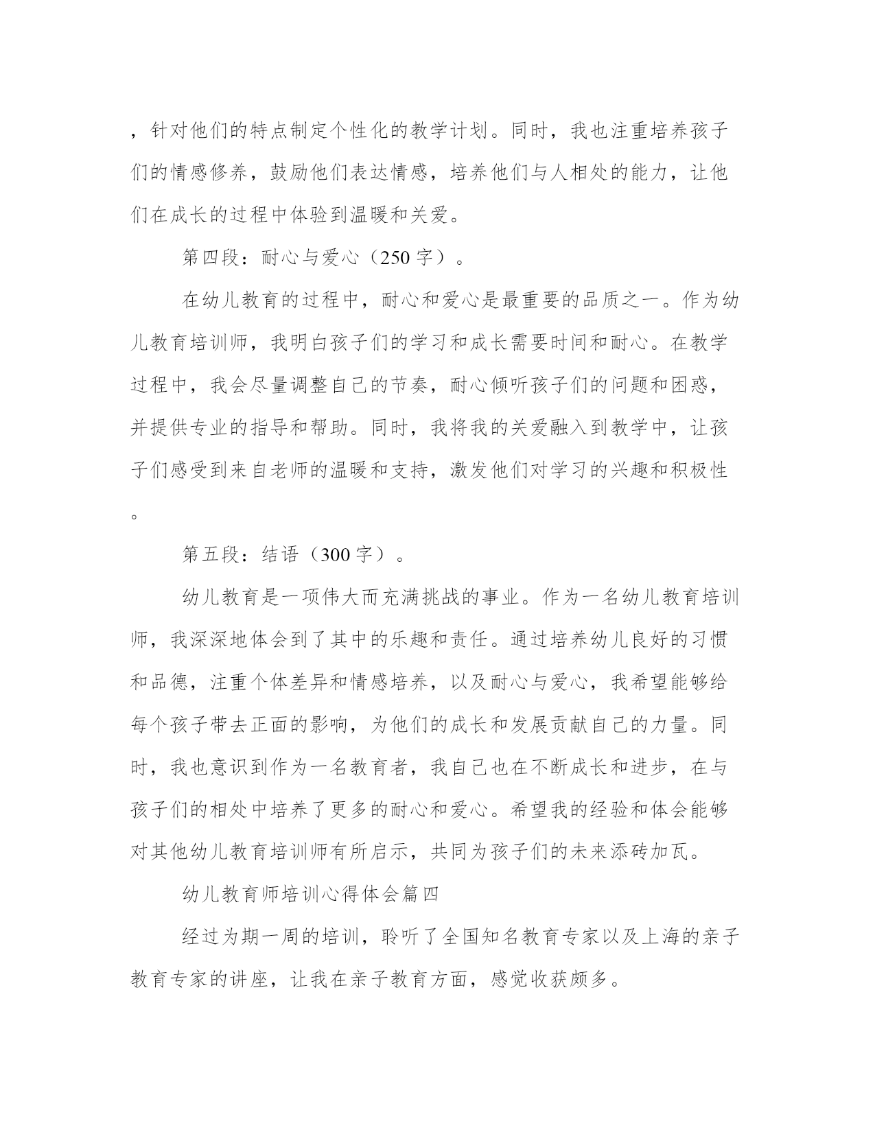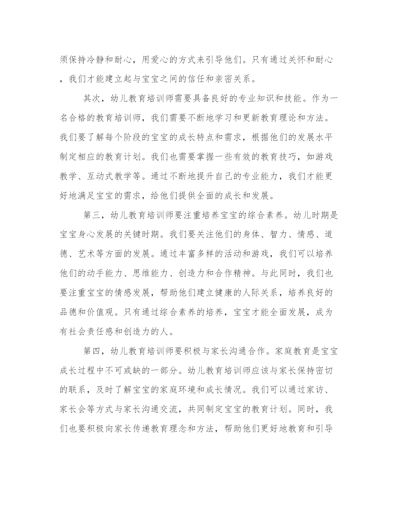 幼儿教育师培训心得体会范文(17篇)心得体会是对自己在某个领域或者某个经历中所得到的体验和感悟的总结和概括,它能够帮助我们提升自我认知和增进经验积累,我觉得写一篇心得体会对我们都有益处。心得体会是一种对于自身经历和感受的深入思考和总结,它能够让我们更好地发现自身的优点和不足,并提供改进的方向和思路。心得体会是一种自我反省和成长的过程,通过对自己的思考总结,我们能够在今后的工作学习中更加有针对性地改进自己的表现和提升自我素养。-写心得体会时可以用一些具体的例子和实际经验来支撑观点。以下是小编为大家精选整理的一些心得体会,希望能对大家的写作提供一些帮助和指导。幼儿教育师培训心得体会篇一第一段:引言(200字)。作为一名幼儿教育培训师,我有幸参与了许多幼儿的成长过程。在工作的过程中,我深刻地感受到了幼儿教育的重要性。在与幼儿互动的同时,我不仅为他们的成长付出了努力,也从中获得了很多收获。通过这份工作,我学到了如何与幼儿建立起亲密的关系,并在他们身上看到了无限的可能性。在这篇文章中,我将分享一些我作为幼儿教育培训师的心得体会。第二段:理解和关爱的重要性(200字)。幼儿教育的首要任务是理解和关爱每一个孩子。每个孩子都是独特的个体,他们有着不同的兴趣、才能和需求。作为一名教育培训师,我要耐心倾听幼儿的心声,尊重他们的个体差异,并帮助他们发掘自己的潜能。我发现,通过与幼儿建立起真诚而亲密的关系,他们会更加愿意倾听和接受我的指导。同时,我也要善于观察和分析,及时调整教学方法和策略,以适应每个孩子的需求。第三段:培养学习兴趣和学习能力(200字)。在幼儿教育培训中,我始终致力于激发孩子们的学习兴趣和学习能力。通过丰富有趣的活动和教学内容,我希望能够引起幼儿的好奇心和探索欲望。为了培养他们的学习兴趣,我注重让他们在轻松、自由的氛围中学习,鼓励他们发表自己的想法和意见。同时,我也要给予积极的肯定和鼓励,让他们在收获成功的同时,培养起自信和动力。第四段:培养社交能力和情绪管理(200字)。幼儿的社交能力和情绪管理对于他们的成长和发展至关重要。作为教育培训师,我要倡导和培养幼儿的合作精神和友善态度。通过集体活动和小组合作,我帮助幼儿学会与他人分享、合作和解决问题。同时,我也注意培养幼儿的情绪管理能力。在他们遇到困难或情绪波动时,我鼓励他们表达自己的感受,并帮助他们寻找适当的解决方法。这样,他们能够更好地适应社会环境,与他人建立良好的人际关系。第五段:持续学习和成长(200字)。作为一名幼儿教育培训师,我深知持续学习的重要性。幼儿教育是一个不断发展和变化的领域,新的教育理念和方法不断涌现。所以,我积极参加培训和研讨会,与同行交流心得和经验。通过不断学习和反思,我提升了自己的专业能力,也为幼儿提供了更好的教育服务。除了专业知识,我还见证了幼儿的成长和进步。看到他们在我的教导下获得了进步,我感到非常欣慰和自豪。总结(200字)。作为一名幼儿教育培训师,我明白教育是一项充满挑战和责任的工作。通过与幼儿建立关系,我懂得了尊重和关怀的重要性。在培养学习能力和社交能力的过程中,我教会了他们自信、合作和情绪管理。通过持续学习和成长,我不断提高自己的专业水平,为幼儿的发展提供更好的支持。无论是在教育实践还是心灵成长方面,我都深深感受到了这份工作的意义和价值。幼儿的成长是我最大的动力,我将继续努力,为他们的未来发展贡献自己的力量。幼儿教育师培训心得体会篇二我有幸参加了市里组织的幼儿骨干教师培训班。所见所闻收获很多。1、对幼儿园美术教育活动设计的重新认识。幼儿园美术教育活动的成功与否,受到各种因素的影响和制约。主要有教育目标、教育课程、教师与幼儿的互动方式等因素,李素英专家再次给我们阐述了制定目标的重要性等等。2、对幼儿园教学评价的再思考。出处FANweN.ChAzidIaN.COm看完活动后,高静组长又讲了幼儿园教学评价--幼儿园教学活动是幼儿园教育活动的一种重要形式,是教师进行计划、设计和组织的专门活动,或称正式指导的活动。对教学活动的评价是幼儿教育评价的重要内容。教学活动的评价,因教育及教学观的不同的方案,评价项目也因此有所不同。但教学评价的核心目标都是为了了解教学活动的成效,了解教学过程中教师和幼儿的行为,了解教学对幼儿发展的意义。因此,我们认为教学评价的基本价值取向应该是:教学应促进幼儿认识、学习方法及情感等多方面的全面、和谐发展;体验、尝试和发现等是幼儿重要的学习方式;适宜的目标和内容才能引发真正有效的教和学;教学应当具有开放的、能激发幼儿探究欲和思考的环境;产生问题、引发互动是有效教育的重要特征;教学过程应该让幼儿感受挑战。3、对自身的反思。听了这么多骨干教师的评课,虽然角度各不相同,但是有一点是很多老师都提到
