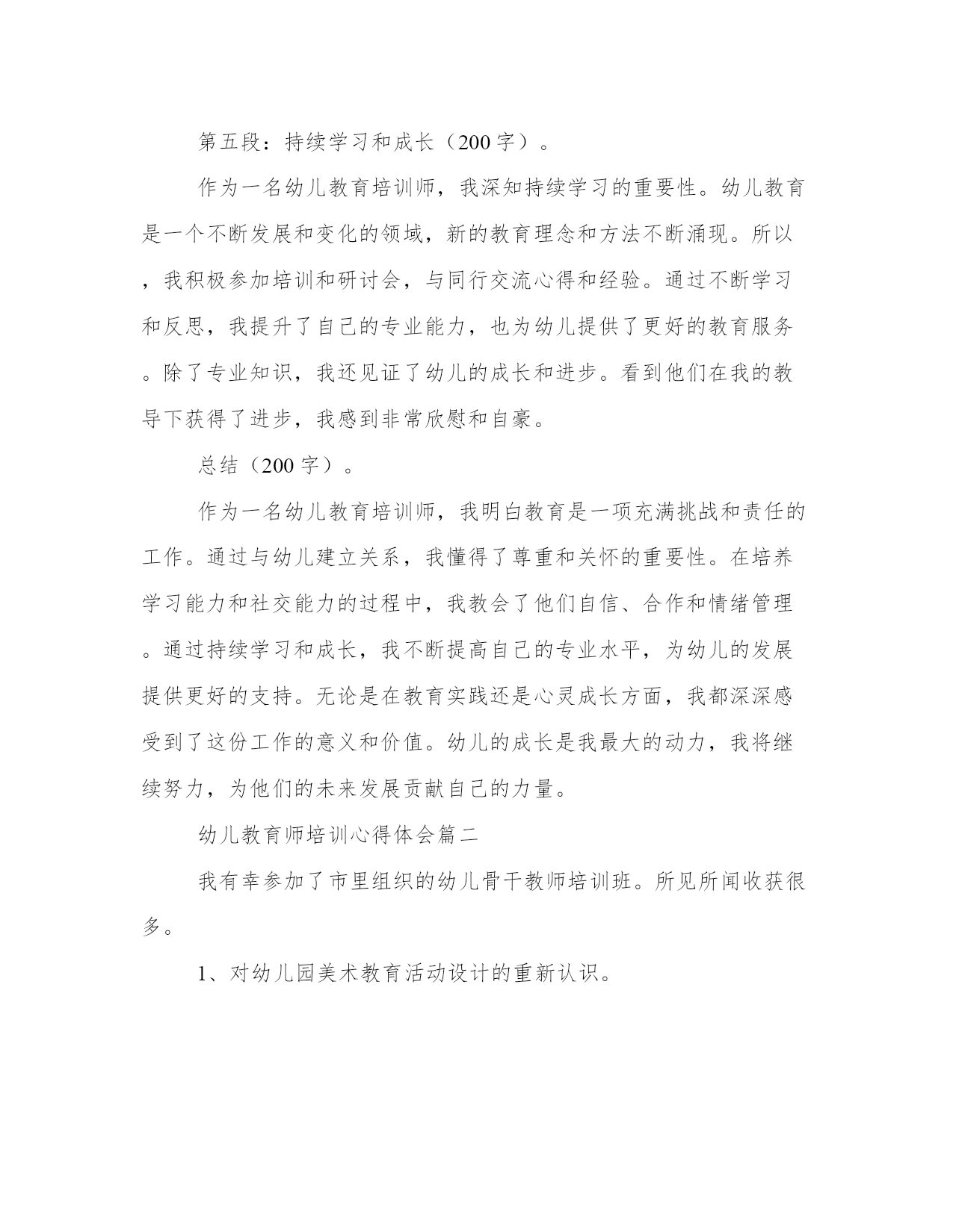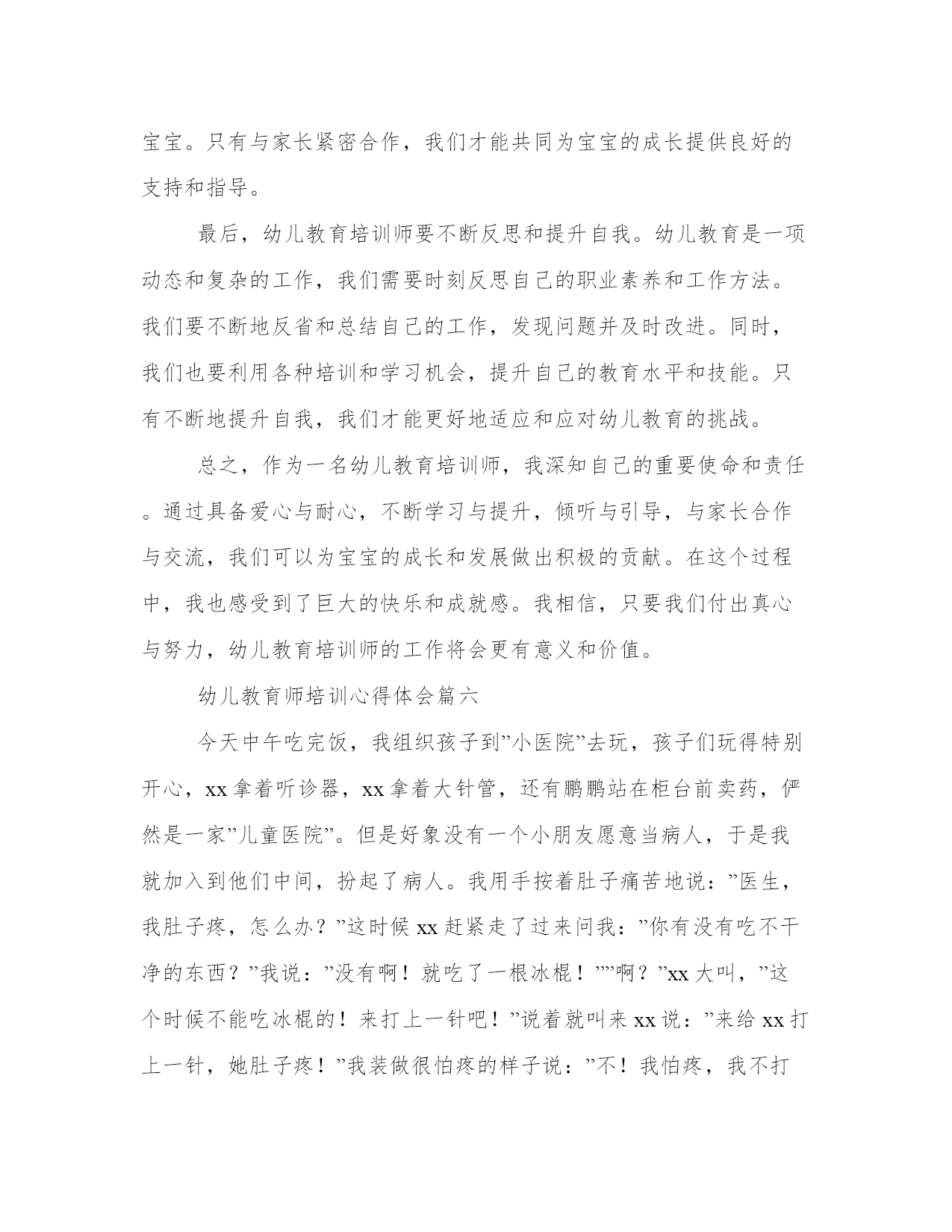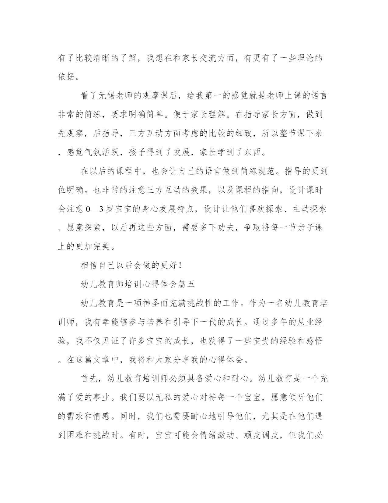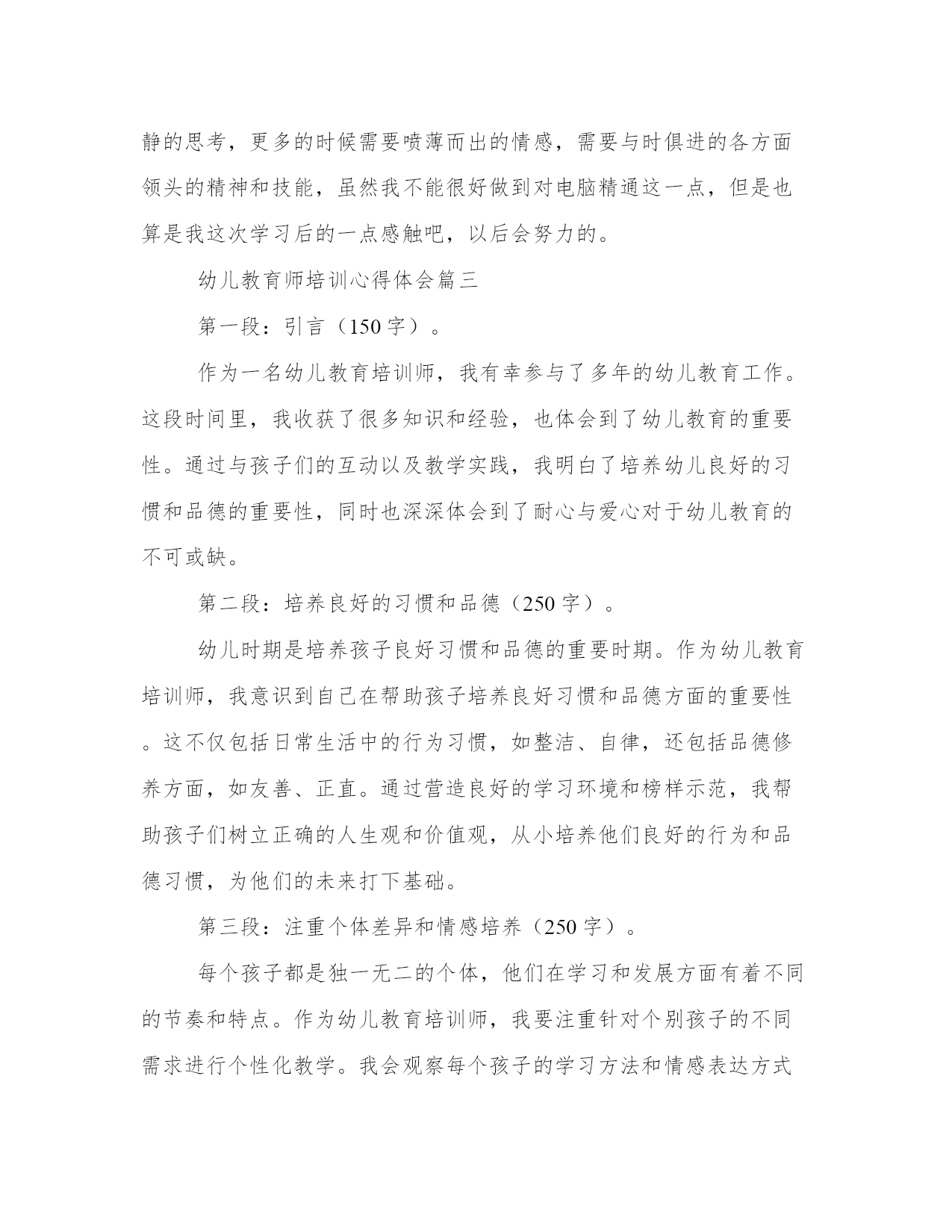 幼儿教育师培训心得体会范文(17篇)心得体会是对自己在某个领域或者某个经历中所得到的体验和感悟的总结和概括,它能够帮助我们提升自我认知和增进经验积累,我觉得写一篇心得体会对我们都有益处。心得体会是一种对于自身经历和感受的深入思考和总结,它能够让我们更好地发现自身的优点和不足,并提供改进的方向和思路。心得体会是一种自我反省和成长的过程,通过对自己的思考总结,我们能够在今后的工作学习中更加有针对性地改进自己的表现和提升自我素养。-写心得体会时可以用一些具体的例子和实际经验来支撑观点。以下是小编为大家精选整理的一些心得体会,希望能对大家的写作提供一些帮助和指导。幼儿教育师培训心得体会篇一第一段:引言(200字)。作为一名幼儿教育培训师,我有幸参与了许多幼儿的成长过程。在工作的过程中,我深刻地感受到了幼儿教育的重要性。在与幼儿互动的同时,我不仅为他们的成长付出了努力,也从中获得了很多收获。通过这份工作,我学到了如何与幼儿建立起亲密的关系,并在他们身上看到了无限的可能性。在这篇文章中,我将分享一些我作为幼儿教育培训师的心得体会。第二段:理解和关爱的重要性(200字)。幼儿教育的首要任务是理解和关爱每一个孩子。每个孩子都是独特的个体,他们有着不同的兴趣、才能和需求。作为一名教育培训师,我要耐心倾听幼儿的心声,尊重他们的个体差异,并帮助他们发掘自己的潜能。我发现,通过与幼儿建立起真诚而亲密的关系,他们会更加愿意倾听和接受我的指导。同时,我也要善于观察和分析,及时调整教学方法和策略,以适应每个孩子的需求。第三段:培养学习兴趣和学习能力(200字)。在幼儿教育培训中,我始终致力于激发孩子们的学习兴趣和学习能力。通过丰富有趣的活动和教学内容,我希望能够引起幼儿的好奇心和探索欲望。为了培养他们的学习兴趣,我注重让他们在轻松、自由的氛围中学习,鼓励他们发表自己的想法和意见。同时,我也要给予积极的肯定和鼓励,让他们在收获成功的同时,培养起自信和动力。第四段:培养社交能力和情绪管理(200字)。幼儿的社交能力和情绪管理对于他们的成长和发展至关重要。作为教育培训师,我要倡导和培养幼儿的合作精神和友善态度。通过集体活动和小组合作,我帮助幼儿学会与他人分享、合作和解决问题。同时,我也注意培养幼儿的情绪管理能力。在他们遇到困难或情绪波动时,我鼓励他们表达自己的感受,并帮助他们寻找适当的解决方法。这样,他们能够更好地适应社会环境,与他人建立良好的人际关系。第五段:持续学习和成长(200字)。作为一名幼儿教育培训师,我深知持续学习的重要性。幼儿教育是一个不断发展和变化的领域,新的教育理念和方法不断涌现。所以,我积极参加培训和研讨会,与同行交流心得和经验。通过不断学习和反思,我提升了自己的专业能力,也为幼儿提供了更好的教育服务。除了专业知识,我还见证了幼儿的成长和进步。看到他们在我的教导下获得了进步,我感到非常欣慰和自豪。总结(200字)。作为一名幼儿教育培训师,我明白教育是一项充满挑战和责任的工作。通过与幼儿建立关系,我懂得了尊重和关怀的重要性。在培养学习能力和社交能力的过程中,我教会了他们自信、合作和情绪管理。通过持续学习和成长,我不断提高自己的专业水平,为幼儿的发展提供更好的支持。无论是在教育实践还是心灵成长方面,我都深深感受到了这份工作的意义和价值。幼儿的成长是我最大的动力,我将继续努力,为他们的未来发展贡献自己的力量。幼儿教育师培训心得体会篇二我有幸参加了市里组织的幼儿骨干教师培训班。所见所闻收获很多。1、对幼儿园美术教育活动设计的重新认识。幼儿园美术教育活动的成功与否,受到各种因素的影响和制约。主要有教育目标、教育课程、教师与幼儿的互动方式等因素,李素英专家再次给我们阐述了制定目标的重要性等等。2、对幼儿园教学评价的再思考。出处FANweN.ChAzidIaN.COm看完活动后,高静组长又讲了幼儿园教学评价--幼儿园教学活动是幼儿园教育活动的一种重要形式,是教师进行计划、设计和组织的专门活动,或称正式指导的活动。对教学活动的评价是幼儿教育评价的重要内容。教学活动的评价,因教育及教学观的不同的方案,评价项目也因此有所不同。但教学评价的核心目标都是为了了解教学活动的成效,了解教学过程中教师和幼儿的行为,了解教学对幼儿发展的意义。因此,我们认为教学评价的基本价值取向应该是:教学应促进幼儿认识、学习方法及情感等多方面的全面、和谐发展;体验、尝试和发现等是幼儿重要的学习方式;适宜的目标和内容才能引发真正有效的教和学;教学应当具有开放的、能激发幼儿探究欲和思考的环境;产生问题、引发互动是有效教育的重要特征;教学过程应该让幼儿感受挑战。3、对自身的反思。听了这么多骨干教师的评课,虽然角度各不相同,但是有一点是很多老师都提到