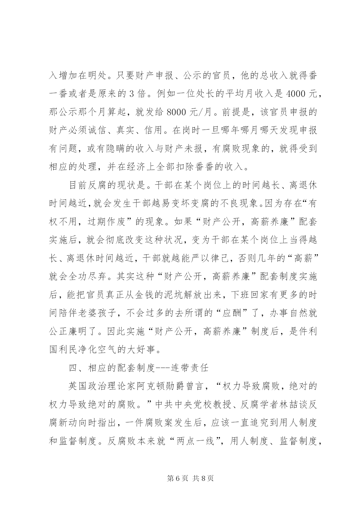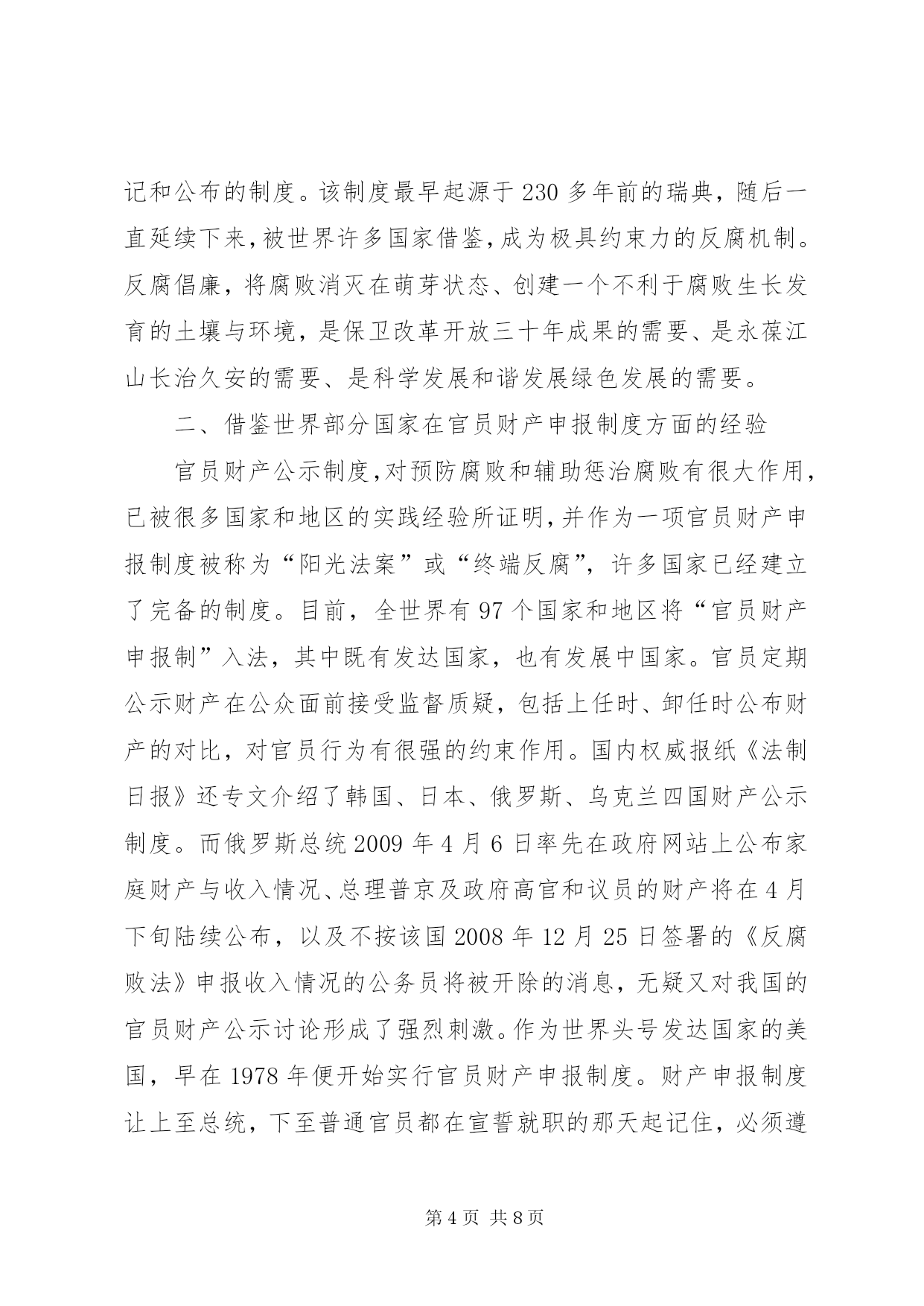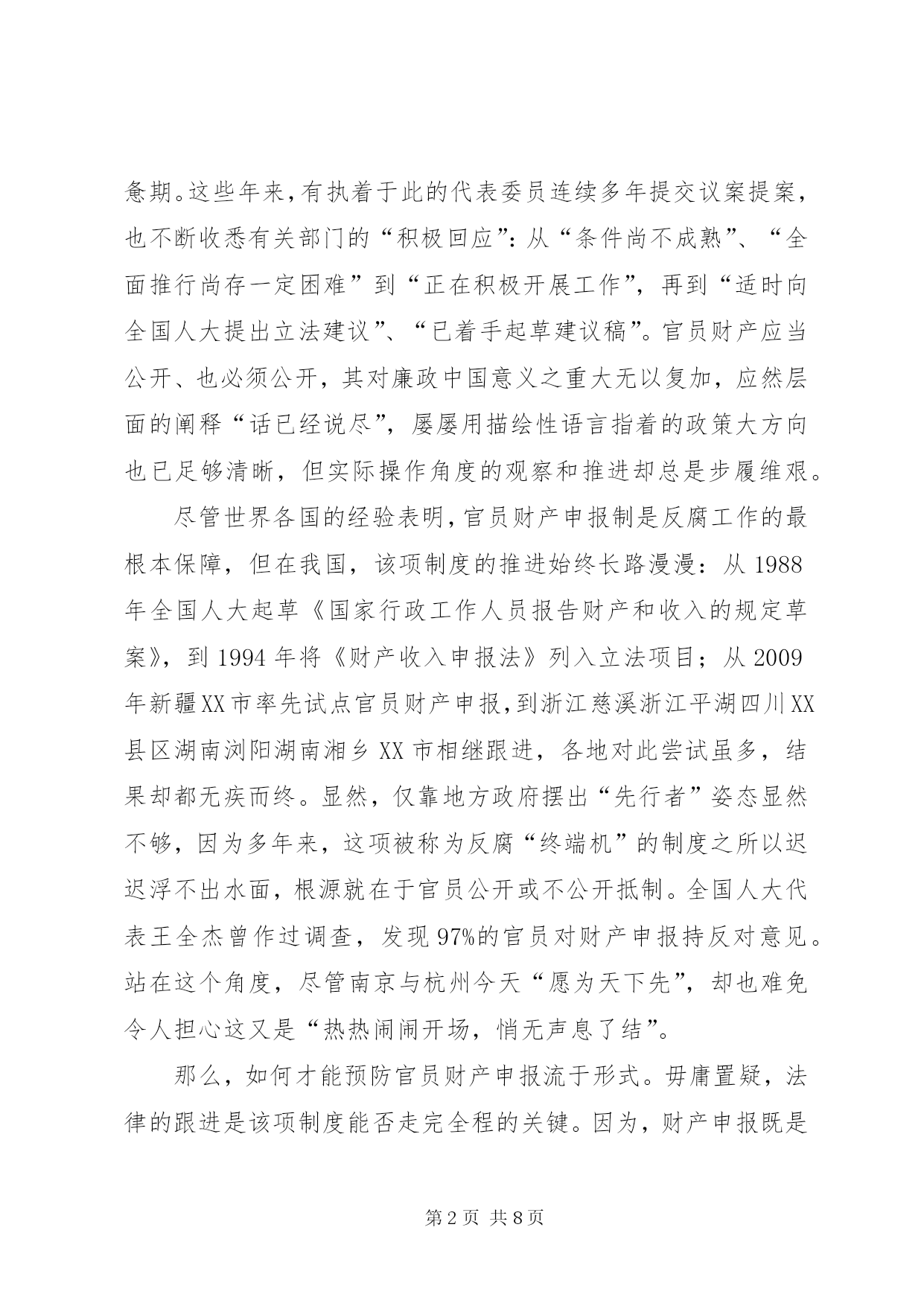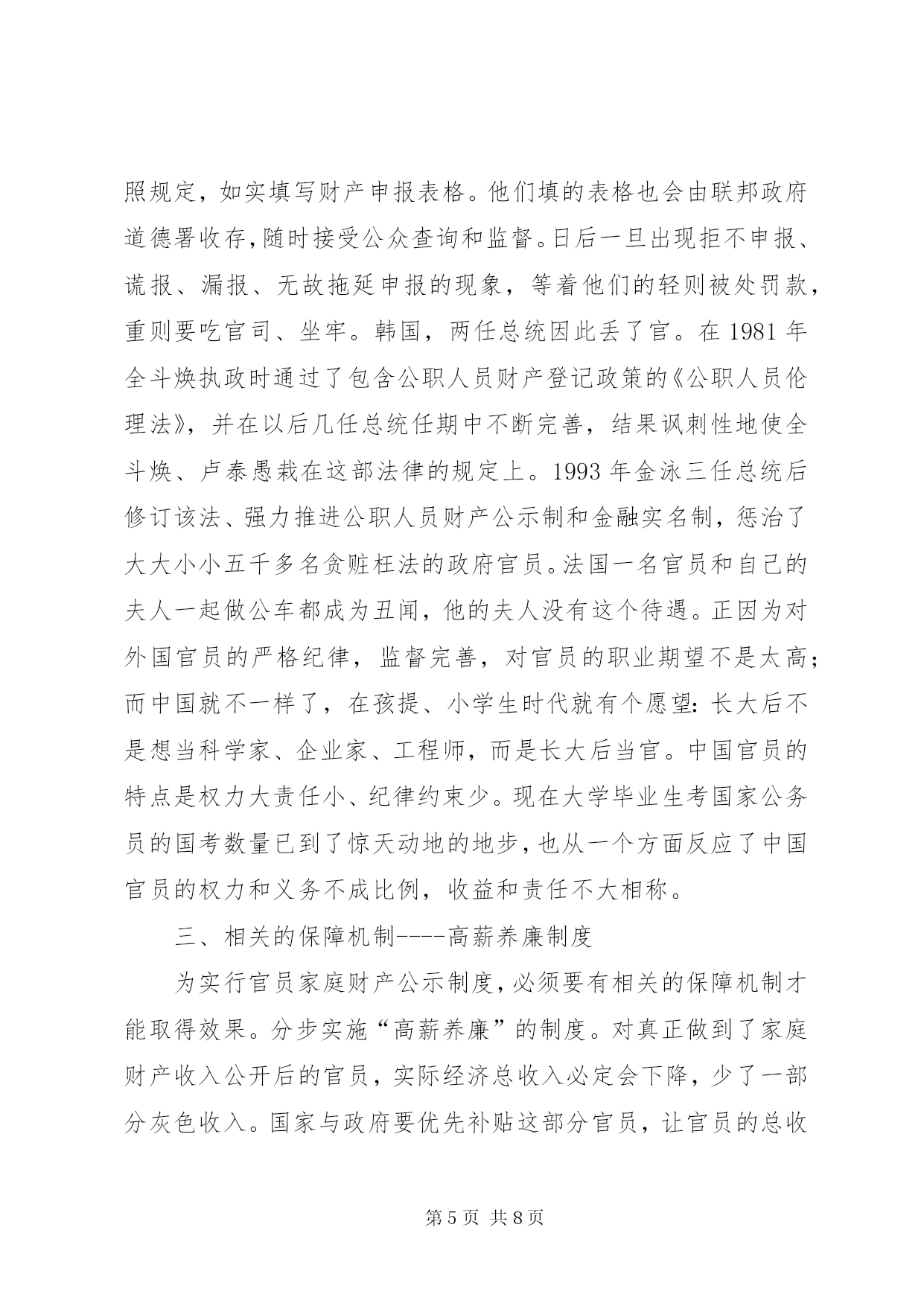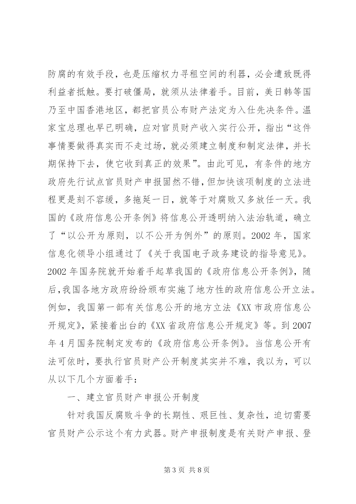 第PAGE\*Arabic\*MERGEFORMAT8页共NUMPAGES\*MERGEFORMAT8页关于公务员财产公开制度的提案浅论官员信息公开之财产公开制度的构建注:部分内容为摘抄内容内容摘要:阳光是最好的防腐剂,随着《政府信息公开条例》的出台,我国政府信息公开的制度一直在不断改善,但由于起步晚,实行经验少,我国的政府信息公开尤其是政府官员的财产信息公开仍然存在很大问题,比如由此产生的腐败问题,亟待解决。此者,财产申报、公示制度是反腐斗争强有力的武器,我国应当借鉴世界部分国家在官员财产申报制度方面的做法,提出当前我国官员财产申报、公示制度的对策和实施步骤,实施“财产公开,高薪养廉”制度,强化捆绑和连带责任制。本文针对信息公开的现实情况,讨论关于政府官员财产信息公开制度的构建,来解决当前因为信息公开制度额不完善导致的腐败问题。关键词:财产公开法律保障反腐倡廉高薪养廉连带责任有关官员财产公开的话题讨论,几乎已经延展到所有应该到达的领域,经由不停刷新的公共事件接力推动,该项制度建立并实质性运作的迫切性已形成社会的普遍共识。但目前的问题可能在于,描绘性的语言所指向的政策方向足够清晰,但落实到实际操作层面的制度推进却一直呈现阻力重重的状态。诚然,任何一项制度的切实推进,需要有配套措施和适宜的土壤。官员财产的申报与公开,于公共讨论而言,似已进入话题疲惫期。这些年来,有执着于此的代表委员连续多年提交议案提案,也不断收悉有关部门的“积极回应”:从“条件尚不成熟”、“全面推行尚存一定困难”到“正在积极开展工作”,再到“适时向全国人大提出立法建议”、“已着手起草建议稿”。官员财产应当公开、也必须公开,其对廉政中国意义之重大无以复加,应然层面的阐释“话已经说尽”,屡屡用描绘性语言指着的政策大方向也已足够清晰,但实际操作角度的观察和推进却总是步履维艰。尽管世界各国的经验表明,官员财产申报制是反腐工作的最根本保障,但在我国,该项制度的推进始终长路漫漫:从1988年全国人大起草《国家行政工作人员报告财产和收入的规定草案》,到1994年将《财产收入申报法》列入立法项目;从2009年新疆XX市率先试点官员财产申报,到浙江慈溪浙江平湖四川XX县区湖南浏阳湖南湘乡XX市相继跟进,各地对此尝试虽多,结果却都无疾而终。显然,仅靠地方政府摆出“先行者”姿态显然不够,因为多年来,这项被称为反腐“终端机”的制度之所以迟迟浮不出水面,根源就在于官员公开或不公开抵制。全国人大代表王全杰曾作过调查,发现97%的官员对财产申报持反对意见。站在这个角度,尽管南京与杭州今天“愿为天下先”,却也难免令人担心这又是“热热闹闹开场,悄无声息了结”。那么,如何才能预防官员财产申报流于形式。毋庸置疑,法律的跟进是该项制度能否走完全程的关键。因为,财产申报既是防腐的有效手段,也是压缩权力寻租空间的利器,必会遭致既得利益者抵触。要打破僵局,就须从法律着手。目前,美日韩等国乃至中国香港地区,都把官员公布财产法定为入仕先决条件。温家宝总理也早已明确,应对官员财产收入实行公开,指出“这件事情要做得真实而不走过场,就必须建立制度和制定法律,并长期保持下去,使它收到真正的效果”。由此可见,有条件的地方政府先行试点官员财产申报固然不错,但加快该项制度的立法进程更是刻不容缓,多拖延一日,就等于对腐败又多放任一天。我国的《政府信息公开条例》将信息公开透明纳入法治轨道,确立了“以公开为原则,以不公开为例外”的原则。2002年,国家信息化领导小组通过了《关于我国电子政务建设的指导意见》。2002年国务院就开始着手起草我国的《政府信息公开条例》,随后,我国各地方政府纷纷颁布实施了地方性的政府信息公开立法。例如,我国第一部有关信息公开的地方立法《XX市政府信息公开规定》,紧接着出台的《XX省政府信息公开规定》等。到2007年4月国务院制定发布的《政府信息公开条例》。当信息公开有法可依时,要执行官员财产公开制度其实并不难,我以为,可以从以下几个方面着手:一、建立官员财产申报公开制度针对我国反腐败斗争的长期性、艰巨性、复杂性,迫切需要官员财产公示这个有力武器。财产申报制度是有关财产申报、登记和公布的制度。该制度最早起源于230多年前的瑞典,随后一直延续下来,被世界许多国家借鉴,成为极具约束力的反腐机制。反腐倡廉,将腐败消灭在萌芽状态、创建一个不利于腐败生长发育的土壤与环境,是保卫改革开放三十年成果的需要、是永葆江山长治久安的需要、是科学发展和谐发展绿色发展的需要。二、借鉴世界部分国家在官员财产申报制度方面的经验官员财产公示制度,对预防腐败和辅助惩治腐败有很大作用,已被很多国家和地区的实践经验所证明,并作为一项官员财产申报制度被称为“阳光法案”或“终端反腐”,许多国家已经建立了完备的制度。目前,