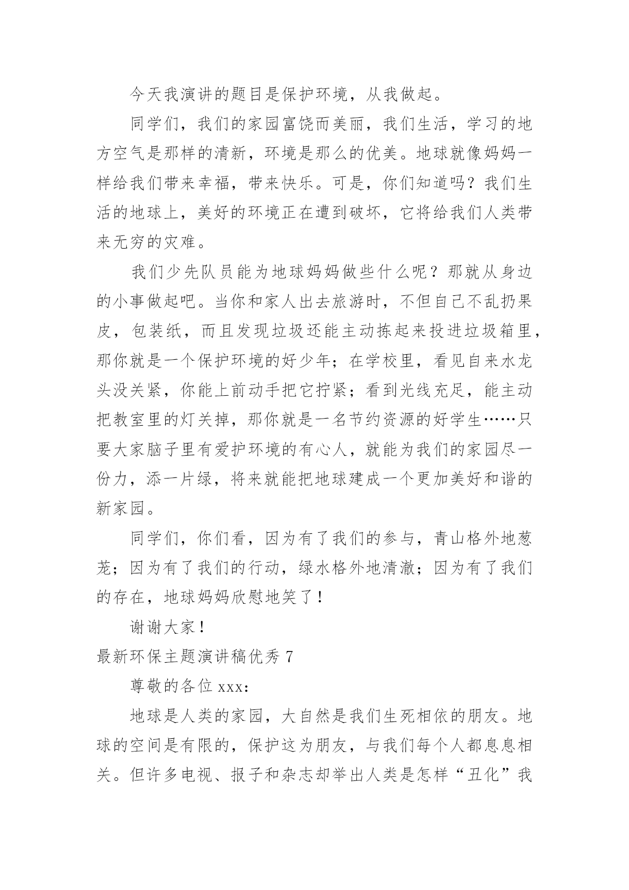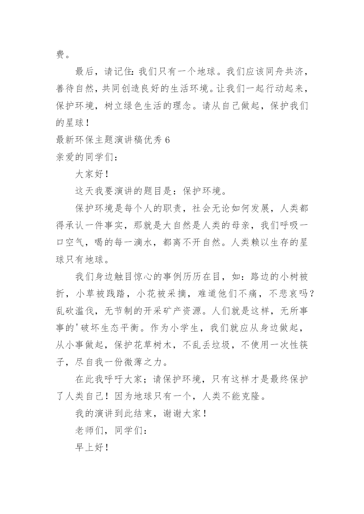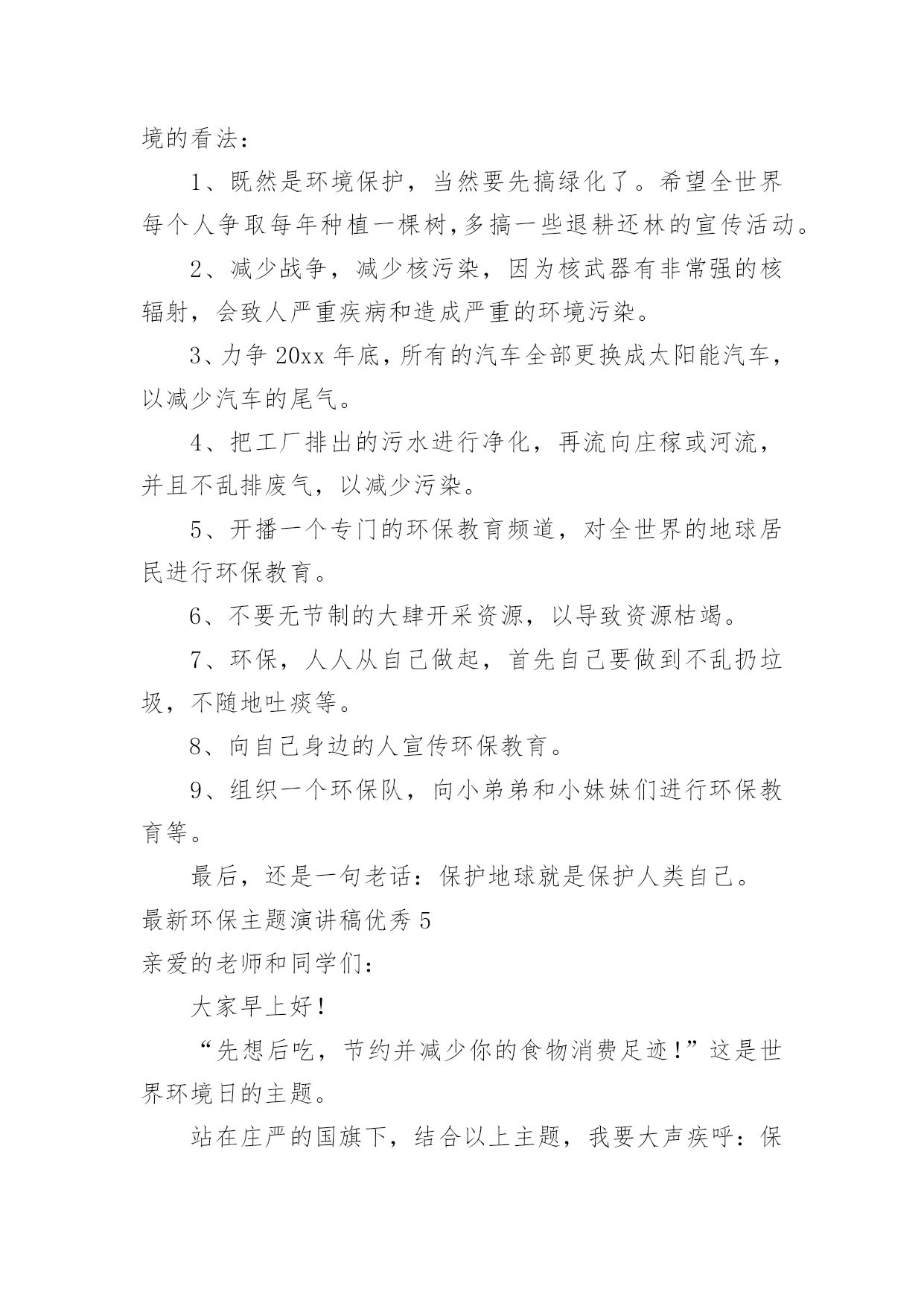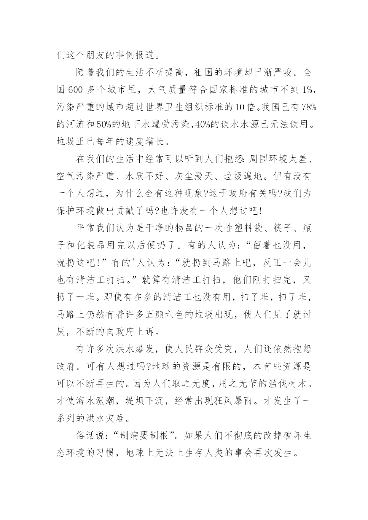 最新环保主题演讲稿优秀最新环保主题演讲稿优秀演讲稿具有逻辑严密,态度明确,观点鲜明的特点。在现在的社会生活中,我们可以使用演讲稿的机会越来越多,相信很多朋友都对写演讲稿感到非常苦恼吧,下面是小编精心整理的最新环保主题演讲稿优秀,希望能够帮助到大家。最新环保主题演讲稿优秀1尊敬的老师,亲爱的同学们,大家好!生态失去平衡,水资源、大气等的污染又造成了全球气候变暖。气候变化是当今全球面临的重大挑战。遏制气候变暖,拯救地球家园,是全人类共同的使命。每个国家和民族、个人,都应当责无旁贷地行动起来!使人与自然能和谐相处。关注生态环境不单是为了保护地球,也是为了维护人类自身的健康和地球上各种生物之间的生态平衡。保护能源,倡导环保,已是迫在眉睫大事,必须从我做起,节约用水、电等,为共同创建我们的美好家园而努力。但是真正做到自觉长久地保护环境,保护资源,还有许多事在等待着我们去做。作为生活中的每一个普通人,虽然不可能都直接从事环保工作,但我们完全可以从身边点滴做起。当看到洗手间的水龙头在滴水时,是不是能够举手关上呢?当购物时能否自觉使用环保袋呢?……一件件小事虽然都很不起眼,但却体现我们究竟具备了多少环保意识。当今,全世界掀起了一轮提倡环保、节约能源,降低消耗的潮流。我家也不例外,节约用电:参加了第四届“地球一小时”熄灯活动,为我们的地球母亲熄灯一小时,为此我还感到特别的骄傲;使用节能灯具;离开房间时关灯;看完电视拔下插头,从不让它处于待机状态;使用太阳能热水器。上街购物时用环保袋,尽量不使用塑料袋。节约用水:洗脸、洗菜、洗衣物的水用于冲洗厕所或拖地。节约纸张,我打草稿时都是使用的双面纸张,减少纸张使用量。我还在我家的小院栽上了各种花草树木等等。这样不仅环保,还能省下不少钱呢!据悉,如果少吃一公斤肉类,就可减少二氧化碳36.4公斤;如果你节约了10度电,那么你就少排放了8千克二氧化碳;如果你少买一件不必要的衣服,可减排6.4千克二氧化碳。大自然已经给了我们太多太多,我们要重视这来之不易的环境,为了我们赖以生存的家园,为了圆那个绿色的'梦,从我做起,从生活中的点滴做起,“保护环境,举手之劳!”也许我们的行动很微不足道,但用我们聚沙成塔的信心和力量就能汇聚成地球绿色的希望!只要我们凝聚每一份力量,减少每一千克碳排放,在二氧化碳减排过程中,普通民众同样也拥有改变未来的力量。大家都来保护环境吧!让天空变得更蓝、水变得更清、花儿变得更红!你还在犹豫什么,赶快行动,加入到环保行动中来,让我们一起成为环保卫士吧!谢谢大家!最新环保主题演讲稿优秀2亲爱的老师们、同学们:大家好!我是大三(x)x班的xxx。非常感谢大家给我这个机会站在这个讲台上,感谢大家听我演讲。谢谢你。我今天给大家带来的主题是“保护环境”。我相信当我说出这个话题的时候,很多同学就开始抱怨了。是的,其实是我们听过的一个麻木的词。在过去的演讲和班会上,这个话题不知道被提了多少次!但是同学们,你们真的想过为什么这个让人麻木的词会反复出现在我们的耳边吗?因为我们没把这句话放在心上!回头看看之前老师的发言,好像我们学校有很多乱扔垃圾的现象!这种过去被我们抛弃的事情,又在我们身边发生了!同学们,我们必须反思并采取行动。当初出于保护环境的原因,我们维护校园环境是为了谁?要明白这不是一个初中生该做的事!同学们,请回想一下。以前下课的时候,有没有在楼下小卖部买零食,把垃圾随意扔掉?可能有些同学不以为然,以为自己都是很久以前犯的错。但是同学们,请再想一想,分解垃圾袋需要多少年!你失踪多久了?这些过去的错误不会随着时间而过去,而是日积月累,总有一天会造成非常严重的错误!同学们,不要逃避,不要去想谁来帮我们解决!这是我们自己的错误。我们要自己改正,自己杜绝!这不仅是为了我们的校园,也是为了我们的'生活环境!我知道,我们都知道环保的重要性,但如果我们不认真对待这些事情,我们永远不能称自己为文明!我们必须改正我们的错误!初中的校园是我们将要待三年的家。我认为没有人愿意住在垃圾遍地的地方。希望大家能做到“有则改之,无则加勉!”让我们的校园成为一个真正文明的地方!我的演讲到此结束。谢谢大家!最新环保主题演讲稿优秀3亲爱的老师,同学们:大家好!珍惜资源,在我们这个大家族里人很多,但资源很少,即使是无限的资源,也总有用完的一天,如果人类毫无节制的用水、电、纸………那么到了追后,吃亏的终究会是我们人类。比如:世界上如果没有了水,人类会怎样?让我来告诉你,人类会因为没有了水而渴死,不仅仅是人类,还有动物、植物都会死,没有了水资源,我们这个美丽的地球也会毁灭,可想而知,如果我们现在不珍惜水资源,那么世界上的最后一滴水将会成为我们的泪水!现在住楼房的人,家里非常热,所以大冬天的还开着窗子,运煤的人毫无节制的开产煤,现在有的地方地下都