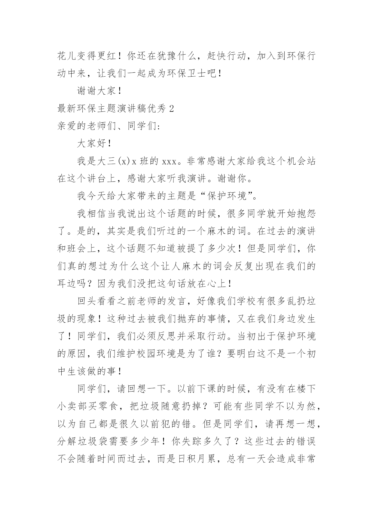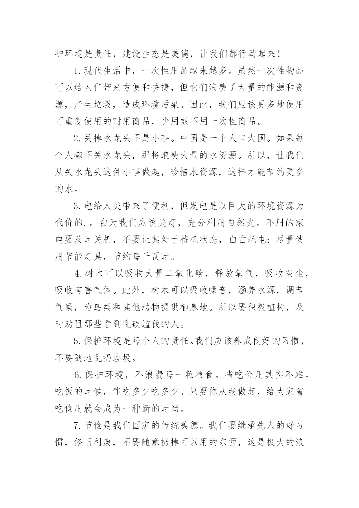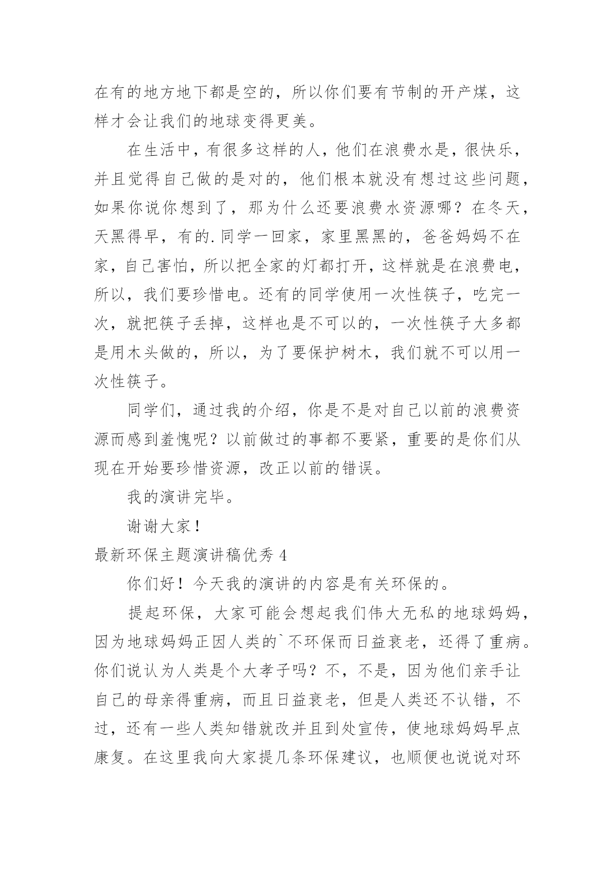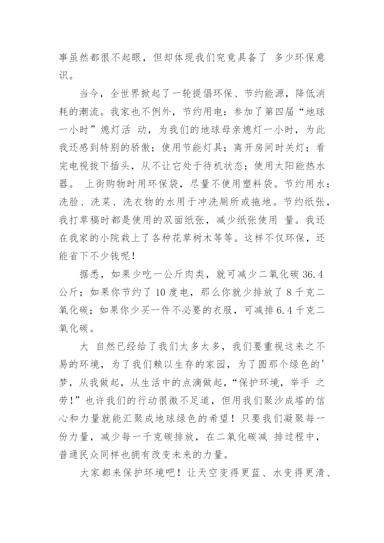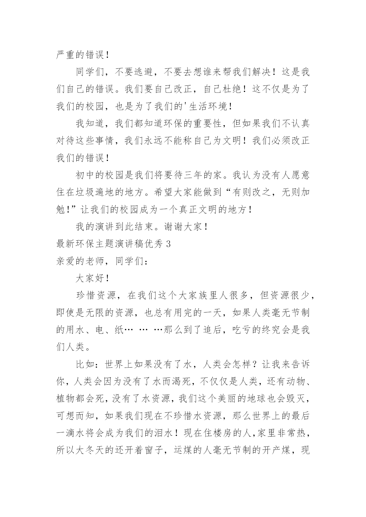 最新环保主题演讲稿优秀最新环保主题演讲稿优秀演讲稿具有逻辑严密,态度明确,观点鲜明的特点。在现在的社会生活中,我们可以使用演讲稿的机会越来越多,相信很多朋友都对写演讲稿感到非常苦恼吧,下面是小编精心整理的最新环保主题演讲稿优秀,希望能够帮助到大家。最新环保主题演讲稿优秀1尊敬的老师,亲爱的同学们,大家好!生态失去平衡,水资源、大气等的污染又造成了全球气候变暖。气候变化是当今全球面临的重大挑战。遏制气候变暖,拯救地球家园,是全人类共同的使命。每个国家和民族、个人,都应当责无旁贷地行动起来!使人与自然能和谐相处。关注生态环境不单是为了保护地球,也是为了维护人类自身的健康和地球上各种生物之间的生态平衡。保护能源,倡导环保,已是迫在眉睫大事,必须从我做起,节约用水、电等,为共同创建我们的美好家园而努力。但是真正做到自觉长久地保护环境,保护资源,还有许多事在等待着我们去做。作为生活中的每一个普通人,虽然不可能都直接从事环保工作,但我们完全可以从身边点滴做起。当看到洗手间的水龙头在滴水时,是不是能够举手关上呢?当购物时能否自觉使用环保袋呢?……一件件小事虽然都很不起眼,但却体现我们究竟具备了多少环保意识。当今,全世界掀起了一轮提倡环保、节约能源,降低消耗的潮流。我家也不例外,节约用电:参加了第四届“地球一小时”熄灯活动,为我们的地球母亲熄灯一小时,为此我还感到特别的骄傲;使用节能灯具;离开房间时关灯;看完电视拔下插头,从不让它处于待机状态;使用太阳能热水器。上街购物时用环保袋,尽量不使用塑料袋。节约用水:洗脸、洗菜、洗衣物的水用于冲洗厕所或拖地。节约纸张,我打草稿时都是使用的双面纸张,减少纸张使用量。我还在我家的小院栽上了各种花草树木等等。这样不仅环保,还能省下不少钱呢!据悉,如果少吃一公斤肉类,就可减少二氧化碳36.4公斤;如果你节约了10度电,那么你就少排放了8千克二氧化碳;如果你少买一件不必要的衣服,可减排6.4千克二氧化碳。大自然已经给了我们太多太多,我们要重视这来之不易的环境,为了我们赖以生存的家园,为了圆那个绿色的'梦,从我做起,从生活中的点滴做起,“保护环境,举手之劳!”也许我们的行动很微不足道,但用我们聚沙成塔的信心和力量就能汇聚成地球绿色的希望!只要我们凝聚每一份力量,减少每一千克碳排放,在二氧化碳减排过程中,普通民众同样也拥有改变未来的力量。大家都来保护环境吧!让天空变得更蓝、水变得更清、花儿变得更红!你还在犹豫什么,赶快行动,加入到环保行动中来,让我们一起成为环保卫士吧!谢谢大家!最新环保主题演讲稿优秀2亲爱的老师们、同学们:大家好!我是大三(x)x班的xxx。非常感谢大家给我这个机会站在这个讲台上,感谢大家听我演讲。谢谢你。我今天给大家带来的主题是“保护环境”。我相信当我说出这个话题的时候,很多同学就开始抱怨了。是的,其实是我们听过的一个麻木的词。在过去的演讲和班会上,这个话题不知道被提了多少次!但是同学们,你们真的想过为什么这个让人麻木的词会反复出现在我们的耳边吗?因为我们没把这句话放在心上!回头看看之前老师的发言,好像我们学校有很多乱扔垃圾的现象!这种过去被我们抛弃的事情,又在我们身边发生了!同学们,我们必须反思并采取行动。当初出于保护环境的原因,我们维护校园环境是为了谁?要明白这不是一个初中生该做的事!同学们,请回想一下。以前下课的时候,有没有在楼下小卖部买零食,把垃圾随意扔掉?可能有些同学不以为然,以为自己都是很久以前犯的错。但是同学们,请再想一想,分解垃圾袋需要多少年!你失踪多久了?这些过去的错误不会随着时间而过去,而是日积月累,总有一天会造成非常严重的错误!同学们,不要逃避,不要去想谁来帮我们解决!这是我们自己的错误。我们要自己改正,自己杜绝!这不仅是为了我们的校园,也是为了我们的'生活环境!我知道,我们都知道环保的重要性,但如果我们不认真对待这些事情,我们永远不能称自己为文明!我们必须改正我们的错误!初中的校园是我们将要待三年的家。我认为没有人愿意住在垃圾遍地的地方。希望大家能做到“有则改之,无则加勉!”让我们的校园成为一个真正文明的地方!我的演讲到此结束。谢谢大家!最新环保主题演讲稿优秀3亲爱的老师,同学们:大家好!珍惜资源,在我们这个大家族里人很多,但资源很少,即使是无限的资源,也总有用完的一天,如果人类毫无节制的用水、电、纸………那么到了追后,吃亏的终究会是我们人类。比如:世界上如果没有了水,人类会怎样?让我来告诉你,人类会因为没有了水而渴死,不仅仅是人类,还有动物、植物都会死,没有了水资源,我们这个美丽的地球也会毁灭,可想而知,如果我们现在不珍惜水资源,那么世界上的最后一滴水将会成为我们的泪水!现在住楼房的人,家里非常热,所以大冬天的还开着窗子,运煤的人毫无节制的开产煤,现在有的地方地下都