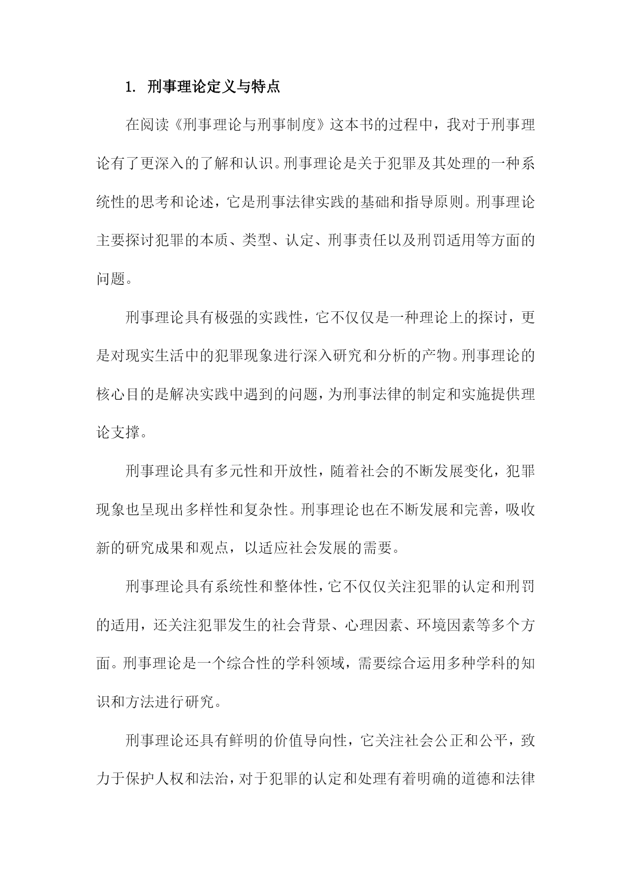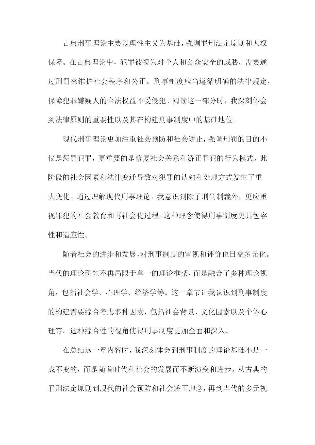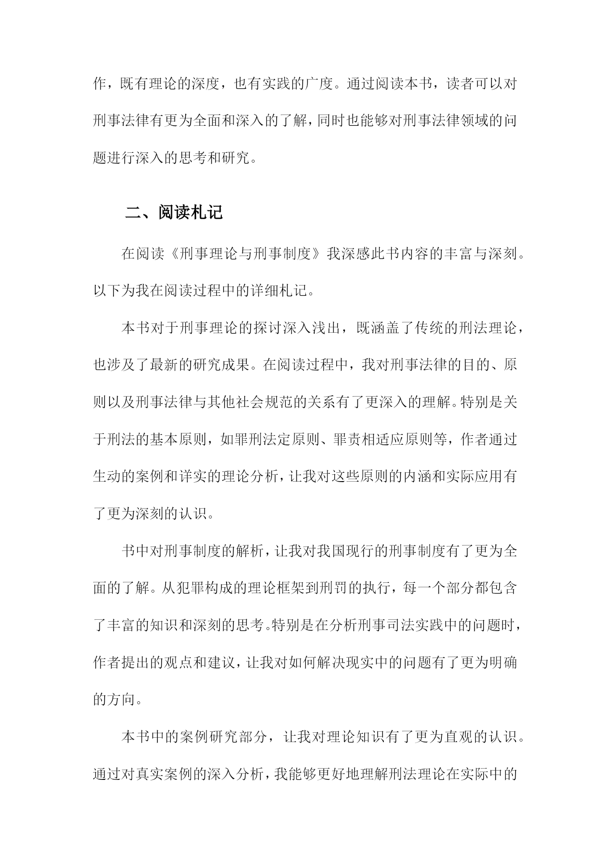 《刑事理论与刑事制度》读书札记一、关于本书的简介《刑事理论与刑事制度》是一部深入探索和研究刑事法律领域的学术著作。本书既涵盖了刑事理论的基础概念,又详细解读了刑事制度的实际操作。通过对刑事法律体系的全面梳理,本书旨在帮助读者深入理解刑事法律的本质、目的和功能,以及与之相关的理论和实践问题。本书首先对刑事理论进行了系统的介绍和阐述,它探讨了刑事法律的核心概念,如犯罪、刑罚、刑事责任等,并对这些概念的历史演变和理论争议进行了深入的剖析。本书还从多个角度对刑事法律的目的进行了探讨,包括惩罚、预防、改造和教育等,展示了刑事法律在维护社会秩序和保护公民权利之间的平衡。在介绍刑事制度方面,本书详细阐述了刑事制度的实际操作流程,包括侦查、起诉、审判和执行等环节。通过对每个环节的具体分析,本书揭示了刑事制度在实践中的运作机制和存在的问题。本书还关注了一些重要的刑事制度问题,如程序公正、证据规则、量刑原则等,展示了刑事制度在保障人权和实现社会公正方面的作用。《刑事理论与刑事制度》是一部深入研究刑事法律领域的学术著作,既有理论的深度,也有实践的广度。通过阅读本书,读者可以对刑事法律有更为全面和深入的了解,同时也能够对刑事法律领域的问题进行深入的思考和研究。二、阅读札记在阅读《刑事理论与刑事制度》我深感此书内容的丰富与深刻。以下为我在阅读过程中的详细札记。本书对于刑事理论的探讨深入浅出,既涵盖了传统的刑法理论,也涉及了最新的研究成果。在阅读过程中,我对刑事法律的目的、原则以及刑事法律与其他社会规范的关系有了更深入的理解。特别是关于刑法的基本原则,如罪刑法定原则、罪责相适应原则等,作者通过生动的案例和详实的理论分析,让我对这些原则的内涵和实际应用有了更为深刻的认识。书中对刑事制度的解析,让我对我国现行的刑事制度有了更为全面的了解。从犯罪构成的理论框架到刑罚的执行,每一个部分都包含了丰富的知识和深刻的思考。特别是在分析刑事司法实践中的问题时,作者提出的观点和建议,让我对如何解决现实中的问题有了更为明确的方向。本书中的案例研究部分,让我对理论知识有了更为直观的认识。通过对真实案例的深入分析,我能够更好地理解刑法理论在实际中的应用。这些案例不仅让我对法律知识有了更深的理解,也让我对社会现实有了更多的思考。让我深受启发,作者在书中对刑事理论与刑事制度的分析,让我对法律有了更为深刻的认识。书中的观点也引发了我对现实问题的思考,在阅读过程中,我不断思考如何运用法律知识解决实际问题,如何更好地理解和应用刑事理论。阅读《刑事理论与刑事制度》让我受益匪浅。这本书不仅让我对刑事理论和刑事制度有了更深入的认识,也让我对法律和社会现实有了更多的思考。这本书将会对我未来的学习和工作产生深远的影响。第一章:刑事理论概述在探讨刑事领域的相关问题之前,我们首先需要对刑事理论有一个基本的了解。本章的主旨在于对刑事理论进行概述,为后续深入研究刑事制度及其实践奠定基础。通过阅读本章,我对刑事理论有了更深入的认识,现将所学内容整理如下。刑事理论是研究和探讨刑事现象、刑事规范、刑事责任以及刑事活动规律的科学。它涉及犯罪的定义、分类、原因,刑事法律的制定和实施,以及刑事司法实践中的一系列问题。刑事理论是对刑事领域一系列问题的系统思考和总结。刑事理论的发展历史悠久,随着社会的进步和法治的发展,其内容和形式也在不断变化。从古代的刑罚理论到现代的刑事法治理论,刑事理论不断适应时代的需求,不断完善和发展。本章详细介绍了刑事理论的发展历程,包括各个时期的特点和主要理论观点。本章对刑事理论的主要内容进行了系统的介绍,包括犯罪论、刑罚论、刑事责任论等。犯罪论主要探讨犯罪的定义、分类和构成;刑罚论则主要研究刑罚的目的、种类和适用;刑事责任论则涉及刑事责任的本质、认定和承担方式等问题。这些内容是刑事理论的核心,也是研究刑事制度和实践的基础。刑事理论与刑事制度密切相关,相互影响。刑事理论为刑事制度的建立和发展提供指导,而刑事制度的实践又反过来丰富和发展了刑事理论。本章通过阐述两者之间的关系,为我们后续深入研究刑事制度指明了方向。通过本章的学习,我对刑事理论有了更为全面和深入的了解。刑事理论不仅是研究刑事领域问题的科学,更是指导我们理解和处理现实生活中的刑事案件的重要工具。我也意识到,要真正理解和掌握刑事理论,需要不断地学习和实践,需要不断地思考和总结。在接下来的学习中,我将继续深入研究刑事制度及其实践,以期将所学的刑事理论知识运用到实践中,更好地理解和处理刑事案件,为维护法治和社会公正做出贡献。1.刑事理论定义与特点在阅读《刑事理论与刑事制度》这本书的过程中,我对于刑事理论有了更深入的了解和认识。刑事理论是关于犯罪及其处理的一种系统性的思考和论述,它是刑事法律实践的基础