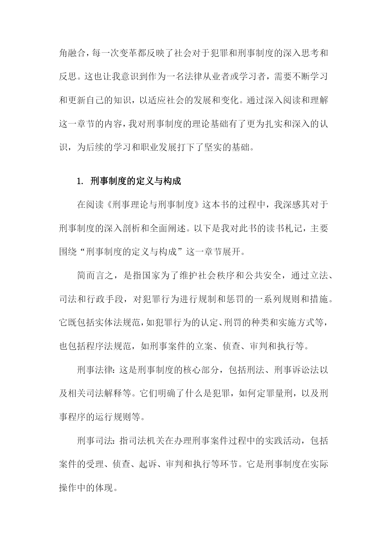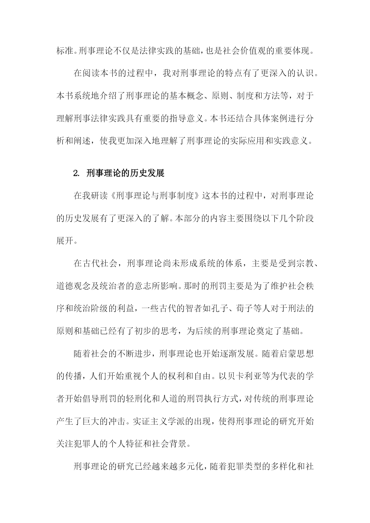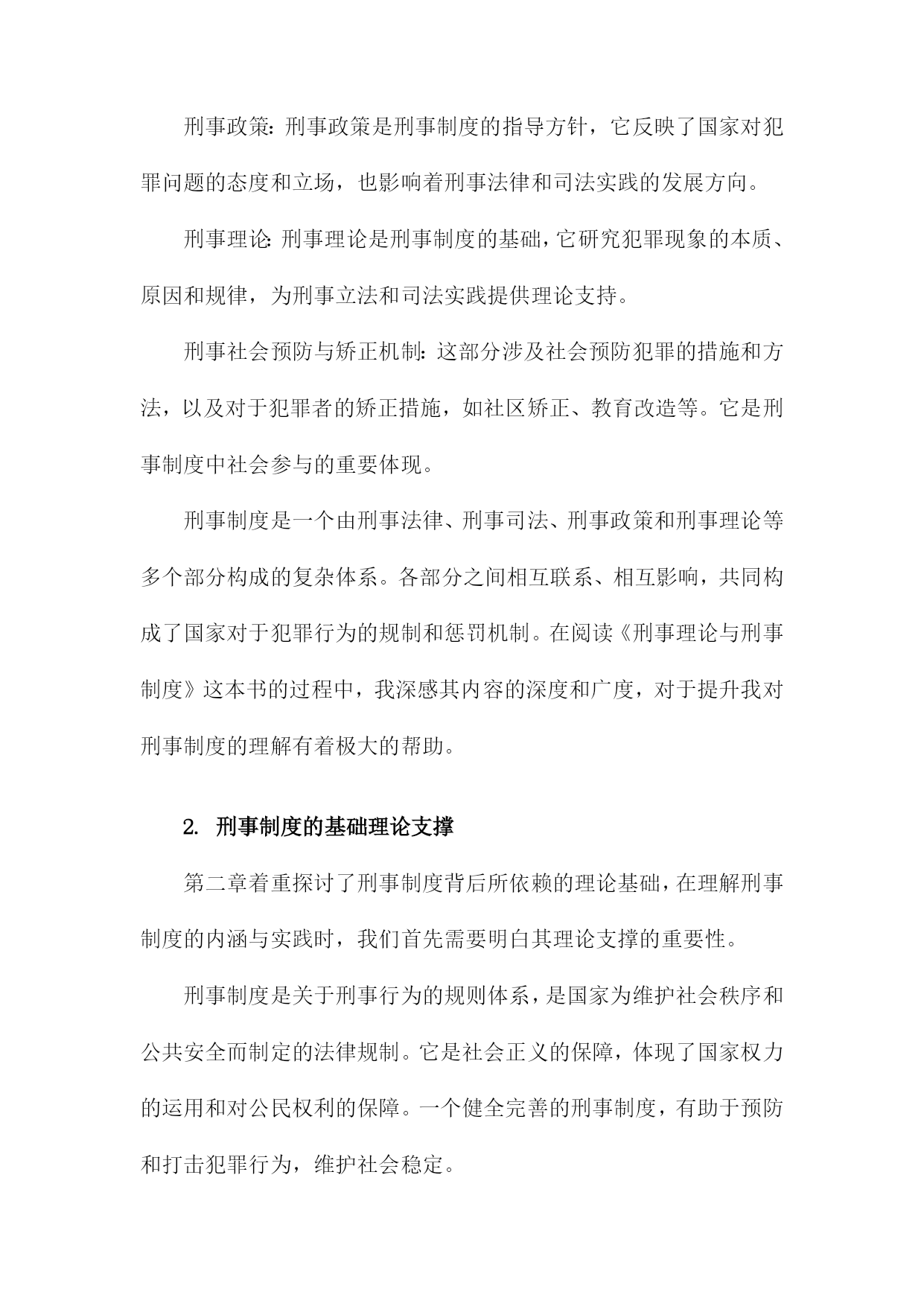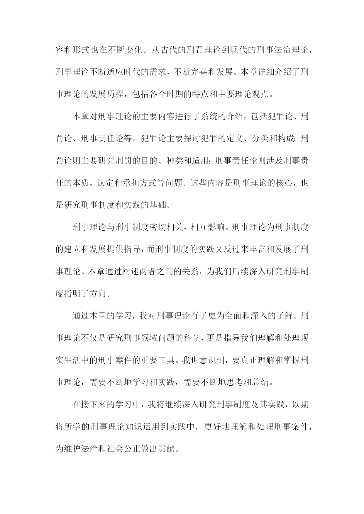 《刑事理论与刑事制度》读书札记一、关于本书的简介《刑事理论与刑事制度》是一部深入探索和研究刑事法律领域的学术著作。本书既涵盖了刑事理论的基础概念,又详细解读了刑事制度的实际操作。通过对刑事法律体系的全面梳理,本书旨在帮助读者深入理解刑事法律的本质、目的和功能,以及与之相关的理论和实践问题。本书首先对刑事理论进行了系统的介绍和阐述,它探讨了刑事法律的核心概念,如犯罪、刑罚、刑事责任等,并对这些概念的历史演变和理论争议进行了深入的剖析。本书还从多个角度对刑事法律的目的进行了探讨,包括惩罚、预防、改造和教育等,展示了刑事法律在维护社会秩序和保护公民权利之间的平衡。在介绍刑事制度方面,本书详细阐述了刑事制度的实际操作流程,包括侦查、起诉、审判和执行等环节。通过对每个环节的具体分析,本书揭示了刑事制度在实践中的运作机制和存在的问题。本书还关注了一些重要的刑事制度问题,如程序公正、证据规则、量刑原则等,展示了刑事制度在保障人权和实现社会公正方面的作用。《刑事理论与刑事制度》是一部深入研究刑事法律领域的学术著作,既有理论的深度,也有实践的广度。通过阅读本书,读者可以对刑事法律有更为全面和深入的了解,同时也能够对刑事法律领域的问题进行深入的思考和研究。二、阅读札记在阅读《刑事理论与刑事制度》我深感此书内容的丰富与深刻。以下为我在阅读过程中的详细札记。本书对于刑事理论的探讨深入浅出,既涵盖了传统的刑法理论,也涉及了最新的研究成果。在阅读过程中,我对刑事法律的目的、原则以及刑事法律与其他社会规范的关系有了更深入的理解。特别是关于刑法的基本原则,如罪刑法定原则、罪责相适应原则等,作者通过生动的案例和详实的理论分析,让我对这些原则的内涵和实际应用有了更为深刻的认识。书中对刑事制度的解析,让我对我国现行的刑事制度有了更为全面的了解。从犯罪构成的理论框架到刑罚的执行,每一个部分都包含了丰富的知识和深刻的思考。特别是在分析刑事司法实践中的问题时,作者提出的观点和建议,让我对如何解决现实中的问题有了更为明确的方向。本书中的案例研究部分,让我对理论知识有了更为直观的认识。通过对真实案例的深入分析,我能够更好地理解刑法理论在实际中的应用。这些案例不仅让我对法律知识有了更深的理解,也让我对社会现实有了更多的思考。让我深受启发,作者在书中对刑事理论与刑事制度的分析,让我对法律有了更为深刻的认识。书中的观点也引发了我对现实问题的思考,在阅读过程中,我不断思考如何运用法律知识解决实际问题,如何更好地理解和应用刑事理论。阅读《刑事理论与刑事制度》让我受益匪浅。这本书不仅让我对刑事理论和刑事制度有了更深入的认识,也让我对法律和社会现实有了更多的思考。这本书将会对我未来的学习和工作产生深远的影响。第一章:刑事理论概述在探讨刑事领域的相关问题之前,我们首先需要对刑事理论有一个基本的了解。本章的主旨在于对刑事理论进行概述,为后续深入研究刑事制度及其实践奠定基础。通过阅读本章,我对刑事理论有了更深入的认识,现将所学内容整理如下。刑事理论是研究和探讨刑事现象、刑事规范、刑事责任以及刑事活动规律的科学。它涉及犯罪的定义、分类、原因,刑事法律的制定和实施,以及刑事司法实践中的一系列问题。刑事理论是对刑事领域一系列问题的系统思考和总结。刑事理论的发展历史悠久,随着社会的进步和法治的发展,其内容和形式也在不断变化。从古代的刑罚理论到现代的刑事法治理论,刑事理论不断适应时代的需求,不断完善和发展。本章详细介绍了刑事理论的发展历程,包括各个时期的特点和主要理论观点。本章对刑事理论的主要内容进行了系统的介绍,包括犯罪论、刑罚论、刑事责任论等。犯罪论主要探讨犯罪的定义、分类和构成;刑罚论则主要研究刑罚的目的、种类和适用;刑事责任论则涉及刑事责任的本质、认定和承担方式等问题。这些内容是刑事理论的核心,也是研究刑事制度和实践的基础。刑事理论与刑事制度密切相关,相互影响。刑事理论为刑事制度的建立和发展提供指导,而刑事制度的实践又反过来丰富和发展了刑事理论。本章通过阐述两者之间的关系,为我们后续深入研究刑事制度指明了方向。通过本章的学习,我对刑事理论有了更为全面和深入的了解。刑事理论不仅是研究刑事领域问题的科学,更是指导我们理解和处理现实生活中的刑事案件的重要工具。我也意识到,要真正理解和掌握刑事理论,需要不断地学习和实践,需要不断地思考和总结。在接下来的学习中,我将继续深入研究刑事制度及其实践,以期将所学的刑事理论知识运用到实践中,更好地理解和处理刑事案件,为维护法治和社会公正做出贡献。1.刑事理论定义与特点在阅读《刑事理论与刑事制度》这本书的过程中,我对于刑事理论有了更深入的了解和认识。刑事理论是关于犯罪及其处理的一种系统性的思考和论述,它是刑事法律实践的基础