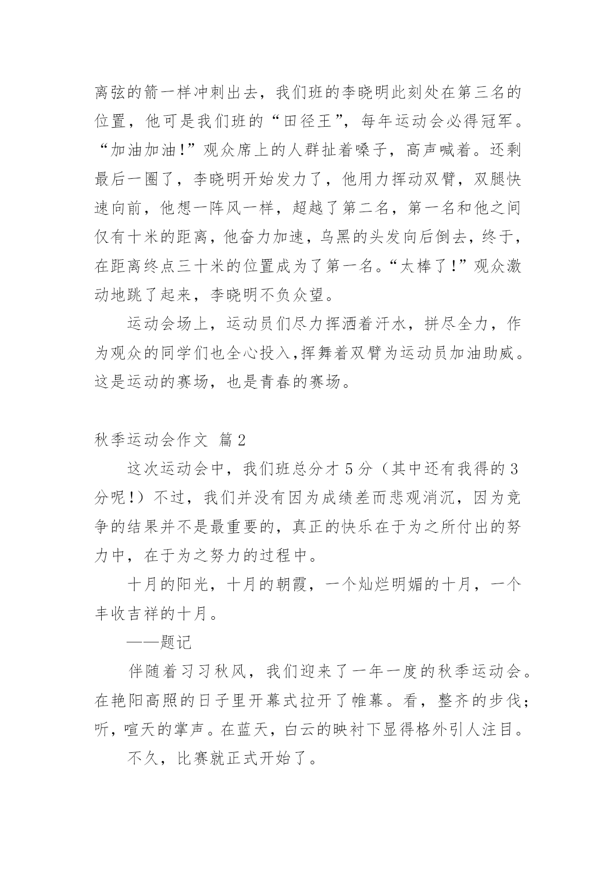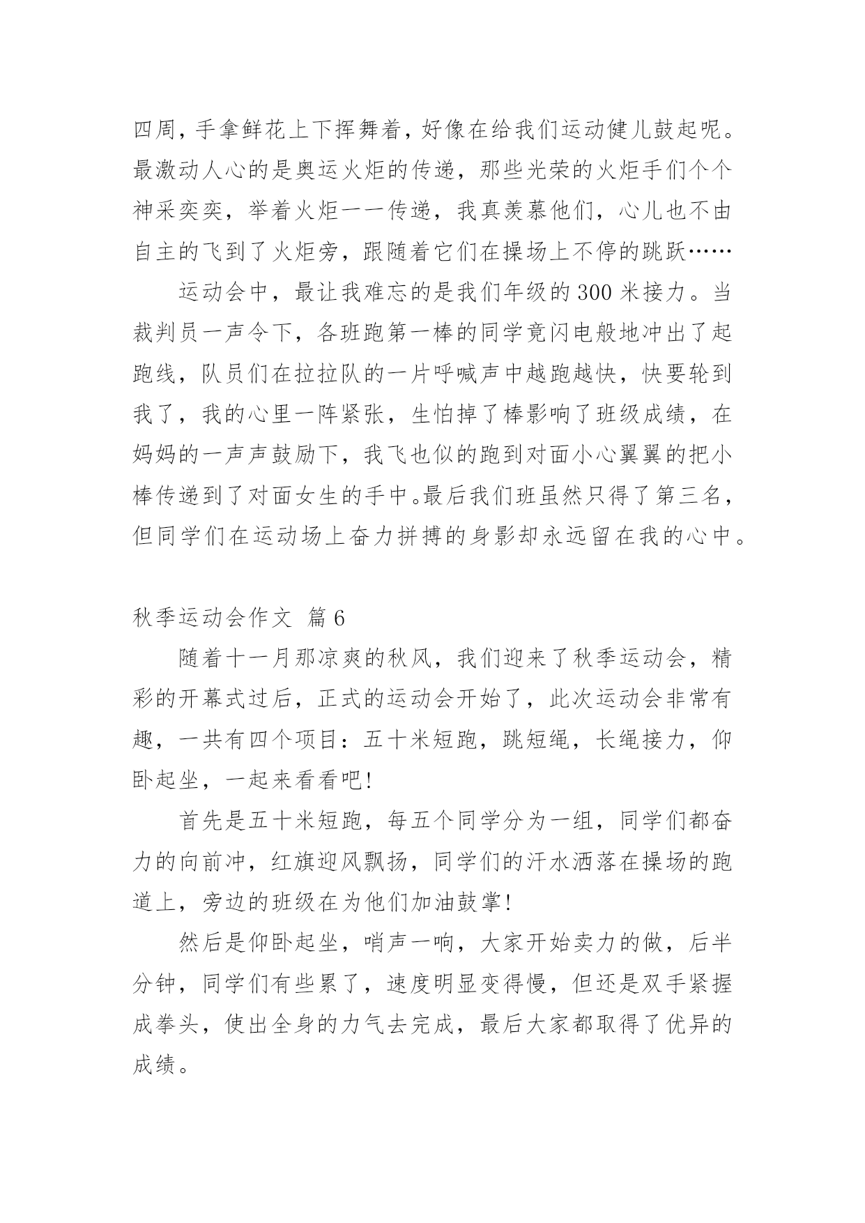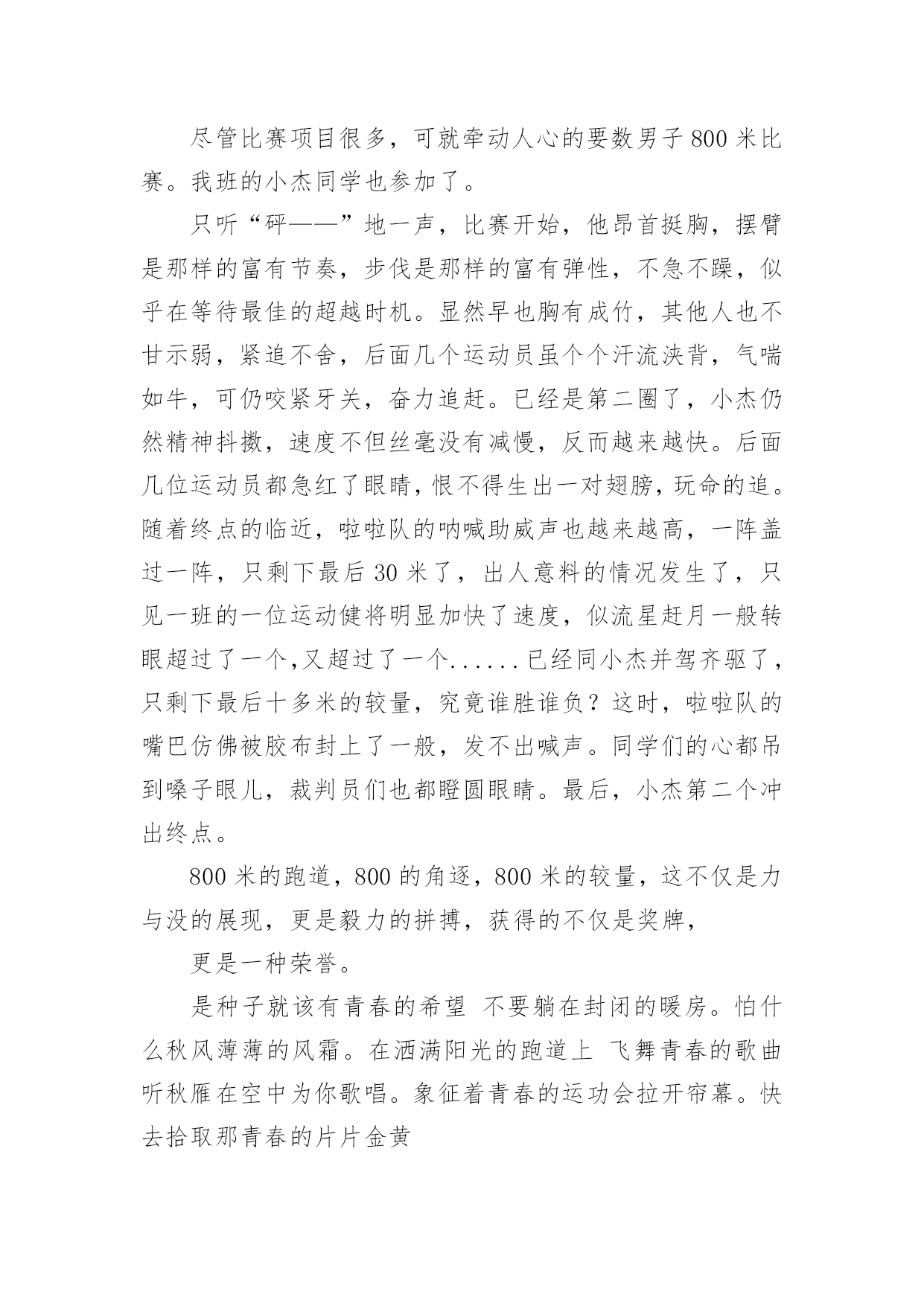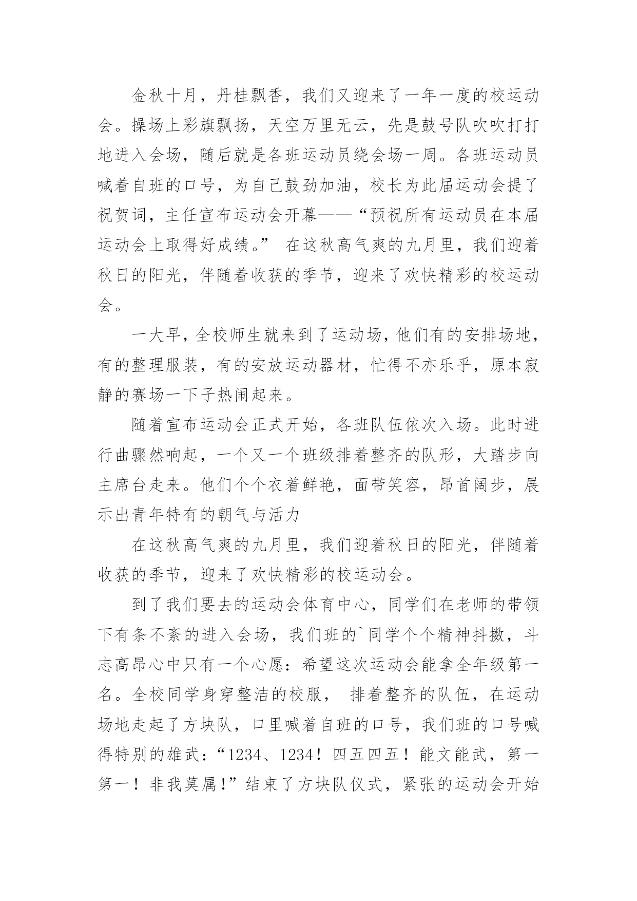 秋季运动会作文秋季运动会作文9篇在日常学习、工作和生活中,大家都不可避免地会接触到作文吧,借助作文人们可以反映客观事物、表达思想感情、传递知识信息。一篇什么样的作文才能称之为优秀作文呢?下面是小编收集整理的秋季运动会作文9篇,希望能够帮助到大家。秋季运动会作文篇1一年一度的秋季校园运动会又开始了,校园里到处彩旗飘扬,同学们洋溢着青春的笑脸,就连树上的秋叶也在哗哗作响,仿佛在为小运动员们鼓掌加油。操场上,呐喊声此起彼伏,有些同学坐在观众席上,伸直了脖子,眼睛盯着赛场,不时发出一阵欢呼,有些同学则机动地站了起来,趴在栏杆处,高声叫喊着,远比自己比赛还要激动欣喜。操场的东面正在进行着跳远比赛,只见跳远选手挥动着双臂,半蹲,跃起,落下,整个动作一气呵成。西面正在进行的是跳高比赛,只见一位运动员向前直冲,一跃而起,像一只轻盈的鸟儿张开双臂。正前方田径赛道上运动员们一个个做着准备姿势,一旁的观众屏气凝神,眼睛直直地盯着发令枪。“准备——”随后一声发令枪响,运动员们一个个像离弦的箭一样冲刺出去,我们班的李晓明此刻处在第三名的位置,他可是我们班的“田径王”,每年运动会必得冠军。“加油加油!”观众席上的人群扯着嗓子,高声喊着。还剩最后一圈了,李晓明开始发力了,他用力挥动双臂,双腿快速向前,他想一阵风一样,超越了第二名,第一名和他之间仅有十米的距离,他奋力加速,乌黑的头发向后倒去,终于,在距离终点三十米的位置成为了第一名。“太棒了!”观众激动地跳了起来,李晓明不负众望。运动会场上,运动员们尽力挥洒着汗水,拼尽全力,作为观众的同学们也全心投入,挥舞着双臂为运动员加油助威。这是运动的赛场,也是青春的赛场。秋季运动会作文篇2这次运动会中,我们班总分才5分(其中还有我得的3分呢!)不过,我们并没有因为成绩差而悲观消沉,因为竞争的结果并不是最重要的,真正的快乐在于为之所付出的努力中,在于为之努力的过程中。十月的阳光,十月的朝霞,一个灿烂明媚的十月,一个丰收吉祥的十月。——题记伴随着习习秋风,我们迎来了一年一度的秋季运动会。在艳阳高照的日子里开幕式拉开了帷幕。看,整齐的步伐;听,喧天的掌声。在蓝天,白云的映衬下显得格外引人注目。不久,比赛就正式开始了。尽管比赛项目很多,可就牵动人心的要数男子800米比赛。我班的小杰同学也参加了。只听“砰——”地一声,比赛开始,他昂首挺胸,摆臂是那样的富有节奏,步伐是那样的富有弹性,不急不躁,似乎在等待最佳的超越时机。显然早也胸有成竹,其他人也不甘示弱,紧追不舍,后面几个运动员虽个个汗流浃背,气喘如牛,可仍咬紧牙关,奋力追赶。已经是第二圈了,小杰仍然精神抖擞,速度不但丝毫没有减慢,反而越来越快。后面几位运动员都急红了眼睛,恨不得生出一对翅膀,玩命的追。随着终点的临近,啦啦队的呐喊助威声也越来越高,一阵盖过一阵,只剩下最后30米了,出人意料的情况发生了,只见一班的一位运动健将明显加快了速度,似流星赶月一般转眼超过了一个,又超过了一个......已经同小杰并驾齐驱了,只剩下最后十多米的较量,究竟谁胜谁负?这时,啦啦队的嘴巴仿佛被胶布封上了一般,发不出喊声。同学们的心都吊到嗓子眼儿,裁判员们也都瞪圆眼睛。最后,小杰第二个冲出终点。800米的跑道,800的角逐,800米的较量,这不仅是力与没的展现,更是毅力的拼搏,获得的不仅是奖牌,更是一种荣誉。是种子就该有青春的希望不要躺在封闭的暖房。怕什么秋风薄薄的风霜。在洒满阳光的跑道上飞舞青春的歌曲听秋雁在空中为你歌唱。象征着青春的运功会拉开帘幕。快去拾取那青春的片片金黄金秋十月,丹桂飘香,我们又迎来了一年一度的校运动会。操场上彩旗飘扬,天空万里无云,先是鼓号队吹吹打打地进入会场,随后就是各班运动员绕会场一周。各班运动员喊着自班的口号,为自己鼓劲加油,校长为此届运动会提了祝贺词,主任宣布运动会开幕——“预祝所有运动员在本届运动会上取得好成绩。”在这秋高气爽的九月里,我们迎着秋日的阳光,伴随着收获的季节,迎来了欢快精彩的校运动会。一大早,全校师生就来到了运动场,他们有的安排场地,有的整理服装,有的安放运动器材,忙得不亦乐乎,原本寂静的赛场一下子热闹起来。随着宣布运动会正式开始,各班队伍依次入场。此时进行曲骤然响起,一个又一个班级排着整齐的队形,大踏步向主席台走来。他们个个衣着鲜艳,面带笑容,昂首阔步,展示出青年特有的朝气与活力在这秋高气爽的九月里,我们迎着秋日的阳光,伴随着收获的季节,迎来了欢快精彩的校运动会。到了我们要去的运动会体育中心,同学们在老师的带领下有条不紊的进入会场,我们班的`同学个个精神抖擞,斗志高昂心中只有一个心愿:希望这次运动会能拿全年级第一名。全校同学身穿整洁的校服,排着整齐的队伍,在运动场地走起了方块队,口里喊着自班的口号,我们班的口号喊得特别的雄武:“1234、123