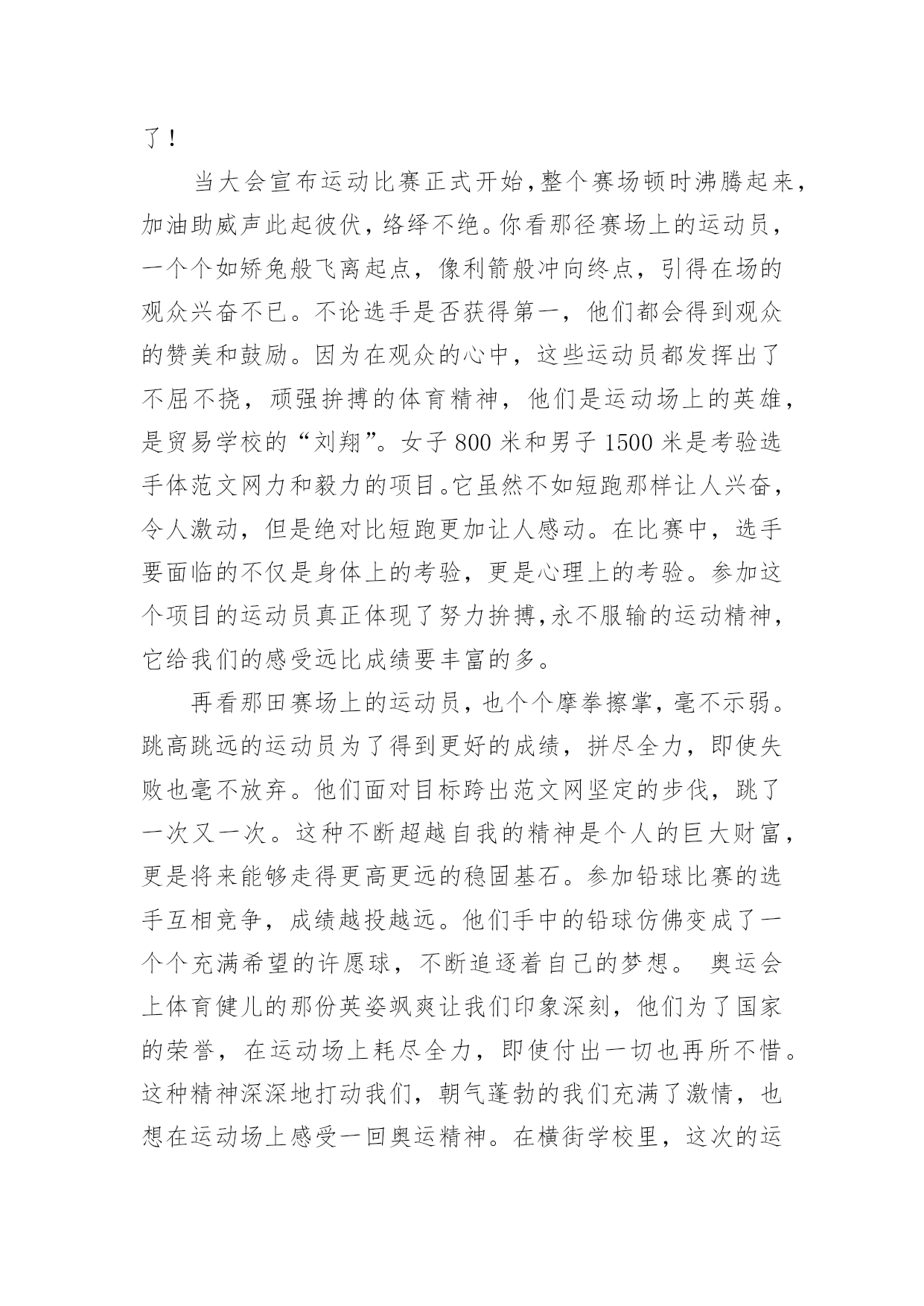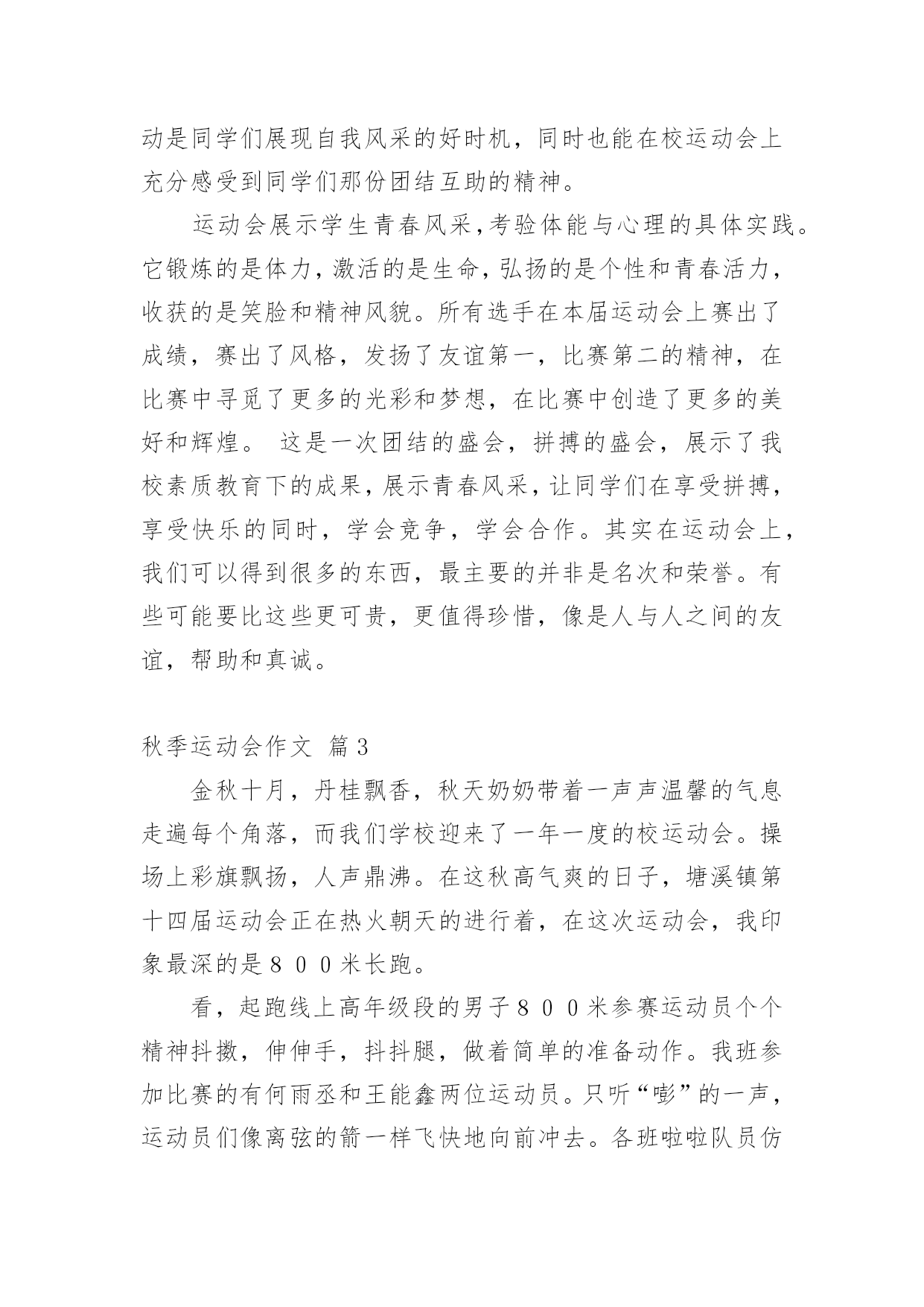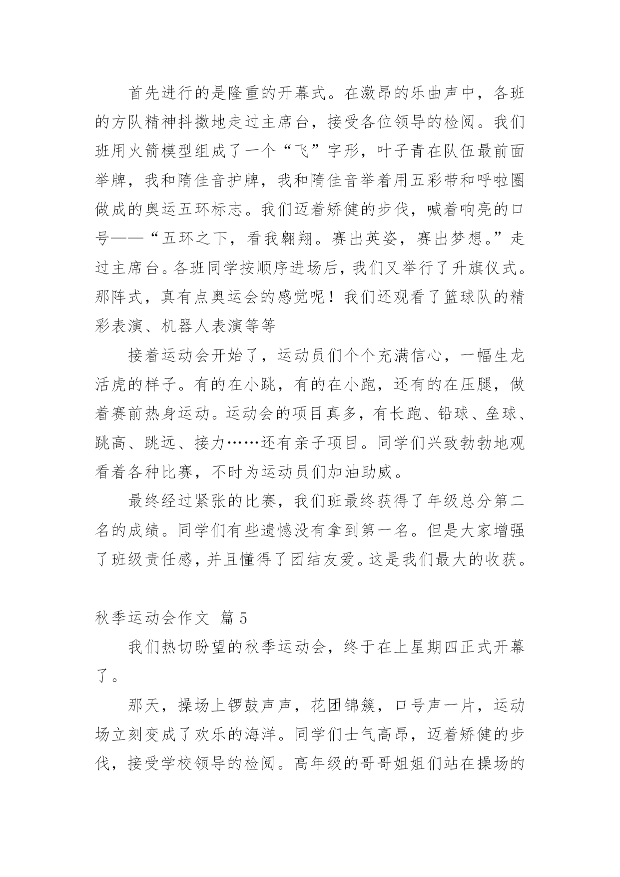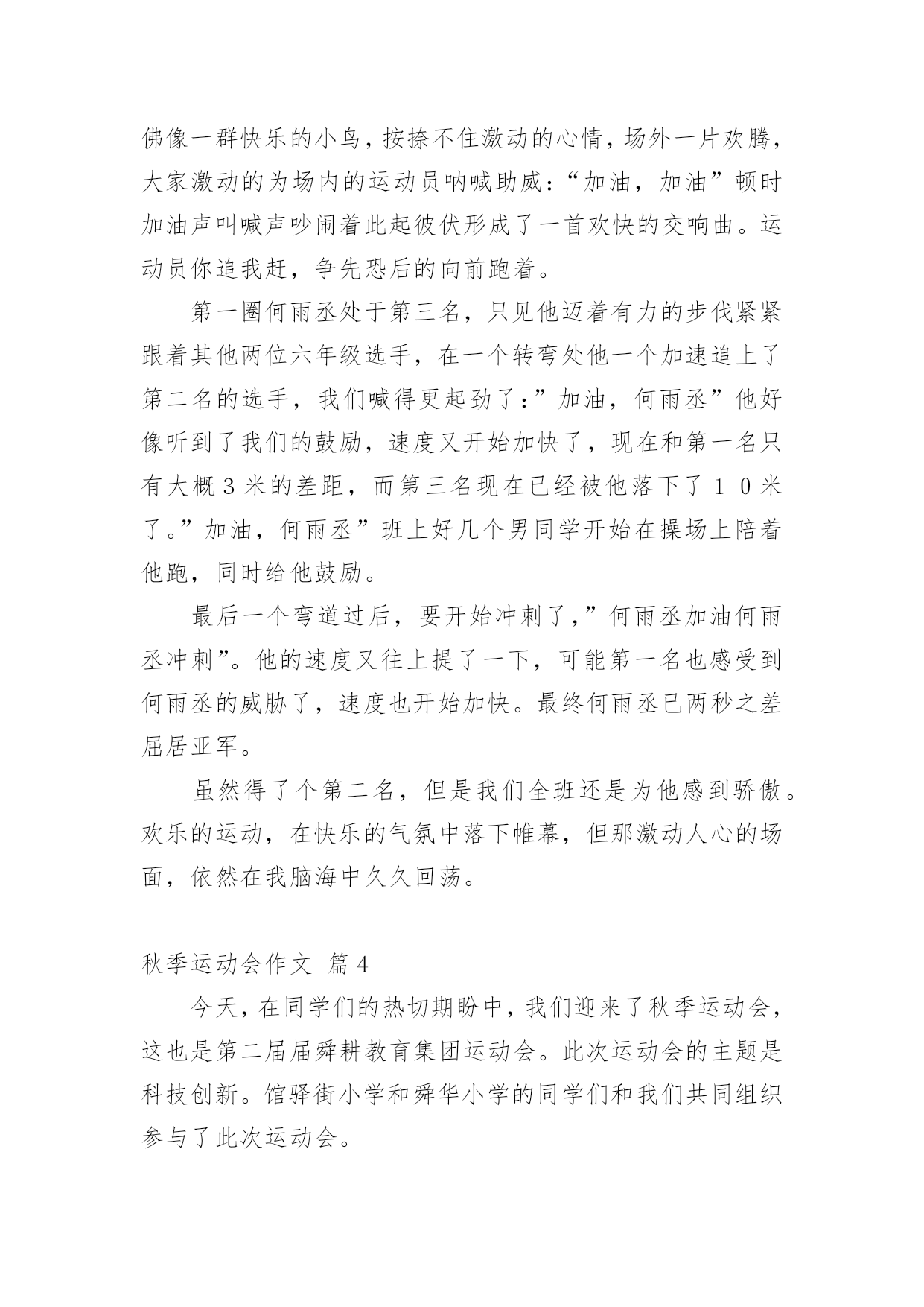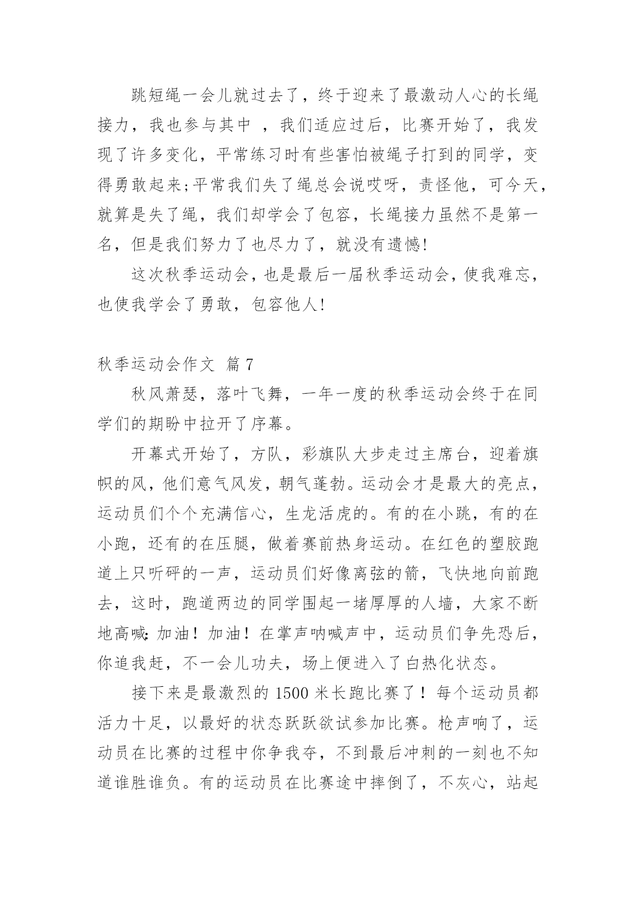 秋季运动会作文秋季运动会作文9篇在日常学习、工作和生活中,大家都不可避免地会接触到作文吧,借助作文人们可以反映客观事物、表达思想感情、传递知识信息。一篇什么样的作文才能称之为优秀作文呢?下面是小编收集整理的秋季运动会作文9篇,希望能够帮助到大家。秋季运动会作文篇1一年一度的秋季校园运动会又开始了,校园里到处彩旗飘扬,同学们洋溢着青春的笑脸,就连树上的秋叶也在哗哗作响,仿佛在为小运动员们鼓掌加油。操场上,呐喊声此起彼伏,有些同学坐在观众席上,伸直了脖子,眼睛盯着赛场,不时发出一阵欢呼,有些同学则机动地站了起来,趴在栏杆处,高声叫喊着,远比自己比赛还要激动欣喜。操场的东面正在进行着跳远比赛,只见跳远选手挥动着双臂,半蹲,跃起,落下,整个动作一气呵成。西面正在进行的是跳高比赛,只见一位运动员向前直冲,一跃而起,像一只轻盈的鸟儿张开双臂。正前方田径赛道上运动员们一个个做着准备姿势,一旁的观众屏气凝神,眼睛直直地盯着发令枪。“准备——”随后一声发令枪响,运动员们一个个像离弦的箭一样冲刺出去,我们班的李晓明此刻处在第三名的位置,他可是我们班的“田径王”,每年运动会必得冠军。“加油加油!”观众席上的人群扯着嗓子,高声喊着。还剩最后一圈了,李晓明开始发力了,他用力挥动双臂,双腿快速向前,他想一阵风一样,超越了第二名,第一名和他之间仅有十米的距离,他奋力加速,乌黑的头发向后倒去,终于,在距离终点三十米的位置成为了第一名。“太棒了!”观众激动地跳了起来,李晓明不负众望。运动会场上,运动员们尽力挥洒着汗水,拼尽全力,作为观众的同学们也全心投入,挥舞着双臂为运动员加油助威。这是运动的赛场,也是青春的赛场。秋季运动会作文篇2这次运动会中,我们班总分才5分(其中还有我得的3分呢!)不过,我们并没有因为成绩差而悲观消沉,因为竞争的结果并不是最重要的,真正的快乐在于为之所付出的努力中,在于为之努力的过程中。十月的阳光,十月的朝霞,一个灿烂明媚的十月,一个丰收吉祥的十月。——题记伴随着习习秋风,我们迎来了一年一度的秋季运动会。在艳阳高照的日子里开幕式拉开了帷幕。看,整齐的步伐;听,喧天的掌声。在蓝天,白云的映衬下显得格外引人注目。不久,比赛就正式开始了。尽管比赛项目很多,可就牵动人心的要数男子800米比赛。我班的小杰同学也参加了。只听“砰——”地一声,比赛开始,他昂首挺胸,摆臂是那样的富有节奏,步伐是那样的富有弹性,不急不躁,似乎在等待最佳的超越时机。显然早也胸有成竹,其他人也不甘示弱,紧追不舍,后面几个运动员虽个个汗流浃背,气喘如牛,可仍咬紧牙关,奋力追赶。已经是第二圈了,小杰仍然精神抖擞,速度不但丝毫没有减慢,反而越来越快。后面几位运动员都急红了眼睛,恨不得生出一对翅膀,玩命的追。随着终点的临近,啦啦队的呐喊助威声也越来越高,一阵盖过一阵,只剩下最后30米了,出人意料的情况发生了,只见一班的一位运动健将明显加快了速度,似流星赶月一般转眼超过了一个,又超过了一个......已经同小杰并驾齐驱了,只剩下最后十多米的较量,究竟谁胜谁负?这时,啦啦队的嘴巴仿佛被胶布封上了一般,发不出喊声。同学们的心都吊到嗓子眼儿,裁判员们也都瞪圆眼睛。最后,小杰第二个冲出终点。800米的跑道,800的角逐,800米的较量,这不仅是力与没的展现,更是毅力的拼搏,获得的不仅是奖牌,更是一种荣誉。是种子就该有青春的希望不要躺在封闭的暖房。怕什么秋风薄薄的风霜。在洒满阳光的跑道上飞舞青春的歌曲听秋雁在空中为你歌唱。象征着青春的运功会拉开帘幕。快去拾取那青春的片片金黄金秋十月,丹桂飘香,我们又迎来了一年一度的校运动会。操场上彩旗飘扬,天空万里无云,先是鼓号队吹吹打打地进入会场,随后就是各班运动员绕会场一周。各班运动员喊着自班的口号,为自己鼓劲加油,校长为此届运动会提了祝贺词,主任宣布运动会开幕——“预祝所有运动员在本届运动会上取得好成绩。”在这秋高气爽的九月里,我们迎着秋日的阳光,伴随着收获的季节,迎来了欢快精彩的校运动会。一大早,全校师生就来到了运动场,他们有的安排场地,有的整理服装,有的安放运动器材,忙得不亦乐乎,原本寂静的赛场一下子热闹起来。随着宣布运动会正式开始,各班队伍依次入场。此时进行曲骤然响起,一个又一个班级排着整齐的队形,大踏步向主席台走来。他们个个衣着鲜艳,面带笑容,昂首阔步,展示出青年特有的朝气与活力在这秋高气爽的九月里,我们迎着秋日的阳光,伴随着收获的季节,迎来了欢快精彩的校运动会。到了我们要去的运动会体育中心,同学们在老师的带领下有条不紊的进入会场,我们班的`同学个个精神抖擞,斗志高昂心中只有一个心愿:希望这次运动会能拿全年级第一名。全校同学身穿整洁的校服,排着整齐的队伍,在运动场地走起了方块队,口里喊着自班的口号,我们班的口号喊得特别的雄武:“1234、123