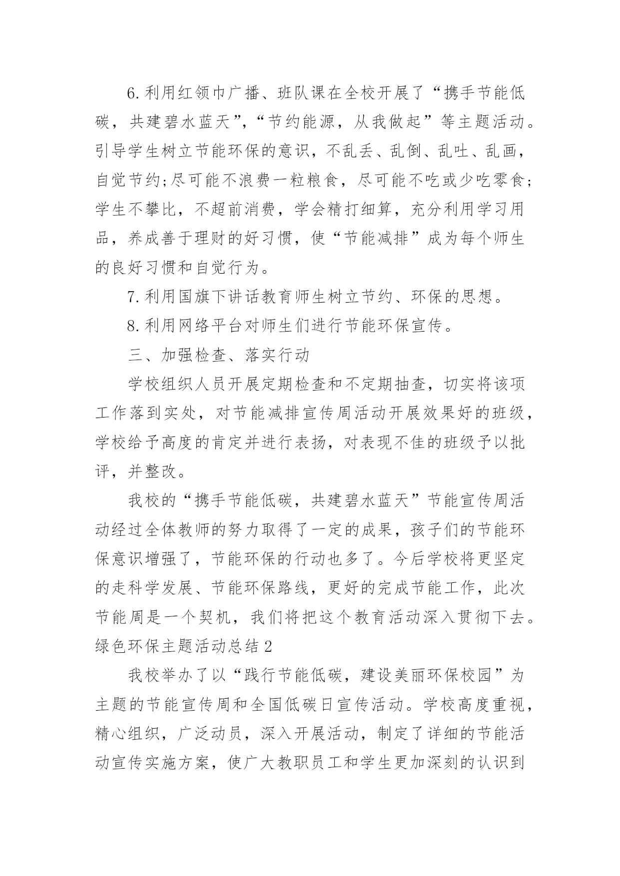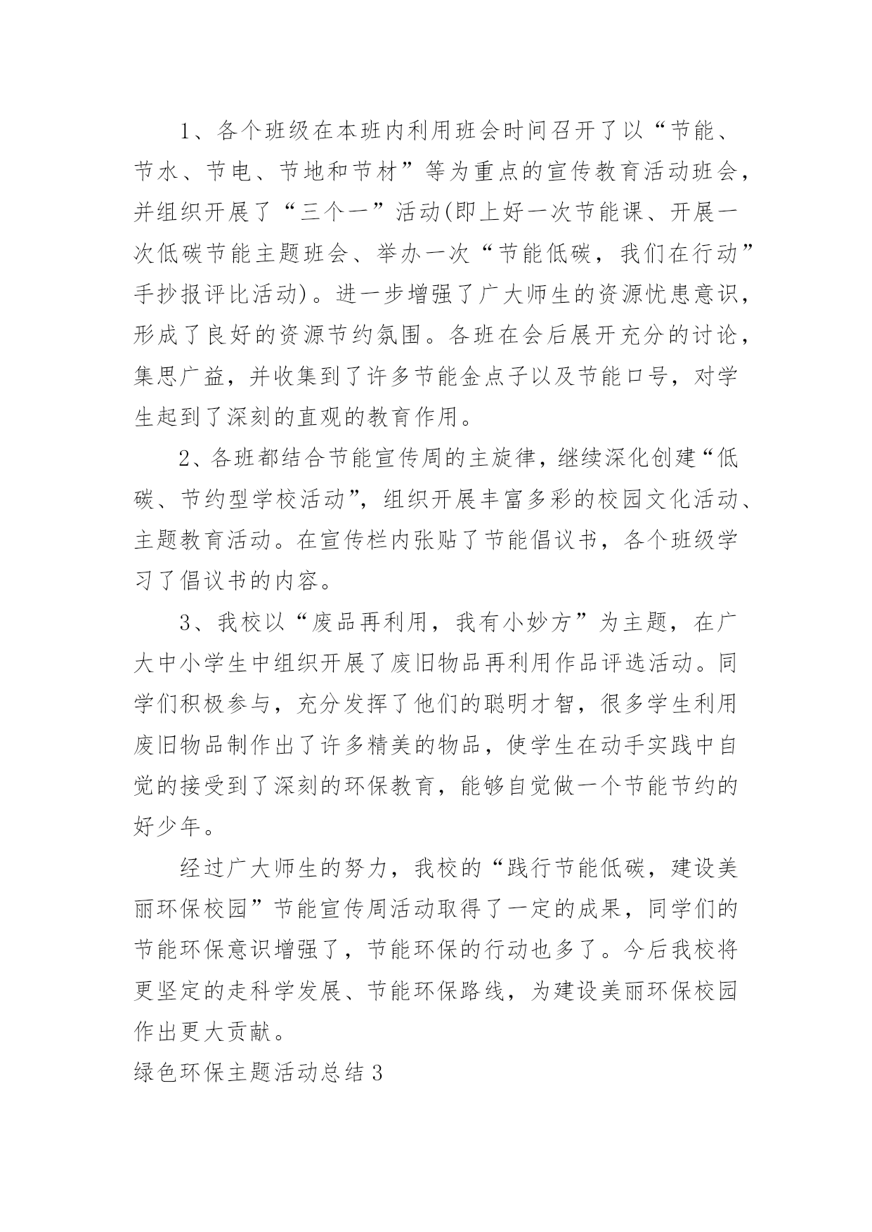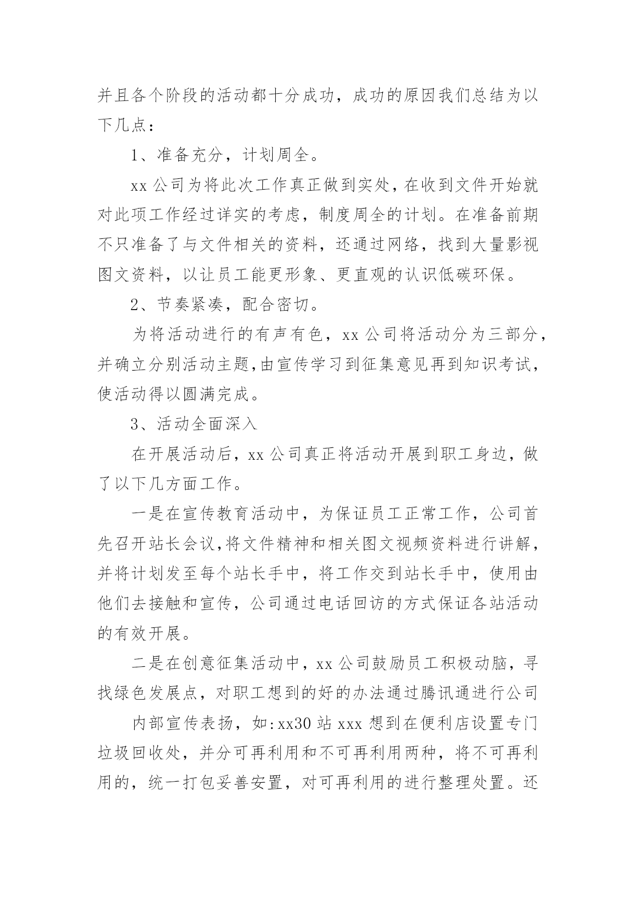 绿色环保主题活动总结绿色环保主题活动总结总结是对某一阶段的工作、学习或思想中的经验或情况进行分析研究的书面材料,它可以有效锻炼我们的语言组织能力,让我们好好写一份总结吧。总结怎么写才能发挥它的作用呢?以下是小编精心整理的绿色环保主题活动总结,供大家参考借鉴,希望可以帮助到有需要的朋友。绿色环保主题活动总结1为增强我校全体师生的生态文明观念,落实《关于做好全国节能宣传周和全国低碳日有关工作的通知》精神,根据教育系统在校园内开展节能宣传周活动的要求,我校开展了“携手节能低碳,共建碧水蓝天”节能宣传周活动,现将本次活动情况总结如下:一、思想重视、认真落实学校成立了由校长任组长,副校长任副组长,各部门负责人为组员的“节能减排”宣传工作领导小组。由政教处、少先队负责学校的节能减排工作的实施,检查节能减排宣传工作的落实。大家统一思想,以提高能源利用效率、减少污染物排放为核心,强化全校师生的节能环保意识,积极营造节约型校园。二、积极组织、有效开展学校围绕“携手节能低碳,共建碧水蓝天”的活动主题,坚持以科x为指导,以倡导节能的生活方式和消费模式为重点,开展“校园低碳行动”,广泛开展节能宣传教育活动,进一步认识节约能源、提高能效的重要性,培养节能意识,形成更加浓厚的节能减排氛围。1.学校针对自身特点,在学校教育教学中充实丰富节能、环保教育内容,将节能、节水、节粮、节材等教育内容,以灵活多样的形式,纳入学校教育活动中,真正落实节能环保进校园、进课堂。2.认真组织班主任、各办公室教师做好电灯、电器等在无人时关闭的工作。要求尽量多采用自然光;人走灯灭,离室关灯,避免“白昼灯”、“长明灯”;使用完计算机、打印机、复印机、饮水机等设备后,及时断电,减少待机损耗。3.要求全校教师尽量少用一次性纸杯,提倡自带水杯饮水。办公尽量使用网络,加快推进无纸化办公,尽量少用或不用打印,规定在打印内部工作文档时采用小四字体,纸张尽量双面打印,单面使用的留给下次重复使用等。4.鼓励全校师生节约用水,珍惜水资源,洗涮不用“长流水”,提倡使用脸盆洗手洗脸,洗涮不过量用水;合理循环使用自来水;爱护节水设施,关紧水龙头。自觉做到爱水、惜水、节水,严格做到人走水断流,严防跑冒滴漏,减少浪费。将节能减排工作充分落实在每一个细节。5.教导处根据实际情况在师生中开展教科书的循环使用工作,要求每位教师、学生认真保管自己的教科书、教材等,在学期结束统一上交图书室,循环使用,避免浪费。6.利用红领巾广播、班队课在全校开展了“携手节能低碳,共建碧水蓝天”,“节约能源,从我做起”等主题活动。引导学生树立节能环保的意识,不乱丢、乱倒、乱吐、乱画,自觉节约;尽可能不浪费一粒粮食,尽可能不吃或少吃零食;学生不攀比,不超前消费,学会精打细算,充分利用学习用品,养成善于理财的好习惯,使“节能减排”成为每个师生的良好习惯和自觉行为。7.利用国旗下讲话教育师生树立节约、环保的思想。8.利用网络平台对师生们进行节能环保宣传。三、加强检查、落实行动学校组织人员开展定期检查和不定期抽查,切实将该项工作落到实处,对节能减排宣传周活动开展效果好的班级,学校给予高度的肯定并进行表扬,对表现不佳的班级予以批评,并整改。我校的“携手节能低碳,共建碧水蓝天”节能宣传周活动经过全体教师的努力取得了一定的成果,孩子们的节能环保意识增强了,节能环保的行动也多了。今后学校将更坚定的走科学发展、节能环保路线,更好的完成节能工作,此次节能周是一个契机,我们将把这个教育活动深入贯彻下去。绿色环保主题活动总结2我校举办了以“践行节能低碳,建设美丽环保校园”为主题的节能宣传周和全国低碳日宣传活动。学校高度重视,精心组织,广泛动员,深入开展活动,制定了详细的节能活动宣传实施方案,使广大教职员工和学生更加深刻的认识到了做好节能工作的重要性,有效的培养了全体学生从小就养成勤俭节约的意识。在本次节能宣传周活动期间,我校对此次工作进行了统一的安排和要求,并把节能环保理念更加深入的纳入到学生的素质教育中,深入开展了当前我国国情和资源节约的宣传教育活动,进一步增强了广大师生的资源忧患意识。现将本次活动总结如下:一、高度重视,统筹安排节能宣传周的活动一开始,我校领导就高度重视,围绕“节能低碳,绿色发展”这一主题,做好宣传工作,制订周密的活动方案。首先,学校领导召开专题会议,围绕《“十二五”节能减排综合性工作方案》,对日常生活、工作提出节约用水、用电、用纸等要求。其次,召开全体教职工会议,布置“节约宣传周”的工作要求。制定完善方案落实责任到人,从制度上促进了节能工作的发展。二、大力宣传,增强意识为了切实提高宣传周活动实际效果,开展好各项活动,我校进行大力宣传“节能低碳,绿色发展”这一课题,为了增强师生的认识意识,我们利用学校的宣传展板作为宣传的突破口,以“节能