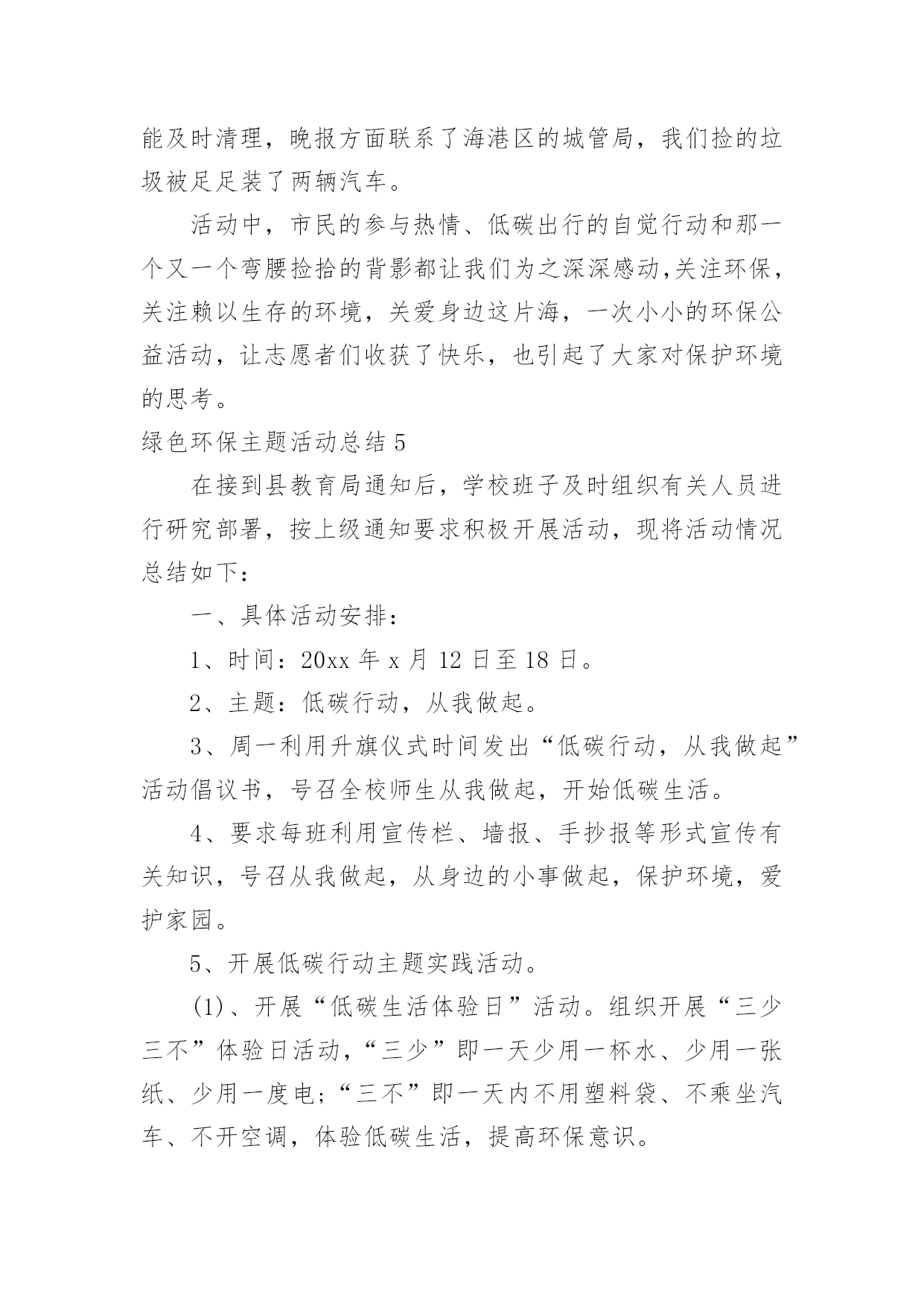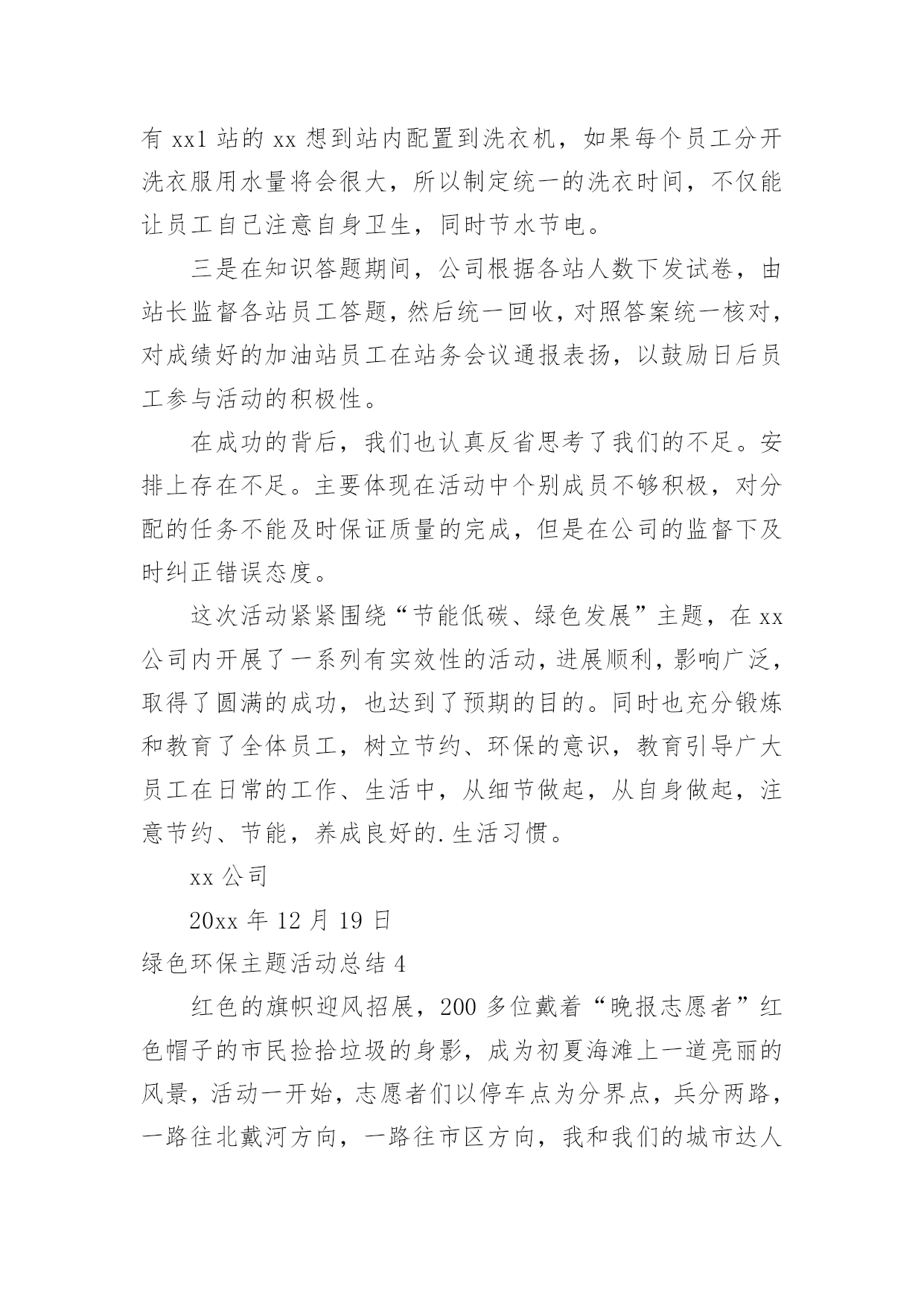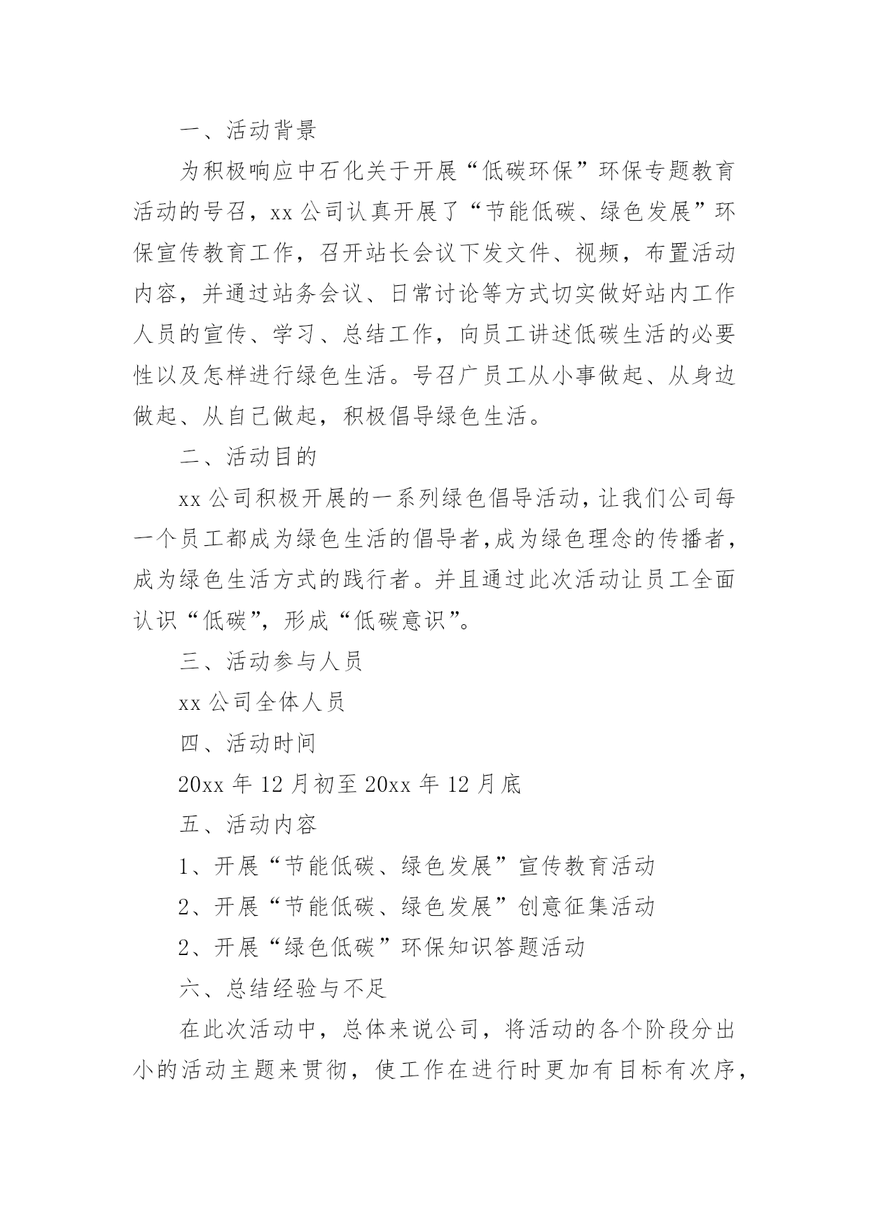 绿色环保主题活动总结绿色环保主题活动总结总结是对某一阶段的工作、学习或思想中的经验或情况进行分析研究的书面材料,它可以有效锻炼我们的语言组织能力,让我们好好写一份总结吧。总结怎么写才能发挥它的作用呢?以下是小编精心整理的绿色环保主题活动总结,供大家参考借鉴,希望可以帮助到有需要的朋友。绿色环保主题活动总结1为增强我校全体师生的生态文明观念,落实《关于做好全国节能宣传周和全国低碳日有关工作的通知》精神,根据教育系统在校园内开展节能宣传周活动的要求,我校开展了“携手节能低碳,共建碧水蓝天”节能宣传周活动,现将本次活动情况总结如下:一、思想重视、认真落实学校成立了由校长任组长,副校长任副组长,各部门负责人为组员的“节能减排”宣传工作领导小组。由政教处、少先队负责学校的节能减排工作的实施,检查节能减排宣传工作的落实。大家统一思想,以提高能源利用效率、减少污染物排放为核心,强化全校师生的节能环保意识,积极营造节约型校园。二、积极组织、有效开展学校围绕“携手节能低碳,共建碧水蓝天”的活动主题,坚持以科x为指导,以倡导节能的生活方式和消费模式为重点,开展“校园低碳行动”,广泛开展节能宣传教育活动,进一步认识节约能源、提高能效的重要性,培养节能意识,形成更加浓厚的节能减排氛围。1.学校针对自身特点,在学校教育教学中充实丰富节能、环保教育内容,将节能、节水、节粮、节材等教育内容,以灵活多样的形式,纳入学校教育活动中,真正落实节能环保进校园、进课堂。2.认真组织班主任、各办公室教师做好电灯、电器等在无人时关闭的工作。要求尽量多采用自然光;人走灯灭,离室关灯,避免“白昼灯”、“长明灯”;使用完计算机、打印机、复印机、饮水机等设备后,及时断电,减少待机损耗。3.要求全校教师尽量少用一次性纸杯,提倡自带水杯饮水。办公尽量使用网络,加快推进无纸化办公,尽量少用或不用打印,规定在打印内部工作文档时采用小四字体,纸张尽量双面打印,单面使用的留给下次重复使用等。4.鼓励全校师生节约用水,珍惜水资源,洗涮不用“长流水”,提倡使用脸盆洗手洗脸,洗涮不过量用水;合理循环使用自来水;爱护节水设施,关紧水龙头。自觉做到爱水、惜水、节水,严格做到人走水断流,严防跑冒滴漏,减少浪费。将节能减排工作充分落实在每一个细节。5.教导处根据实际情况在师生中开展教科书的循环使用工作,要求每位教师、学生认真保管自己的教科书、教材等,在学期结束统一上交图书室,循环使用,避免浪费。6.利用红领巾广播、班队课在全校开展了“携手节能低碳,共建碧水蓝天”,“节约能源,从我做起”等主题活动。引导学生树立节能环保的意识,不乱丢、乱倒、乱吐、乱画,自觉节约;尽可能不浪费一粒粮食,尽可能不吃或少吃零食;学生不攀比,不超前消费,学会精打细算,充分利用学习用品,养成善于理财的好习惯,使“节能减排”成为每个师生的良好习惯和自觉行为。7.利用国旗下讲话教育师生树立节约、环保的思想。8.利用网络平台对师生们进行节能环保宣传。三、加强检查、落实行动学校组织人员开展定期检查和不定期抽查,切实将该项工作落到实处,对节能减排宣传周活动开展效果好的班级,学校给予高度的肯定并进行表扬,对表现不佳的班级予以批评,并整改。我校的“携手节能低碳,共建碧水蓝天”节能宣传周活动经过全体教师的努力取得了一定的成果,孩子们的节能环保意识增强了,节能环保的行动也多了。今后学校将更坚定的走科学发展、节能环保路线,更好的完成节能工作,此次节能周是一个契机,我们将把这个教育活动深入贯彻下去。绿色环保主题活动总结2我校举办了以“践行节能低碳,建设美丽环保校园”为主题的节能宣传周和全国低碳日宣传活动。学校高度重视,精心组织,广泛动员,深入开展活动,制定了详细的节能活动宣传实施方案,使广大教职员工和学生更加深刻的认识到了做好节能工作的重要性,有效的培养了全体学生从小就养成勤俭节约的意识。在本次节能宣传周活动期间,我校对此次工作进行了统一的安排和要求,并把节能环保理念更加深入的纳入到学生的素质教育中,深入开展了当前我国国情和资源节约的宣传教育活动,进一步增强了广大师生的资源忧患意识。现将本次活动总结如下:一、高度重视,统筹安排节能宣传周的活动一开始,我校领导就高度重视,围绕“节能低碳,绿色发展”这一主题,做好宣传工作,制订周密的活动方案。首先,学校领导召开专题会议,围绕《“十二五”节能减排综合性工作方案》,对日常生活、工作提出节约用水、用电、用纸等要求。其次,召开全体教职工会议,布置“节约宣传周”的工作要求。制定完善方案落实责任到人,从制度上促进了节能工作的发展。二、大力宣传,增强意识为了切实提高宣传周活动实际效果,开展好各项活动,我校进行大力宣传“节能低碳,绿色发展”这一课题,为了增强师生的认识意识,我们利用学校的宣传展板作为宣传的突破口,以“节能