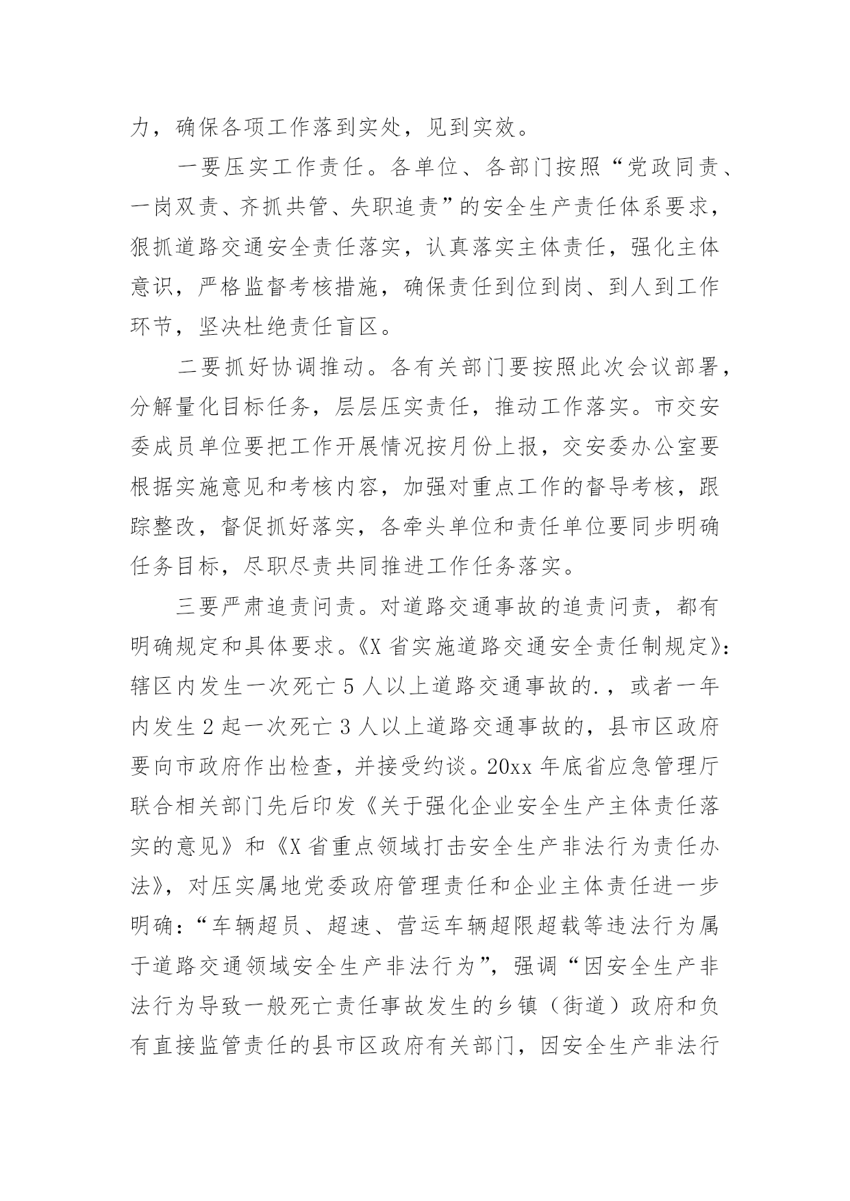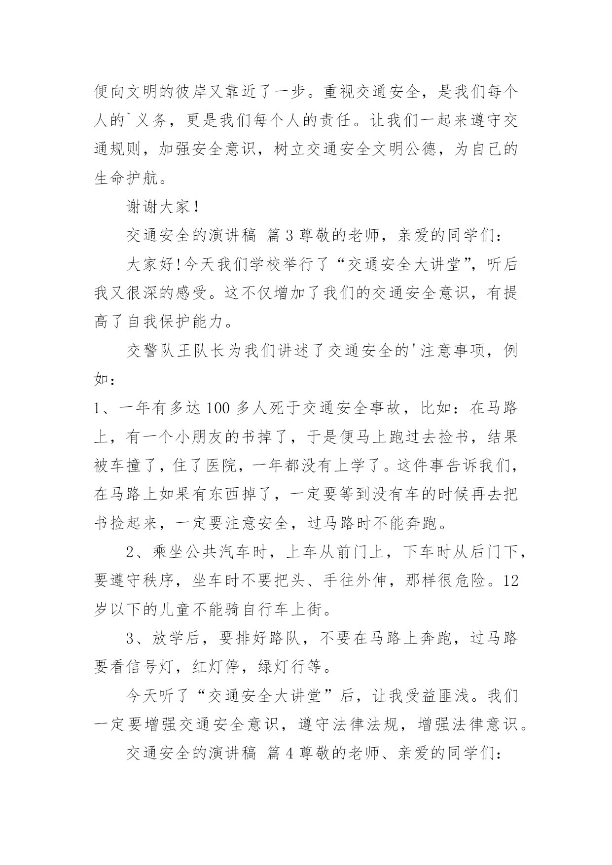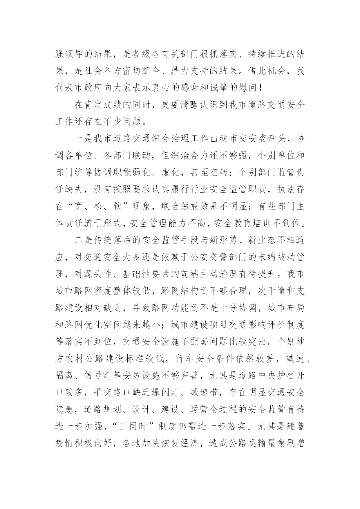 交通安全的演讲稿交通安全的演讲稿演讲稿的格式由称谓、开场白、主干、结尾等几部分组成。在学习、工作生活中,能够利用到演讲稿的场合越来越多,那要怎么写好演讲稿呢?下面是小编精心整理的交通安全的演讲稿,欢迎大家借鉴与参考,希望对大家有所帮助。交通安全的演讲稿篇1同志们:这次会议是市委、市政府研究召开的一次重要会议,主要任务是深入贯彻省、市关于安全生产系列部署要求,分析形势、部署任务,以更大决心和力度整治各类道路交通安全隐患,努力为全市“重点工作攻坚年”顺利推进营造畅通安全的道路通行环境。下面,我代表市政府讲三点意见:一、把握形势,主动作为,进一步增强工作责任感、使命感20xx年,全市上下认真落实市委、市政府部署要求,坚持齐抓共管,源头管控,扎实开展“平安行·你我他”活动,紧紧围绕“防事故、保安全、保畅通”目标,聚焦风险防控,着力补齐短板,有效维护了全市道路交通安全形势总体平稳,实现了交通事故起数和死亡人数“双下降”、较大及以上道路交通事故“零发生”的目标,特别是在新冠肺炎疫情防控工作中,各单位、各部门坚守岗位、日夜奋战,有力维护了全市道路交通安全形势持续稳定,市委、市政府主要领导给予充分肯定。成绩来之不易,是市委、市政府高度重视、坚强领导的结果,是各级各有关部门狠抓落实、持续推进的结果,是社会各方密切配合、鼎力支持的结果。借此机会,我代表市政府向大家表示衷心的感谢和诚挚的慰问!在肯定成绩的同时,更要清醒认识到我市道路交通安全工作还存在不少问题。一是我市道路交通综合治理工作由我市交安委牵头,协调各单位、各部门联动,但综治合力还不够强,个别单位和部门统筹协调职能弱化、虚化,甚至空转;个别部门监管责任缺失,没有按照要求认真履行行业安全监管职责,执法存在“宽、松、软”现象,联合惩戒效果不明显;有些部门主体责任流于形式,安全管理能力不高,安全教育培训不到位。二是传统落后的安全监管手段与新形势、新业态不相适应,对交通安全大多还是依赖于公安交警部门的末端被动管理,对源头性、基础性要素的前端主动治理有待提升。我市城市路网密度整体较低,路网结构还不够合理,次干道和支路建设相对缺乏,导致路网功能还不是十分协调,城市布局和路网优化空间越来越小;城市建设项目交通影响评价制度等落实不到位,交通安全设施不配套问题比较突出。个别地方农村公路建设标准较低,行车安全条件依然较差,减速、隔离、信号灯等安防设施不够完善,尤其是道路中央护栏开口较多,平交路口缺乏爆闪灯、减速带,存在明显交通安全隐患,道路规划、设计、建设、运营全过程的安全监管有待进一步加强,“三同时”制度仍需进一步落实。尤其是随着疫情积极向好,各地加快恢复经济,造成公路运输量急剧增长,交通事故和拥堵频发、多发苗头日益显现。近期,xxx等地接连发生客货车肇事导致的较大事故或者起火爆炸事故,需引起重视,汲取教训,举一反三,针对性落实管控措施。三是虽然交通安全信息化建设不断完善,但还存在共建共享、深度应用、指导实战不够等问题,数据优势还未转化为决策优势、管理优势。四是目前对发生的涉及客货运输企业车辆的死亡交通事故,还大多停留在事故责任调查层面,对企业、单位管理责任的深度追查不够。五是交通安全宣传表面上“铺天盖地”,但深入人心不够,农用车违法载人、无证驾驶、逆行、酒醉驾等违法仍多发高发。2021年是加速新旧动能转换、推动高质量发展的攻坚突破之年,做好今年的道路交通安全工作至关重要。尤其是现在正处于疫情防控和社会各行业复工复产的关键阶段,大事故往往会使群众生命受损失、地方形象受影响,处理不好还会引发社会稳定问题。全市各级各有关部门一定要坚持预防第一、精准监管,靠前一步、主动作为,强化责任落实、完善治理机制,不断提升道路交通安全治理能力和治理水平,努力实现交通事故起数、交通事故死亡人数和“两客一危一货”重点车辆的伤亡事故“三个明显下降”,力争不发生较大事故,坚决杜绝重大以上事故”,为全面建成小康社会创造更加优质的交通安全环境。二、标本兼治、系统攻坚,大力推动道路交通安全综合整治道路交通安全工作是一项长期系统工程,必须坚持综合施策、多措并举、标本兼治,创新理念方法,扩大社会参与,推进依法治理,深化科技应用,重点在推动道路交通安全治理体系和治理能力现代化上下功夫,实现“六个方面”全面提升。一是抓源头,消除各类安全隐患。严格监督道路交通安全设施“三同时”制度落实,加强对车辆生产、销售、登记、营运准入、报废等环节监管,严厉打击非法生产、改装、拼装、报废回收等违法行为。对不适合从事道路运输的,依法注销从业资格,严把重点驾驶人准入关,保障源头安全隐患新量“不增”。要持续开展“两客一危一货”、校车、农村面包车等重点车辆隐患“清零”,对隐患突出企业联合约谈、督促整改、跟踪督办。加强对旅行社用车安全监督检查,推进源头安全隐患存量“清