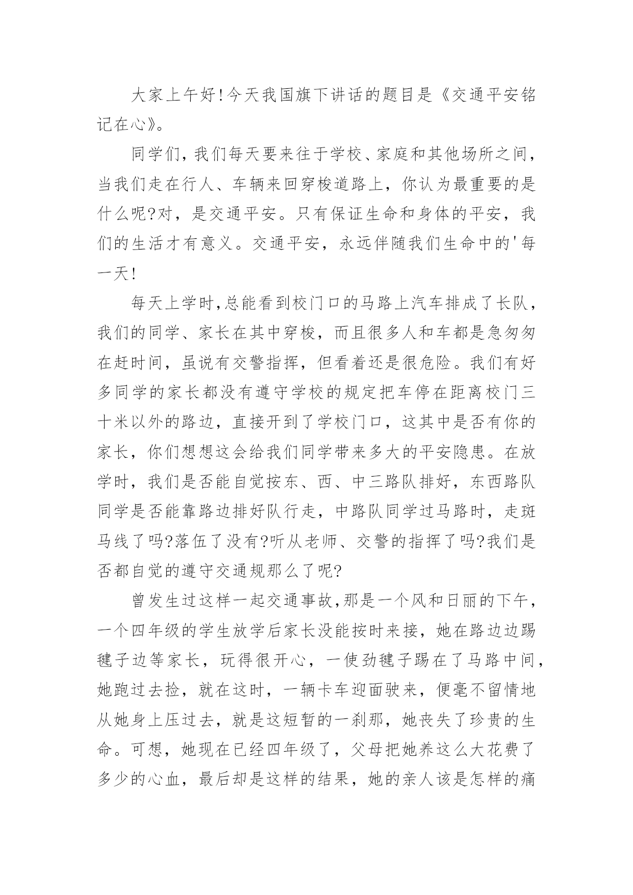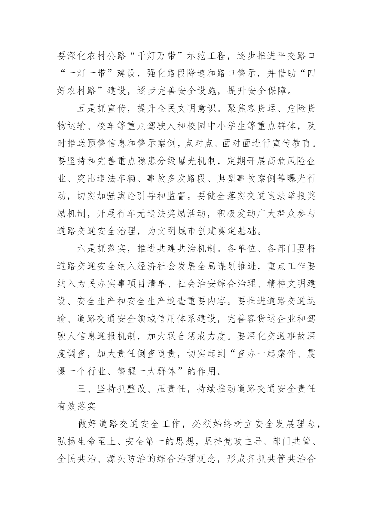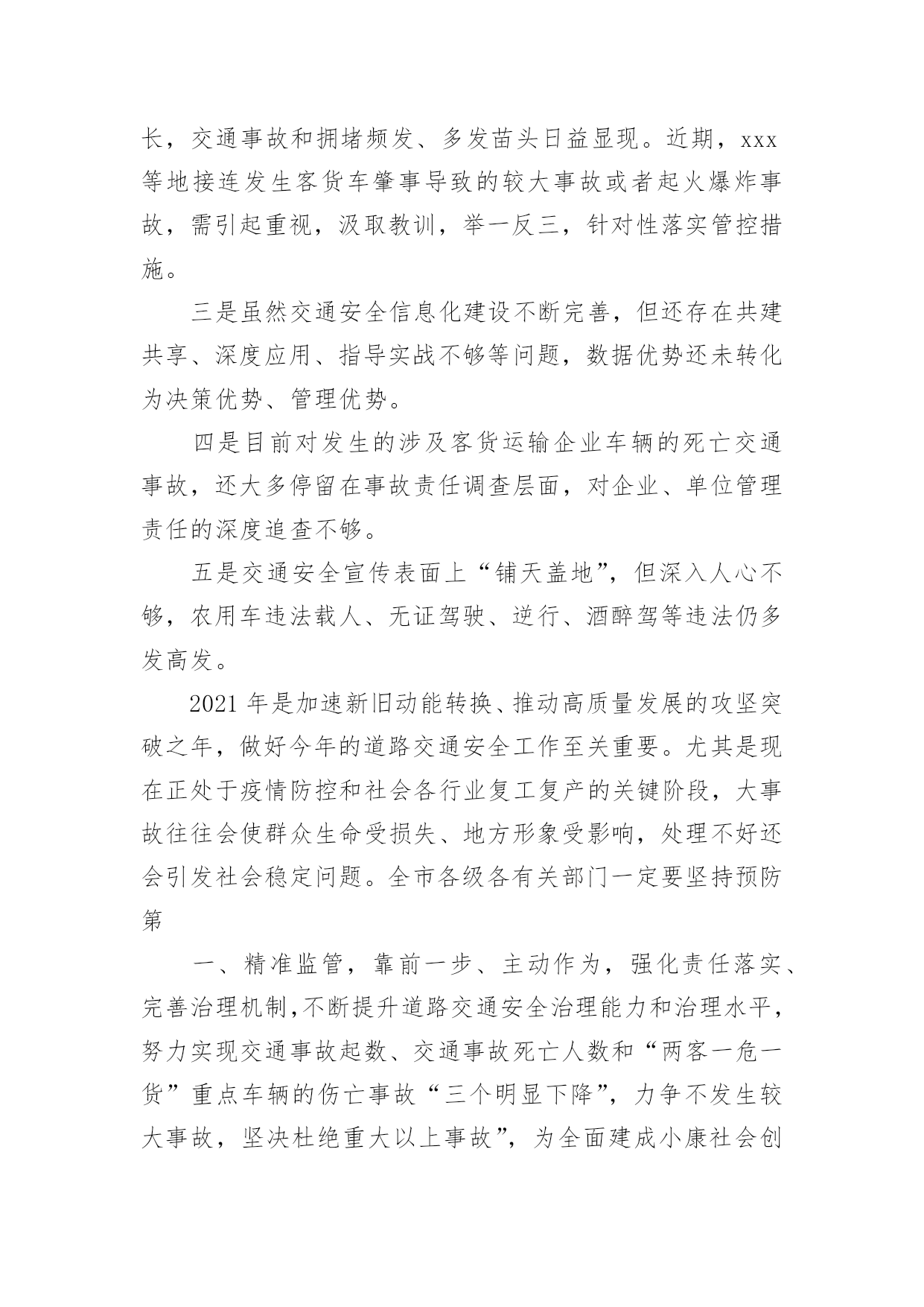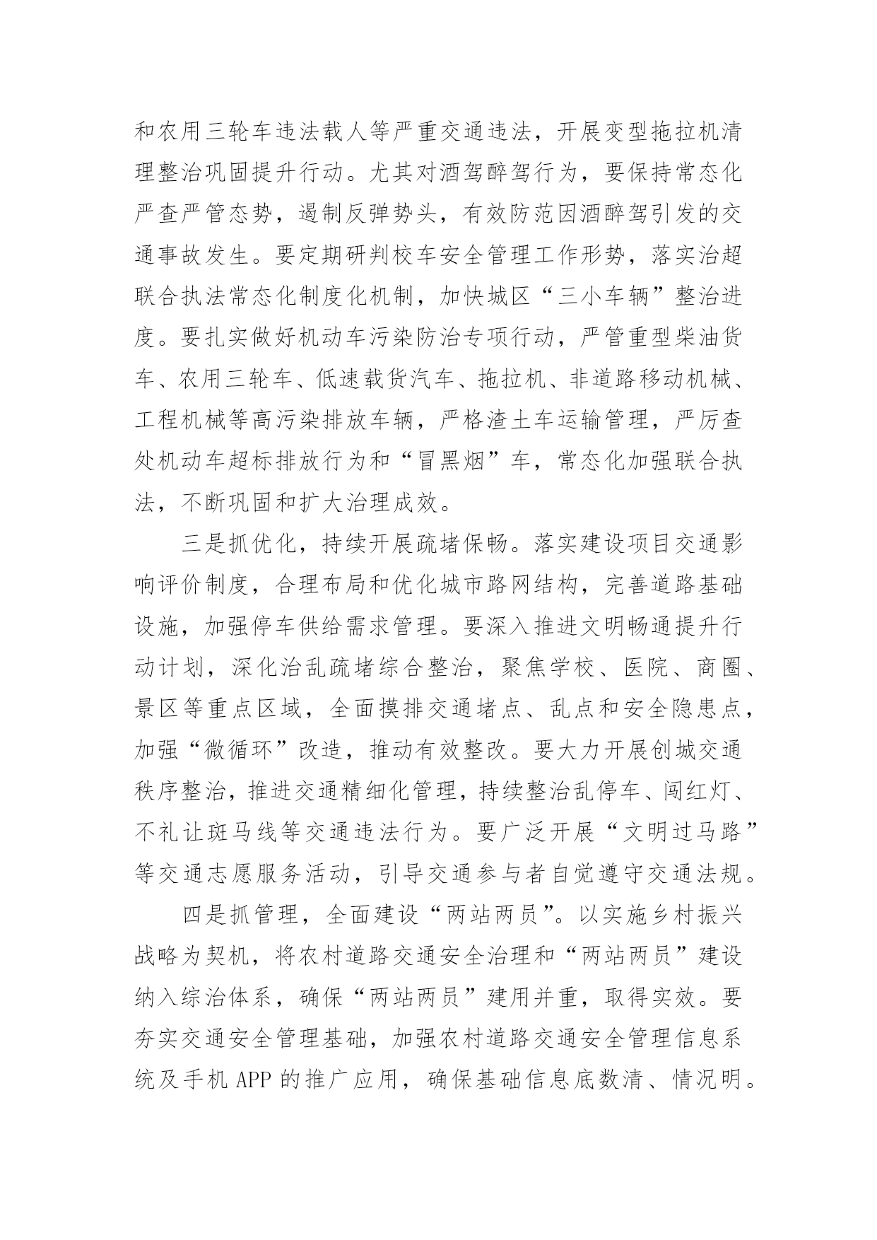交通安全的演讲稿交通安全的演讲稿演讲稿的格式由称谓、开场白、主干、结尾等几部分组成。在学习、工作生活中,能够利用到演讲稿的场合越来越多,那要怎么写好演讲稿呢?下面是小编精心整理的交通安全的演讲稿,欢迎大家借鉴与参考,希望对大家有所帮助。交通安全的演讲稿篇1同志们:这次会议是市委、市政府研究召开的一次重要会议,主要任务是深入贯彻省、市关于安全生产系列部署要求,分析形势、部署任务,以更大决心和力度整治各类道路交通安全隐患,努力为全市“重点工作攻坚年”顺利推进营造畅通安全的道路通行环境。下面,我代表市政府讲三点意见:一、把握形势,主动作为,进一步增强工作责任感、使命感20xx年,全市上下认真落实市委、市政府部署要求,坚持齐抓共管,源头管控,扎实开展“平安行·你我他”活动,紧紧围绕“防事故、保安全、保畅通”目标,聚焦风险防控,着力补齐短板,有效维护了全市道路交通安全形势总体平稳,实现了交通事故起数和死亡人数“双下降”、较大及以上道路交通事故“零发生”的目标,特别是在新冠肺炎疫情防控工作中,各单位、各部门坚守岗位、日夜奋战,有力维护了全市道路交通安全形势持续稳定,市委、市政府主要领导给予充分肯定。成绩来之不易,是市委、市政府高度重视、坚强领导的结果,是各级各有关部门狠抓落实、持续推进的结果,是社会各方密切配合、鼎力支持的结果。借此机会,我代表市政府向大家表示衷心的感谢和诚挚的慰问!在肯定成绩的同时,更要清醒认识到我市道路交通安全工作还存在不少问题。一是我市道路交通综合治理工作由我市交安委牵头,协调各单位、各部门联动,但综治合力还不够强,个别单位和部门统筹协调职能弱化、虚化,甚至空转;个别部门监管责任缺失,没有按照要求认真履行行业安全监管职责,执法存在“宽、松、软”现象,联合惩戒效果不明显;有些部门主体责任流于形式,安全管理能力不高,安全教育培训不到位。二是传统落后的安全监管手段与新形势、新业态不相适应,对交通安全大多还是依赖于公安交警部门的末端被动管理,对源头性、基础性要素的前端主动治理有待提升。我市城市路网密度整体较低,路网结构还不够合理,次干道和支路建设相对缺乏,导致路网功能还不是十分协调,城市布局和路网优化空间越来越小;城市建设项目交通影响评价制度等落实不到位,交通安全设施不配套问题比较突出。个别地方农村公路建设标准较低,行车安全条件依然较差,减速、隔离、信号灯等安防设施不够完善,尤其是道路中央护栏开口较多,平交路口缺乏爆闪灯、减速带,存在明显交通安全隐患,道路规划、设计、建设、运营全过程的安全监管有待进一步加强,“三同时”制度仍需进一步落实。尤其是随着疫情积极向好,各地加快恢复经济,造成公路运输量急剧增长,交通事故和拥堵频发、多发苗头日益显现。近期,xxx等地接连发生客货车肇事导致的较大事故或者起火爆炸事故,需引起重视,汲取教训,举一反三,针对性落实管控措施。三是虽然交通安全信息化建设不断完善,但还存在共建共享、深度应用、指导实战不够等问题,数据优势还未转化为决策优势、管理优势。四是目前对发生的涉及客货运输企业车辆的死亡交通事故,还大多停留在事故责任调查层面,对企业、单位管理责任的深度追查不够。五是交通安全宣传表面上“铺天盖地”,但深入人心不够,农用车违法载人、无证驾驶、逆行、酒醉驾等违法仍多发高发。2021年是加速新旧动能转换、推动高质量发展的攻坚突破之年,做好今年的道路交通安全工作至关重要。尤其是现在正处于疫情防控和社会各行业复工复产的关键阶段,大事故往往会使群众生命受损失、地方形象受影响,处理不好还会引发社会稳定问题。全市各级各有关部门一定要坚持预防第一、精准监管,靠前一步、主动作为,强化责任落实、完善治理机制,不断提升道路交通安全治理能力和治理水平,努力实现交通事故起数、交通事故死亡人数和“两客一危一货”重点车辆的伤亡事故“三个明显下降”,力争不发生较大事故,坚决杜绝重大以上事故”,为全面建成小康社会创造更加优质的交通安全环境。二、标本兼治、系统攻坚,大力推动道路交通安全综合整治道路交通安全工作是一项长期系统工程,必须坚持综合施策、多措并举、标本兼治,创新理念方法,扩大社会参与,推进依法治理,深化科技应用,重点在推动道路交通安全治理体系和治理能力现代化上下功夫,实现“六个方面”全面提升。一是抓源头,消除各类安全隐患。严格监督道路交通安全设施“三同时”制度落实,加强对车辆生产、销售、登记、营运准入、报废等环节监管,严厉打击非法生产、改装、拼装、报废回收等违法行为。对不适合从事道路运输的,依法注销从业资格,严把重点驾驶人准入关,保障源头安全隐患新量“不增”。要持续开展“两客一危一货”、校车、农村面包车等重点车辆隐患“清零”,对隐患突出企业联合约谈、督促整改、跟踪督办。加强对旅行社用车安全监督检查,推进源头安全隐患存量“清