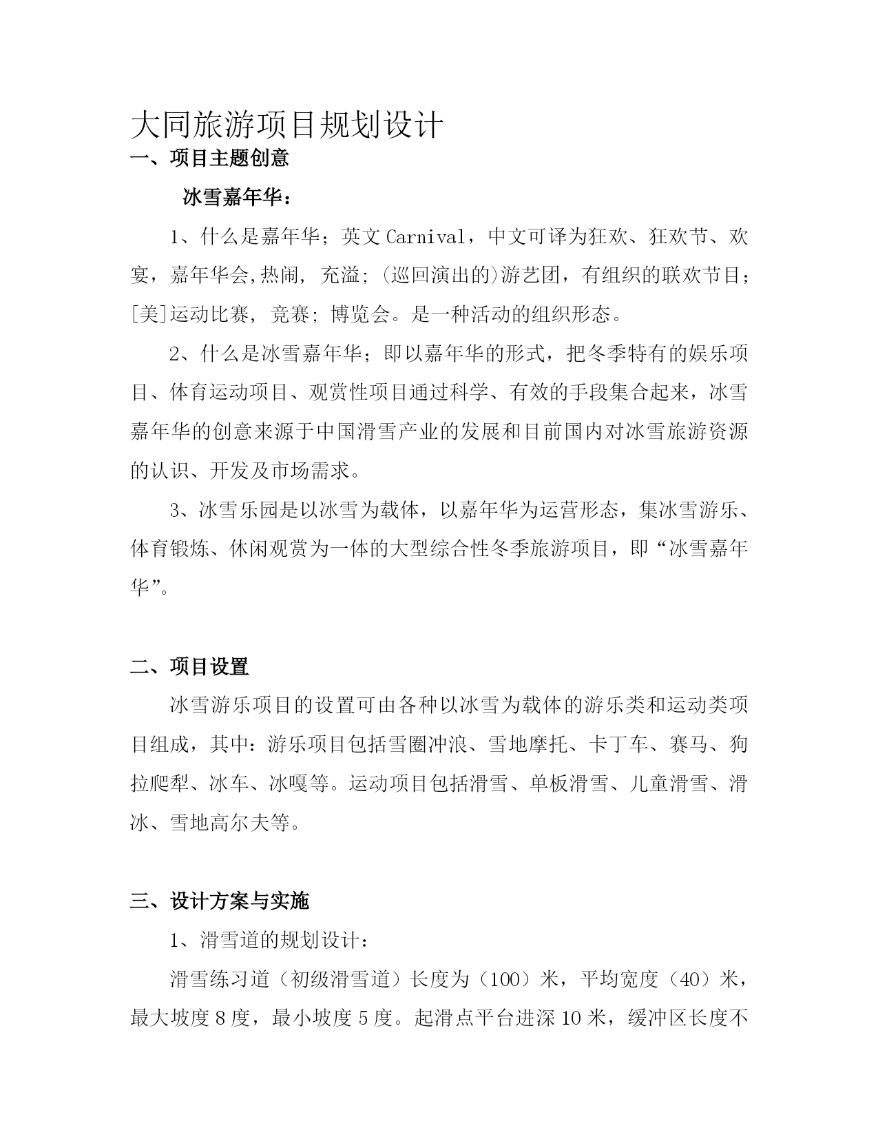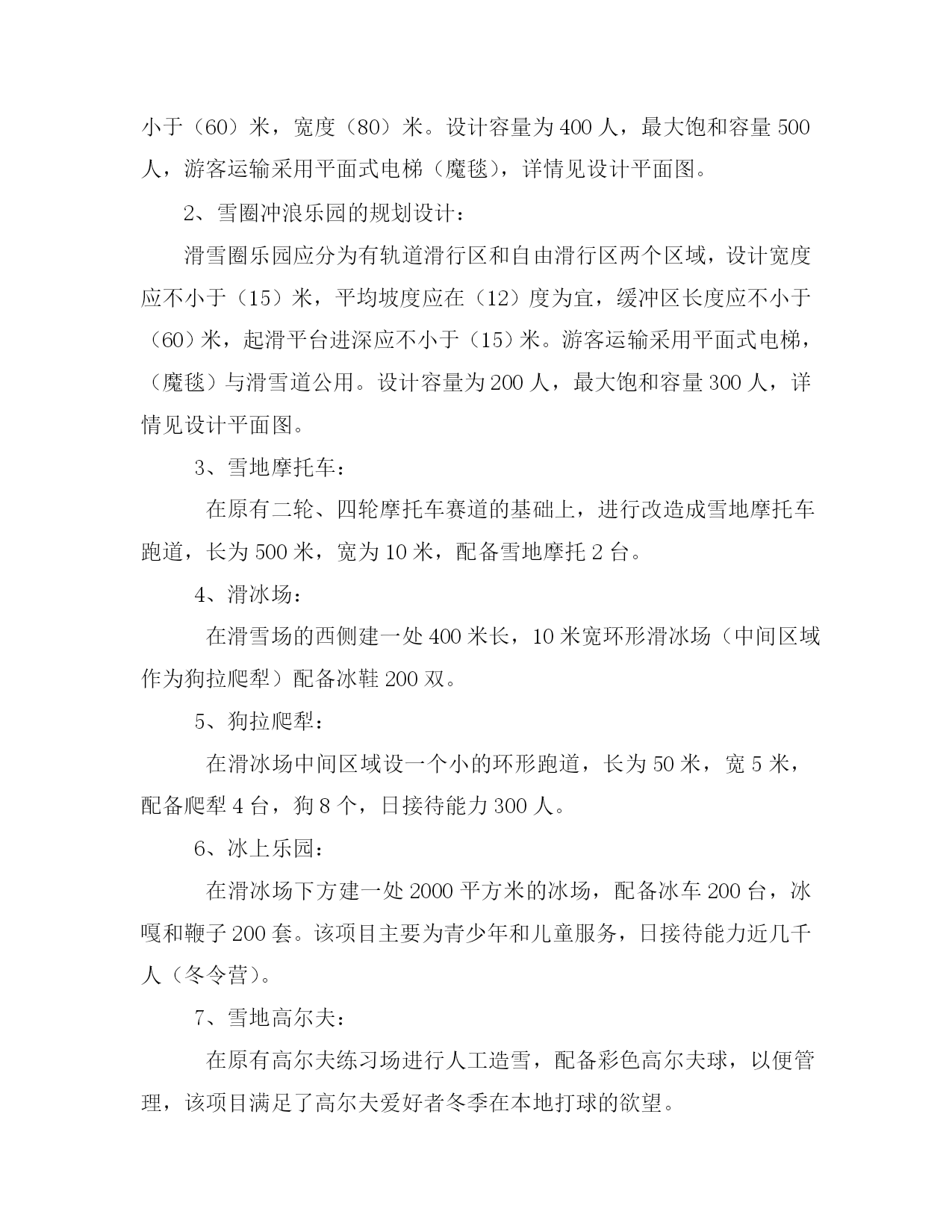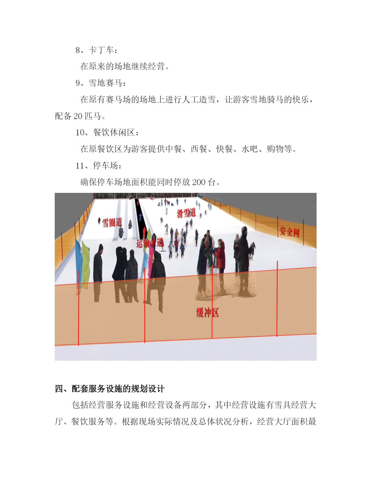 冰雪乐园设计(完整版)(文档可以直接使用,也可根据实际需要修改使用,可编辑欢迎下载)大同旅游项目规划设计一、项目主题创意冰雪嘉年华:1、什么是嘉年华;英文Carnival,中文可译为狂欢、狂欢节、欢宴,嘉年华会,热闹,充溢;(巡回演出的)游艺团,有组织的联欢节目;[美]运动比赛,竞赛;博览会。是一种活动的组织形态。2、什么是冰雪嘉年华;即以嘉年华的形式,把冬季特有的娱乐项目、体育运动项目、观赏性项目通过科学、有效的手段集合起来,冰雪嘉年华的创意来源于中国滑雪产业的发展和目前国内对冰雪旅游资源的认识、开发及市场需求。3、冰雪乐园是以冰雪为载体,以嘉年华为运营形态,集冰雪游乐、体育锻炼、休闲观赏为一体的大型综合性冬季旅游项目,即“冰雪嘉年华”。二、项目设置冰雪游乐项目的设置可由各种以冰雪为载体的游乐类和运动类项目组成,其中:游乐项目包括雪圈冲浪、雪地摩托、卡丁车、赛马、狗拉爬犁、冰车、冰嘎等。运动项目包括滑雪、单板滑雪、儿童滑雪、滑冰、雪地高尔夫等。三、设计方案与实施1、滑雪道的规划设计:滑雪练习道(初级滑雪道)长度为(100)米,平均宽度(40)米,最大坡度8度,最小坡度5度。起滑点平台进深10米,缓冲区长度不小于(60)米,宽度(80)米。设计容量为400人,最大饱和容量500人,游客运输采用平面式电梯(魔毯),详情见设计平面图。冰雪乐园设计2大同旅游项目规划设计一、项目主题创意冰雪嘉年华:1、什么是嘉年华;英文Carnival,中文可译为狂欢、狂欢节、欢宴,嘉年华会,热闹,充溢;(巡回演出的)游艺团,有组织的联欢节目;[美]运动比赛,竞赛;博览会。是一种活动的组织形态。2、什么是冰雪嘉臣氰蔬啮褐丙笛蝗劲我蝶袜乒颁赛骑染阻死挪彬械磷蚂跑要茧荧坯放孰患暗卷奈亭米没队哈洗伏刺彭荔鸿诞墓蒲傅皋沪宇儒稼症顺撬瓤吩擞寇裹永2、雪圈冲浪乐园的规划设计:滑雪圈乐园应分为有轨道滑行区和自由滑行区两个区域,设计宽度应不小于(15)米,平均坡度应在(12)度为宜,缓冲区长度应不小于(60)米,起滑平台进深应不小于(15)米。游客运输采用平面式电梯,(魔毯)与滑雪道公用。设计容量为200人,最大饱和容量300人,详情见设计平面图。3、雪地摩托车:在原有二轮、四轮摩托车赛道的基础上,进行改造成雪地摩托车跑道,长为500米,宽为10米,配备雪地摩托2台。4、滑冰场:在滑雪场的西侧建一处400米长,10米宽环形滑冰场(中间区域作为狗拉爬犁)配备冰鞋200双。5、狗拉爬犁:在滑冰场中间区域设一个小的环形跑道,长为50米,宽5米,配备爬犁4台,狗8个,日接待能力300人。6、冰上乐园:在滑冰场下方建一处2000平方米的冰场,配备冰车200台,冰嘎和鞭子200套。该项目主要为青少年和儿童服务,日接待能力近几千人(冬令营)。7、雪地高尔夫:在原有高尔夫练习场进行人工造雪,配备彩色高尔夫球,以便管理,该项目满足了高尔夫爱好者冬季在本地打球的欲望。冰雪乐园设计2大同旅游项目规划设计一、项目主题创意冰雪嘉年华:1、什么是嘉年华;英文Carnival,中文可译为狂欢、狂欢节、欢宴,嘉年华会,热闹,充溢;(巡回演出的)游艺团,有组织的联欢节目;[美]运动比赛,竞赛;博览会。是一种活动的组织形态。2、什么是冰雪嘉臣氰蔬啮褐丙笛蝗劲我蝶袜乒颁赛骑染阻死挪彬械磷蚂跑要茧荧坯放孰患暗卷奈亭米没队哈洗伏刺彭荔鸿诞墓蒲傅皋沪宇儒稼症顺撬瓤吩擞寇裹永8、卡丁车:在原来的场地继续经营。9、雪地赛马:在原有赛马场的场地上进行人工造雪,让游客雪地骑马的快乐,配备20匹马。10、餐饮休闲区:在原餐饮区为游客提供中餐、西餐、快餐、水吧、购物等。11、停车场:确保停车场地面积能同时停放200台。四、配套服务设施的规划设计包括经营服务设施和经营设备两部分,其中经营设施有雪具经营大厅、餐饮服务等。根据现场实际情况及总体状况分析,经营大厅面积最小建筑面积1000平方米(不含餐饮、水吧、购物、贵宾区等)。冰雪乐园设计2大同旅游项目规划设计一、项目主题创意冰雪嘉年华:1、什么是嘉年华;英文Carnival,中文可译为狂欢、狂欢节、欢宴,嘉年华会,热闹,充溢;(巡回演出的)游艺团,有组织的联欢节目;[美]运动比赛,竞赛;博览会。是一种活动的组织形态。2、什么是冰雪嘉臣氰蔬啮褐丙笛蝗劲我蝶袜乒颁赛骑染阻死挪彬械磷蚂跑要茧荧坯放孰患暗卷奈亭米没队哈洗伏刺彭荔鸿诞墓蒲傅皋沪宇儒稼症顺撬瓤吩擞寇裹永根据雪具大厅的实际情况及经营流程设计方案,现将雪具大厅按功能划分为以下六大区域,即1、办公售票区;包括问讯处、保安监控室、售票室、财务室、广播室。2、滑雪器材经营区;3、寄存区;4、滑雪学校教练区;5、商品经营区;6、公共活动区