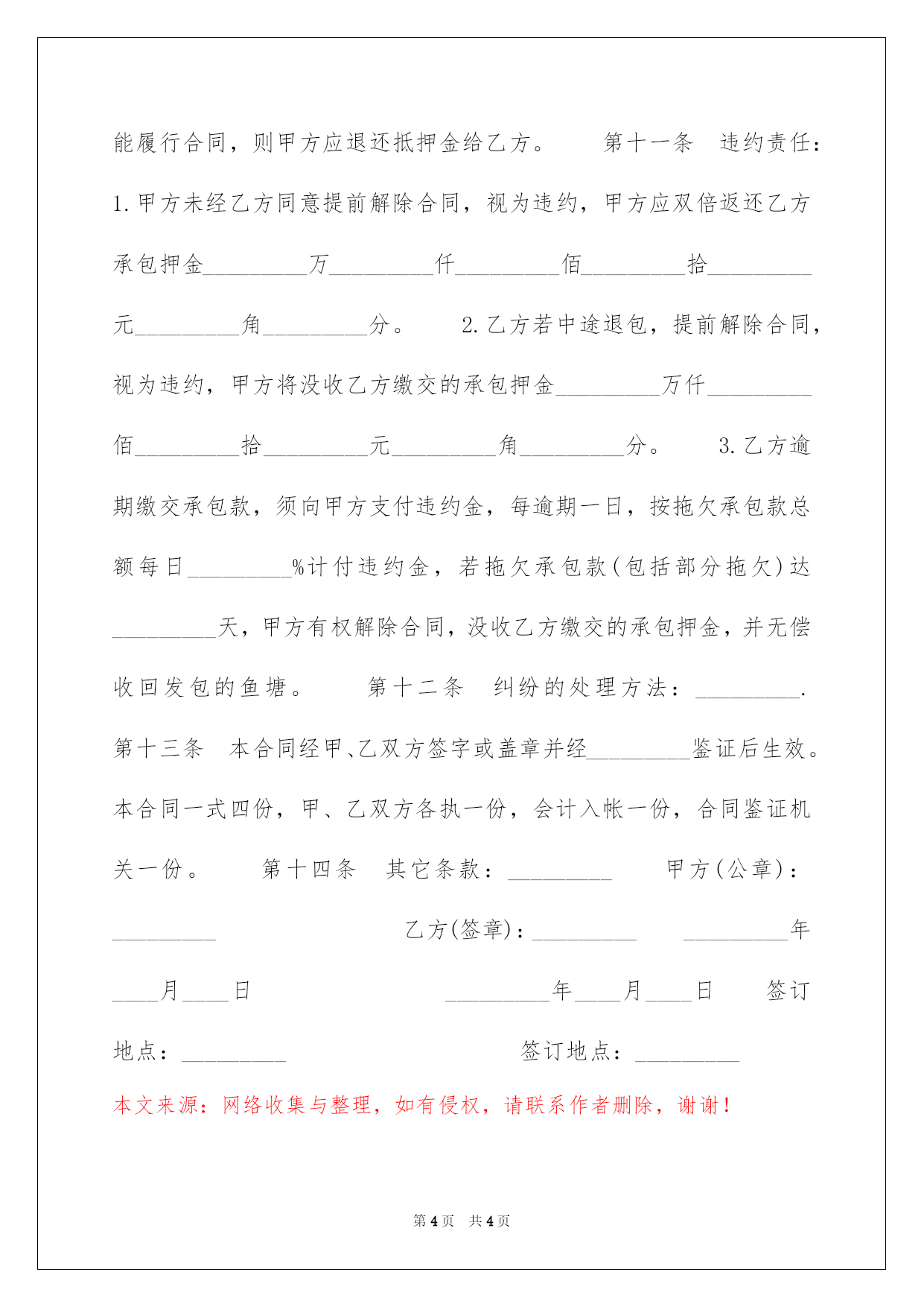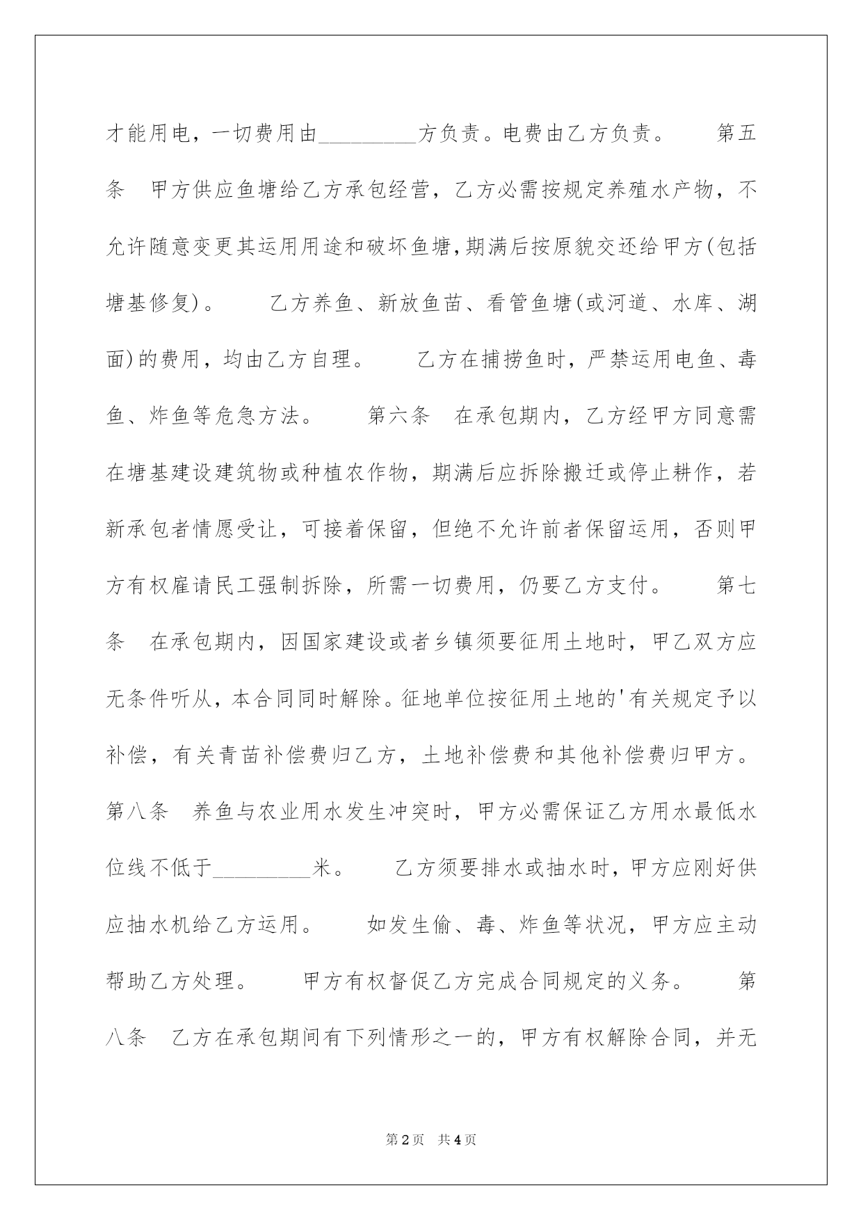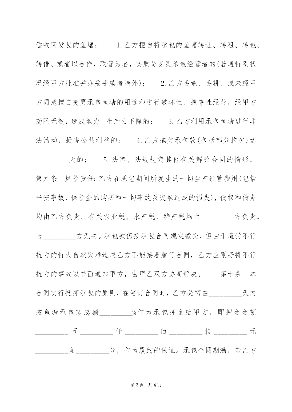 第PAGE\*Arabic\*MERGEFORMAT4页共NUMPAGES\*Arabic\*MERGEFORMAT4页第PAGE\*MERGEFORMAT4页共NUMPAGES\*MERGEFORMAT4页第PAGE\*MERGEFORMAT4页共NUMPAGES\*MERGEFORMAT4页第PAGE\*MERGEFORMAT4页共NUMPAGES\*MERGEFORMAT4页第PAGE\*MERGEFORMAT4页共NUMPAGES\*MERGEFORMAT4页第PAGE\*MERGEFORMAT4页共NUMPAGES\*MERGEFORMAT4页第PAGE\*MERGEFORMAT4页共NUMPAGES\*MERGEFORMAT4页第PAGE\*MERGEFORMAT4页共NUMPAGES\*MERGEFORMAT4页第PAGE\*MERGEFORMAT4页共NUMPAGES\*MERGEFORMAT4页第PAGE\*MERGEFORMAT4页共NUMPAGES\*MERGEFORMAT4页第PAGE\*MERGEFORMAT4页共NUMPAGES\*MERGEFORMAT4页2022公共鱼塘承包合同公共鱼塘承包合同甲方(发包方):_________现地址:_________乙方(承包方):_________现住址:_________身份证号码:_________为了落实联产承包责任制,充分调动生产主动性,提高经济效益,甲方经探讨确定,将鱼塘进行招标承包,乙方参与竞投中标。现经甲乙双方协商一样,订立合同条款如下:第一条乙方承包鱼塘的土名:_________,鱼塘面积:_________亩_________分_________厘。其次条承包期限_________年_________月,即从_________年_________月_________日至_________年_________月_________日止。第三条承包金额和缴交方法:鱼塘承包总金额为_________万_________仟_________佰_________拾_________元_________角_________分。鱼塘每年承包金额为_________万_________仟_________佰_________拾_________元_________角_________分,每年的承包金应于当年_________月_________日前一次性缴交完毕。第四条在承包期内,乙方所承包的鱼塘须要用电必需听从电管站的管理,并根据甲方指定地方装上电表和漏电开关,才能用电,一切费用由_________方负责。电费由乙方负责。第五条甲方供应鱼塘给乙方承包经营,乙方必需按规定养殖水产物,不允许随意变更其运用用途和破坏鱼塘,期满后按原貌交还给甲方(包括塘基修复)。乙方养鱼、新放鱼苗、看管鱼塘(或河道、水库、湖面)的费用,均由乙方自理。乙方在捕捞鱼时,严禁运用电鱼、毒鱼、炸鱼等危急方法。第六条在承包期内,乙方经甲方同意需在塘基建设建筑物或种植农作物,期满后应拆除搬迁或停止耕作,若新承包者情愿受让,可接着保留,但绝不允许前者保留运用,否则甲方有权雇请民工强制拆除,所需一切费用,仍要乙方支付。第七条在承包期内,因国家建设或者乡镇须要征用土地时,甲乙双方应无条件听从,本合同同时解除。征地单位按征用土地的'有关规定予以补偿,有关青苗补偿费归乙方,土地补偿费和其他补偿费归甲方。第八条养鱼与农业用水发生冲突时,甲方必需保证乙方用水最低水位线不低于_________米。乙方须要排水或抽水时,甲方应刚好供应抽水机给乙方运用。如发生偷、毒、炸鱼等状况,甲方应主动帮助乙方处理。甲方有权督促乙方完成合同规定的义务。第八条乙方在承包期间有下列情形之一的,甲方有权解除合同,并无偿收回发包的鱼塘:1.乙方擅自将承包的鱼塘转让、转租、转包、转借、或者以合作,联营为名,实质是变更承包经营者的(若遇特别状况经甲方批准并办妥手续者除外);2.乙方丢荒、丢耕、或未经甲方同意擅自变更承包鱼塘的用途和进行破坏性、掠夺性经营,经甲方劝阻无效,造成地力、生产力下降的;3.乙方利用承包鱼塘进行非法活动,损害公共利益的;4.乙方拖欠承包款(包括部分拖欠)达_________天的;5.法律、法规规定其他有关解除合同的情形。第九条风险责任:乙方在承包期间所发生的一切生产经营费用(包括平安事故、保险金的购买和一切事故及灾难造成的损失),债权和债务均由乙方负责。有关农业税、水产税、特产税均由_________方负责,与_________方无关。承包款仍按承包合同规定缴