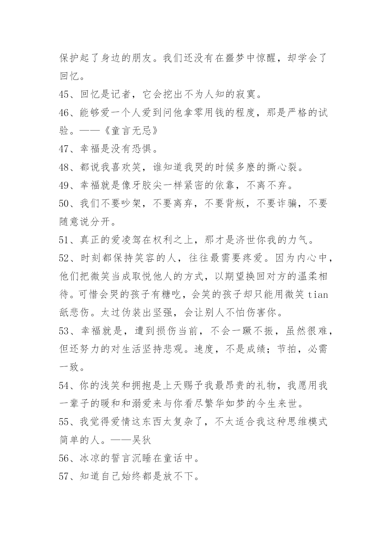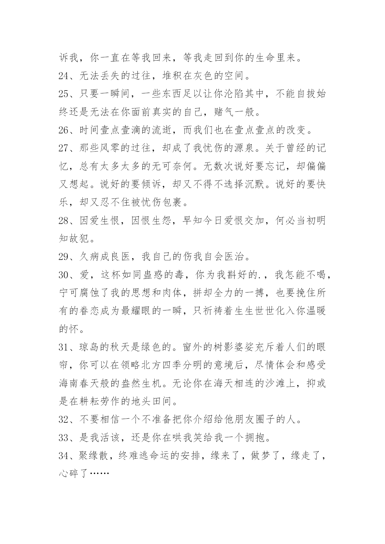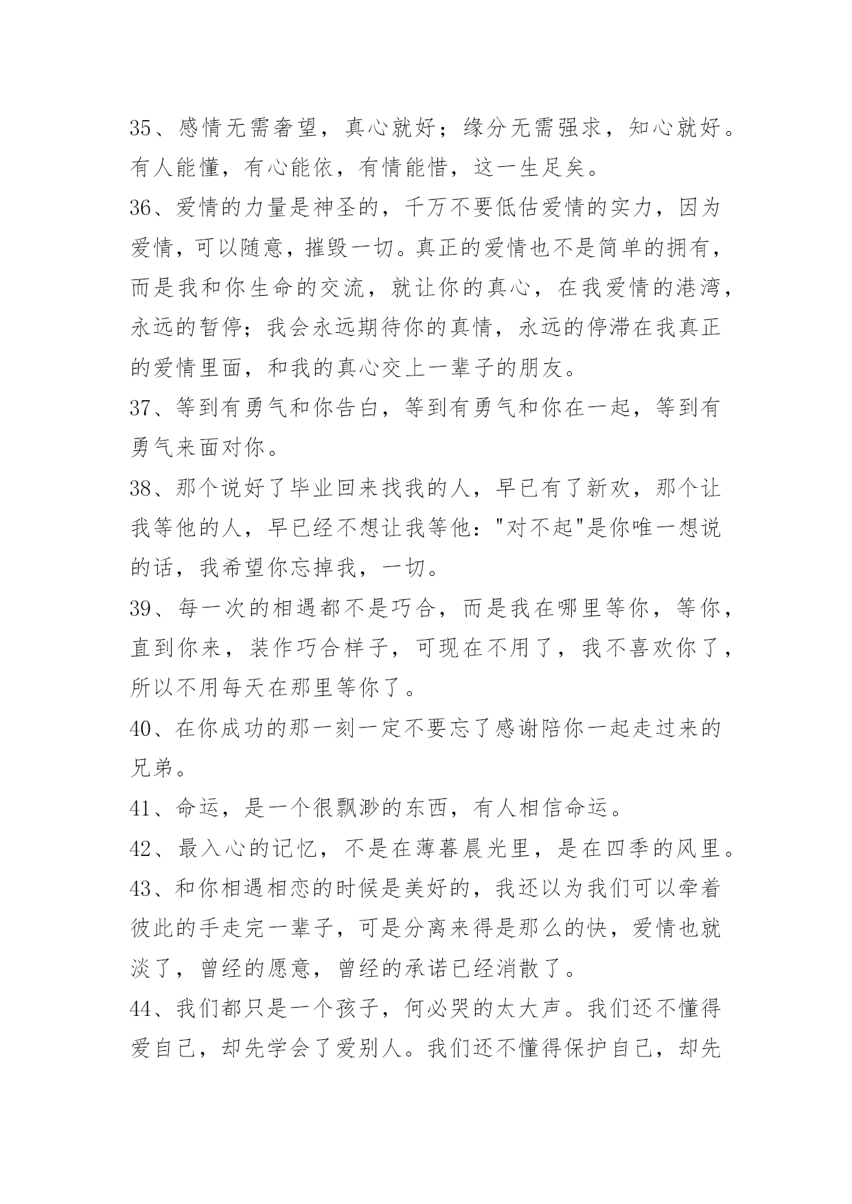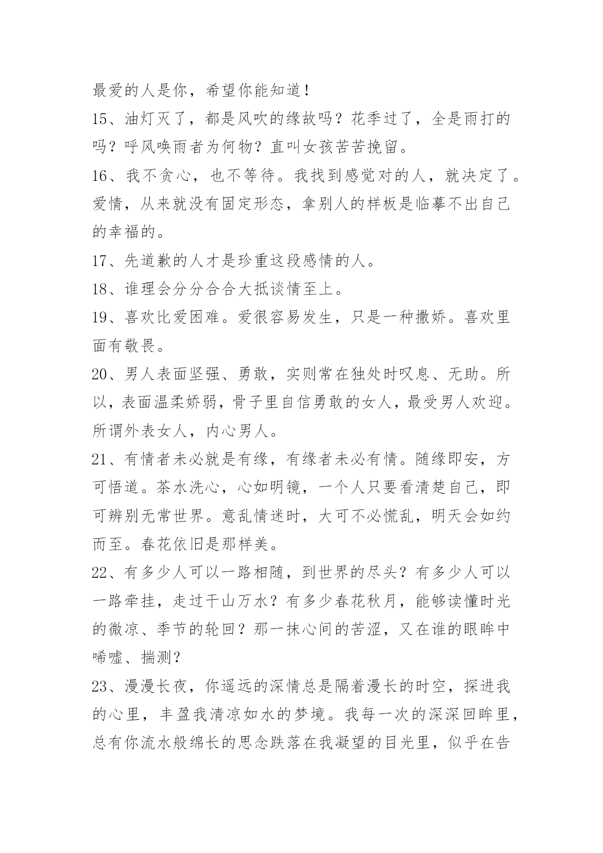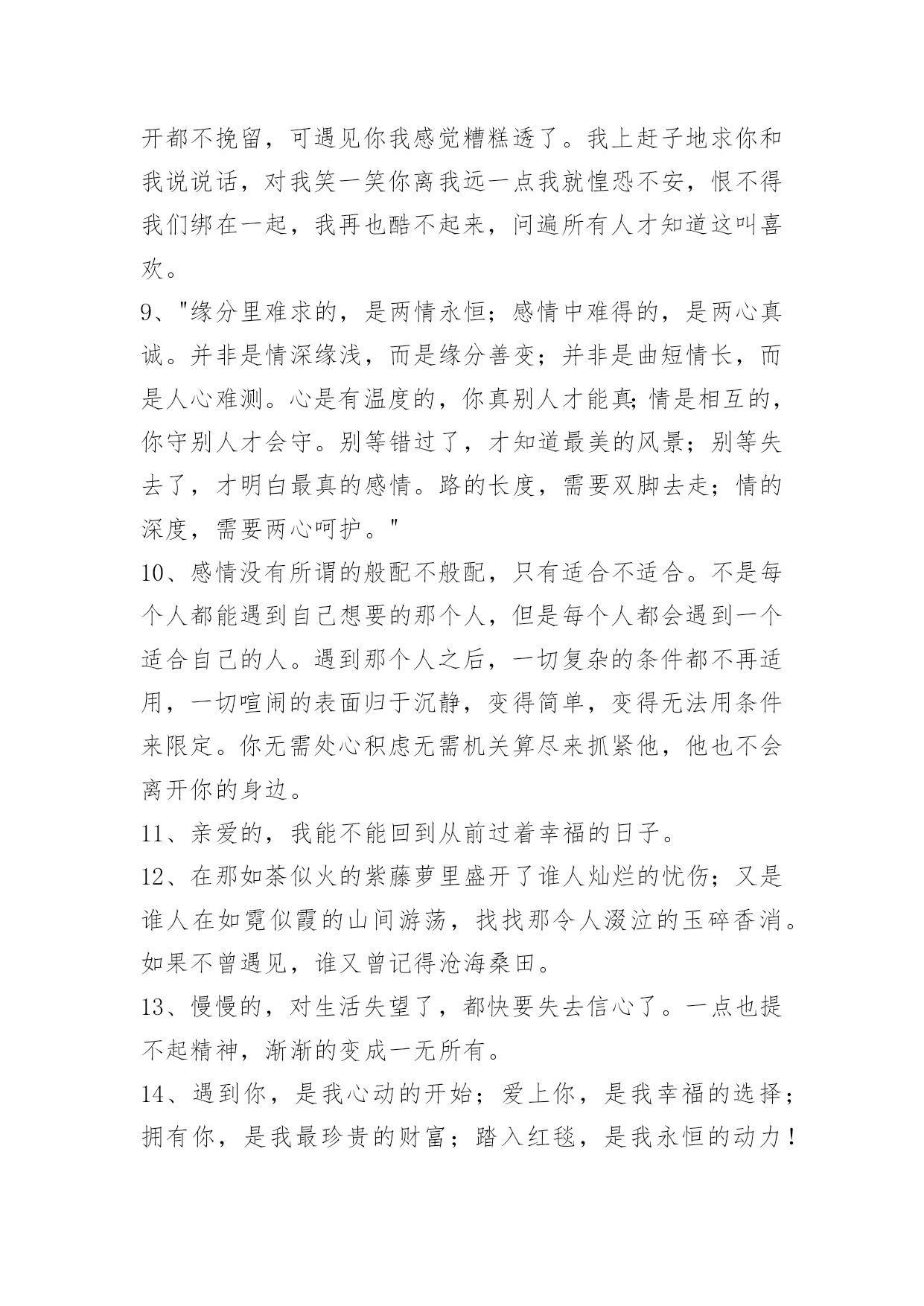 感人爱情语录58条【必备】2022年感人爱情语录大汇总58条要是别人说你是嫁给钱,你一点都不用往心里去。有物质才能有精神,至少要让自己生活有保障。但是你自己要有涵养,要有素养,要能经济独立,生活独立。以下是小编为大家收集的感人爱情语录58条,仅供参考,希望能够帮助到大家。1、我要做一只鸟,我会把爱巢也搭在别人碰不到的地方,我会精心的去一根一根的叼来树枝,装饰和加固我的爱巢,暴风雨来临时我会紧紧的抱住巢穴,不让它受到任何伤害。因为我要你和爱住在这里面。2、在不经意抬头间,再也看不到那个有着清澈笑容的人。3、爱情是最大的冒险大赌博,输了,说不定哪一天他将那副可怕无情的面孔拿来对付我。赢了,我得到与我钟爱的人共度一生。4、或许,太过执着,总有些患得患失,心底寂静无声依赖着。5、落日的余辉,如你的样子,我静静地坐在那里,看着那落日,想起了你。6、某某某,我告诉你,我还就真喜欢上你了。7、我得到的都是侥幸,我失去的却是整个人生。8、其实我以前是个很酷的人,从来不去追逐谁,无论谁离开都不挽留,可遇见你我感觉糟糕透了。我上赶子地求你和我说说话,对我笑一笑你离我远一点我就惶恐不安,恨不得我们绑在一起,我再也酷不起来,问遍所有人才知道这叫喜欢。9、"缘分里难求的,是两情永恒;感情中难得的,是两心真诚。并非是情深缘浅,而是缘分善变;并非是曲短情长,而是人心难测。心是有温度的,你真别人才能真;情是相互的,你守别人才会守。别等错过了,才知道最美的风景;别等失去了,才明白最真的感情。路的长度,需要双脚去走;情的深度,需要两心呵护。"10、感情没有所谓的般配不般配,只有适合不适合。不是每个人都能遇到自己想要的那个人,但是每个人都会遇到一个适合自己的人。遇到那个人之后,一切复杂的条件都不再适用,一切喧闹的表面归于沉静,变得简单,变得无法用条件来限定。你无需处心积虑无需机关算尽来抓紧他,他也不会离开你的身边。11、亲爱的,我能不能回到从前过着幸福的日子。12、在那如荼似火的紫藤萝里盛开了谁人灿烂的忧伤;又是谁人在如霓似霞的山间游荡,找找那令人涰泣的玉碎香消。如果不曾遇见,谁又曾记得沧海桑田。13、慢慢的,对生活失望了,都快要失去信心了。一点也提不起精神,渐渐的变成一无所有。14、遇到你,是我心动的开始;爱上你,是我幸福的选择;拥有你,是我最珍贵的财富;踏入红毯,是我永恒的动力!最爱的人是你,希望你能知道!15、油灯灭了,都是风吹的缘故吗?花季过了,全是雨打的吗?呼风唤雨者为何物?直叫女孩苦苦挽留。16、我不贪心,也不等待。我找到感觉对的人,就决定了。爱情,从来就没有固定形态,拿别人的样板是临摹不出自己的幸福的。17、先道歉的人才是珍重这段感情的人。18、谁理会分分合合大抵谈情至上。19、喜欢比爱困难。爱很容易发生,只是一种撒娇。喜欢里面有敬畏。20、男人表面坚强、勇敢,实则常在独处时叹息、无助。所以,表面温柔娇弱,骨子里自信勇敢的女人,最受男人欢迎。所谓外表女人,内心男人。21、有情者未必就是有缘,有缘者未必有情。随缘即安,方可悟道。茶水洗心,心如明镜,一个人只要看清楚自己,即可辨别无常世界。意乱情迷时,大可不必慌乱,明天会如约而至。春花依旧是那样美。22、有多少人可以一路相随,到世界的尽头?有多少人可以一路牵挂,走过干山万水?有多少春花秋月,能够读懂时光的微凉、季节的轮回?那一抹心间的苦涩,又在谁的眼眸中唏嘘、揣测?23、漫漫长夜,你遥远的深情总是隔着漫长的时空,探进我的心里,丰盈我清凉如水的梦境。我每一次的深深回眸里,总有你流水般绵长的思念跌落在我凝望的目光里,似乎在告诉我,你一直在等我回来,等我走回到你的生命里来。24、无法丢失的过往,堆积在灰色的空间。25、只要一瞬间,一些东西足以让你沦陷其中,不能自拔始终还是无法在你面前真实的自己,赌气一般。26、时间壹点壹滴的流逝,而我们也在壹点壹点的改变。27、那些风零的过往,却成了我忧伤的源泉。关于曾经的记忆,总有太多太多的无可奈何。无数次说好要忘记,却偏偏又想起。说好的要倾诉,却又不得不选择沉默。说好的要快乐,却又忍不住被忧伤包裹。28、因爱生恨,因恨生怨,早知今日爱恨交加,何必当初明知故犯。29、久病成良医,我自己的伤我自会医治。30、爱,这杯如同蛊惑的毒,你为我斟好的.,我怎能不喝,宁可腐蚀了我的思想和肉体,拼却全力的一搏,也要挽住所有的眷恋成为最耀眼的一瞬,只祈祷着生生世世化入你温暖的怀。31、琼岛的秋天是绿色的。窗外的树影婆娑充斥着人们的眼帘,你可以在领略北方四季分明的意境后,尽情体会和感受海南春天般的盎然生机。无论你在海天相连的沙滩上,抑或是在耕耘劳作的地头田间。32、不要相信一个不准备把你介绍给他朋友圈子的人。33、是我活该,还是你在哄我笑给我一个拥抱。34、聚缘散,终难逃命运的安排,缘来了