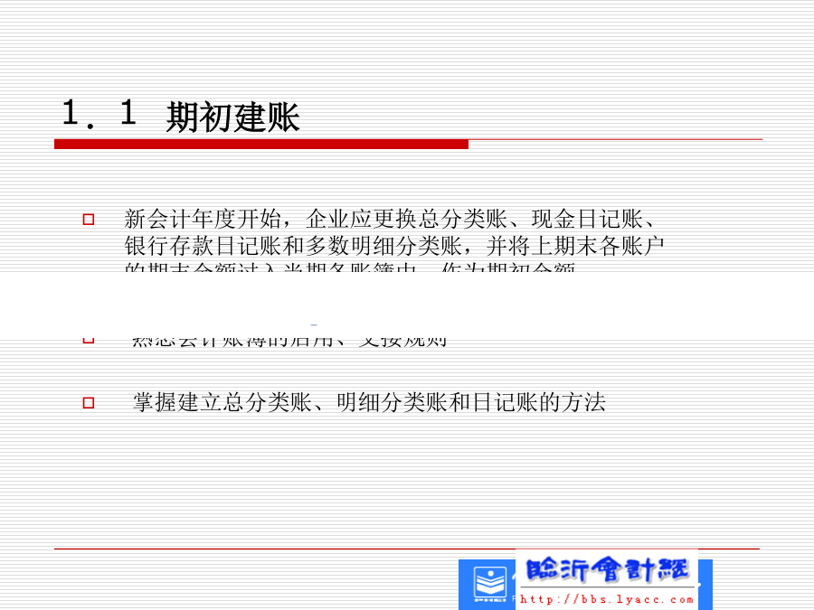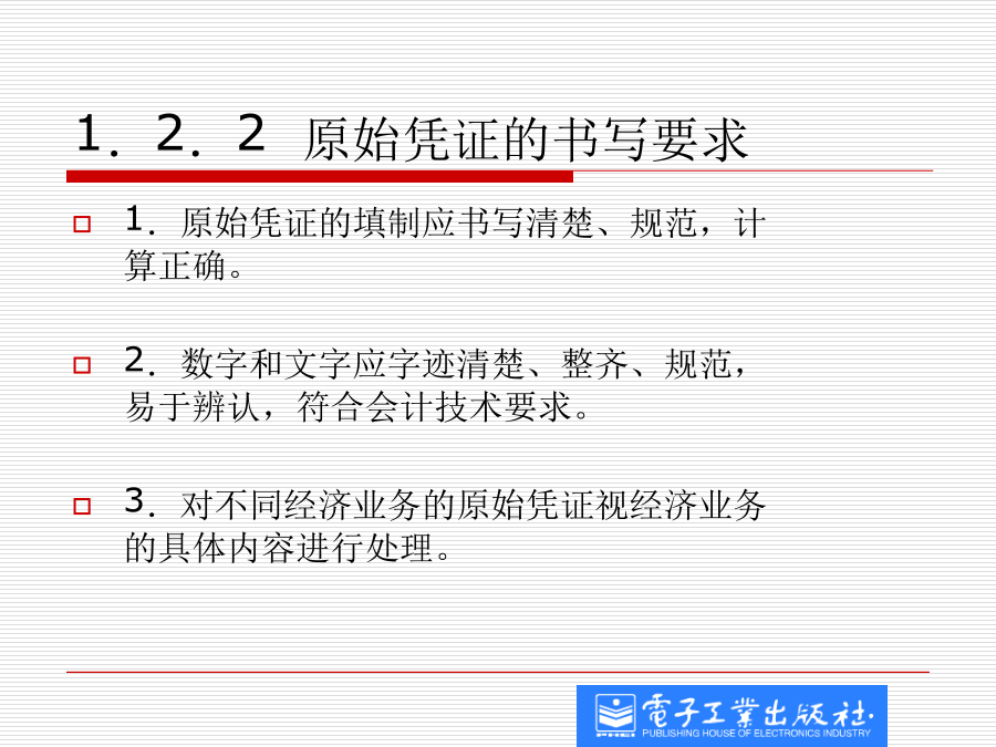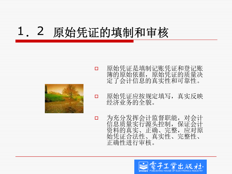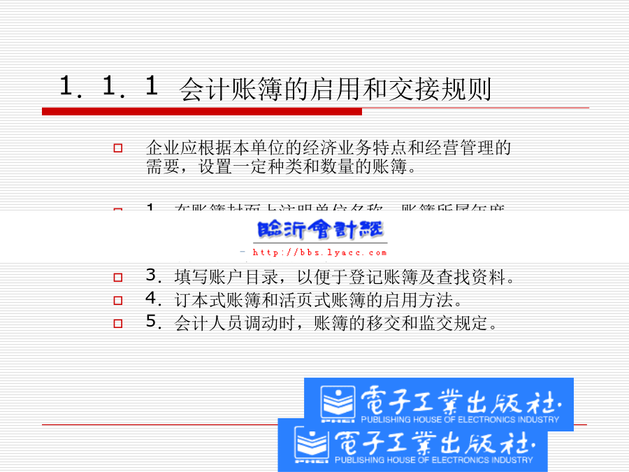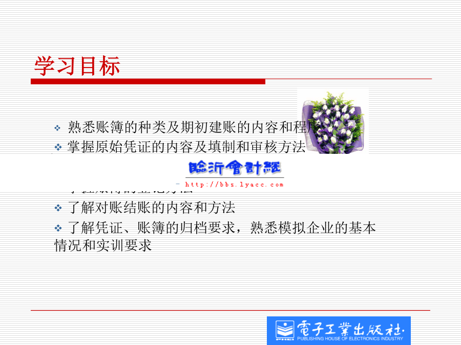 《企业会计实训教程》电子教案第1章企业会计实训基础知识学习目标1.1期初建账1.1.1会计账簿的启用和交接规则1.1.2建立分类账1.1.3建立日记账1.2原始凭证的填制和审核1.2.1原始凭证的填制要求1.2.2原始凭证的书写要求1.2.3原始凭证的审核内容1.3记账凭证的填制和审核1.3.1记账凭证的内容1.3.2记账凭证的格式1.3.3记账凭证的填制要求1.3.4记账凭证的审核1.4账簿的登记1.4.1账簿的登记规则1.4.2总分类账和明细分类账的平行登记1.4.3错账更正规则1.5对账和结账1.5.1对账的内容和方法1.5.2结账的内容和方法1.5.3凭证和账簿的归档第2章企业会计实训资料学习目标2.1企业会计实训的目的和要求1.实训目的2.实训要求3.实训组织形式2.2模拟工业企业基本情况介绍1.企业名称、类型、注册资金、经营范围等2.开户银行及账号3.内部机构设置2.3企业会计政策和会计核算方法1.账务处理程序2.货币资金的核算3.材料费用核算方法4.人工费用核算方法3.应付福利费、“三险一金”和工会、职工教育经费的计提6.资产减值准备的计提7.固定资产的核算8.制造费用和辅助生产成本的分配方法9.产品制造成本的计算方法10.产成品发出的核算及销售成本的计算方法11.各项税金和附加的计提依据和计提标准12.长期股权投资的核算方法13.外币业务的核算方法14.增值税的核算方法15.所得税的核算方法16.借款费用的核算方法第3章建账资料3.1总账和明细账的期初余额3.2各种费用明细项目第4章企业经济业务与原始凭证1.1日,采购部陈新报销差旅费1552.00元,退回现金448.00元。2.1日,向合肥华普公司销售混合器100台,不含税单价1000元/台,收到转账支票一张,金额117000.00元,存入光大银行。3.1日,办公室报销交通费350.00元,报销业务招待费2100.00元,出纳以现金付讫。4.2日,接光大银行通知,安庆东方电子公司偿还前欠货款234000.00元。5.2日,签发现金支票一张,自光大银行提取现金12000.00元备用。6.3日,签发转账支票一张,金额86580元,通过光大银行向合肥锦湘元件器材厂支付货款,购入1#芯片200百片,单价190元/百片,2#芯片200百片,单价180元/百片,另以现金支付运杂费7918.00元。原材料已验收入库。7.3日,财务部陈慧、李国忠报销会计人员后续教育培训费800.00元,出纳以现金付讫。8.4日,签发转账支票一张,通过光大银行向安徽电视台支付广告费30000.00元。9.5日,交纳上月未交增值税123450.00元,城市维护建设税8641.50元,教育费附加3703.50元,地方教育费附加1234.50元,代扣职工个人所得税3652.00元,收到各项税金及附加的税收缴款书(上月增值税进项税198521.80元,已交税金56327.20元,销项税金377264.00元,进项税额转出1035元,应税销售额2219200元)。10.5日,通过合肥安太证券公司以107000.00元的价格购入2003年1月5日发行的三年期国债,该债券到期还本付息,债券年利率3.6%,票面价值100000元,另支付相关税费500.00元,款项已通过光大银行转账支付。11.5日,接光大银行通知,向合肥电信公司支付上月电话费5035.00元。其中:管理部门电话费2790.00元,销售部电话费987.00元,一车间电话费285.00元,二车间电话费351.00元,装配车间电话费365.00元,机修车间电话费257.00元。12.6日,向光大银行申请银行汇票一张,票面金额140000.00元,收款人为马鞍山电子器材公司,交采购部陈新采购高频器和线路板。13.6日,生产技术部报销劳动保护用品1650元,发放给各部门和职工;销售部报销市内交通费253元,财务部报销购买支票款120元,出纳以现金付讫。14.6日,预付合肥朝阳工具厂货款5000.00元,定购生产工具2#、修理工具1#、2#,款项已通过光大银行转账支付。15.6日,向安徽至诚会计师事务所支付2004年年度会计报表审计费22500.00元,款项已通过光大银行转账支付。16.7日,南京三花公司开具的无息商业承兑汇票到期,委托银行收款,已收到光大银行的收款通知。17.8日,向马鞍山电子器材公司采购的高频器500件,单价200元/件;线路板500件,单价30元/件;已运抵惠源有限责任公司并办理验收入库手续,增值税发票注明价款115000元,税款19550.00元,价税合计134550.00元,用本月6日办理的银行汇票结算。18.8日,向合肥第一百货公司购买食品发放给职工,开具转账支票,通过光大银行支付款项15630.00元。19.9日,按与中国人