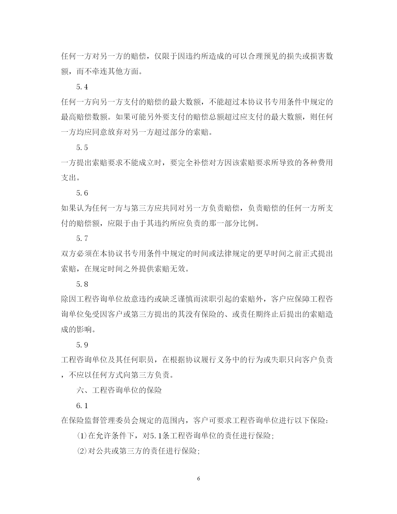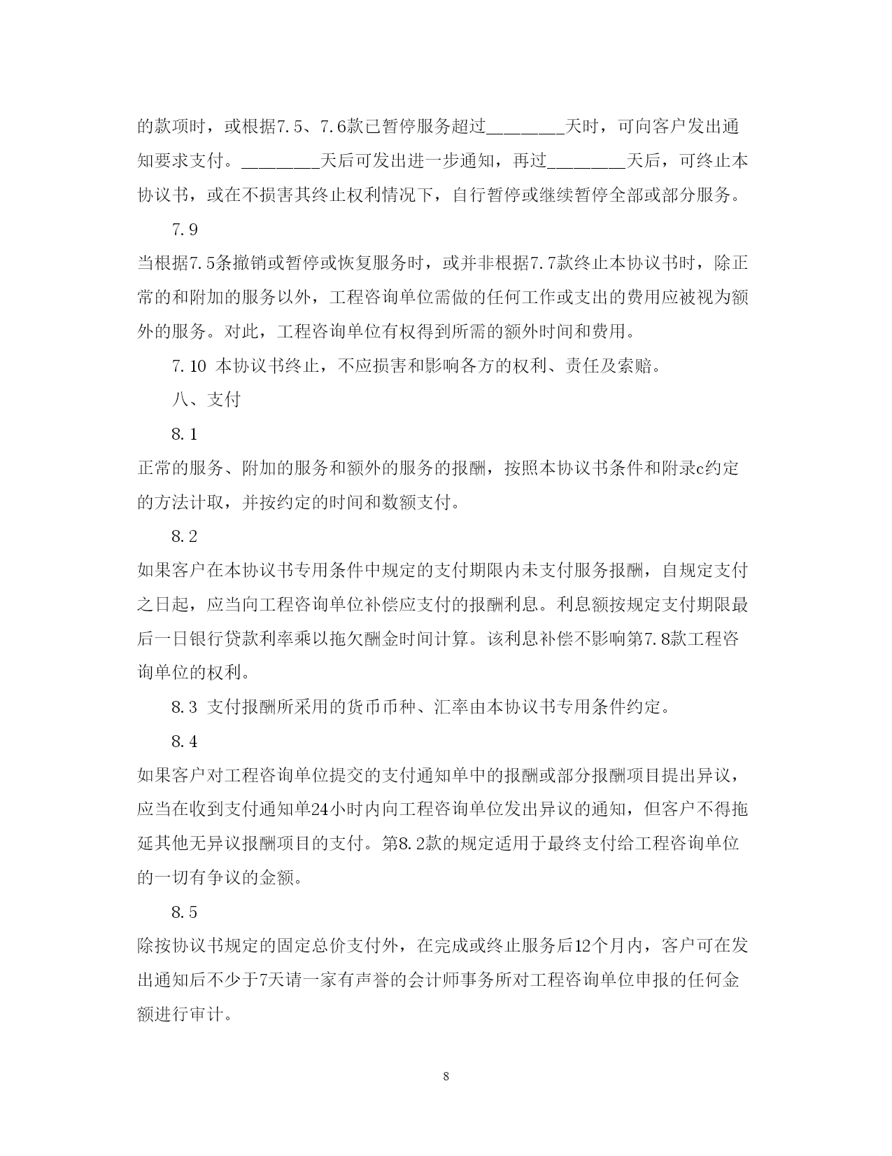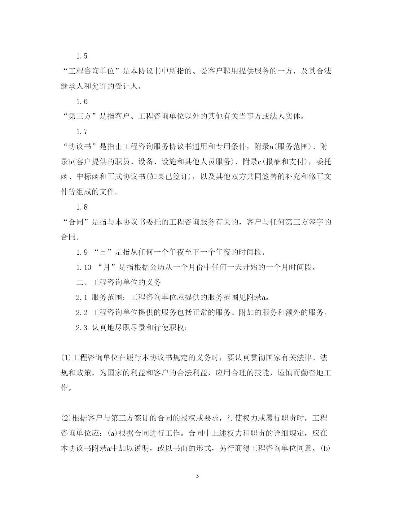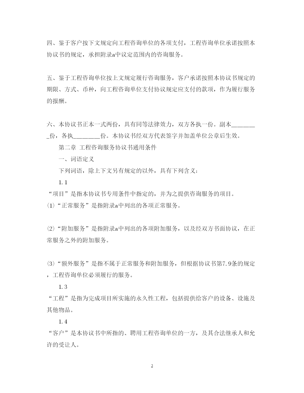 此资料由网络收集而来,如有侵权请告知上传者立即删除。资料共分享,我们负责传递知识。PAGEPAGE302020年工程咨询服务合同范本合同(Contract),又称为契约、协议,是平等的当事人之间设立、变更、终止民事权利义务关系的协议。合同作为一种民事法律行为,是当事人协商一致的产物,是两个以上的意思表示相一致的协议。只有当事人所作出的意思表示合法,合同才具有国家法律约束力。依法成立的合同从成立之日起生效,具有国家法律约束力。下面是小编收集整理的20xx年工程咨询服务合同范本,欢迎借鉴参考。20xx年工程咨询服务合同范本(一)_________(以下简称“客户”)与_________(以下简称”工程咨询单位”)经过双方协商一致,签订本协议。第一章前言一、客户委托工程咨询单位提供_________咨询服务,并已接受工程咨询单位为履行该服务所提出的建议书和其他报价等文件。二、本协议中的词语与所属的服务协议书条件及有关附件同义。三、下列文件均为本协议书的组成部分:3.1委托函或中标函;3.2工程咨询服务协议书通用条件;3.3工程咨询服务协议书专用条件;3.4附录:附录a:委托工程咨询服务范围;附录b:客户提供的职员、设备、设施和其他人员的服务;附录c:报酬和支付;3.5在实施过程中共同签署的补充和修正文件。四、鉴于客户按下文规定向工程咨询单位的各项支付,工程咨询单位承诺按照本协议书的规定,承担附录a中议定范围内的咨询服务。五、鉴于工程咨询单位按上文规定履行咨询服务,客户承诺按照本协议书规定的期限、方式、币种,向工程咨询单位支付协议规定应支付的款项,作为履行服务的报酬。六、本协议书正本一式两份,具有同等法律效力,双方各执一份。副本_________份,各执_________份。本协议书经双方代表签字并加盖单位公章后生效。第二章工程咨询服务协议书通用条件一、词语定义下列词语,除上下文另有规定的以外,具有下列含义:1.1“项目”是指本协议书专用条件中指定的,并为之提供咨询服务的项目。(1)“正常服务”是指附录a中列出的各项正常服务。(2)“附加服务”是指附录a中列出的各项附加服务,以及经双方书面协议,在正常服务之外的附加服务。(3)“额外服务”是指不属于正常服务和附加服务,但根据协议书第7.9条的规定,工程咨询单位必须履行的服务。1.3“工程”是指为完成项目所实施的永久性工程,包括提供给客户的设备、设施及其他物品。1.4“客户”是本协议书中所指的、聘用工程咨询单位的一方,及其合法继承人和允许的受让人。1.5“工程咨询单位”是本协议书中所指的、受客户聘用提供服务的一方,及其合法继承人和允许的受让人。1.6“第三方”是指客户、工程咨询单位以外的其他有关当事方或法人实体。1.7“协议书”是指由工程咨询服务协议书通用和专用条件,附录a(服务范围)、附录b(客户提供的职员、设备、设施和其他人员服务)、附录c(报酬和支付),委托函、中标函和正式协议书(如果已签订),以及其他双方共同签署的补充和修正文件等组成的文件。1.8“合同”是指与本协议书委托的工程咨询服务有关的,客户与任何第三方签字的合同。1.9“日”是指从任何一个午夜至下一个午夜的时间段。1.10“月”是指根据公历从一个月份中任何一天开始的一个月时间段。二、工程咨询单位的义务2.1服务范围:工程咨询单位应提供的服务范围见附录a。2.2工程咨询单位提供的服务包括正常的服务、附加的服务和额外的服务。2.3认真地尽职尽责和行使职权:(1)工程咨询单位在履行本协议书规定的义务时,要认真贯彻国家有关法律、法规和政策,为国家的利益和客户的合法利益,应用合理的技能,谨慎而勤奋地工作。(2)根据客户与第三方签订的合同的授权或要求,行使权力或履行职责时,工程咨询单位应:(a)根据合同进行工作。合同中上述权力和职责的详细规定,应在本协议书附录a中加以说明,或以书面的形式,另行商得工程咨询单位同意。(b)在客户和第三方之间提供证明、行使决定权或处理权时,不是作为仲裁人,而是作为独立的专业人员,依据自己的专业技能和判断,公正地进行工作。(c)在变更任何第三方的义务时,对于可能对费用或质量或时间有重大影响的任何变更,须事先得到客户的批准(发生紧急情况除外,但事后工程咨询单位应尽快通知客户)。2.4客户的财产工程咨询单位使用的由客户提供或支付费用的物品,属于客户的财产。当服务完成或终止时,工程咨询单位应将尚未消费的物品库存清单提交给客户,并按客户的指示移交此类物品。此项工作应视为附加的服务。三、客户的义务3.1客户应在不耽误服务的合理时间内,免费向工程咨询单位提供他能获取的、与服务有关的一切资料。3.2客户应在双方