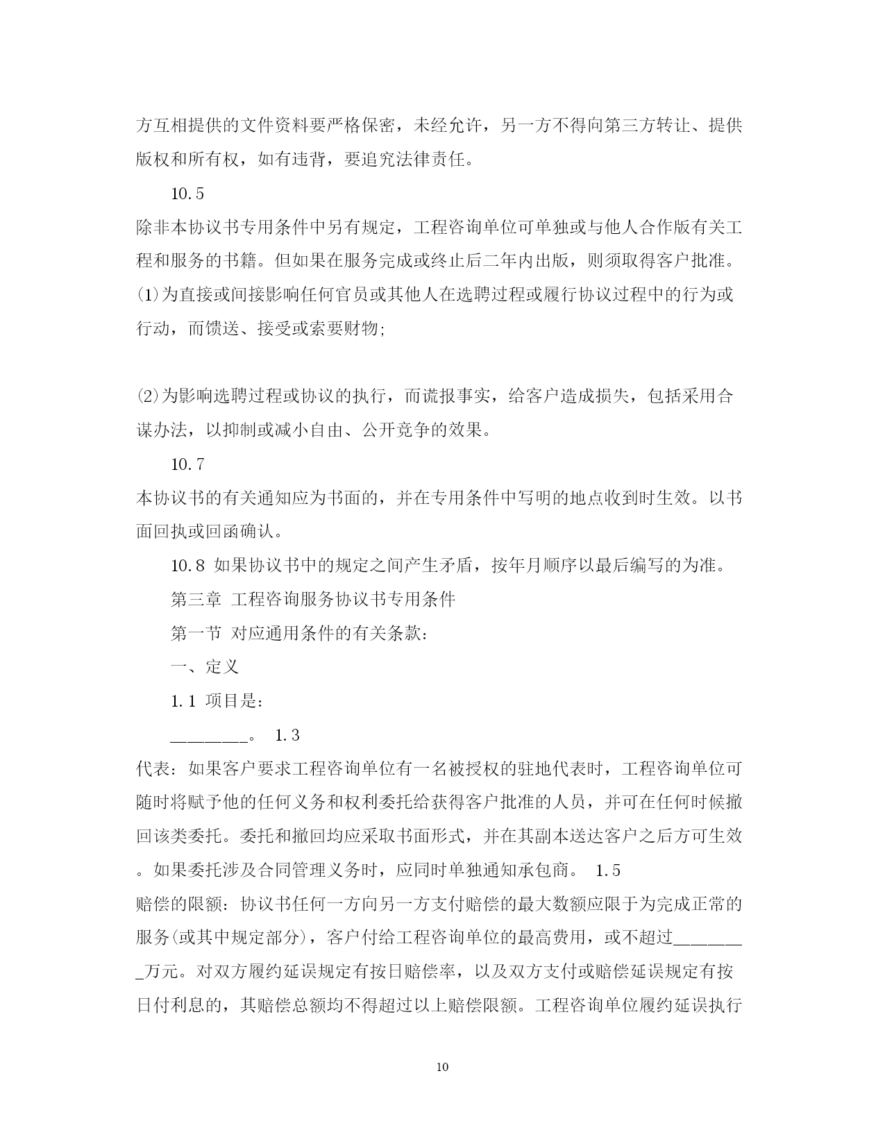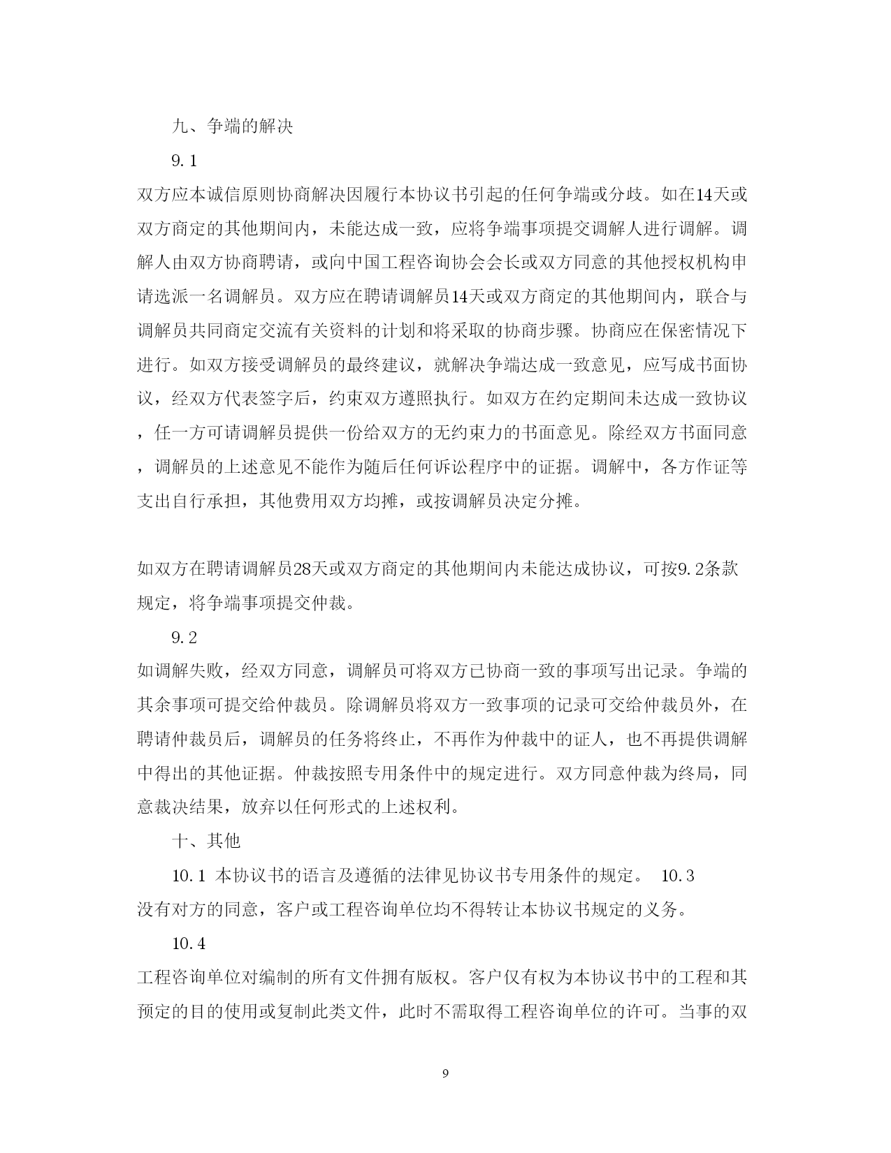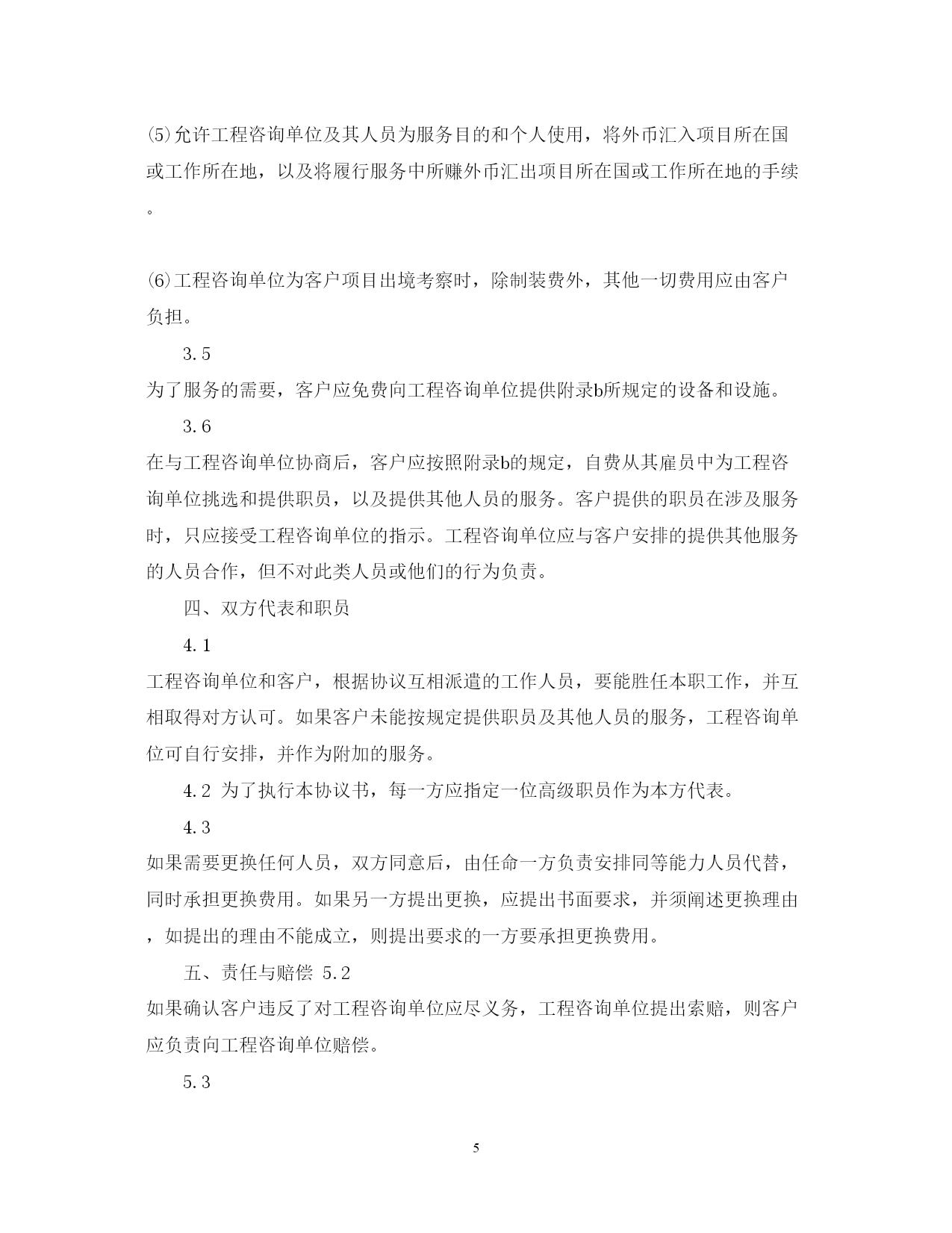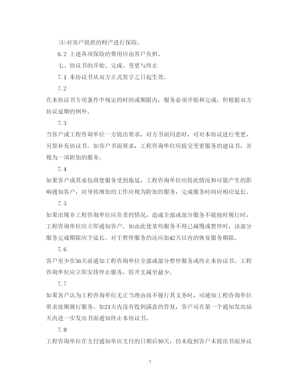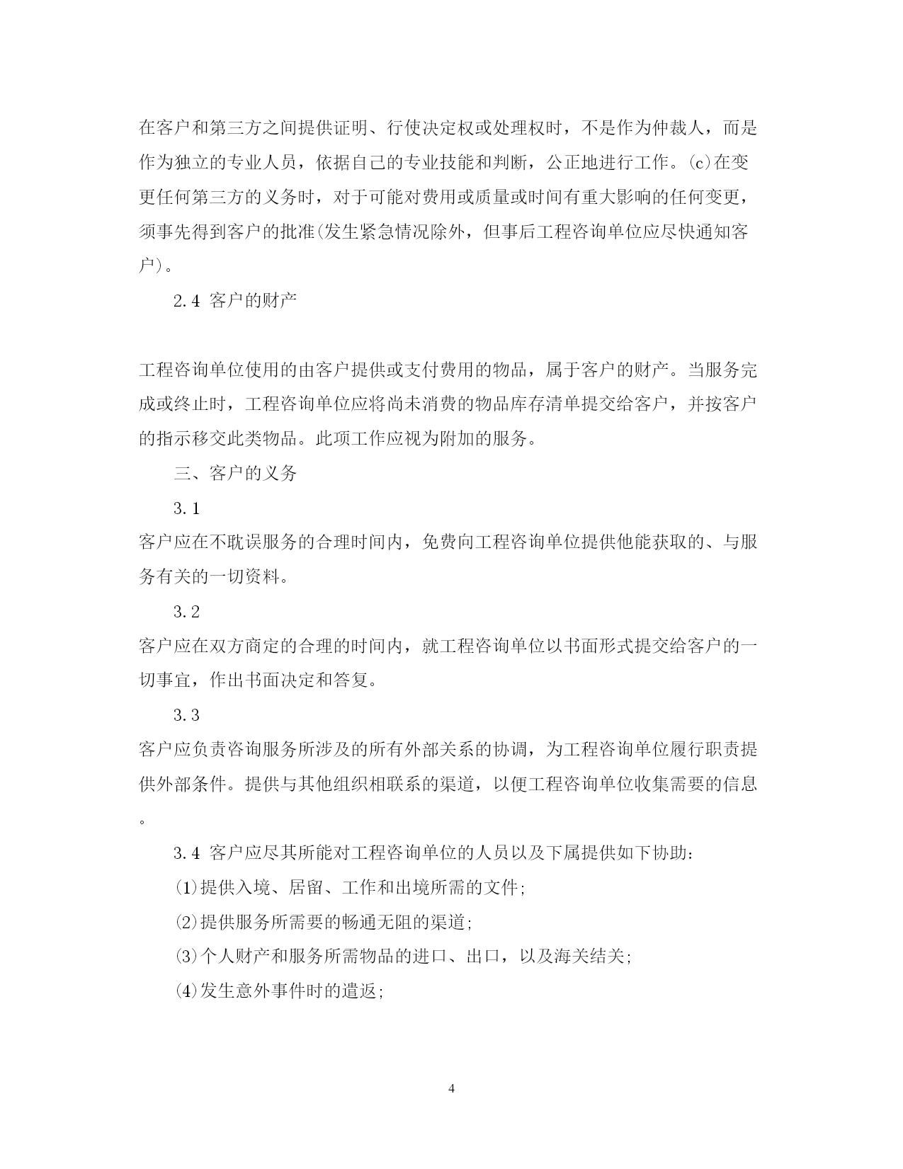 此资料由网络收集而来,如有侵权请告知上传者立即删除。资料共分享,我们负责传递知识。PAGEPAGE302020年工程咨询服务合同范本合同(Contract),又称为契约、协议,是平等的当事人之间设立、变更、终止民事权利义务关系的协议。合同作为一种民事法律行为,是当事人协商一致的产物,是两个以上的意思表示相一致的协议。只有当事人所作出的意思表示合法,合同才具有国家法律约束力。依法成立的合同从成立之日起生效,具有国家法律约束力。下面是小编收集整理的20xx年工程咨询服务合同范本,欢迎借鉴参考。20xx年工程咨询服务合同范本(一)_________(以下简称“客户”)与_________(以下简称”工程咨询单位”)经过双方协商一致,签订本协议。第一章前言一、客户委托工程咨询单位提供_________咨询服务,并已接受工程咨询单位为履行该服务所提出的建议书和其他报价等文件。二、本协议中的词语与所属的服务协议书条件及有关附件同义。三、下列文件均为本协议书的组成部分:3.1委托函或中标函;3.2工程咨询服务协议书通用条件;3.3工程咨询服务协议书专用条件;3.4附录:附录a:委托工程咨询服务范围;附录b:客户提供的职员、设备、设施和其他人员的服务;附录c:报酬和支付;3.5在实施过程中共同签署的补充和修正文件。四、鉴于客户按下文规定向工程咨询单位的各项支付,工程咨询单位承诺按照本协议书的规定,承担附录a中议定范围内的咨询服务。五、鉴于工程咨询单位按上文规定履行咨询服务,客户承诺按照本协议书规定的期限、方式、币种,向工程咨询单位支付协议规定应支付的款项,作为履行服务的报酬。六、本协议书正本一式两份,具有同等法律效力,双方各执一份。副本_________份,各执_________份。本协议书经双方代表签字并加盖单位公章后生效。第二章工程咨询服务协议书通用条件一、词语定义下列词语,除上下文另有规定的以外,具有下列含义:1.1“项目”是指本协议书专用条件中指定的,并为之提供咨询服务的项目。(1)“正常服务”是指附录a中列出的各项正常服务。(2)“附加服务”是指附录a中列出的各项附加服务,以及经双方书面协议,在正常服务之外的附加服务。(3)“额外服务”是指不属于正常服务和附加服务,但根据协议书第7.9条的规定,工程咨询单位必须履行的服务。1.3“工程”是指为完成项目所实施的永久性工程,包括提供给客户的设备、设施及其他物品。1.4“客户”是本协议书中所指的、聘用工程咨询单位的一方,及其合法继承人和允许的受让人。1.5“工程咨询单位”是本协议书中所指的、受客户聘用提供服务的一方,及其合法继承人和允许的受让人。1.6“第三方”是指客户、工程咨询单位以外的其他有关当事方或法人实体。1.7“协议书”是指由工程咨询服务协议书通用和专用条件,附录a(服务范围)、附录b(客户提供的职员、设备、设施和其他人员服务)、附录c(报酬和支付),委托函、中标函和正式协议书(如果已签订),以及其他双方共同签署的补充和修正文件等组成的文件。1.8“合同”是指与本协议书委托的工程咨询服务有关的,客户与任何第三方签字的合同。1.9“日”是指从任何一个午夜至下一个午夜的时间段。1.10“月”是指根据公历从一个月份中任何一天开始的一个月时间段。二、工程咨询单位的义务2.1服务范围:工程咨询单位应提供的服务范围见附录a。2.2工程咨询单位提供的服务包括正常的服务、附加的服务和额外的服务。2.3认真地尽职尽责和行使职权:(1)工程咨询单位在履行本协议书规定的义务时,要认真贯彻国家有关法律、法规和政策,为国家的利益和客户的合法利益,应用合理的技能,谨慎而勤奋地工作。(2)根据客户与第三方签订的合同的授权或要求,行使权力或履行职责时,工程咨询单位应:(a)根据合同进行工作。合同中上述权力和职责的详细规定,应在本协议书附录a中加以说明,或以书面的形式,另行商得工程咨询单位同意。(b)在客户和第三方之间提供证明、行使决定权或处理权时,不是作为仲裁人,而是作为独立的专业人员,依据自己的专业技能和判断,公正地进行工作。(c)在变更任何第三方的义务时,对于可能对费用或质量或时间有重大影响的任何变更,须事先得到客户的批准(发生紧急情况除外,但事后工程咨询单位应尽快通知客户)。2.4客户的财产工程咨询单位使用的由客户提供或支付费用的物品,属于客户的财产。当服务完成或终止时,工程咨询单位应将尚未消费的物品库存清单提交给客户,并按客户的指示移交此类物品。此项工作应视为附加的服务。三、客户的义务3.1客户应在不耽误服务的合理时间内,免费向工程咨询单位提供他能获取的、与服务有关的一切资料。3.2客户应在双方