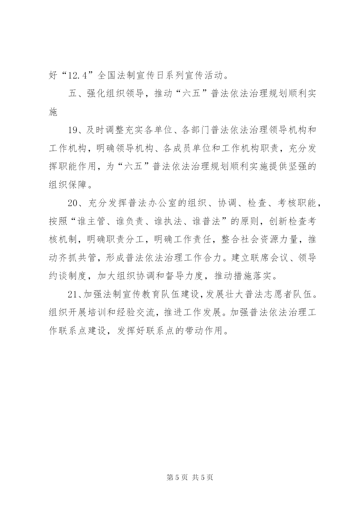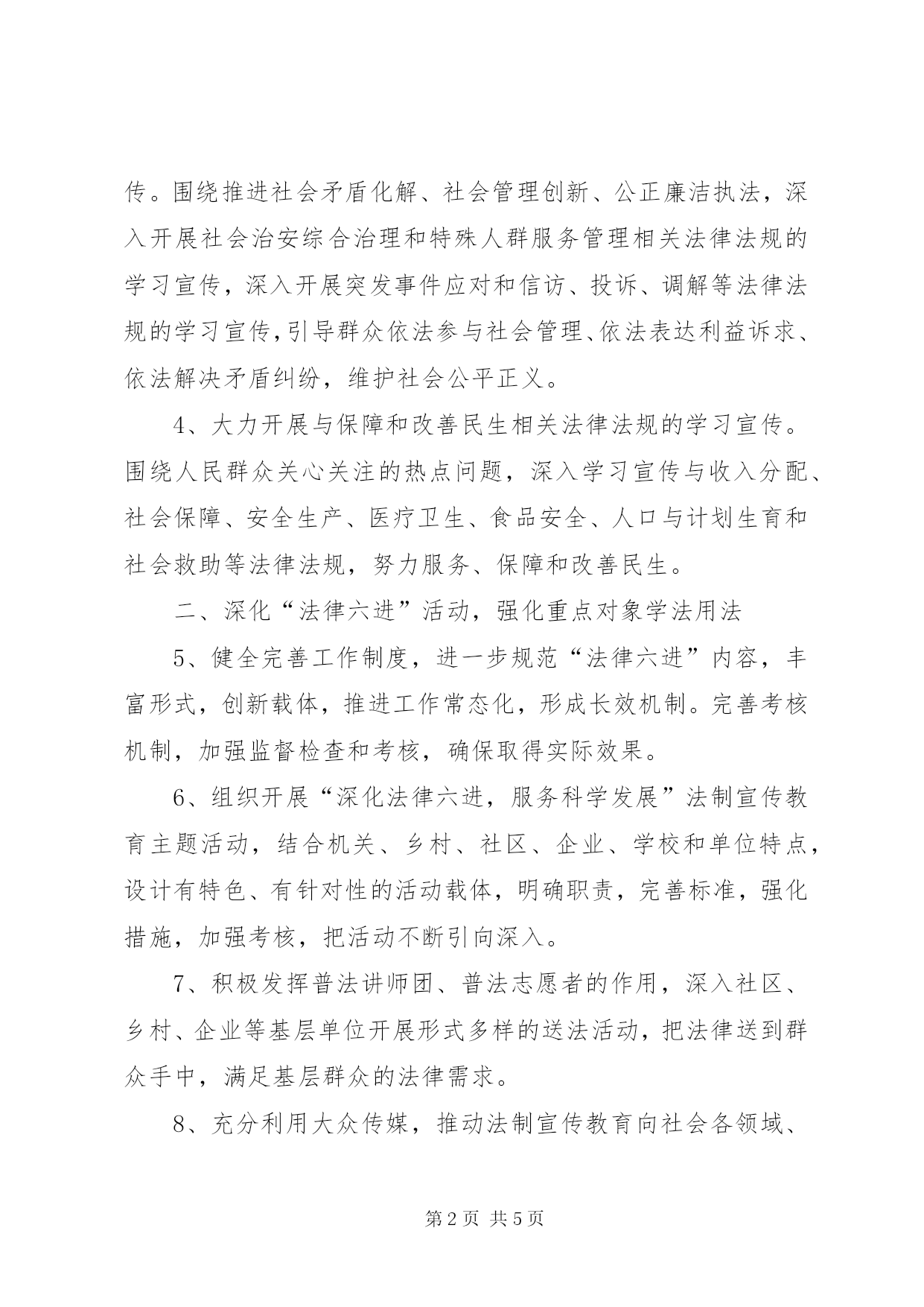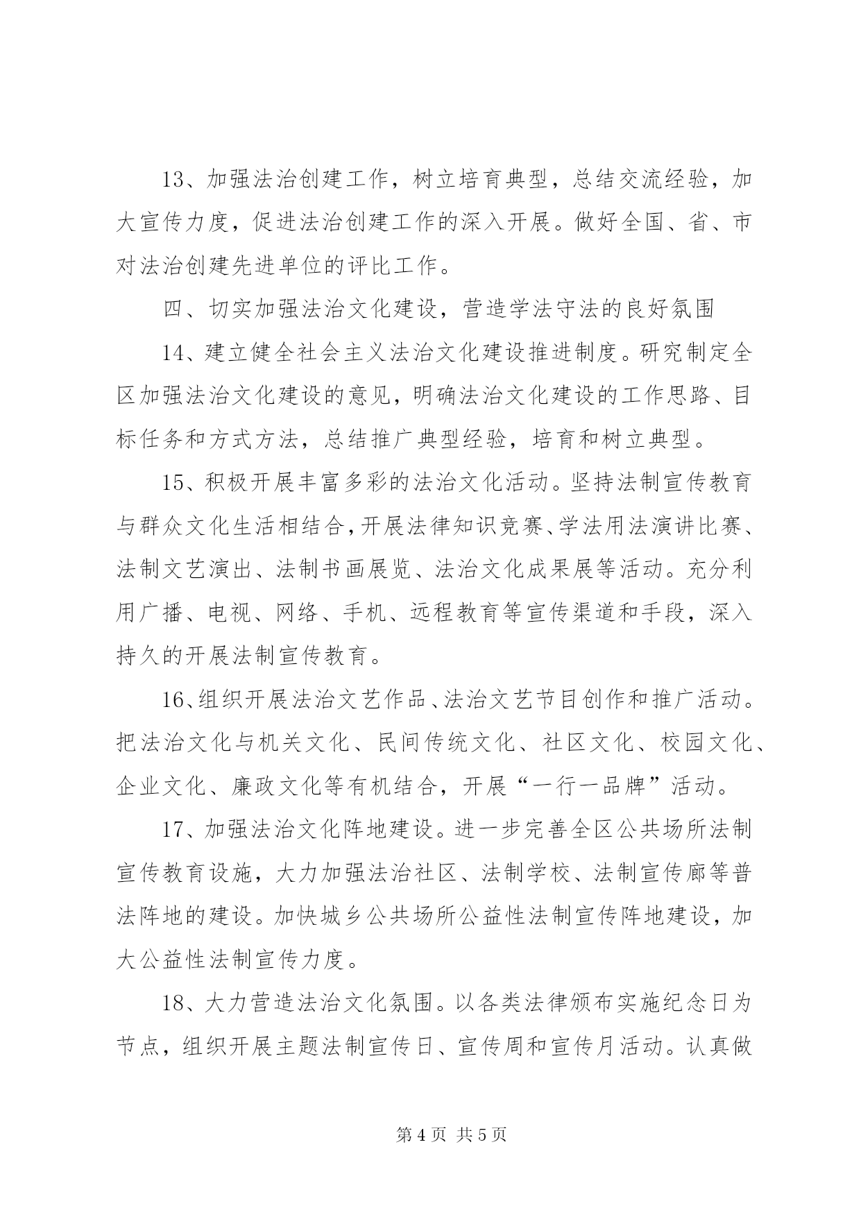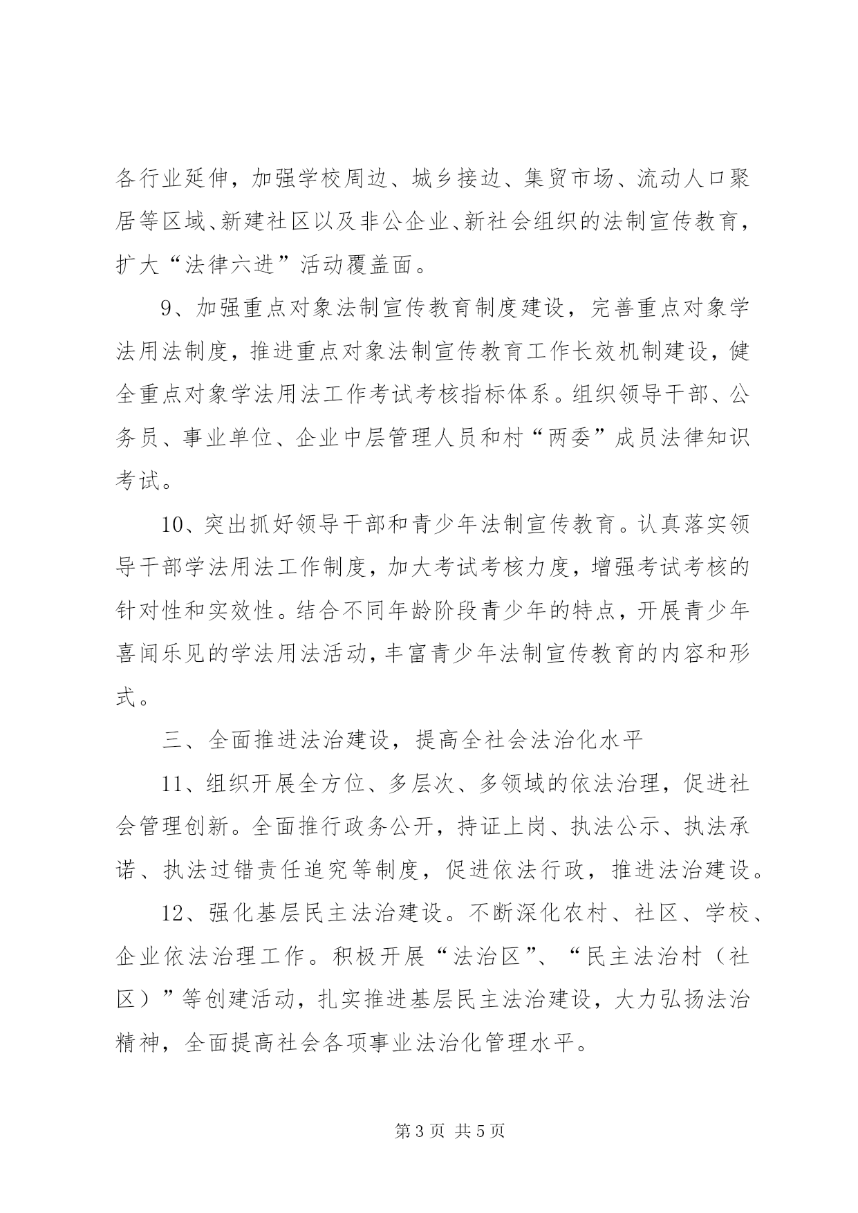 第PAGE\*Arabic\*MERGEFORMAT5页共NUMPAGES\*MERGEFORMAT5页区司法局普法依法治理要点年是全面实施“六五”普法规划的关键一年,也是实施“十二五”规划的重要一年。今年普法依法治理工作的指导思想是:以邓小平理论和“三个代表”重要思想为指导,深入贯彻落实科学发展观,全面贯彻落实区第十三次党代会会议精神,紧紧围绕区委、区政府“一五五三”的思路举措和工作提升年的总体要求,坚持以人为本、普法为民、法治惠民、文化育民,深入开展法制宣传教育,全面深化依法治理,积极推进法治建设,促进全区经济社会科学发展,服务保障改善民生,维护社会和谐稳定,为党的十八大胜利召开营造良好的法治环境。一、深入开展法制宣传教育,服务和促进经济文化强区建设1、大力开展宪法和中国特色社会主义法律体系的学习宣传。突出学习宪法和中国特色社会主义法律体系形成的重大意义,深入学习宣传国家基本法律的主要内容,深化社会主义法治理念教育,充分发挥法律在经济社会发展中的规范、引导和保障作用。2、大力开展与区域发展战略相关法律法规的学习宣传。学习宣传与区域协调发展战略和城乡规划建设管理相关法律法规,大力开展加快转变经济发展方式、经济结构战略性调整、加强和改善宏观调控、扩大消费需求、调整优化投资结构等相关法律法规的宣传,服务和推进区域协调发展。3、大力开展与加强和创新社会管理相关法律法规的学习宣传。围绕推进社会矛盾化解、社会管理创新、公正廉洁执法,深入开展社会治安综合治理和特殊人群服务管理相关法律法规的学习宣传,深入开展突发事件应对和信访、投诉、调解等法律法规的学习宣传,引导群众依法参与社会管理、依法表达利益诉求、依法解决矛盾纠纷,维护社会公平正义。4、大力开展与保障和改善民生相关法律法规的学习宣传。围绕人民群众关心关注的热点问题,深入学习宣传与收入分配、社会保障、安全生产、医疗卫生、食品安全、人口与计划生育和社会救助等法律法规,努力服务、保障和改善民生。二、深化“法律六进”活动,强化重点对象学法用法5、健全完善工作制度,进一步规范“法律六进”内容,丰富形式,创新载体,推进工作常态化,形成长效机制。完善考核机制,加强监督检查和考核,确保取得实际效果。6、组织开展“深化法律六进,服务科学发展”法制宣传教育主题活动,结合机关、乡村、社区、企业、学校和单位特点,设计有特色、有针对性的活动载体,明确职责,完善标准,强化措施,加强考核,把活动不断引向深入。7、积极发挥普法讲师团、普法志愿者的作用,深入社区、乡村、企业等基层单位开展形式多样的送法活动,把法律送到群众手中,满足基层群众的法律需求。8、充分利用大众传媒,推动法制宣传教育向社会各领域、各行业延伸,加强学校周边、城乡接边、集贸市场、流动人口聚居等区域、新建社区以及非公企业、新社会组织的法制宣传教育,扩大“法律六进”活动覆盖面。9、加强重点对象法制宣传教育制度建设,完善重点对象学法用法制度,推进重点对象法制宣传教育工作长效机制建设,健全重点对象学法用法工作考试考核指标体系。组织领导干部、公务员、事业单位、企业中层管理人员和村“两委”成员法律知识考试。10、突出抓好领导干部和青少年法制宣传教育。认真落实领导干部学法用法工作制度,加大考试考核力度,增强考试考核的针对性和实效性。结合不同年龄阶段青少年的特点,开展青少年喜闻乐见的学法用法活动,丰富青少年法制宣传教育的内容和形式。三、全面推进法治建设,提高全社会法治化水平11、组织开展全方位、多层次、多领域的依法治理,促进社会管理创新。全面推行政务公开,持证上岗、执法公示、执法承诺、执法过错责任追究等制度,促进依法行政,推进法治建设。12、强化基层民主法治建设。不断深化农村、社区、学校、企业依法治理工作。积极开展“法治区”、“民主法治村(社区)”等创建活动,扎实推进基层民主法治建设,大力弘扬法治精神,全面提高社会各项事业法治化管理水平。13、加强法治创建工作,树立培育典型,总结交流经验,加大宣传力度,促进法治创建工作的深入开展。做好全国、省、市对法治创建先进单位的评比工作。四、切实加强法治文化建设,营造学法守法的良好氛围14、建立健全社会主义法治文化建设推进制度。研究制定全区加强法治文化建设的意见,明确法治文化建设的工作思路、目标任务和方式方法,总结推广典型经验,培育和树立典型。15、积极开展丰富多彩的法治文化活动。坚持法制宣传教育与群众文化生活相结合,开展法律知识竞赛、学法用法演讲比赛、法制文艺演出、法制书画展览、法治文化成果展等活动。充分利用广播、电视、网络、手机、远程教育等宣传渠道和手段,深入持久的开展法制宣传教育。16、组织开展法治文艺作品、法治文艺节目创作和推广活动。把法治文化与机关文化、民间传统文化、社区文化、校园文化、企业文