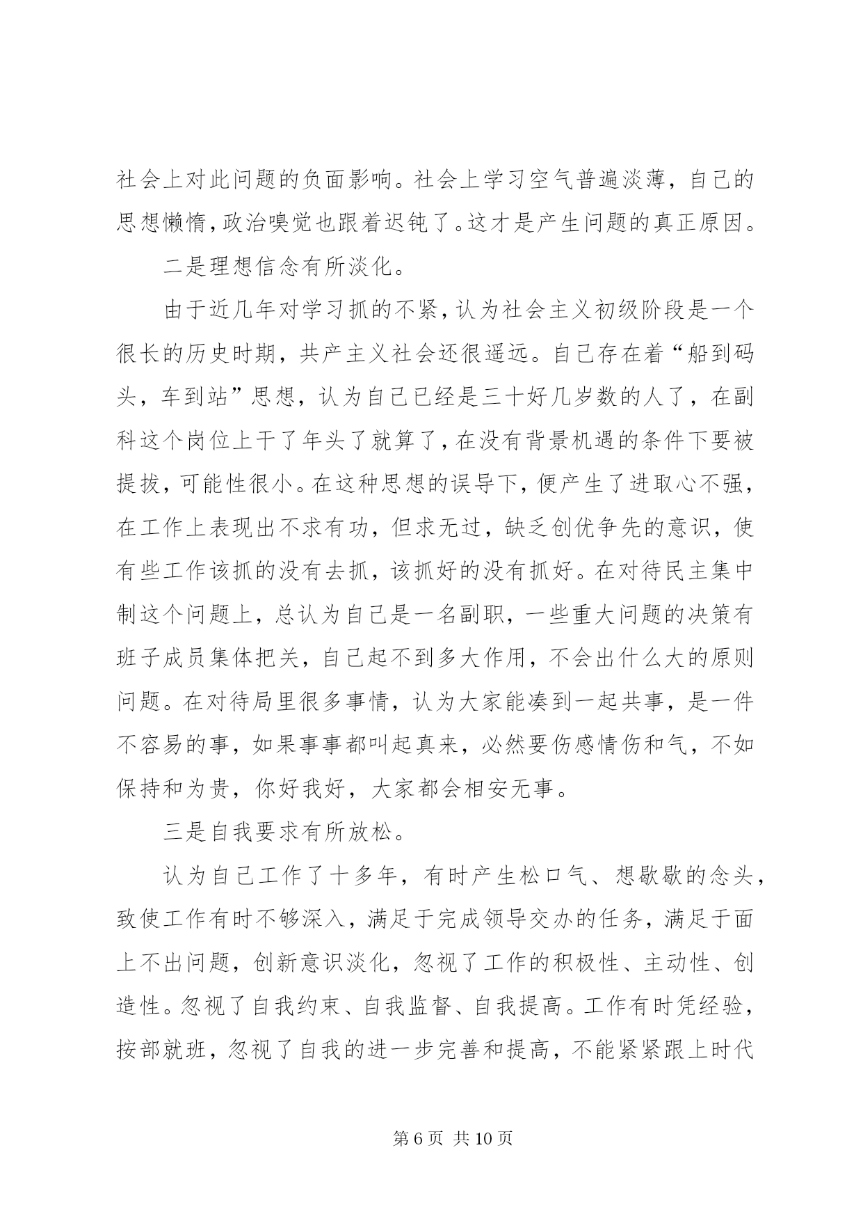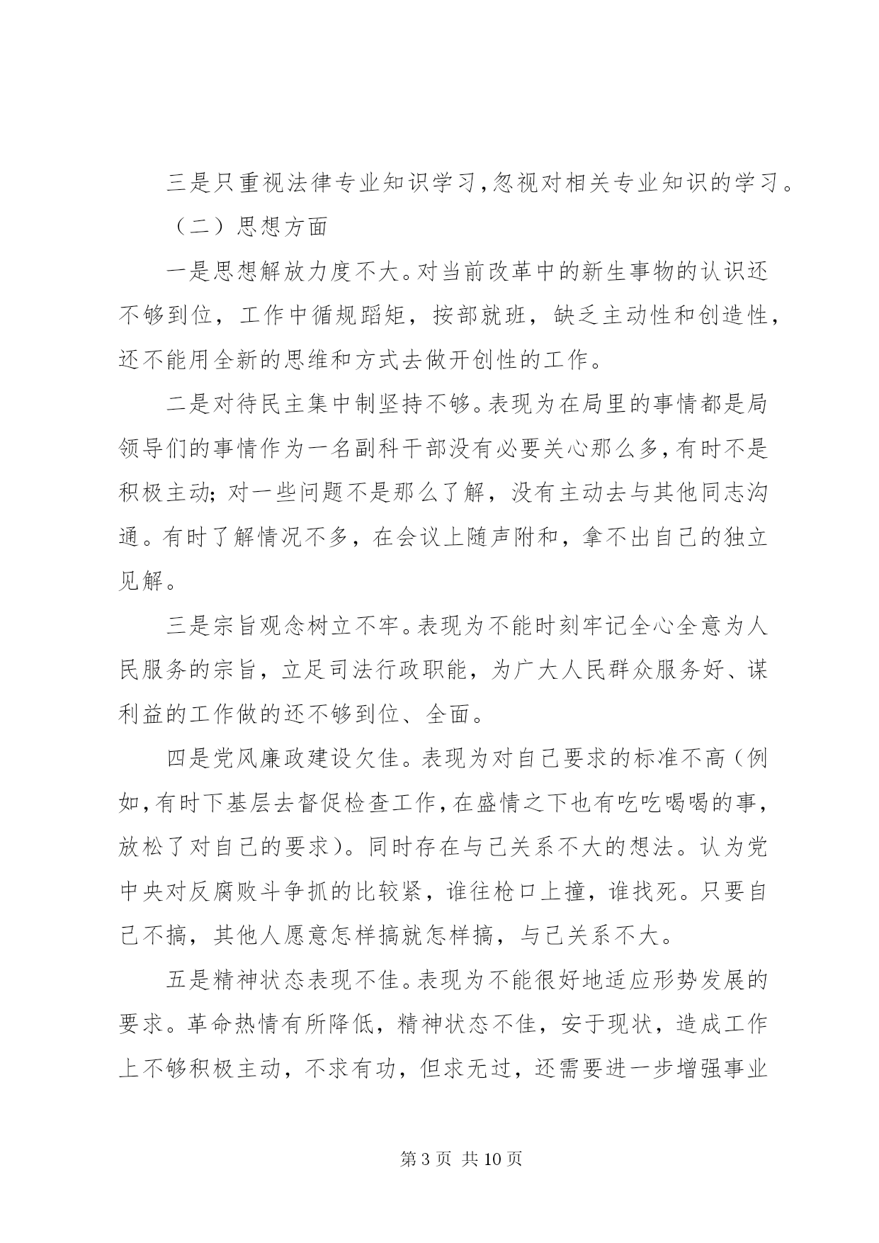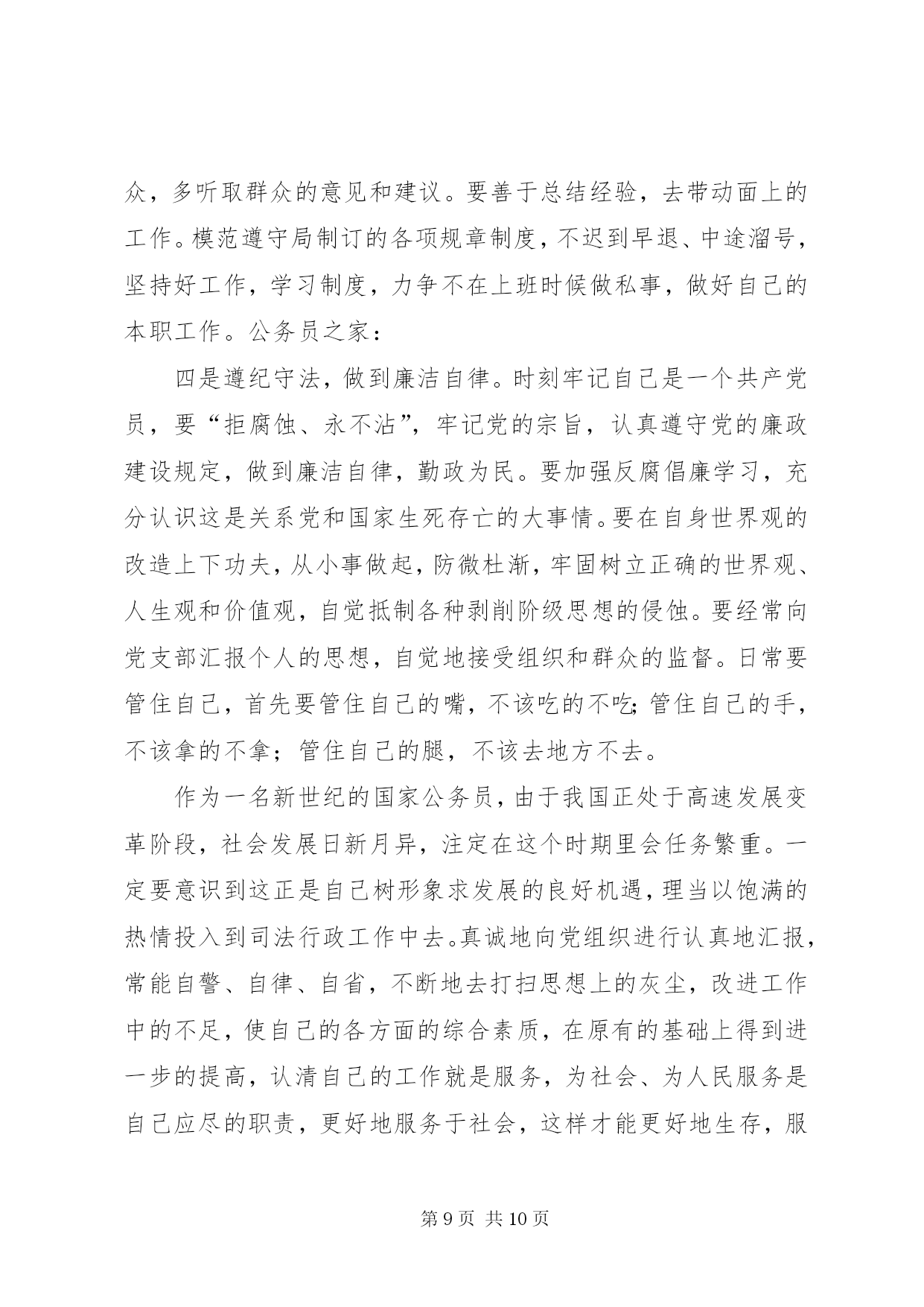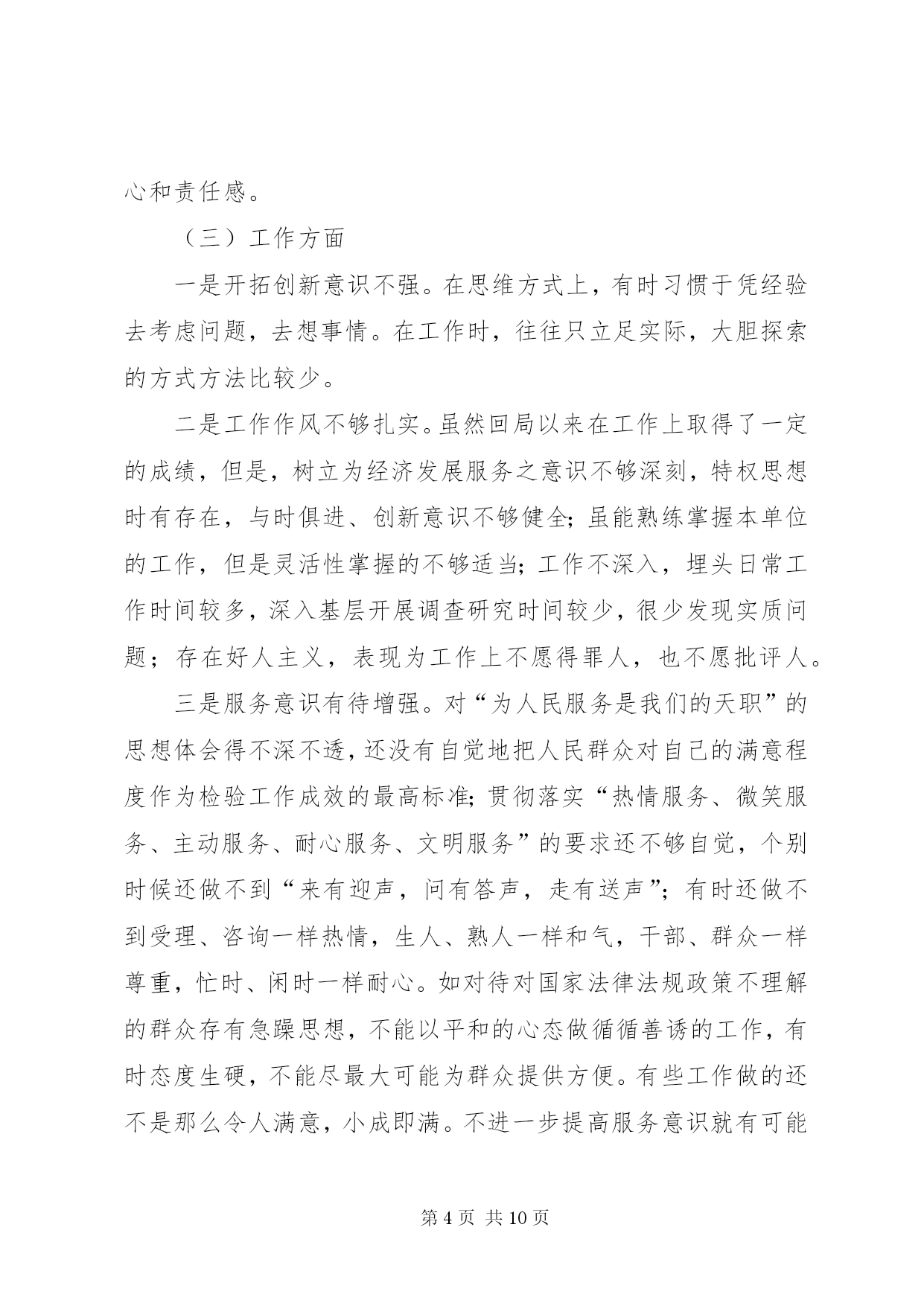 第PAGE\*Arabic\*MERGEFORMAT10页共NUMPAGES\*MERGEFORMAT10页公务员个人党性自我剖析材料我身为一名国家公务人员,通过认真学习党的十七大报告,十七届三中、四中全会精神,认真贯彻落实科学发展观理论,通过学习使自己认识到,作为一名司法行政工作人员,学习使自己克服了临时观点,使自己能专下心来想问题、干工作、办事情,自觉把学习共产党员先进性标准要求的过程,变成自我教育、自我提高、自我完善、增强党性的过程。同时,对照共产党员的先进性标准要求和不合格党员的主要表现,以此为镜子,认真查找自身存在的问题和不足。在认真回顾自己的工作,对自己的党性党风状况进行总结反思,现认真分析如下:一、自身存在的问题(一)学习方面总体上坚持学习不够自觉。日常工作中总是有意无意地放松了自我学习,忽视了知识能力的培养再造,学习的自觉性、主动性不强,忙于事务应酬,不愿挤出时间学,即使有了时间也坐不下来、深不进去。在理论学习上还不够用心,理论素养还比较浅薄,与本职业务有关的就学一点,与本职业务联系不紧的就不去学或者很少涉猎,在学习上搞实用主义,知识结构单一,把握形势、了解大局不深不透,还不善于研究思考问题,不善于理论联系实际。具体表现为:1、理论学习方面一是在理论学习上存在着应付思想。主要表现在学习态度不够认真、缺乏自觉性。只限于一般性地读书,对自己要求的不高,只求写读书笔记的数量,不求质量,使心得体会写的比较肤浅。二是理论学习太肤浅。对马列主义、毛泽东思想、邓小平理论和“三个代表”的重要思想深钻细研不够,满足于学习了,不全面、不系统,缺乏对科学体系和精神实质的把握。三是理论联系实际工作不够。由于学习的目的不够明确,导致学习归学习,理论和实际相脱节。没有把在当前改革开放的新形势下所遇到的问题与实际工作相联系起来,更谈不上从理论上去认识、去探讨,使自己在考虑和安排工作时缺乏前瞻性,不是处于推着干就是忙于眼前的任务。四是理论联系自己思想少。认为自己已是三十多岁的人了,世界观早就定型了。表现为缺乏开拓创新精神,争先意识不强,对自己工作标准要求的不高。2、专业学习方面一是在专业知识学习上没有计划,抓得不够紧。回顾这么多年的学习和工作,从现象上看,自己对专业知识学习还是比较重视的,但一直在学习上无计划,不能在有限的学习时间内,学习更多的知识。二是在专业知识学习上没有系统性,学习的深度不够,尤其是对深层次的专业理论知识学习、研究不够。三是只重视法律专业知识学习,忽视对相关专业知识的学习。(二)思想方面一是思想解放力度不大。对当前改革中的新生事物的认识还不够到位,工作中循规蹈矩,按部就班,缺乏主动性和创造性,还不能用全新的思维和方式去做开创性的工作。二是对待民主集中制坚持不够。表现为在局里的事情都是局领导们的事情作为一名副科干部没有必要关心那么多,有时不是积极主动;对一些问题不是那么了解,没有主动去与其他同志沟通。有时了解情况不多,在会议上随声附和,拿不出自己的独立见解。三是宗旨观念树立不牢。表现为不能时刻牢记全心全意为人民服务的宗旨,立足司法行政职能,为广大人民群众服务好、谋利益的工作做的还不够到位、全面。四是党风廉政建设欠佳。表现为对自己要求的标准不高(例如,有时下基层去督促检查工作,在盛情之下也有吃吃喝喝的事,放松了对自己的要求)。同时存在与己关系不大的想法。认为党中央对反腐败斗争抓的比较紧,谁往枪口上撞,谁找死。只要自己不搞,其他人愿意怎样搞就怎样搞,与己关系不大。五是精神状态表现不佳。表现为不能很好地适应形势发展的要求。革命热情有所降低,精神状态不佳,安于现状,造成工作上不够积极主动,不求有功,但求无过,还需要进一步增强事业心和责任感。(三)工作方面一是开拓创新意识不强。在思维方式上,有时习惯于凭经验去考虑问题,去想事情。在工作时,往往只立足实际,大胆探索的方式方法比较少。二是工作作风不够扎实。虽然回局以来在工作上取得了一定的成绩,但是,树立为经济发展服务之意识不够深刻,特权思想时有存在,与时俱进、创新意识不够健全;虽能熟练掌握本单位的工作,但是灵活性掌握的不够适当;工作不深入,埋头日常工作时间较多,深入基层开展调查研究时间较少,很少发现实质问题;存在好人主义,表现为工作上不愿得罪人,也不愿批评人。三是服务意识有待增强。对“为人民服务是我们的天职”的思想体会得不深不透,还没有自觉地把人民群众对自己的满意程度作为检验工作成效的最高标准;贯彻落实“热情服务、微笑服务、主动服务、耐心服务、文明服务”的要求还不够自觉,个别时候还做不到“来有迎声,问有答声,走有送声”;有时还做不到受理、咨询一样热情,生人、熟人一样和气,干部、群众一样尊重,忙时、闲时一样耐心。如对待对国家法律法规政策不理解的群众存有急躁思想,不能