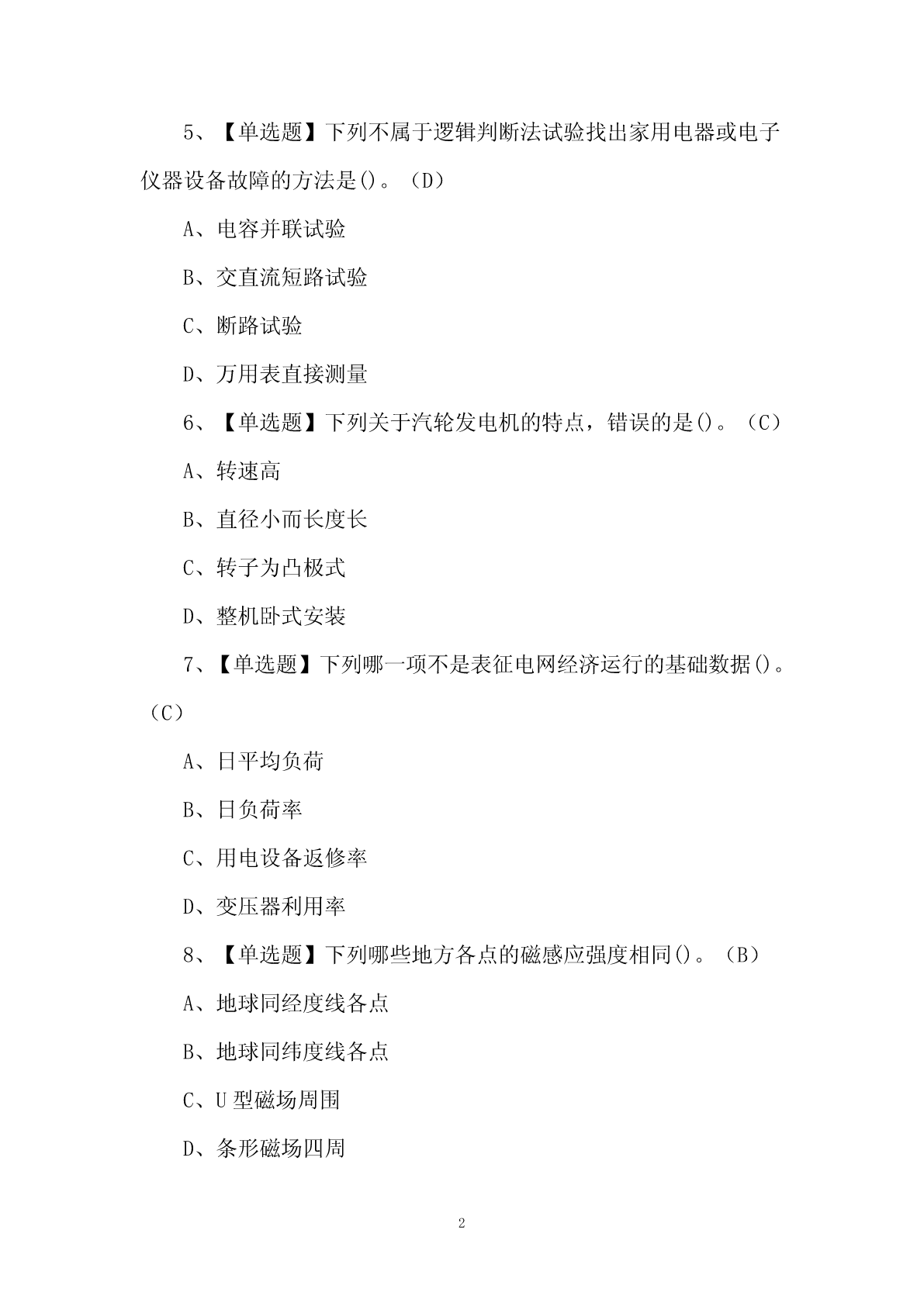 2024年电工(高级)理论试题及答案1、【单选题】17化成二进制数为()。(A)A、10001B、10101C、10111D、100102、【单选题】35KV油开关的主要结构有哪些()。(C)A、提升机构、油箱、导电系统B、电容套管、电流互感器操作机构C、油箱灭弧室、导电系统、电容套管D、油箱、铁架、升降机构、导电系统3、【单选题】三相桥式半控整流电路中,每只晶闸管通态平均电流为负载平均电流的()。(C)A、1B、1/2C、1/3D、1/64、【单选题】下列()不是同步电动机的起动方法。(B)A、辅助电动机起动方法B、辅助电容起动方法C、调频起动法D、异步起动法15、【单选题】下列不属于逻辑判断法试验找出家用电器或电子仪器设备故障的方法是()。(D)A、电容并联试验B、交直流短路试验C、断路试验D、万用表直接测量6、【单选题】下列关于汽轮发电机的特点,错误的是()。(C)A、转速高B、直径小而长度长C、转子为凸极式D、整机卧式安装7、【单选题】下列哪一项不是表征电网经济运行的基础数据()。(C)A、日平均负荷B、日负荷率C、用电设备返修率D、变压器利用率8、【单选题】下列哪些地方各点的磁感应强度相同()。(B)A、地球同经度线各点B、地球同纬度线各点C、U型磁场周围D、条形磁场四周29、【单选题】下列哪种情况,自动重合闸装置,不应动作()。(D)A、线路瞬时故障B、线路永久故障C、断路器状态与操作把手位置不对应引起的跳闸D、用控制开关断开断路器10、【单选题】下列数据中,属于用电特性指标的资料数据是()。(C)A、月平均负荷B、最大负荷利用小时数C、日负荷率D、负荷逐月变化曲线11、【单选题】为了保证电能表的准确度,其安装倾斜度的标准是()。(D)A、小于5°B、小于15°C、小于30°D、严格垂直安装12、【单选题】二极管为什么可以当作开关来使用()。(A)A、二极管具有单向导电性B、不改变输入脉冲的形状C、正向电流大于反向电流3D、同负载有关13、【单选题】从工时定额管理方面下列()方法不能缩短辅助时间。(A)A、增加辅助工人员的数量B、采用新工艺,改进设备C、推广先进的操作方法D、把加工过程改为自动化14、【单选题】共基极电路的接线方法,下列叙述正确的是()。(B)A、将基极接地,发射极与基极为输入端,集电极与发射极为输出端B、将基极接地,发射极与基极为输入端,集电极与基极为输出端C、将基极接地,发射极与集电极为输入端D、将基极接地,集电极与发射极为输出端15、【单选题】关于隔离开关的作用下列哪个叙述是对的()。(C)A、用于切断负荷电流B、用于切断短路电流C、切断小电流,隔离带电设备D、仅起隔离作用,不能操作任何电流16、【单选题】制作35KV588乙型电缆终端头时,要求出线梗与缆芯导体有可靠的连接,出线梗截面不小于缆芯截面的()倍。(B)4A、1B、1.5C、2D、2.517、【单选题】加在差动放大器两输入端的信号为()的信号叫做共模输入信号。(A)A、幅值相同且极性相同B、幅值相同而极性相反C、幅值不同且极性相反D、幅值不同而极性相同18、【单选题】单向可控硅可靠导通后,降低控制极电流,可控硅将()。(D)A、仍然导通B、永远导通C、关断D、视阳、阴极电压极性而定19、【单选题】单相桥式半控整流最多可使用()只整流二极管。(D)A、1B、2C、3D、4520、【单选题】单结晶体管触发器的最大特点是()。(B)A、输出脉冲前沿陡度较好B、功率增益大,温度补偿性能好C、可以方便地整定脉冲宽度D、触发脉冲稳定21、【单选题】单结晶体管触发电路具有()的特点。(A)A、工作电流大,可靠性高B、工作电流小,可靠性高C、工作电流大,可靠性差D、工作电流小,可靠性差22、【单选题】变配电控制二次线在混凝土或砖结构上敷设时,导线与混凝土表面间距离一般为()。(A)A、10mmB、20mmC、50mmD、100mm23、【单选题】同步信号为锯齿波的触发电路的主要优点是()。(D)A、不受电网电压波动与波形畸变的影响B、抗干扰能力强C、移相范围宽D、上述说法全对624、【单选题】在双