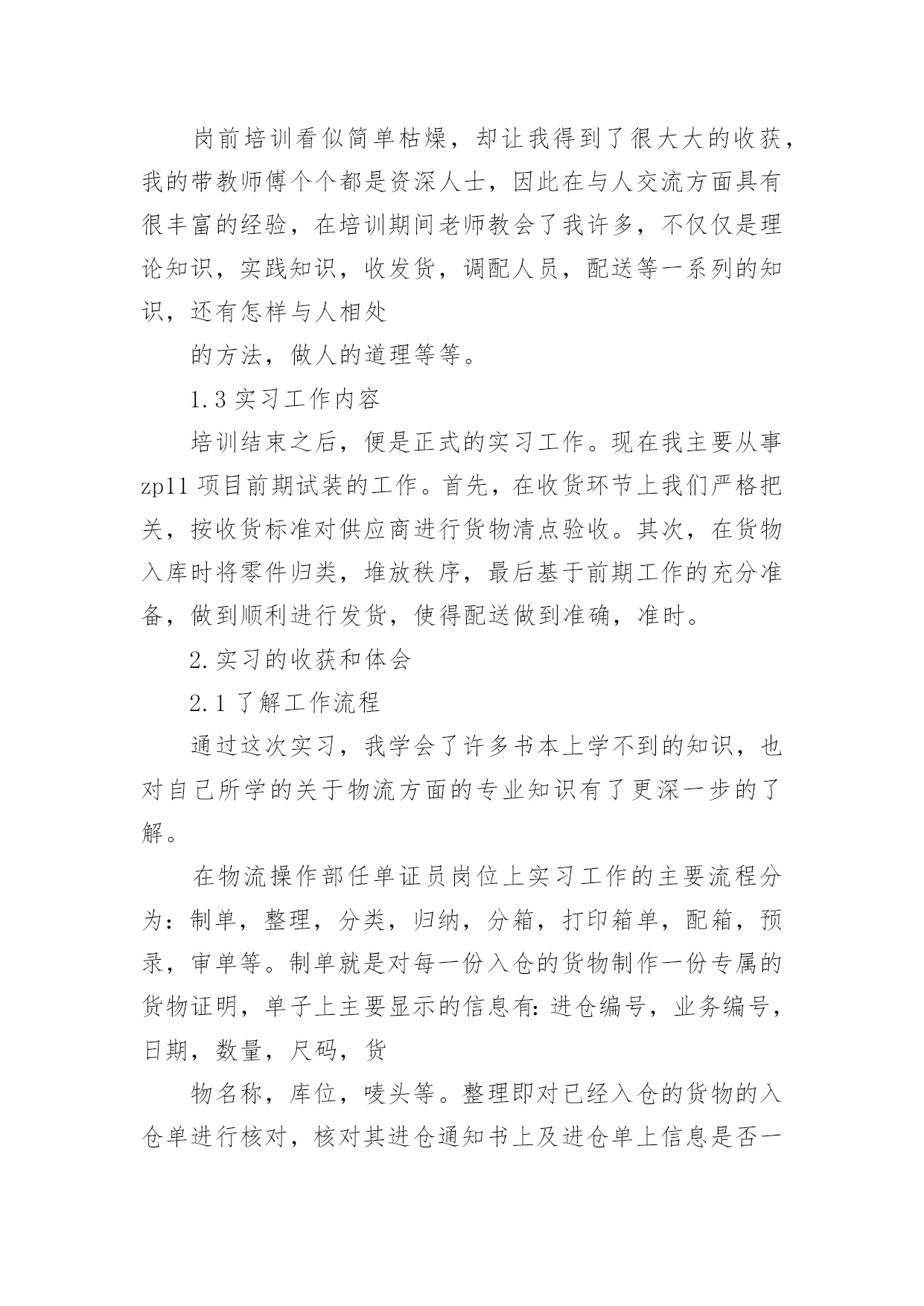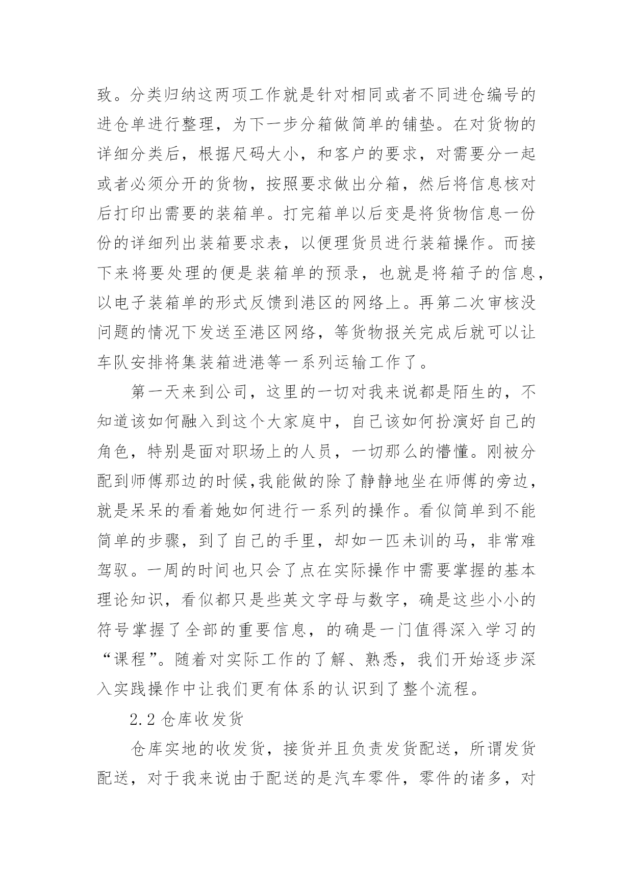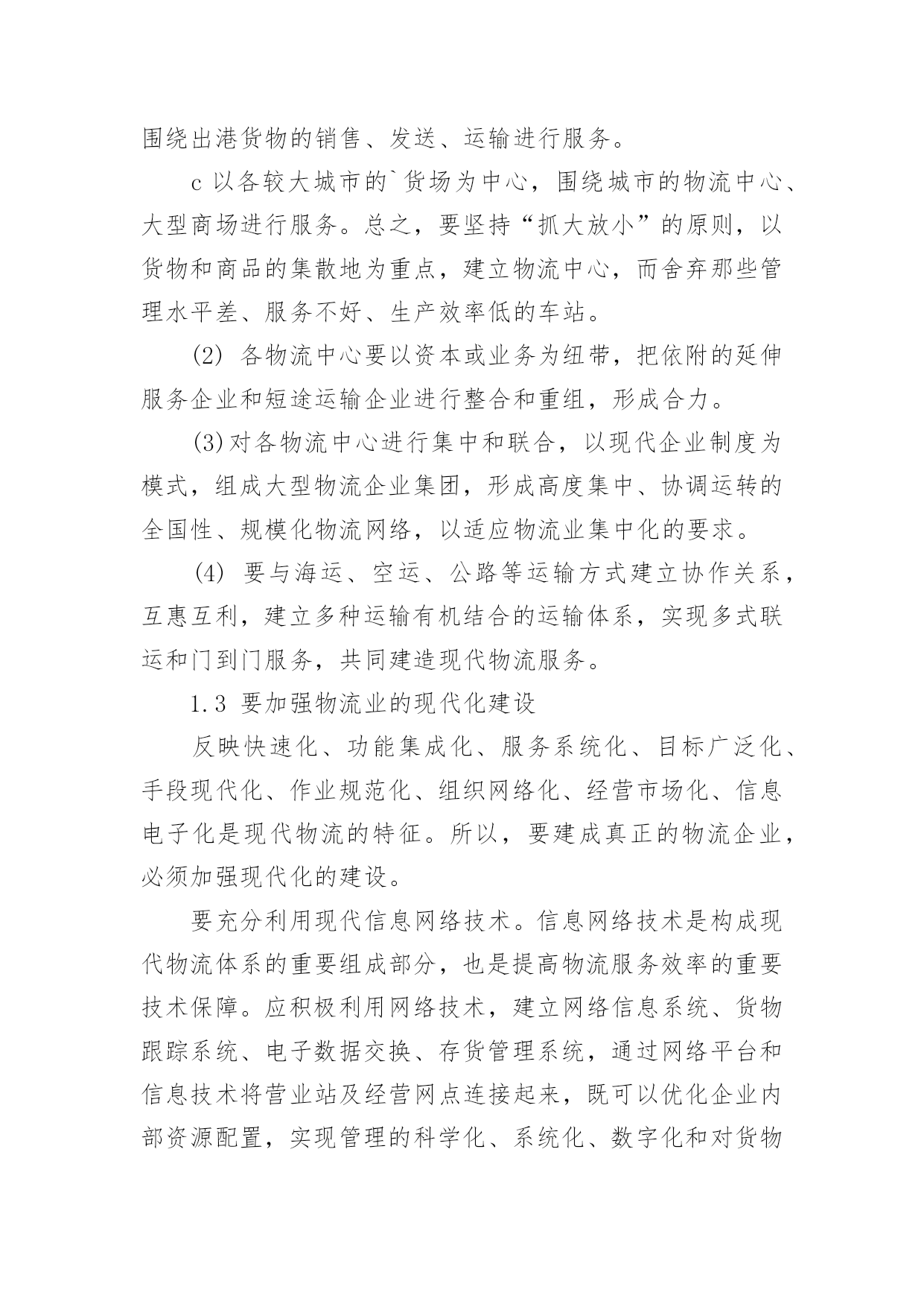 物流实习报告物流实习报告在我们平凡的日常里,报告十分的重要,报告具有语言陈述性的特点。你知道怎样写报告才能写的好吗?以下是小编精心整理的物流实习报告,仅供参考,欢迎大家阅读。物流实习报告1探讨了铁路货物运输企业向现代物流业拓展的必要性和可行性,进而分析铁路货运向现代物流转变的优势和劣势以及存在的问题,提出了传统铁路货物运输企业向现代物流企业拓展的思路及对策。中国加入WTO后,随着中国经济的快速发展和经济体制改革的不断深化,中国物流产业出现了加速发展的趋势,成为了国民经济中的一个重要组成部分和新的经济增长点。而传统的铁路货运已不能满足现代物流发展的需要,必须向提供运输、仓储、包装、配送、流通、加工、信息处理等多种服务的现代物流业发展。这无疑对承担着我国重要运输任务的铁路运输业提出了更新、更高的要求。面对机遇和挑战,传统铁路货运业必须加快向现代物流业转化的步伐,并把货运物流业作为铁路运输业发展的战略目标。通过资源整合,逐步使铁路从传统的、以运输为主的企业转变为规模经营、系统服务、现代化的第三方物流企业,成为我国综合物流系统的中坚力量。1.铁路货运向现代物流业拓展需解决的问题1.1要建立与物流业相适应的运输组织体系要以安全、快速、准时、方便为原则,对现有运输组织体系进行优化,由粗放式管理向集约式管理转化。在安全上,要全力保证所运输货物的安全,并建立合理快速的赔偿机制,对客户发生的以外损失,能够即使予以赔偿,打造铁路良好的信誉。在快速上,对既有线路要进一步提速,特别加大货物列车的提速力度,并在运输组织上建立速度机制,一切以速度为中心。在准时上,要以时效为目标,对车、机、工、电、辆各个部门的作业建立相关的考核机制,要实现货物列车客车化,做到定点、定线、定编组,使货物列车按时刻运行,以保证到期限。在方便上,要改革目前的铁路承运和交付手续,调整窗口设置、简化办理程序、统一服务标识,并融合其他运输代理企业和其他运输方式,做到全程代理和门到门服务。1.2要建立网络化的物流组织铁路货运部门应按照物流原理和货主需求扩展其业务范围,延伸其运输产品、丰富完善其服务功能,使铁路货运业务向更高层次的物流网络转化。(1)建立物流中心。a.以大企业为服务对象,利用专用线的连接优势,从该企业原材料的购买、运输、储存、供应到产品的储存、运输、销售进行全方位服务。b以大型市场和货物集散地为中心,包揽商品的供应、运输、储存和商品的销售和发送。c.以各大港口为中心,围绕出港货物的销售、发送、运输进行服务。c以各较大城市的`货场为中心,围绕城市的物流中心、大型商场进行服务。总之,要坚持“抓大放小”的原则,以货物和商品的集散地为重点,建立物流中心,而舍弃那些管理水平差、服务不好、生产效率低的车站。(2)各物流中心要以资本或业务为纽带,把依附的延伸服务企业和短途运输企业进行整合和重组,形成合力。(3)对各物流中心进行集中和联合,以现代企业制度为模式,组成大型物流企业集团,形成高度集中、协调运转的全国性、规模化物流网络,以适应物流业集中化的要求。(4)要与海运、空运、公路等运输方式建立协作关系,互惠互利,建立多种运输有机结合的运输体系,实现多式联运和门到门服务,共同建造现代物流服务。1.3要加强物流业的现代化建设反映快速化、功能集成化、服务系统化、目标广泛化、手段现代化、作业规范化、组织网络化、经营市场化、信息电子化是现代物流的特征。所以,要建成真正的物流企业,必须加强现代化的建设。要充分利用现代信息网络技术。信息网络技术是构成现代物流体系的重要组成部分,也是提高物流服务效率的重要技术保障。应积极利用网络技术,建立网络信息系统、货物跟踪系统、电子数据交换、存货管理系统,通过网络平台和信息技术将营业站及经营网点连接起来,既可以优化企业内部资源配置,实现管理的科学化、系统化、数字化和对货物运送进行全程的跟踪监控;又可以通过网络与用户、制造商及相关单位联结,实现资源共享、信息共用,对物流各环节进行实时跟踪、有效控制与全程管理。物流实习报告2作为物流人才的培养对象,我便自信满满的填上了应聘信息。在经过了初试复试之后,顺利的进入了__物流(上海)有限公司其下属单位上海港程储运有限公司进行实习。1.实习内容1.1实习单位简介上海港程国际储运有限公司,该公司成立于1998年5月31日,是中国船舶代理行业协会会员单位暨nvocc专业委员会委员单位,公司物流操作部任单证员一职。1.2实习岗位和培训我实习的岗位是物流操作部任单证员一职。主要从事的工作是对仓储部的进仓单进行整理归纳,以及对装箱单的打印及预录和审单。对这个环节有所了解后,我被调到了外仓库,进行了实地的收发货。主要是收货时对供应商送来的货物进行清点,核对收货单数量,入库,按客户的要求请将货物分批出货,配送时点安排做到准确,准时。之后