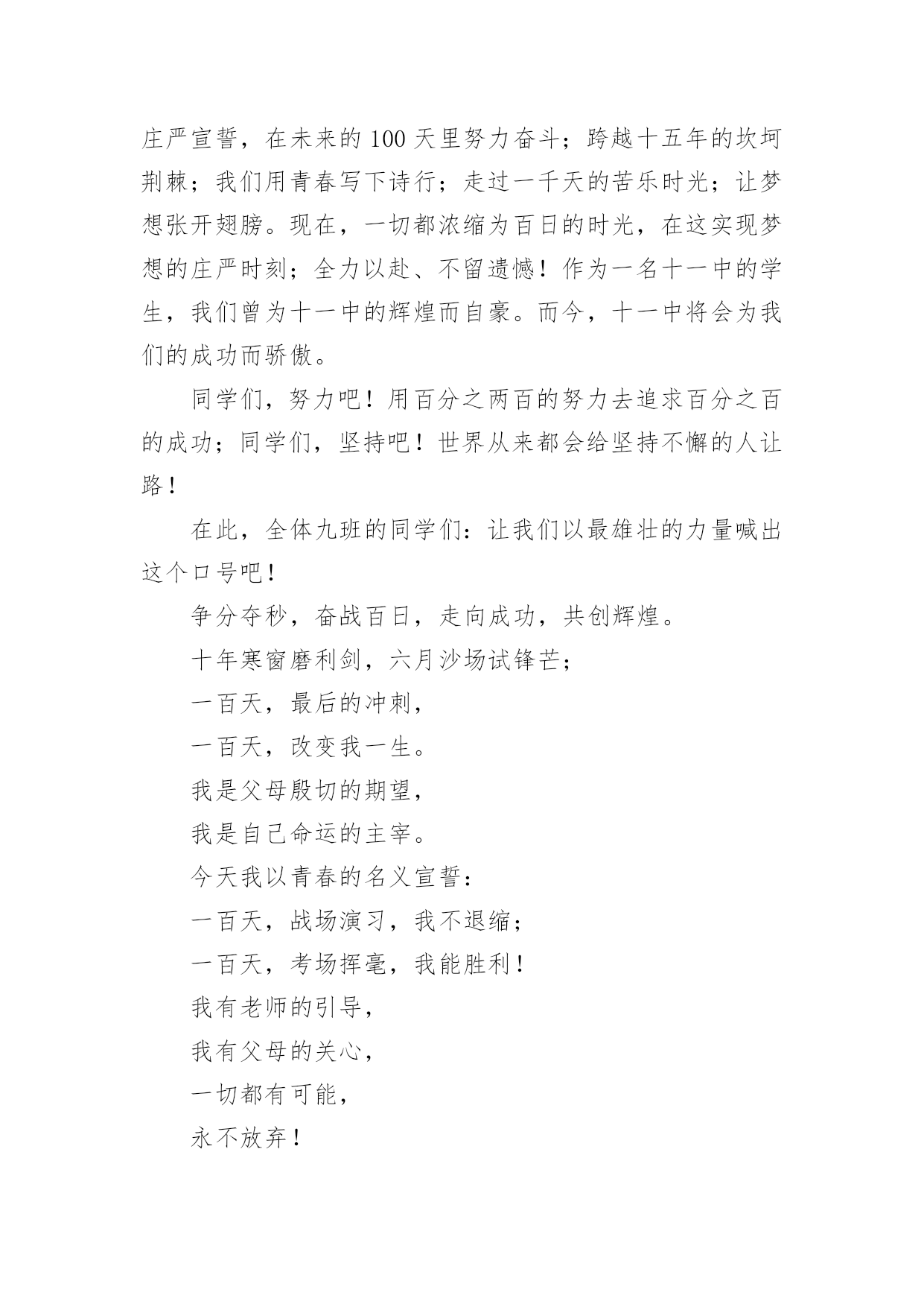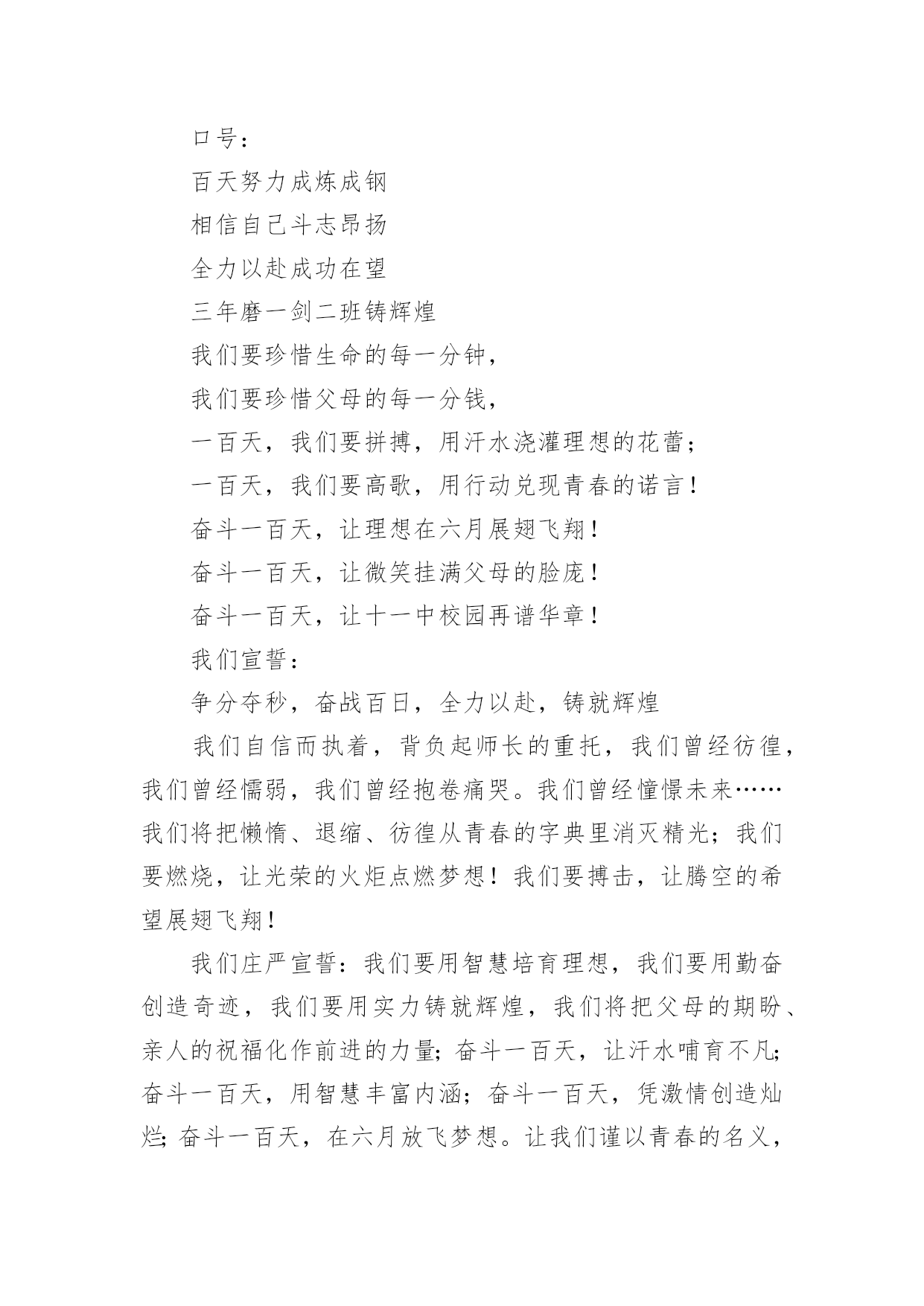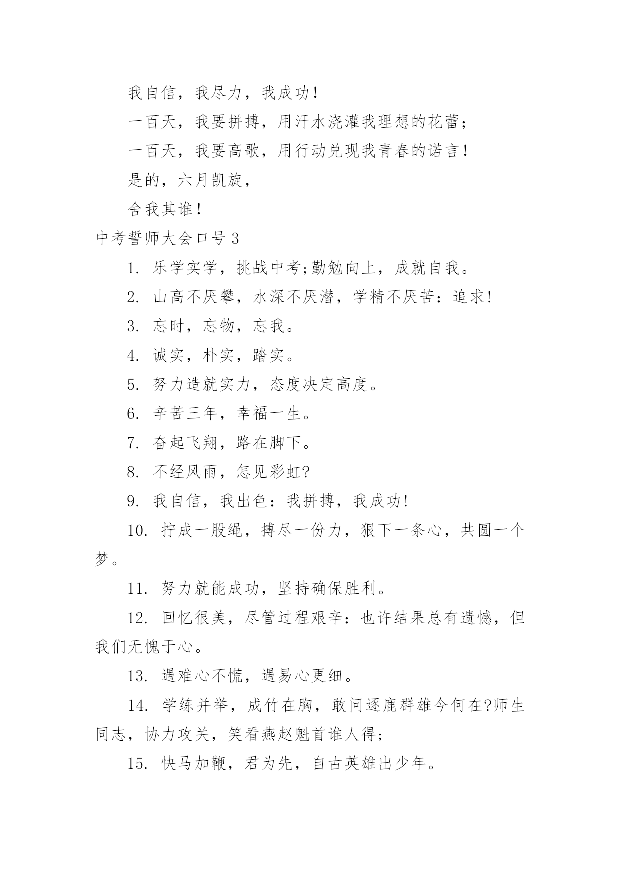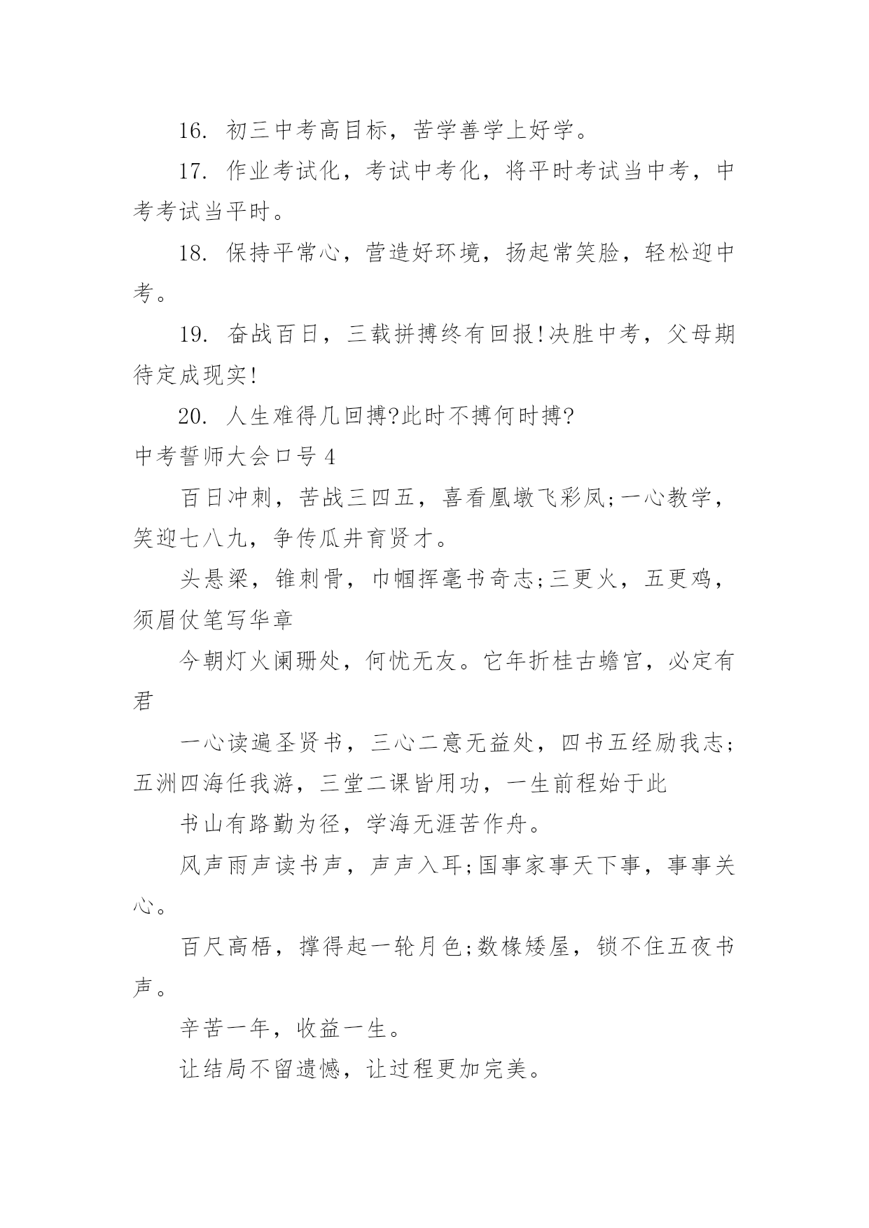 中考誓师大会口号中考誓师大会口号无论是在学校还是在社会中,大家对口号都再熟悉不过了吧,高效的口号具有针对性,时效性,鼓动性和简洁性的特点。还在苦苦寻找优秀经典的口号吗?以下是小编精心整理的中考誓师大会口号,欢迎阅读,希望大家能够喜欢。中考誓师大会口号11、摒弃侥幸之念,必取百炼成钢;厚积分秒之功,始得一鸣惊人。2、天助自助者,你要你就能。3、抢时间,抓基础,勤演练定有收获;树自信,誓拼搏,升重点回报父母。4、不为失败找借口,要为成功找方法。5、惜光阴百日犹短,看众志成城拼搏第一;细安排一刻也长,比龙争虎斗谁为争锋!6、今日浪费一分钟,来日后悔一辈子。7、宁吃百日苦;不留终生憾。8、百日冲刺战中考;一鼓作气创辉煌。9、珍惜时间、创造奇迹、不经风雨、怎见彩虹。10、不要迷恋八班,中考后就是个传说。中考誓师大会口号2挑战人生是我坚定的信念,决战中考是我现实的追求;一百天我将让青春无悔,一百天我将为母校争光。今天,我们11届九班全体同学庄严宣誓。全班同学:我宣誓:珍惜一百天,让铿锵的誓言在中考兑现,奋斗一百天,让青春的智慧在考场展现,拼搏一百天,让父母恩师的期盼实现。我们拥有团结拼搏的精神,我们拥有勇往直前的信念,我们是十一中最棒的学子,我们将以优异的中考成绩为十一中争光。请母校放心,请老师放心,请家长放心,我们已吹响了中考冲刺的号角,苦战一百天,百炼成钢,共创辉煌!在最后的一百天里,我打点行装:背负老师的嘱托,父母的期望承载必胜的信念和母校的荣光智慧在一百天中积累勇气在奋进中高涨我要实现我的梦想,我要建构我的天堂口号:百天努力成炼成钢相信自己斗志昂扬全力以赴成功在望三年磨一剑二班铸辉煌我们要珍惜生命的每一分钟,我们要珍惜父母的每一分钱,一百天,我们要拼搏,用汗水浇灌理想的花蕾;一百天,我们要高歌,用行动兑现青春的诺言!奋斗一百天,让理想在六月展翅飞翔!奋斗一百天,让微笑挂满父母的脸庞!奋斗一百天,让十一中校园再谱华章!我们宣誓:争分夺秒,奋战百日,全力以赴,铸就辉煌我们自信而执着,背负起师长的重托,我们曾经彷徨,我们曾经懦弱,我们曾经抱卷痛哭。我们曾经憧憬未来……我们将把懒惰、退缩、彷徨从青春的字典里消灭精光;我们要燃烧,让光荣的火炬点燃梦想!我们要搏击,让腾空的希望展翅飞翔!我们庄严宣誓:我们要用智慧培育理想,我们要用勤奋创造奇迹,我们要用实力铸就辉煌,我们将把父母的期盼、亲人的祝福化作前进的力量;奋斗一百天,让汗水哺育不凡;奋斗一百天,用智慧丰富内涵;奋斗一百天,凭激情创造灿烂;奋斗一百天,在六月放飞梦想。让我们谨以青春的名义,庄严宣誓,在未来的100天里努力奋斗;跨越十五年的坎坷荆棘;我们用青春写下诗行;走过一千天的苦乐时光;让梦想张开翅膀。现在,一切都浓缩为百日的时光,在这实现梦想的庄严时刻;全力以赴、不留遗憾!作为一名十一中的学生,我们曾为十一中的辉煌而自豪。而今,十一中将会为我们的成功而骄傲。同学们,努力吧!用百分之两百的努力去追求百分之百的成功;同学们,坚持吧!世界从来都会给坚持不懈的人让路!在此,全体九班的同学们:让我们以最雄壮的力量喊出这个口号吧!争分夺秒,奋战百日,走向成功,共创辉煌。十年寒窗磨利剑,六月沙场试锋芒;一百天,最后的冲刺,一百天,改变我一生。我是父母殷切的期望,我是自己命运的主宰。今天我以青春的名义宣誓:一百天,战场演习,我不退缩;一百天,考场挥毫,我能胜利!我有老师的引导,我有父母的关心,一切都有可能,永不放弃!我自信,我尽力,我成功!一百天,我要拼搏,用汗水浇灌我理想的花蕾;一百天,我要高歌,用行动兑现我青春的诺言!是的,六月凯旋,舍我其谁!中考誓师大会口号31.乐学实学,挑战中考;勤勉向上,成就自我。2.山高不厌攀,水深不厌潜,学精不厌苦:追求!3.忘时,忘物,忘我。4.诚实,朴实,踏实。5.努力造就实力,态度决定高度。6.辛苦三年,幸福一生。7.奋起飞翔,路在脚下。8.不经风雨,怎见彩虹?9.我自信,我出色:我拼搏,我成功!10.拧成一股绳,搏尽一份力,狠下一条心,共圆一个梦。11.努力就能成功,坚持确保胜利。12.回忆很美,尽管过程艰辛:也许结果总有遗憾,但我们无愧于心。13.遇难心不慌,遇易心更细。14.学练并举,成竹在胸,敢问逐鹿群雄今何在?师生同志,协力攻关,笑看燕赵魁首谁人得;15.快马加鞭,君为先,自古英雄出少年。16.初三中考高目标,苦学善学上好学。17.作业考试化,考试中考化,将平时考试当中考,中考考试当平时。18.保持平常心,营造好环境,扬起常笑脸,轻松迎中考。19.奋战百日,三载拼搏终有回报!决胜中考,父母期待定成现实!20.人生难得几回搏?此时不搏何时搏?中考誓师大会口号4百日冲刺,苦战三四五,喜看凰墩飞彩凤;一心教学,笑迎七八九,争传瓜井育贤才。头悬梁,锥刺骨,巾