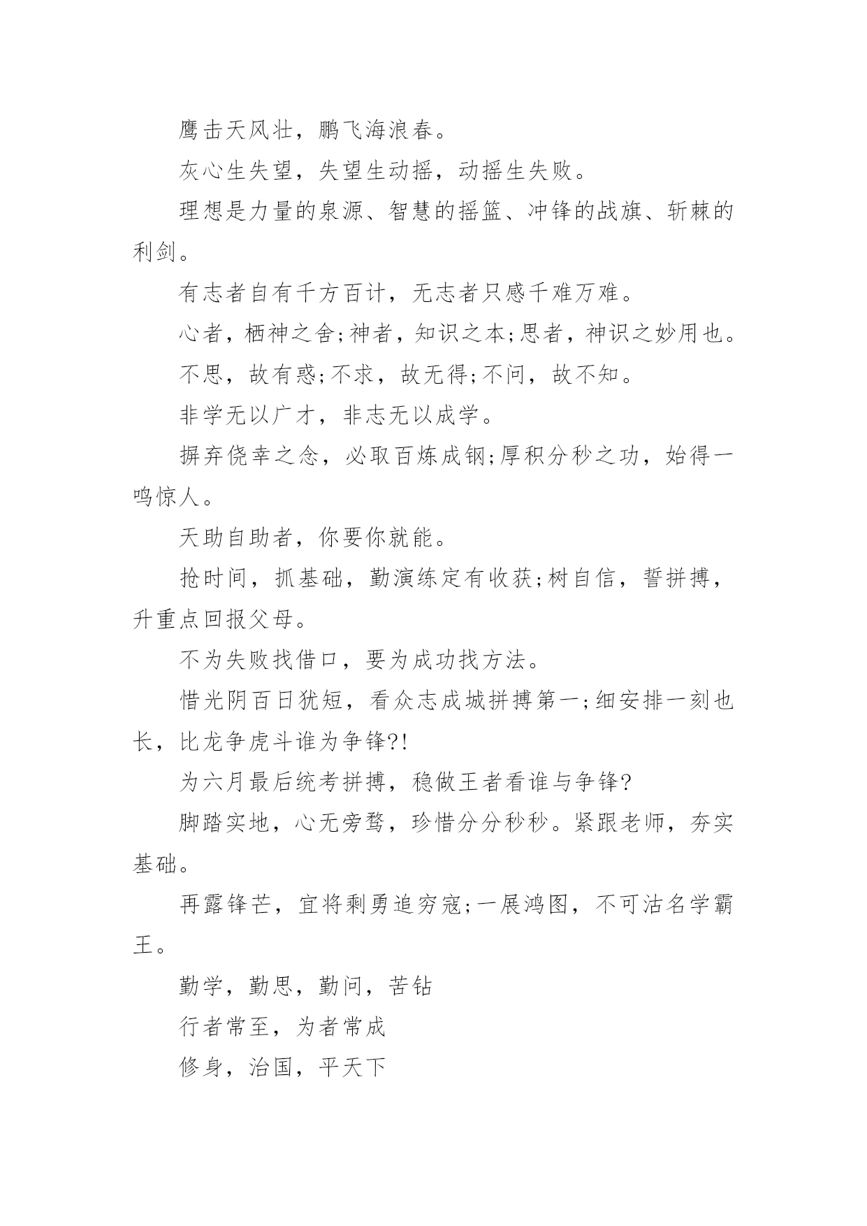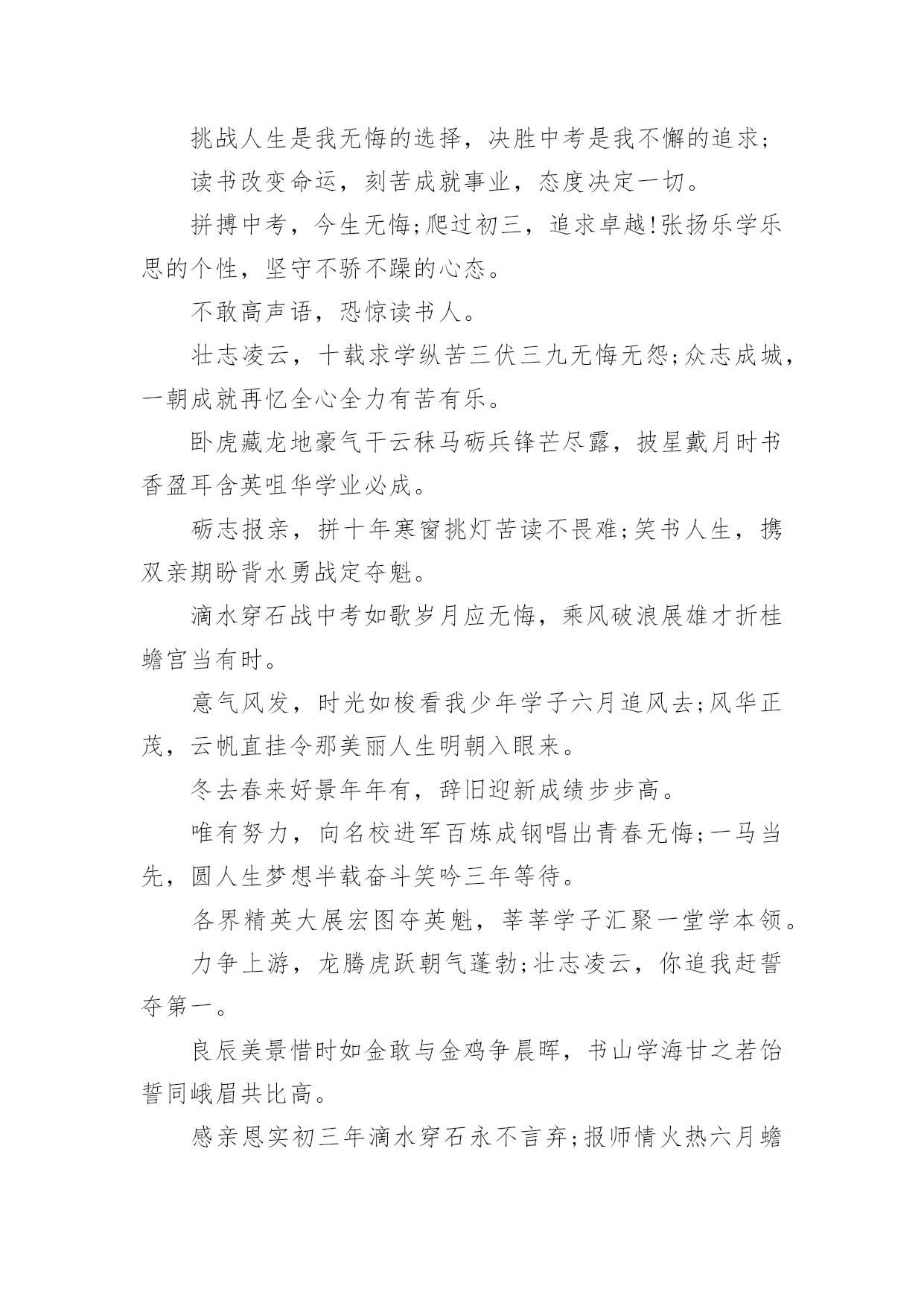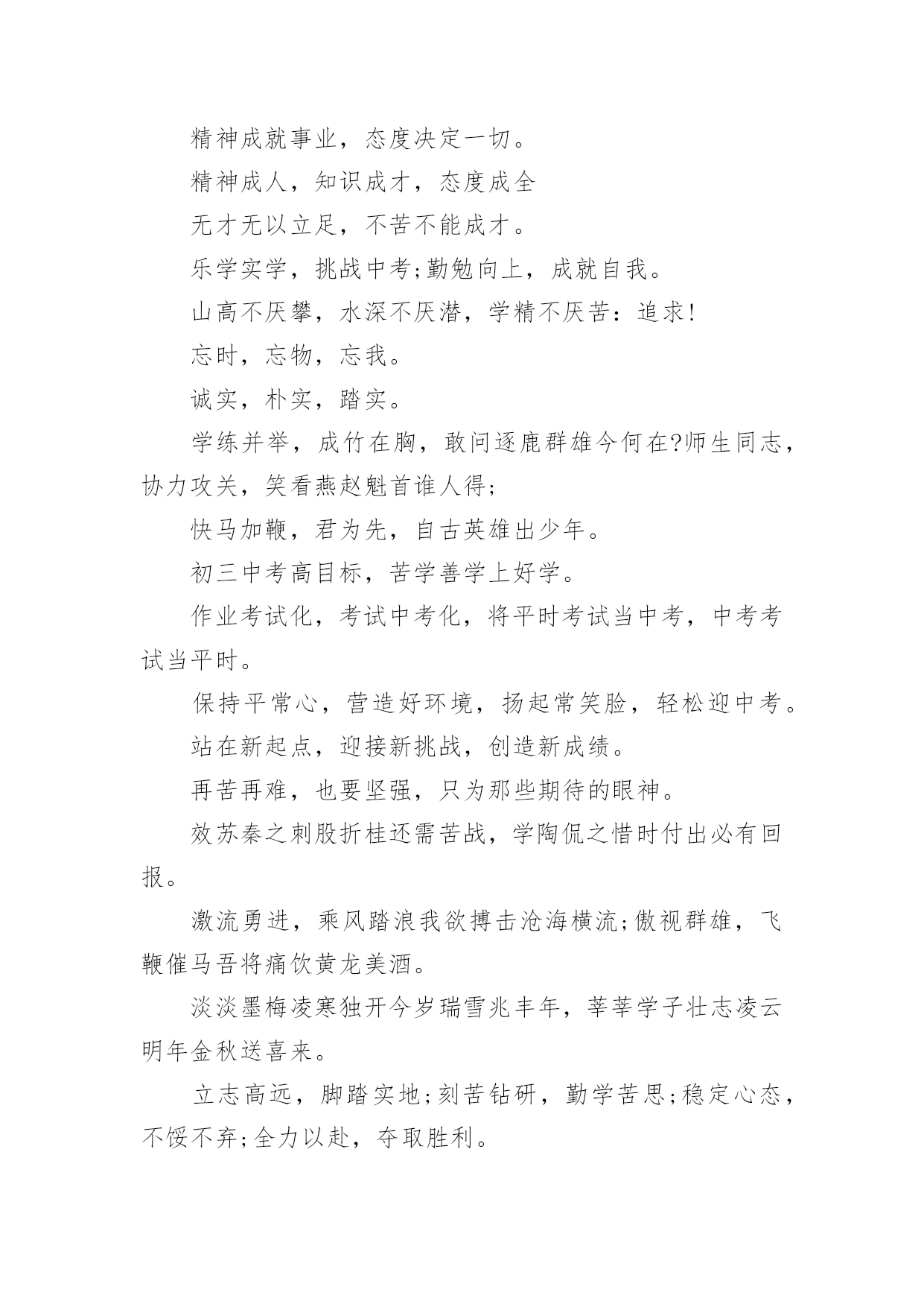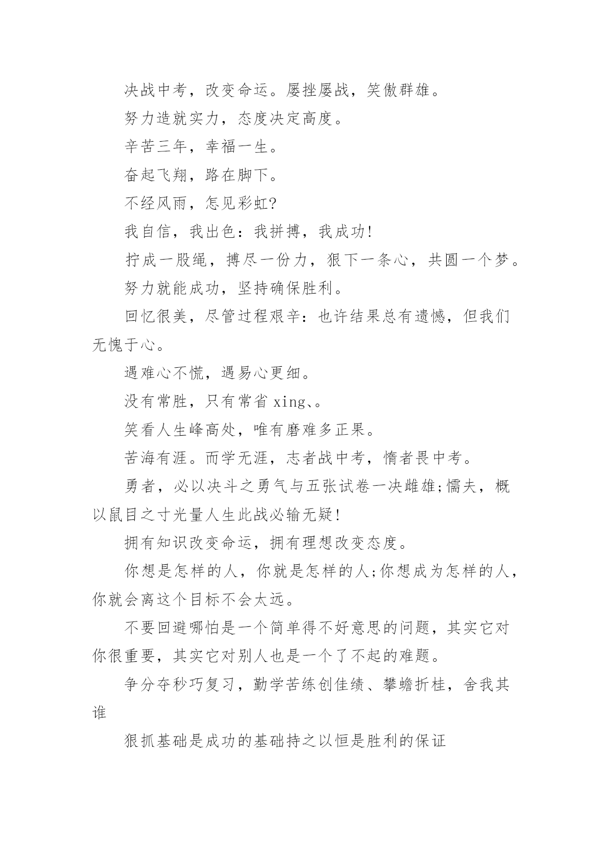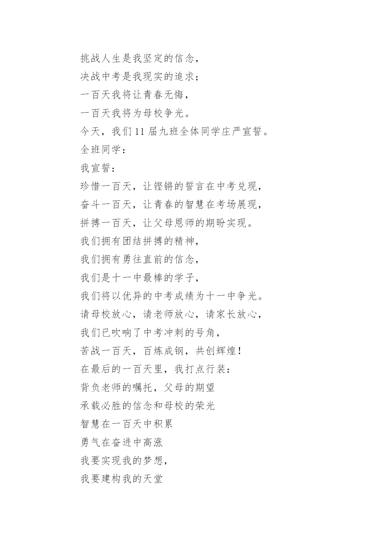 中考誓师大会口号中考誓师大会口号无论是在学校还是在社会中,大家对口号都再熟悉不过了吧,高效的口号具有针对性,时效性,鼓动性和简洁性的特点。还在苦苦寻找优秀经典的口号吗?以下是小编精心整理的中考誓师大会口号,欢迎阅读,希望大家能够喜欢。中考誓师大会口号11、摒弃侥幸之念,必取百炼成钢;厚积分秒之功,始得一鸣惊人。2、天助自助者,你要你就能。3、抢时间,抓基础,勤演练定有收获;树自信,誓拼搏,升重点回报父母。4、不为失败找借口,要为成功找方法。5、惜光阴百日犹短,看众志成城拼搏第一;细安排一刻也长,比龙争虎斗谁为争锋!6、今日浪费一分钟,来日后悔一辈子。7、宁吃百日苦;不留终生憾。8、百日冲刺战中考;一鼓作气创辉煌。9、珍惜时间、创造奇迹、不经风雨、怎见彩虹。10、不要迷恋八班,中考后就是个传说。中考誓师大会口号2挑战人生是我坚定的信念,决战中考是我现实的追求;一百天我将让青春无悔,一百天我将为母校争光。今天,我们11届九班全体同学庄严宣誓。全班同学:我宣誓:珍惜一百天,让铿锵的誓言在中考兑现,奋斗一百天,让青春的智慧在考场展现,拼搏一百天,让父母恩师的期盼实现。我们拥有团结拼搏的精神,我们拥有勇往直前的信念,我们是十一中最棒的学子,我们将以优异的中考成绩为十一中争光。请母校放心,请老师放心,请家长放心,我们已吹响了中考冲刺的号角,苦战一百天,百炼成钢,共创辉煌!在最后的一百天里,我打点行装:背负老师的嘱托,父母的期望承载必胜的信念和母校的荣光智慧在一百天中积累勇气在奋进中高涨我要实现我的梦想,我要建构我的天堂口号:百天努力成炼成钢相信自己斗志昂扬全力以赴成功在望三年磨一剑二班铸辉煌我们要珍惜生命的每一分钟,我们要珍惜父母的每一分钱,一百天,我们要拼搏,用汗水浇灌理想的花蕾;一百天,我们要高歌,用行动兑现青春的诺言!奋斗一百天,让理想在六月展翅飞翔!奋斗一百天,让微笑挂满父母的脸庞!奋斗一百天,让十一中校园再谱华章!我们宣誓:争分夺秒,奋战百日,全力以赴,铸就辉煌我们自信而执着,背负起师长的重托,我们曾经彷徨,我们曾经懦弱,我们曾经抱卷痛哭。我们曾经憧憬未来……我们将把懒惰、退缩、彷徨从青春的字典里消灭精光;我们要燃烧,让光荣的火炬点燃梦想!我们要搏击,让腾空的希望展翅飞翔!我们庄严宣誓:我们要用智慧培育理想,我们要用勤奋创造奇迹,我们要用实力铸就辉煌,我们将把父母的期盼、亲人的祝福化作前进的力量;奋斗一百天,让汗水哺育不凡;奋斗一百天,用智慧丰富内涵;奋斗一百天,凭激情创造灿烂;奋斗一百天,在六月放飞梦想。让我们谨以青春的名义,庄严宣誓,在未来的100天里努力奋斗;跨越十五年的坎坷荆棘;我们用青春写下诗行;走过一千天的苦乐时光;让梦想张开翅膀。现在,一切都浓缩为百日的时光,在这实现梦想的庄严时刻;全力以赴、不留遗憾!作为一名十一中的学生,我们曾为十一中的辉煌而自豪。而今,十一中将会为我们的成功而骄傲。同学们,努力吧!用百分之两百的努力去追求百分之百的成功;同学们,坚持吧!世界从来都会给坚持不懈的人让路!在此,全体九班的同学们:让我们以最雄壮的力量喊出这个口号吧!争分夺秒,奋战百日,走向成功,共创辉煌。十年寒窗磨利剑,六月沙场试锋芒;一百天,最后的冲刺,一百天,改变我一生。我是父母殷切的期望,我是自己命运的主宰。今天我以青春的名义宣誓:一百天,战场演习,我不退缩;一百天,考场挥毫,我能胜利!我有老师的引导,我有父母的关心,一切都有可能,永不放弃!我自信,我尽力,我成功!一百天,我要拼搏,用汗水浇灌我理想的花蕾;一百天,我要高歌,用行动兑现我青春的诺言!是的,六月凯旋,舍我其谁!中考誓师大会口号31.乐学实学,挑战中考;勤勉向上,成就自我。2.山高不厌攀,水深不厌潜,学精不厌苦:追求!3.忘时,忘物,忘我。4.诚实,朴实,踏实。5.努力造就实力,态度决定高度。6.辛苦三年,幸福一生。7.奋起飞翔,路在脚下。8.不经风雨,怎见彩虹?9.我自信,我出色:我拼搏,我成功!10.拧成一股绳,搏尽一份力,狠下一条心,共圆一个梦。11.努力就能成功,坚持确保胜利。12.回忆很美,尽管过程艰辛:也许结果总有遗憾,但我们无愧于心。13.遇难心不慌,遇易心更细。14.学练并举,成竹在胸,敢问逐鹿群雄今何在?师生同志,协力攻关,笑看燕赵魁首谁人得;15.快马加鞭,君为先,自古英雄出少年。16.初三中考高目标,苦学善学上好学。17.作业考试化,考试中考化,将平时考试当中考,中考考试当平时。18.保持平常心,营造好环境,扬起常笑脸,轻松迎中考。19.奋战百日,三载拼搏终有回报!决胜中考,父母期待定成现实!20.人生难得几回搏?此时不搏何时搏?中考誓师大会口号4百日冲刺,苦战三四五,喜看凰墩飞彩凤;一心教学,笑迎七八九,争传瓜井育贤才。头悬梁,锥刺骨,巾