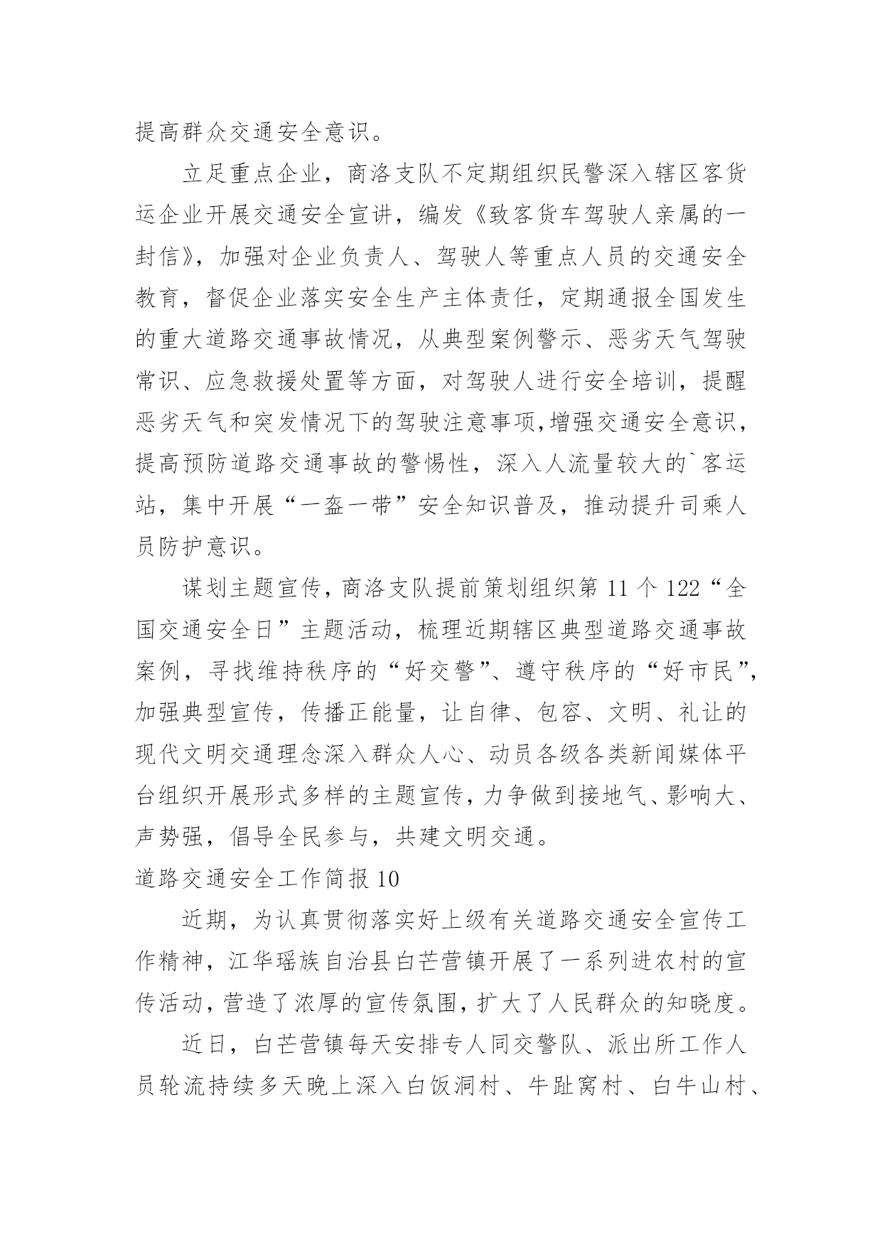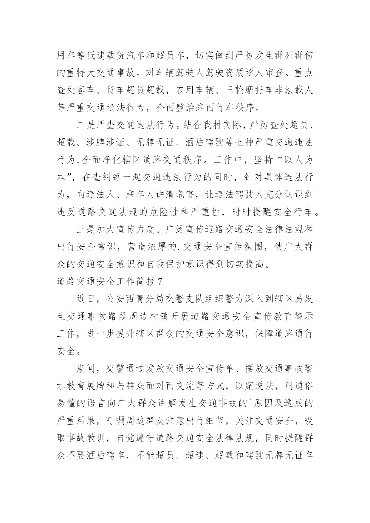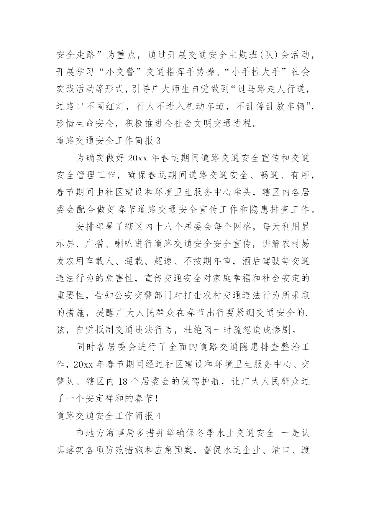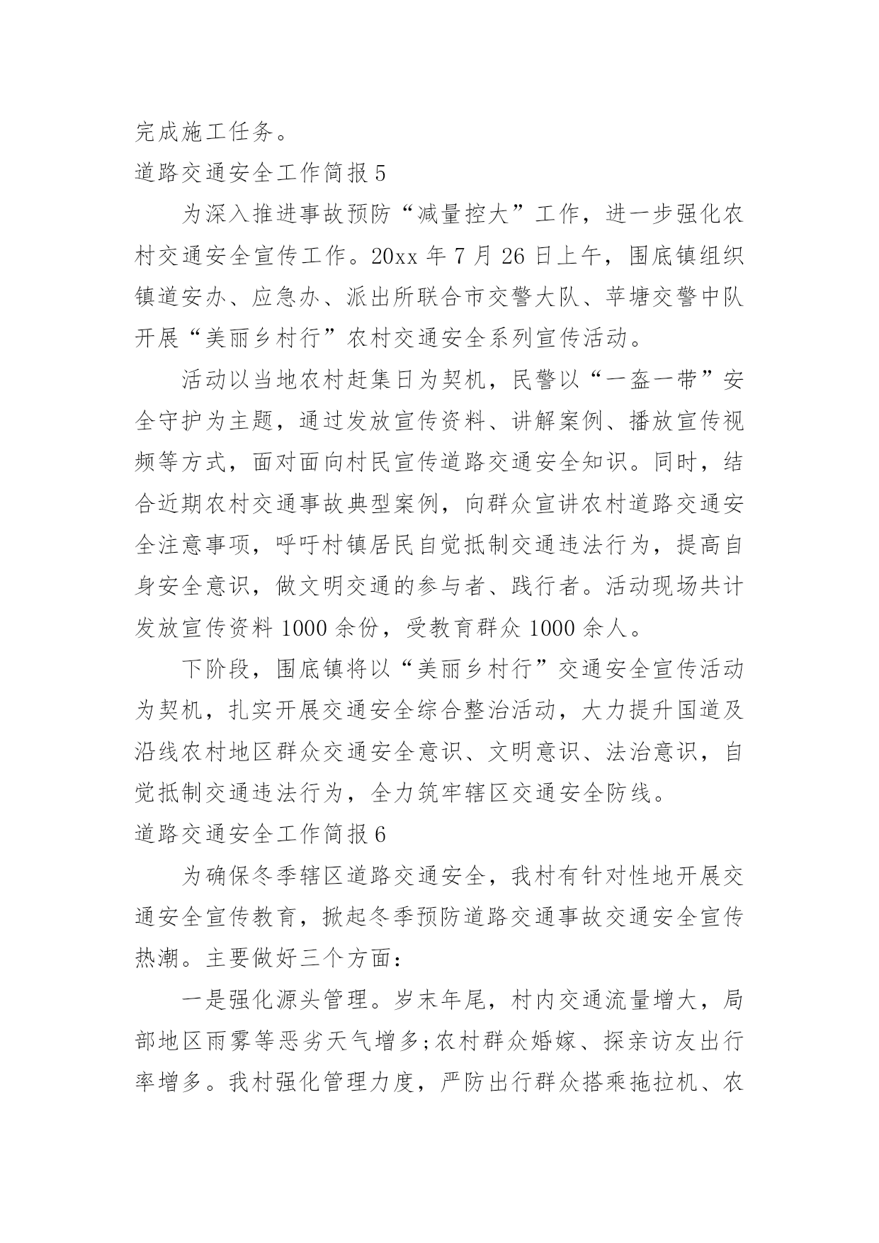 道路交通安全工作简报道路交通安全工作简报随着社会一步步向前发展,接触到简报的地方越来越多,简报不是一种刊物。因为有些简报可装订成一本,像一般“刊物”,更多的是只有一两张纸,几个版面,像一份报纸。你所接触过的简报都是什么样子的呢?以下是小编整理的道路交通安全工作简报,供大家参考借鉴,希望可以帮助到有需要的朋友。道路交通安全工作简报1为进一步加强交通安全宣传教育,提高全园幼儿的安全防范意识和自我保护能力,有效预防幼儿的'交通事故,创造安全畅通、文明和谐的交通安全环境,东营区辛店街道中心幼儿园开展了交通安全宣传教育活动。活动中,各班教师利用播放视频、PPT等多种形式,详细给小朋友讲述一系列交通规则,与小朋友共同学习“红灯停、绿灯行、黄灯亮时等一等”,孩子们知道在生活中走路、乘车时应该如何注意交通安全,引导孩子们自觉遵守交通规则,学会更好的保护自己。通过此次活动,提高了幼儿的道路交通安全意识,了解了道路交通安全的重要性以及保护自己的方法。道路交通安全工作简报24月30日是“全国交通安全反思日”。为进一步加强我县学校交通法规宣传工作,提高广大师生交通安全法规意识和文明交通意识,增强中小学生自觉遵守交通法规,维护交通秩序,自我防范与保护能力,避免发生道路交通安全事故,在第九个全国交通安全反思日来临之际,青龙县教育局利用开展以“遵守交通规则,保障生命安全”为主题的交通安全宣传教育活动。本次“全国交通安全反思日”主题教育活动主要有三种形式:一是开展一次道路交通安全专题教育活动。积极主动邀请公安交警、法制副校长、法制辅导员等人员,以“文明交通,告别陋习”为主题,通过学习交通法规,普及安全知识,观看交通事故典型案例等形式方法,大力推动交通安全进课堂,教育引导师生自觉维护公共交通秩序,保障交通安全,提高文明交通素养。二是开展一次“全国交通安全反思日”主题宣传活动。紧扣“遵守交通规则,保障生命安全”教育主题,通过学校网络、校园广播、版面橱窗、电子屏幕、悬挂条幅、黑板报等宣传阵地,大力宣传中小学生道路交通安全有关常识,进一步强化学生交通安全意识,严防发生师生道路交通安全事故。三是组织一次“小手拉大手”主题实践活动。突出“安全第一”原则,结合文明交通行动计划安排、“全国交通安全反思日”教育要求、“五一”师生假日活动实际,以“文明安全出行”为主题,以强化学生“安全乘车、安全骑车、安全走路”为重点,通过开展交通安全主题班(队)会活动,开展学习“小交警”交通指挥手势操、“小手拉大手”社会实践活动等形式,引导广大师生自觉做到“过马路走人行道,过路口不闯红灯,行人不进入机动车道,不乱停乱放车辆”,珍惜生命安全,积极推进全社会文明交通进程。道路交通安全工作简报3为确实做好20xx年春运期间道路交通安全宣传和交通安全管理工作,确保春运期间道路交通安全、畅通、有序,春节期间由社区建设和环境卫生服务中心牵头,辖区内各居委会配合做好春节道路交通安全宣传工作和隐患排查工作。安排部署了辖区内十八个居委会每个网格,每天利用显示屏、广播、喇叭进行道路交通安全安全宣传,讲解农村易发农用车载人、超载、超速、不按期年审,酒后驾驶等交通违法行为的危害性,宣传交通安全对家庭幸福和社会安定的重要性,告知公安交警部门对打击农村交通违法行为所采取的措施,提醒广大人民群众在春节出行要紧绷交通安全的.弦,自觉抵制交通违法行为,杜绝因一时疏忽造成惨剧。同时各居委会进行了全面的道路交通隐患排查整治工作,20xx年春节期间经过社区建设和环境卫生服务中心、交警队、辖区内18个居委会的保驾护航,让广大人民群众过了一个安定祥和的春节!道路交通安全工作简报4市地方海事局多措并举确保冬季水上交通安全一是认真落实各项防范措施和应急预案,督促水运企业、港口、渡口、施工单位切实做好防雾、防风、防冻等各项准备工作。二是深入开展打击水上交通非法违法行为专项行动、淮河沿线船舶超载运输等专项整治活动,组织进行水上交通安全大检查。三是组织辖区渡口乡管员培训,进一步强化渡口渡船的安全管理,加大对隐患的排查和跟踪整改力度,确保辖区安全稳定。20xx年元旦期间我市公路客运平稳有序1月1日至3日,全市共投入客车3240辆次,加班、包车35辆次,共运送旅客17.7万人次,较去年同期增长15%,无行车责任事故,全市道路运输安全平稳有序。其中市区投入运力1230辆次,运送旅客9.2万人次,客流方向主要是周边县市短途旅客。市公路局采取五项措施应对冰雪天气一是要求各公路分局“一把手”必须亲自布置,高度重视冬季冰雪天气的道路安全问题,做好“无雪防范,有雪抢险”的思想准备。二是要建立健全组织队伍,按照冰雪天气应急预案要求,提前做好抢险队伍的`安排布置工作。三是要储备好物资,充分考虑应急物资的存储数量,并预留一定的资金做准备。四是要安排好值班,做到24