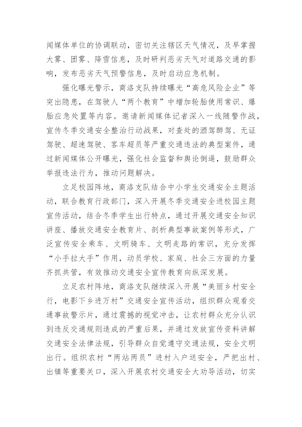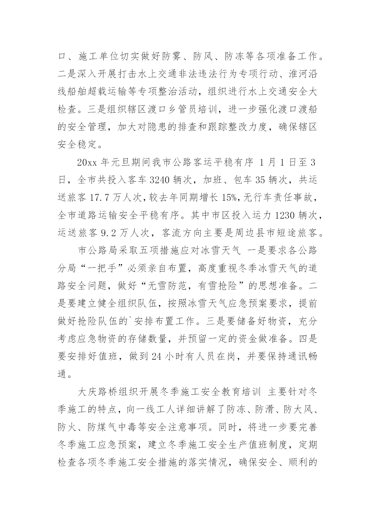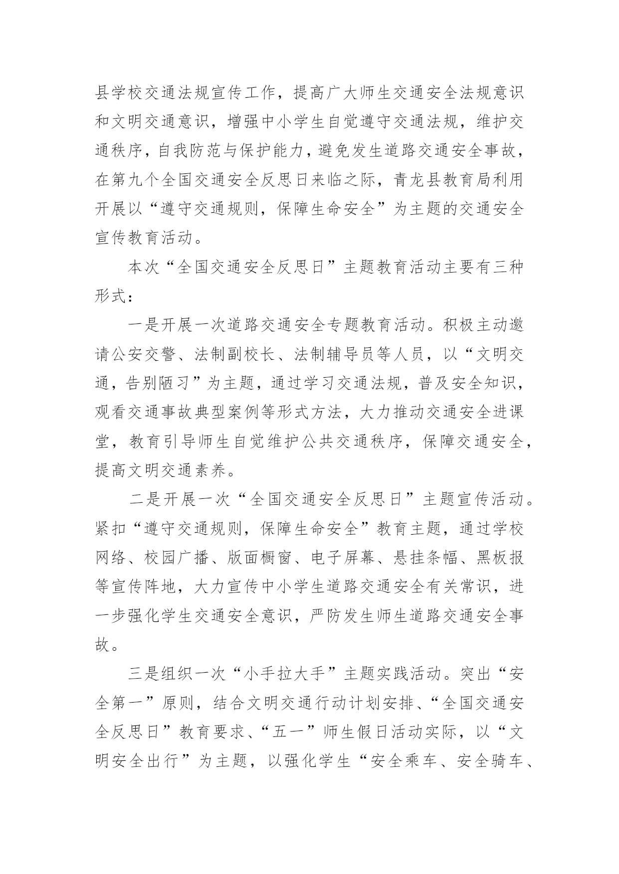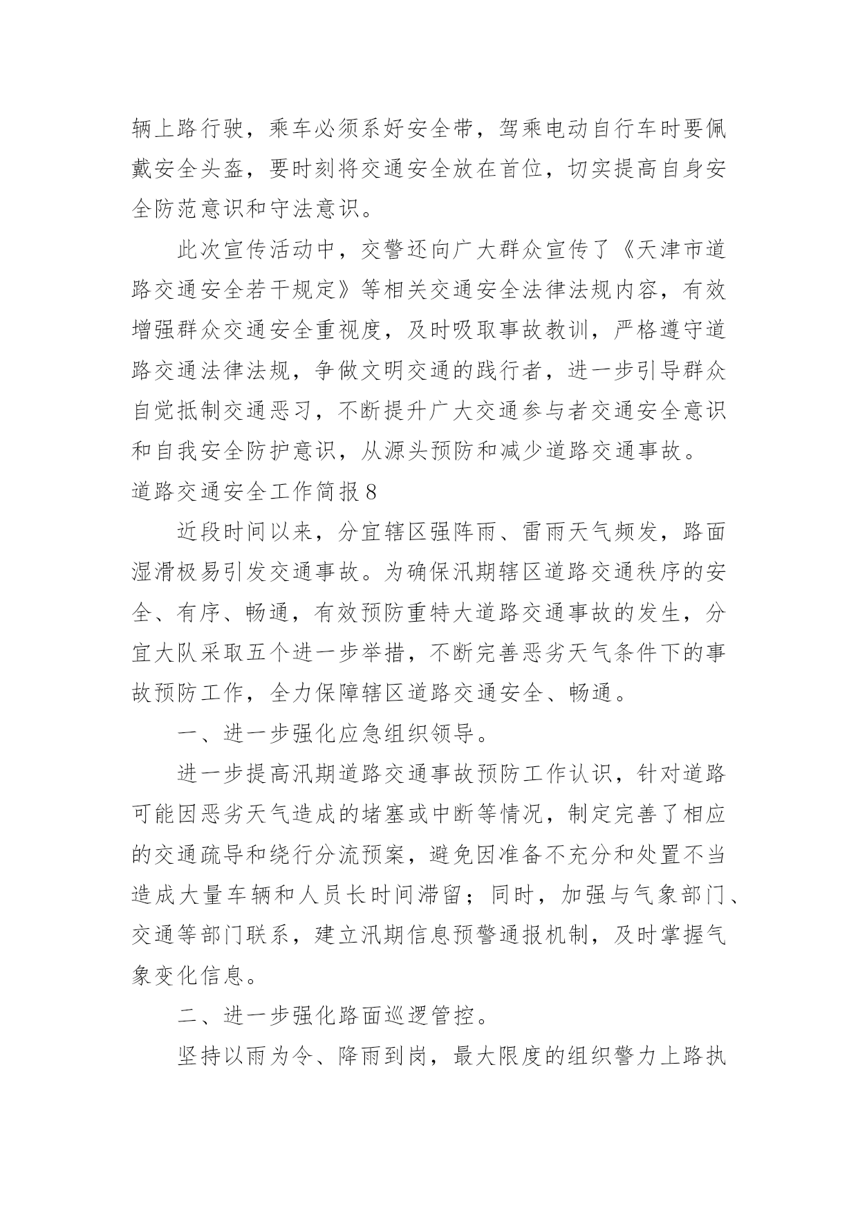 道路交通安全工作简报道路交通安全工作简报随着社会一步步向前发展,接触到简报的地方越来越多,简报不是一种刊物。因为有些简报可装订成一本,像一般“刊物”,更多的是只有一两张纸,几个版面,像一份报纸。你所接触过的简报都是什么样子的呢?以下是小编整理的道路交通安全工作简报,供大家参考借鉴,希望可以帮助到有需要的朋友。道路交通安全工作简报1为进一步加强交通安全宣传教育,提高全园幼儿的安全防范意识和自我保护能力,有效预防幼儿的'交通事故,创造安全畅通、文明和谐的交通安全环境,东营区辛店街道中心幼儿园开展了交通安全宣传教育活动。活动中,各班教师利用播放视频、PPT等多种形式,详细给小朋友讲述一系列交通规则,与小朋友共同学习“红灯停、绿灯行、黄灯亮时等一等”,孩子们知道在生活中走路、乘车时应该如何注意交通安全,引导孩子们自觉遵守交通规则,学会更好的保护自己。通过此次活动,提高了幼儿的道路交通安全意识,了解了道路交通安全的重要性以及保护自己的方法。道路交通安全工作简报24月30日是“全国交通安全反思日”。为进一步加强我县学校交通法规宣传工作,提高广大师生交通安全法规意识和文明交通意识,增强中小学生自觉遵守交通法规,维护交通秩序,自我防范与保护能力,避免发生道路交通安全事故,在第九个全国交通安全反思日来临之际,青龙县教育局利用开展以“遵守交通规则,保障生命安全”为主题的交通安全宣传教育活动。本次“全国交通安全反思日”主题教育活动主要有三种形式:一是开展一次道路交通安全专题教育活动。积极主动邀请公安交警、法制副校长、法制辅导员等人员,以“文明交通,告别陋习”为主题,通过学习交通法规,普及安全知识,观看交通事故典型案例等形式方法,大力推动交通安全进课堂,教育引导师生自觉维护公共交通秩序,保障交通安全,提高文明交通素养。二是开展一次“全国交通安全反思日”主题宣传活动。紧扣“遵守交通规则,保障生命安全”教育主题,通过学校网络、校园广播、版面橱窗、电子屏幕、悬挂条幅、黑板报等宣传阵地,大力宣传中小学生道路交通安全有关常识,进一步强化学生交通安全意识,严防发生师生道路交通安全事故。三是组织一次“小手拉大手”主题实践活动。突出“安全第一”原则,结合文明交通行动计划安排、“全国交通安全反思日”教育要求、“五一”师生假日活动实际,以“文明安全出行”为主题,以强化学生“安全乘车、安全骑车、安全走路”为重点,通过开展交通安全主题班(队)会活动,开展学习“小交警”交通指挥手势操、“小手拉大手”社会实践活动等形式,引导广大师生自觉做到“过马路走人行道,过路口不闯红灯,行人不进入机动车道,不乱停乱放车辆”,珍惜生命安全,积极推进全社会文明交通进程。道路交通安全工作简报3为确实做好20xx年春运期间道路交通安全宣传和交通安全管理工作,确保春运期间道路交通安全、畅通、有序,春节期间由社区建设和环境卫生服务中心牵头,辖区内各居委会配合做好春节道路交通安全宣传工作和隐患排查工作。安排部署了辖区内十八个居委会每个网格,每天利用显示屏、广播、喇叭进行道路交通安全安全宣传,讲解农村易发农用车载人、超载、超速、不按期年审,酒后驾驶等交通违法行为的危害性,宣传交通安全对家庭幸福和社会安定的重要性,告知公安交警部门对打击农村交通违法行为所采取的措施,提醒广大人民群众在春节出行要紧绷交通安全的.弦,自觉抵制交通违法行为,杜绝因一时疏忽造成惨剧。同时各居委会进行了全面的道路交通隐患排查整治工作,20xx年春节期间经过社区建设和环境卫生服务中心、交警队、辖区内18个居委会的保驾护航,让广大人民群众过了一个安定祥和的春节!道路交通安全工作简报4市地方海事局多措并举确保冬季水上交通安全一是认真落实各项防范措施和应急预案,督促水运企业、港口、渡口、施工单位切实做好防雾、防风、防冻等各项准备工作。二是深入开展打击水上交通非法违法行为专项行动、淮河沿线船舶超载运输等专项整治活动,组织进行水上交通安全大检查。三是组织辖区渡口乡管员培训,进一步强化渡口渡船的安全管理,加大对隐患的排查和跟踪整改力度,确保辖区安全稳定。20xx年元旦期间我市公路客运平稳有序1月1日至3日,全市共投入客车3240辆次,加班、包车35辆次,共运送旅客17.7万人次,较去年同期增长15%,无行车责任事故,全市道路运输安全平稳有序。其中市区投入运力1230辆次,运送旅客9.2万人次,客流方向主要是周边县市短途旅客。市公路局采取五项措施应对冰雪天气一是要求各公路分局“一把手”必须亲自布置,高度重视冬季冰雪天气的道路安全问题,做好“无雪防范,有雪抢险”的思想准备。二是要建立健全组织队伍,按照冰雪天气应急预案要求,提前做好抢险队伍的`安排布置工作。三是要储备好物资,充分考虑应急物资的存储数量,并预留一定的资金做准备。四是要安排好值班,做到24