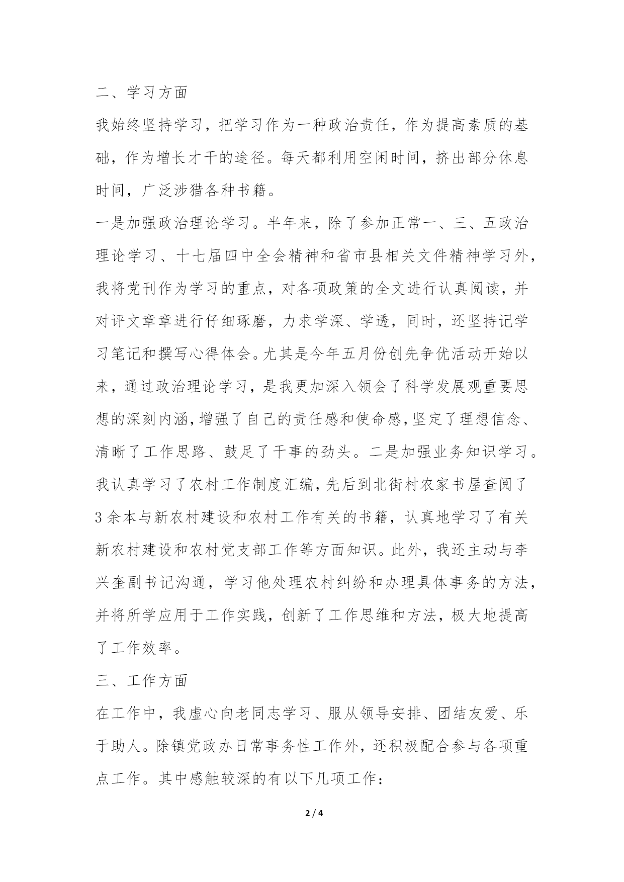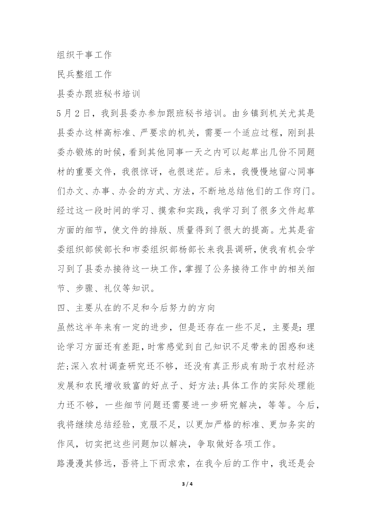 PAGE4/NUMPAGES4精选公务员个人半年工作总结参考时光荏苒,不知不觉中,半年时间已经过去。半年来,在组织部领导的关心指导下,在镇党委、政府的正确领导下,我坚定信念、努力实践;扎根基层、苦练本领;虚心学习、踏实工作,通过多岗位、多类别、多层次的锻炼,增强了服务本领,丰富了求实经验,加深了对农村工作的认识,出色地完成了自己的本职工作和各阶段各项重点工作。现将这半年来自己在思想、学习、工作等方面的情况向组织部的领导做一汇报,敬请批评指正。一、思想方面两年多来,在基层一线的培养锻炼,使我不断的健康成长,享受着投身在火热的社会实践中的快乐。尤其是这半年来,在组织部领导和镇上各位领导的关心和帮助下,我在思想上变得更加成熟,政治上更加坚定。我更加觉得在基层工作中,可以零距离接触群众,能够深切了解到群众的喜怒哀乐,感受群众生活的困苦与艰辛,掌握社情民意;更加觉得在基层工作中,能够真正与群众交朋友,保持同群众的血肉联系,培养实事求是,脚踏实地的工作作风;更加觉得在基层的工作中,通过处理纷繁复杂的事务、解决各种矛盾和问题、面对不同类别的服务对象,能够不断提高自身能力、涵养底气、和聚成长的后劲。古语说:宰相必起于州郡,猛将必发于卒伍,我想只有扎根基层刻苦实践,才能真正增长自身的才干。二、学习方面我始终坚持学习,把学习作为一种政治责任,作为提高素质的基础,作为增长才干的途径。每天都利用空闲时间,挤出部分休息时间,广泛涉猎各种书籍。一是加强政治理论学习。半年来,除了参加正常一、三、五政治理论学习、十七届四中全会精神和省市县相关文件精神学习外,我将党刊作为学习的重点,对各项政策的全文进行认真阅读,并对评文章章进行仔细琢磨,力求学深、学透,同时,还坚持记学习笔记和撰写心得体会。尤其是今年五月份创先争优活动开始以来,通过政治理论学习,是我更加深入领会了科学发展观重要思想的深刻内涵,增强了自己的责任感和使命感,坚定了理想信念、清晰了工作思路、鼓足了干事的劲头。二是加强业务知识学习。我认真学习了农村工作制度汇编,先后到北街村农家书屋查阅了3余本与新农村建设和农村工作有关的书籍,认真地学习了有关新农村建设和农村党支部工作等方面知识。此外,我还主动与李兴奎副书记沟通,学习他处理农村纠纷和办理具体事务的方法,并将所学应用于工作实践,创新了工作思维和方法,极大地提高了工作效率。三、工作方面在工作中,我虚心向老同志学习、服从领导安排、团结友爱、乐于助人。除镇党政办日常事务性工作外,还积极配合参与各项重点工作。其中感触较深的有以下几项工作:组织干事工作民兵整组工作县委办跟班秘书培训5月2日,我到县委办参加跟班秘书培训。由乡镇到机关尤其是县委办这样高标准、严要求的机关,需要一个适应过程,刚到县委办锻炼的时候,看到其他同事一天之内可以起草出几份不同题材的重要文件,我很惊讶,也很迷茫。后来,我慢慢地留心同事们办文、办事、办会的方式、方法,不断地总结他们的工作窍门。经过这一段时间的学习、摸索和实践,我学习到了很多文件起草方面的细节,使文件的排版、质量得到了很大的提高。尤其是省委组织部侯部长和市委组织部杨部长来我县调研,使我有机会学习到了县委办接待这一块工作,掌握了公务接待工作中的相关细节、步骤、礼仪等知识。四、主要从在的不足和今后努力的方向虽然这半年来有一定的进步,但是还存在一些不足,主要是:理论学习方面还有差距,时常感觉到自己知识不足带来的困惑和迷茫;深入农村调查研究还不够,还没有真正形成有助于农村经济发展和农民增收致富的好点子、好方法;具体工作的实际处理能力还不够,一些细节问题还需要进一步研究解决,等等。今后,我将继续总结经验,克服不足,以更加严格的标准、更加务实的作风,切实把这些问题加以解决,争取做好各项工作。路漫漫其修远,吾将上下而求索,在我今后的工作中,我还是会继续不断的努力下去,我相信自己可以做得更好。在不断的发展中,我前进了很多,我相信自己会做的更好。212年我一直在努力!