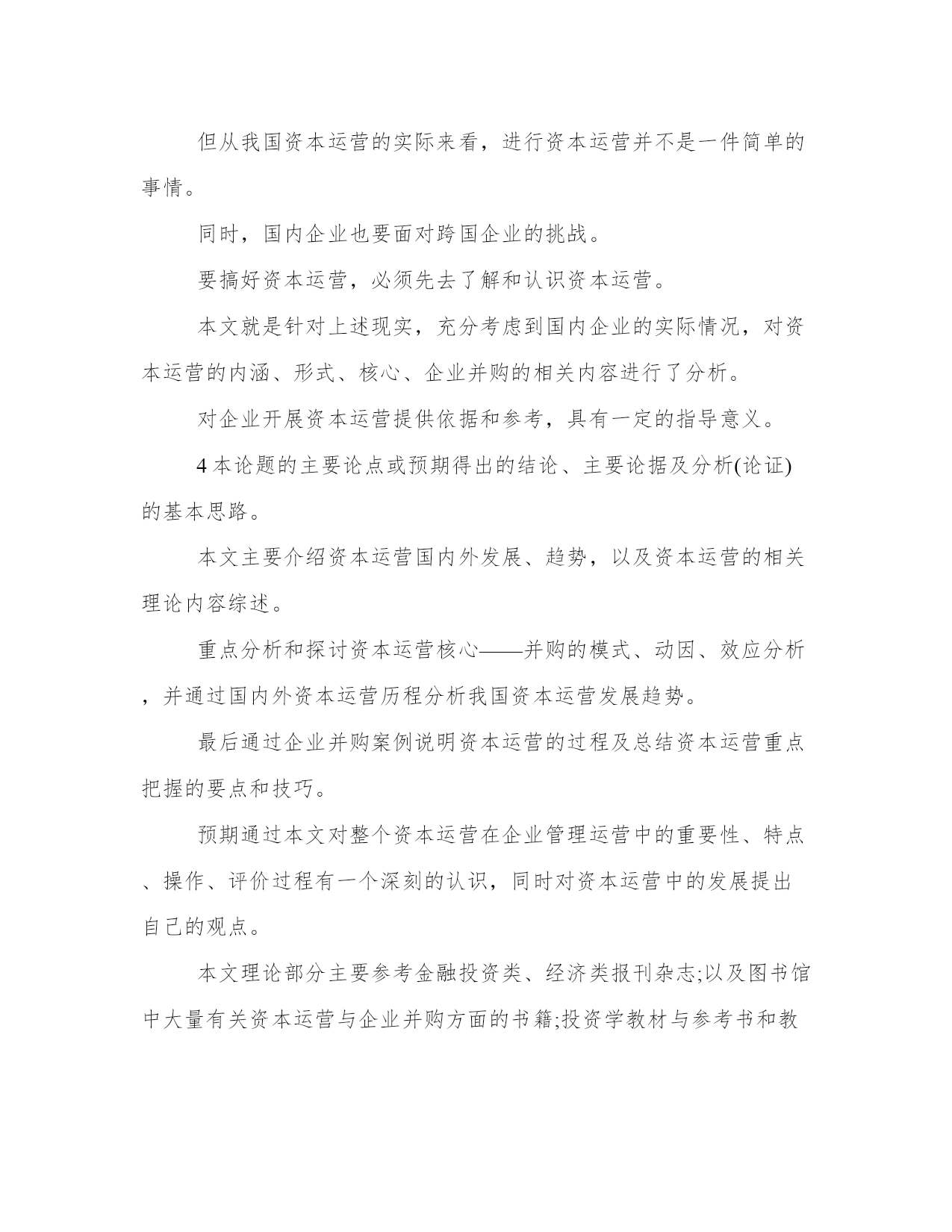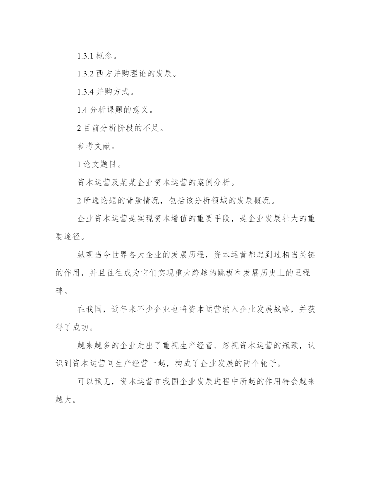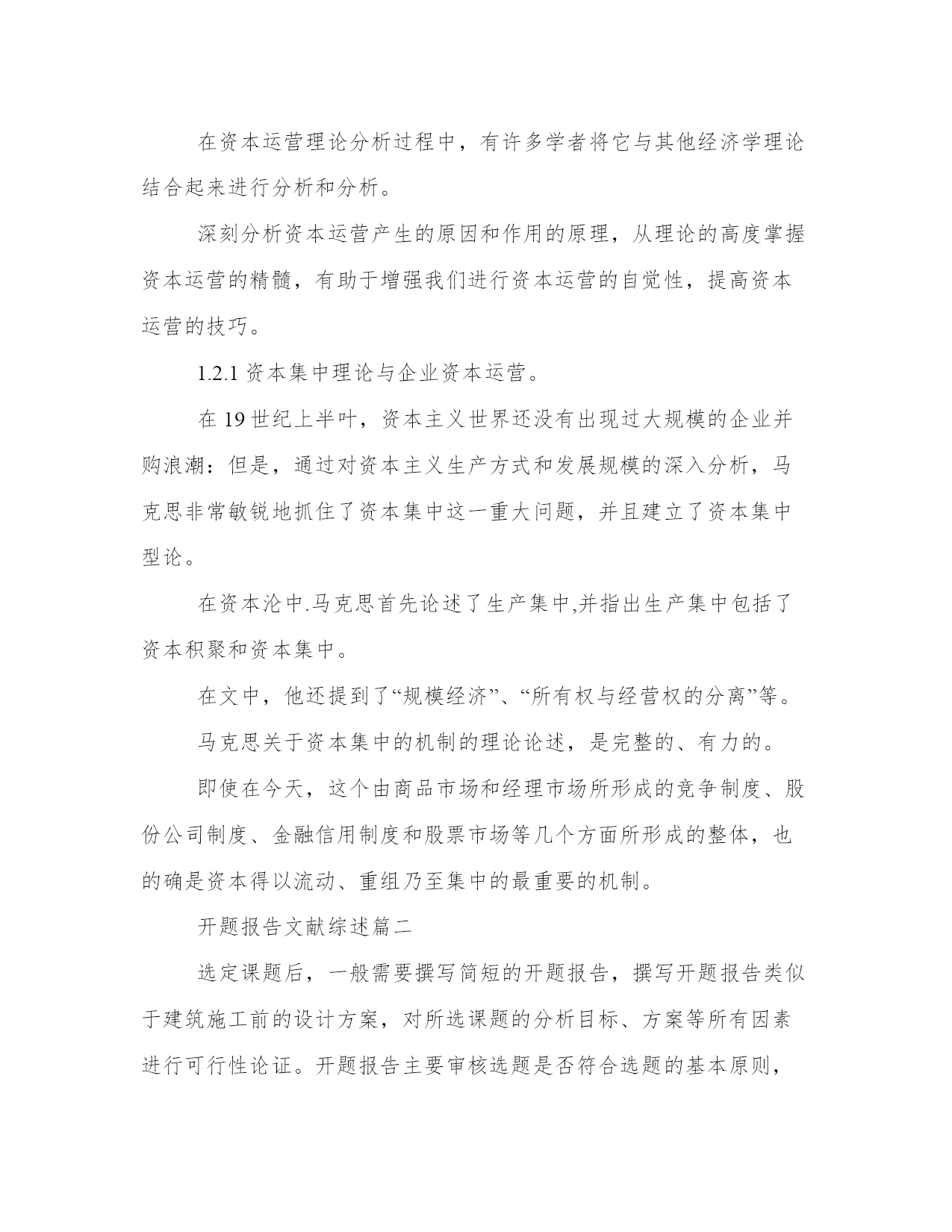 最新开题报告文献综述(实用11篇)报告材料主要是向上级汇报工作,其表达方式以叙述、说明为主,在语言运用上要突出陈述性,把事情交代清楚,充分显示内容的真实和材料的客观。优秀的报告都具备一些什么特点呢?又该怎么写呢?下面是小编帮大家整理的最新报告范文,仅供参考,希望能够帮助到大家。开题报告文献综述篇一分析性的论文注重分析的方法和结果,特别是阳性结果,而文献综述要求向读者介绍与主题有关的详细资料、动态、进展、展望以及对以上方面的评述。开题报告主要是讲解为什么要选这个题目和准备怎样来写这篇论文,而文献综述主要是讲在你所写的这个课题原来有过哪些人写过哪些分析,而且一般文献综述包括在开题报告里是开题报告的一部分,但二者侧重点不同。文献综述是对某一方面的专题搜集大量情报资料后经综合分析而写成的一种学术论文,它是科学文献的一种。文献综述的格式与一般分析性论文的格式有所不同。这是因为分析性的论文注重分析的方法和结果,特别是阳性结果,而文献综述要求向读者介绍与主题有关的详细资料、动态、进展、展望以及对以上方面的评述。因此文献综述的格式相对多样,但总的来说,一般都包含以下四部分:即前言、主题、总结和参考文献。撰写文献综述时可按这四部分拟写提纲,在根据提纲进行撰写工。前言部分,主要是说明写作的目的,介绍有关的概念及定义以及综述的范围,扼要说明有关主题的现状或争论焦点,使读者对全文要叙述的问题有一个初步的轮廓。主题部分,是综述的主体,其写法多样,没有固定的格式。可按年代顺序综述,也可按不同的问题进行综述,还可按不同的观点进行比较综述,不管用那一种格式综述,都要将所搜集到的文献资料归纳、整理及分析比较,阐明有关主题的历史背景、现状和发展方向,以及对这些问题的评述,主题部分应特别注意代表性强、具有科学性和创造性的文献引用和评述。总结部分,与分析性论文的小结有些类似,将全文主题进行扼要总结,对所综述的主题有分析的参考文献虽然放在文末,但却是文献综述的重要组成部分。因为它不仅表示对被引用文献因此,应认真对待。参考文献的编排应条目清楚,查找方便,内容准确无误。关于参考文献的使用方法,录著项目及格式与分析论文相同,不再重复。学生姓名:学号:专业:技术经济班。设计(论文)题目:资本运营及某某企业资本运营的案例分析。指导教师:200年4月21日。目录。1论文题目。2所选论题的背景情况,包括该分析领域的`发展概况。3本论题的现实指导意义。4本论题的主要论点或预期得出的结论、主要论据及分析(论证)的基本思路。5本论文主要内容的基本结构安排。6进度安排。1资本运营运作模式国内外分析现状、结论。1.1资本运营的涵义。1.2资本运营相关理论综合。1.2.1资本集中理论与企业资本运营。1.2.2交易费用理论与企业资本运营。1.2.3产权理论与企业资本运营。1.2.4规模经济理论与企业资本运营。1.3资本运营的核心——并购。1.3.1概念。1.3.2西方并购理论的发展。1.3.4并购方式。1.4分析课题的意义。2目前分析阶段的不足。参考文献。1论文题目。资本运营及某某企业资本运营的案例分析。2所选论题的背景情况,包括该分析领域的发展概况。企业资本运营是实现资本增值的重要手段,是企业发展壮大的重要途径。纵观当今世界各大企业的发展历程,资本运营都起到过相当关键的作用,并且往往成为它们实现重大跨越的跳板和发展历史上的里程碑。在我国,近年来不少企业也将资本运营纳入企业发展战略,并获得了成功。越来越多的企业走出了重视生产经营、忽视资本运营的瓶颈,认识到资本运营同生产经营一起,构成了企业发展的两个轮子。可以预见,资本运营在我国企业发展进程中所起的作用特会越来越大。本文以经济全球化和我国加入wto为背景,比较全面描述了国内外资本运营的现状,深入地剖析了存在的问题,提出了一些思路和对策,以及对于国外资本运营经验的借鉴和教训的吸取。在分析领域发展方面,国外对资本运营的分析和运用都多于我国。在中国,资本运营是一个经济学新概念,它是在中国资本市场不断发展和完善的背景下产生的,也是投资管理学科基础的理论学科。资本运营是多学科交叉、综合的一门课程。它是将公司财务管理、公司战略管理、技术经济等相关学科的理论基础综合起来,依托资本市场相关工具,以并购和重组为核心,以企业资本最大限度增值为目标,通过资本的有效运作,来促使企业快速发展的一种经营管理方式。资本运营概念虽然产生时间短,但随着中国资本市场发展,越来越多的企业正广泛地进行资本运营。事实证明,如何有效依托资本市场进行资本运营已成为企业管理的一个至关重要的问题。正因为如此,资本运营课程在我国分析也比较热门。3本论题的现实指导意义。近年来
