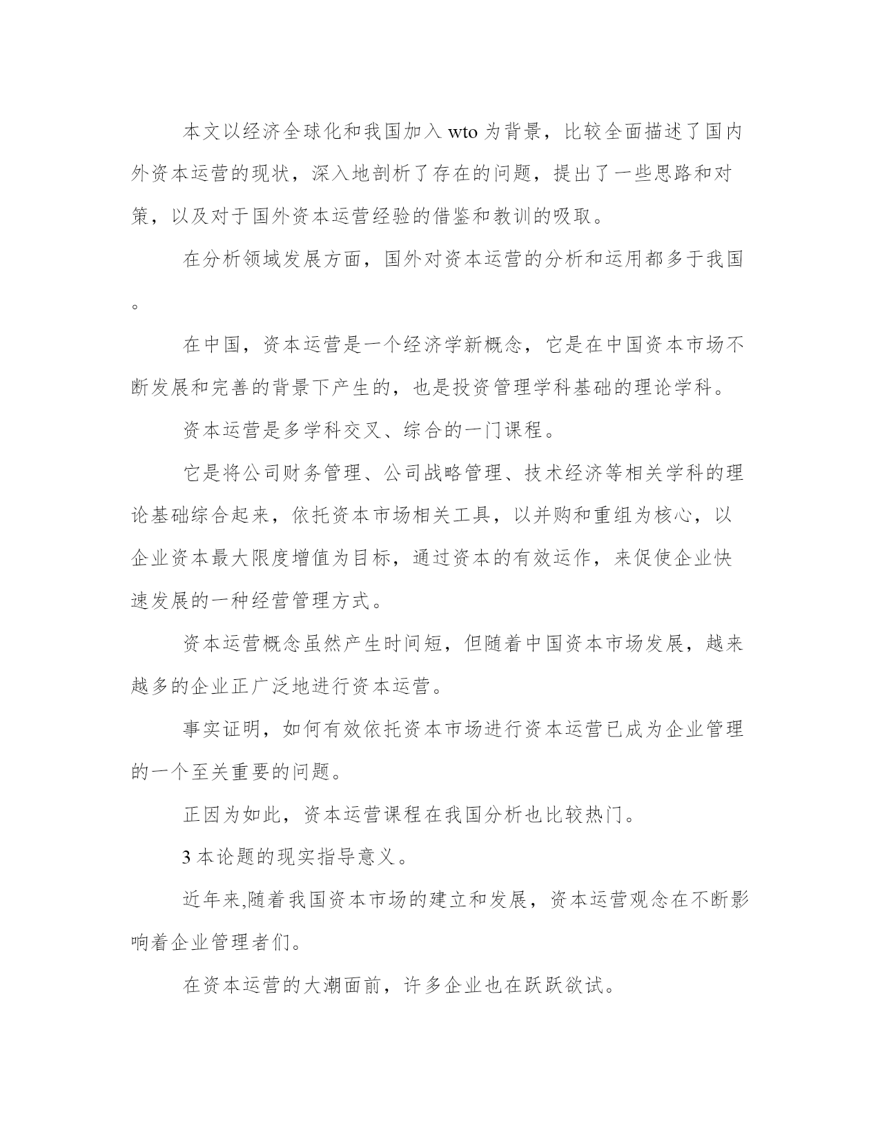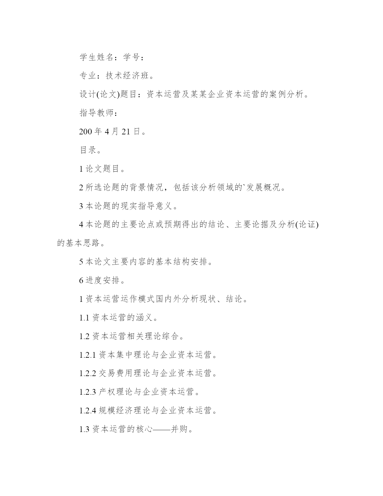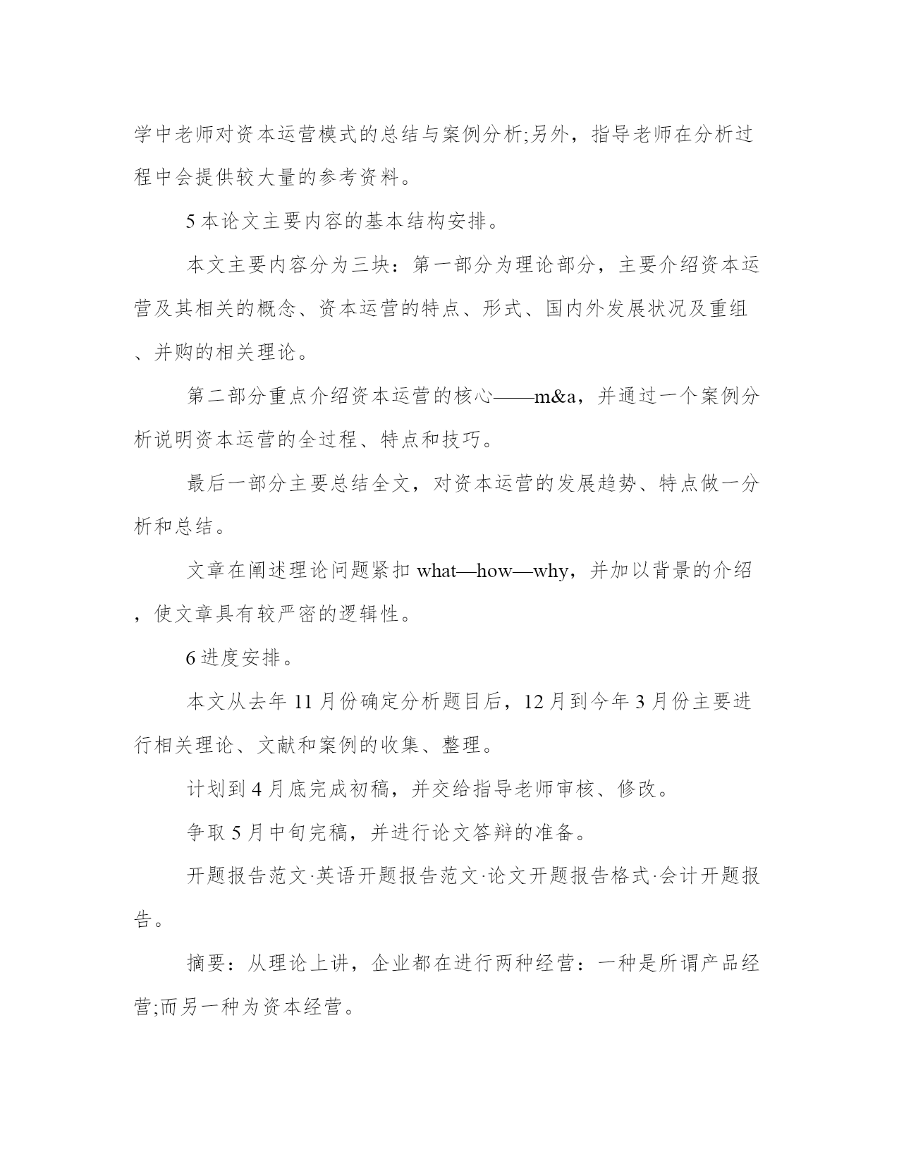 最新开题报告文献综述(实用11篇)报告材料主要是向上级汇报工作,其表达方式以叙述、说明为主,在语言运用上要突出陈述性,把事情交代清楚,充分显示内容的真实和材料的客观。优秀的报告都具备一些什么特点呢?又该怎么写呢?下面是小编帮大家整理的最新报告范文,仅供参考,希望能够帮助到大家。开题报告文献综述篇一分析性的论文注重分析的方法和结果,特别是阳性结果,而文献综述要求向读者介绍与主题有关的详细资料、动态、进展、展望以及对以上方面的评述。开题报告主要是讲解为什么要选这个题目和准备怎样来写这篇论文,而文献综述主要是讲在你所写的这个课题原来有过哪些人写过哪些分析,而且一般文献综述包括在开题报告里是开题报告的一部分,但二者侧重点不同。文献综述是对某一方面的专题搜集大量情报资料后经综合分析而写成的一种学术论文,它是科学文献的一种。文献综述的格式与一般分析性论文的格式有所不同。这是因为分析性的论文注重分析的方法和结果,特别是阳性结果,而文献综述要求向读者介绍与主题有关的详细资料、动态、进展、展望以及对以上方面的评述。因此文献综述的格式相对多样,但总的来说,一般都包含以下四部分:即前言、主题、总结和参考文献。撰写文献综述时可按这四部分拟写提纲,在根据提纲进行撰写工。前言部分,主要是说明写作的目的,介绍有关的概念及定义以及综述的范围,扼要说明有关主题的现状或争论焦点,使读者对全文要叙述的问题有一个初步的轮廓。主题部分,是综述的主体,其写法多样,没有固定的格式。可按年代顺序综述,也可按不同的问题进行综述,还可按不同的观点进行比较综述,不管用那一种格式综述,都要将所搜集到的文献资料归纳、整理及分析比较,阐明有关主题的历史背景、现状和发展方向,以及对这些问题的评述,主题部分应特别注意代表性强、具有科学性和创造性的文献引用和评述。总结部分,与分析性论文的小结有些类似,将全文主题进行扼要总结,对所综述的主题有分析的参考文献虽然放在文末,但却是文献综述的重要组成部分。因为它不仅表示对被引用文献因此,应认真对待。参考文献的编排应条目清楚,查找方便,内容准确无误。关于参考文献的使用方法,录著项目及格式与分析论文相同,不再重复。学生姓名:学号:专业:技术经济班。设计(论文)题目:资本运营及某某企业资本运营的案例分析。指导教师:200年4月21日。目录。1论文题目。2所选论题的背景情况,包括该分析领域的`发展概况。3本论题的现实指导意义。4本论题的主要论点或预期得出的结论、主要论据及分析(论证)的基本思路。5本论文主要内容的基本结构安排。6进度安排。1资本运营运作模式国内外分析现状、结论。1.1资本运营的涵义。1.2资本运营相关理论综合。1.2.1资本集中理论与企业资本运营。1.2.2交易费用理论与企业资本运营。1.2.3产权理论与企业资本运营。1.2.4规模经济理论与企业资本运营。1.3资本运营的核心——并购。1.3.1概念。1.3.2西方并购理论的发展。1.3.4并购方式。1.4分析课题的意义。2目前分析阶段的不足。参考文献。1论文题目。资本运营及某某企业资本运营的案例分析。2所选论题的背景情况,包括该分析领域的发展概况。企业资本运营是实现资本增值的重要手段,是企业发展壮大的重要途径。纵观当今世界各大企业的发展历程,资本运营都起到过相当关键的作用,并且往往成为它们实现重大跨越的跳板和发展历史上的里程碑。在我国,近年来不少企业也将资本运营纳入企业发展战略,并获得了成功。越来越多的企业走出了重视生产经营、忽视资本运营的瓶颈,认识到资本运营同生产经营一起,构成了企业发展的两个轮子。可以预见,资本运营在我国企业发展进程中所起的作用特会越来越大。本文以经济全球化和我国加入wto为背景,比较全面描述了国内外资本运营的现状,深入地剖析了存在的问题,提出了一些思路和对策,以及对于国外资本运营经验的借鉴和教训的吸取。在分析领域发展方面,国外对资本运营的分析和运用都多于我国。在中国,资本运营是一个经济学新概念,它是在中国资本市场不断发展和完善的背景下产生的,也是投资管理学科基础的理论学科。资本运营是多学科交叉、综合的一门课程。它是将公司财务管理、公司战略管理、技术经济等相关学科的理论基础综合起来,依托资本市场相关工具,以并购和重组为核心,以企业资本最大限度增值为目标,通过资本的有效运作,来促使企业快速发展的一种经营管理方式。资本运营概念虽然产生时间短,但随着中国资本市场发展,越来越多的企业正广泛地进行资本运营。事实证明,如何有效依托资本市场进行资本运营已成为企业管理的一个至关重要的问题。正因为如此,资本运营课程在我国分析也比较热门。3本论题的现实指导意义。近年来